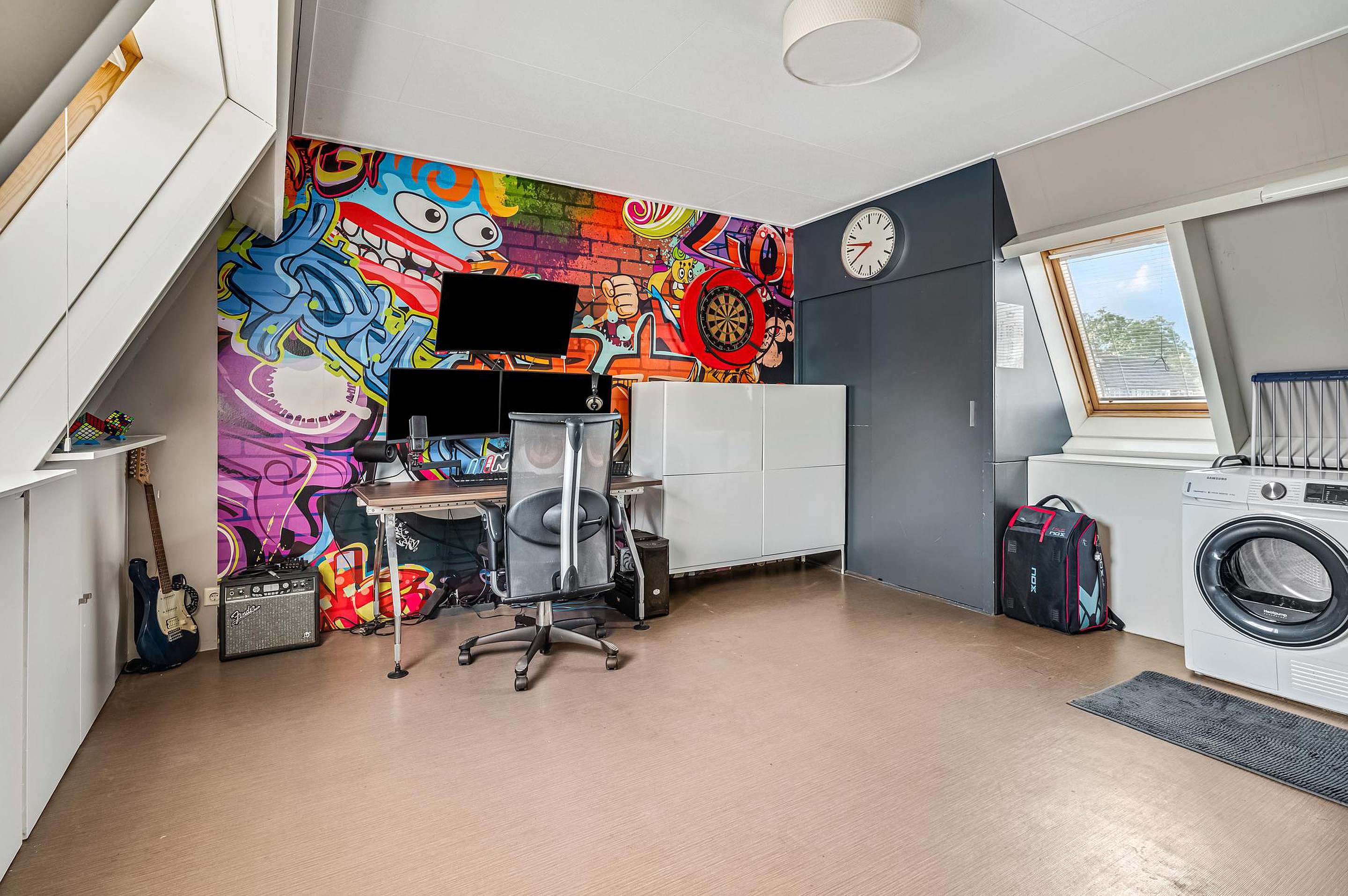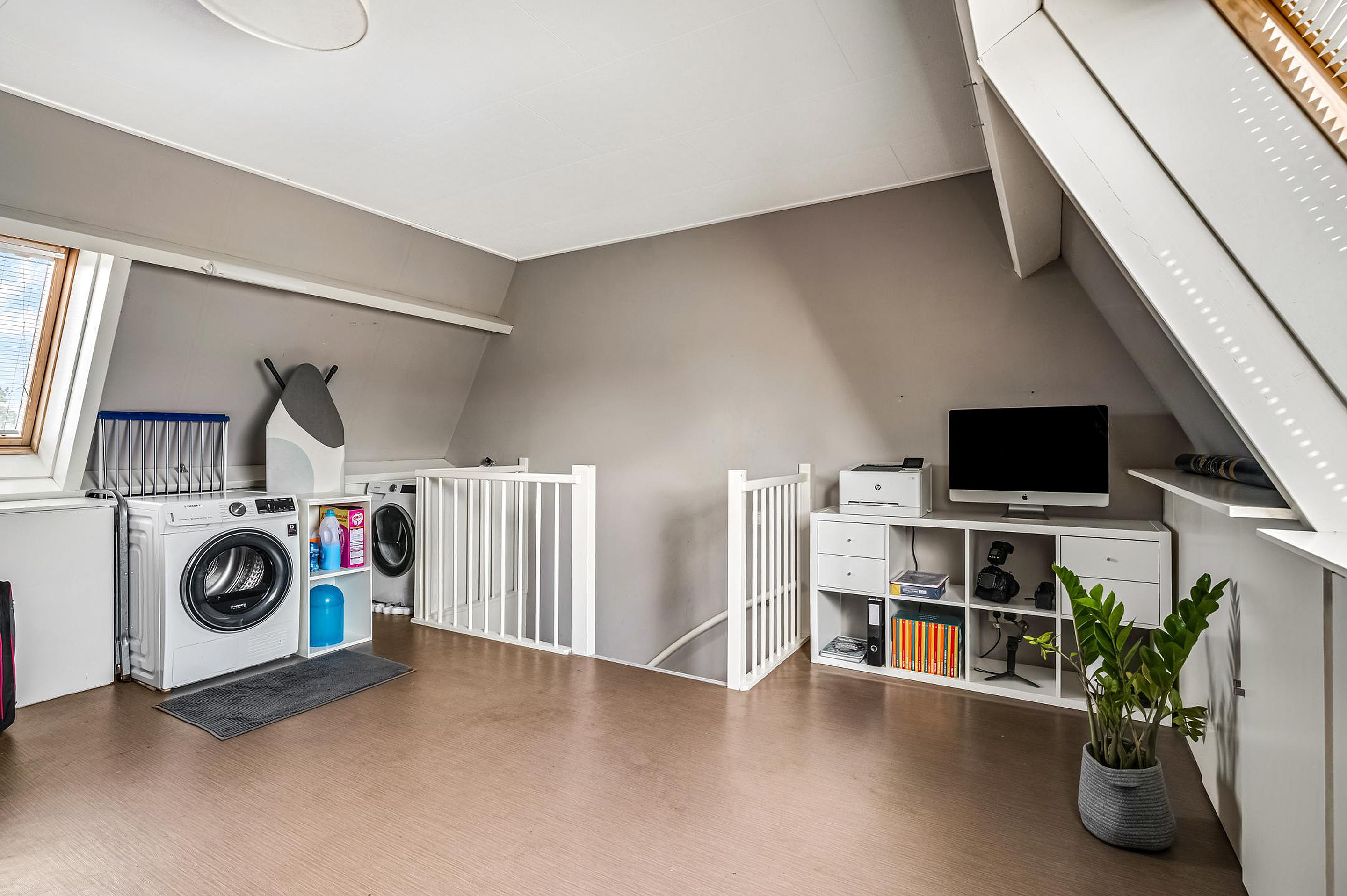 Tweede verdieping Ruime multifunctionele open zolder met was-apparatuur aansluitingen en opbergruimte achter de knieschotten. De zolder is voorzien van een vinylvloer en is dankzij de twee dakramen heerlijk licht.