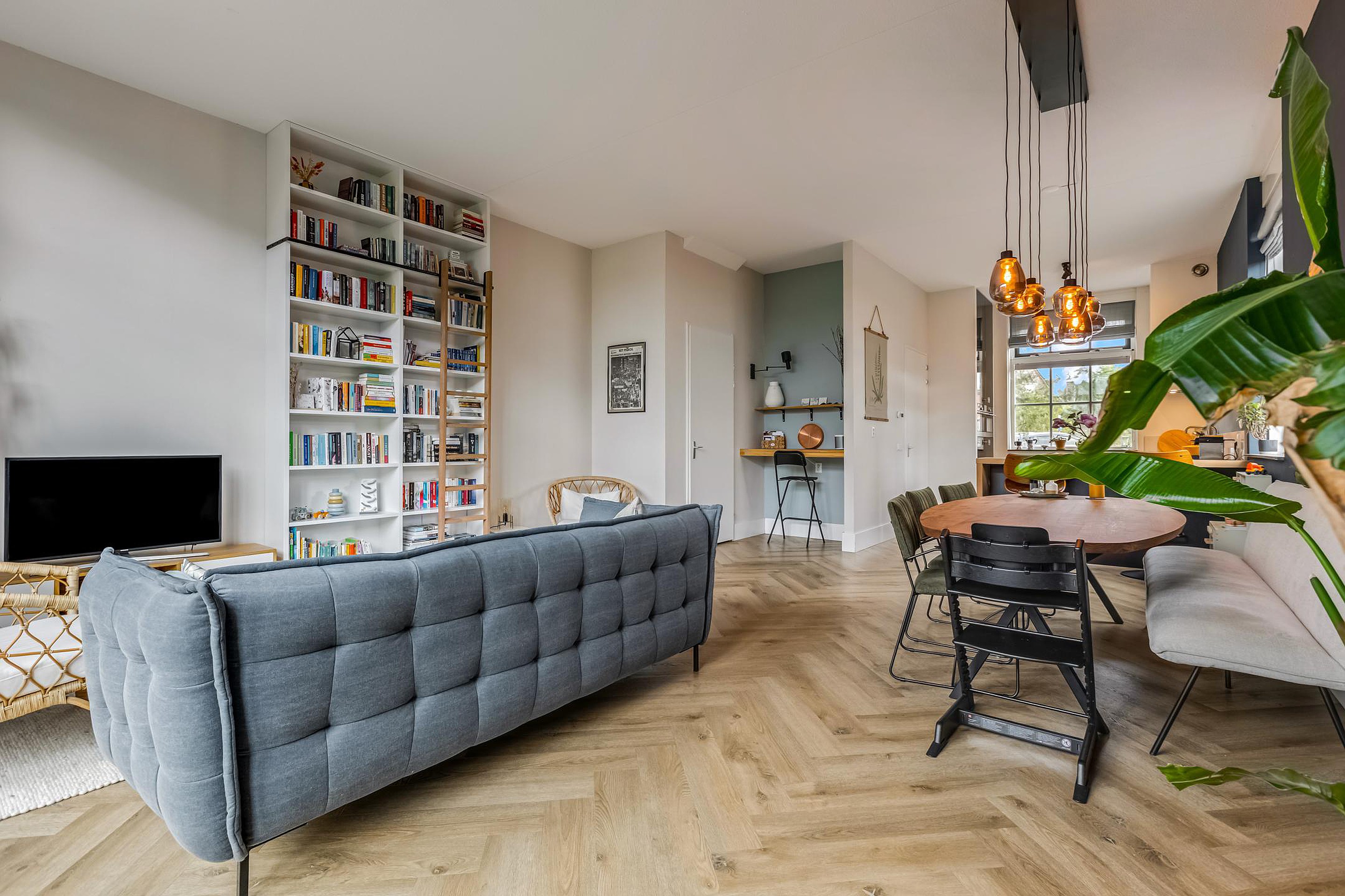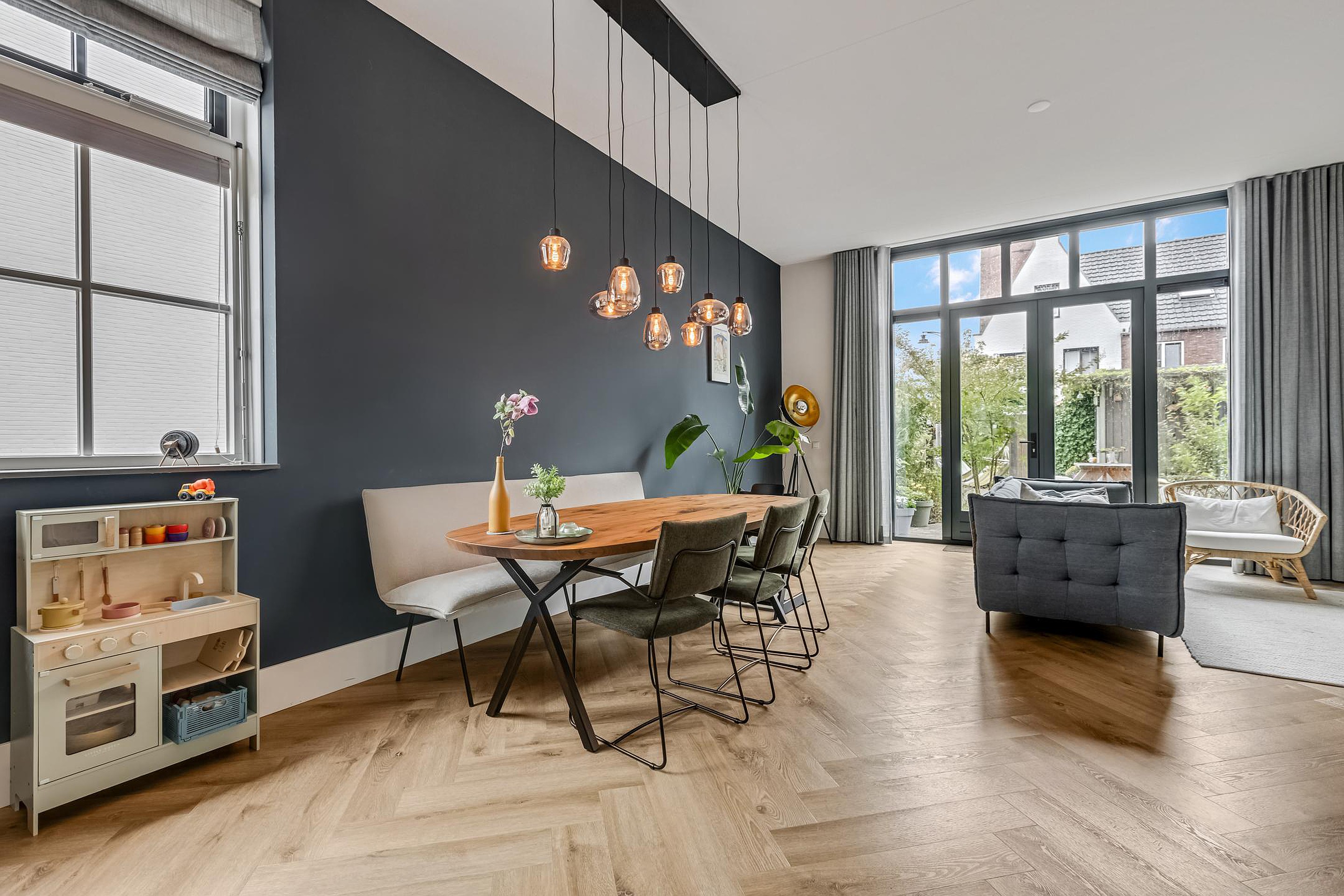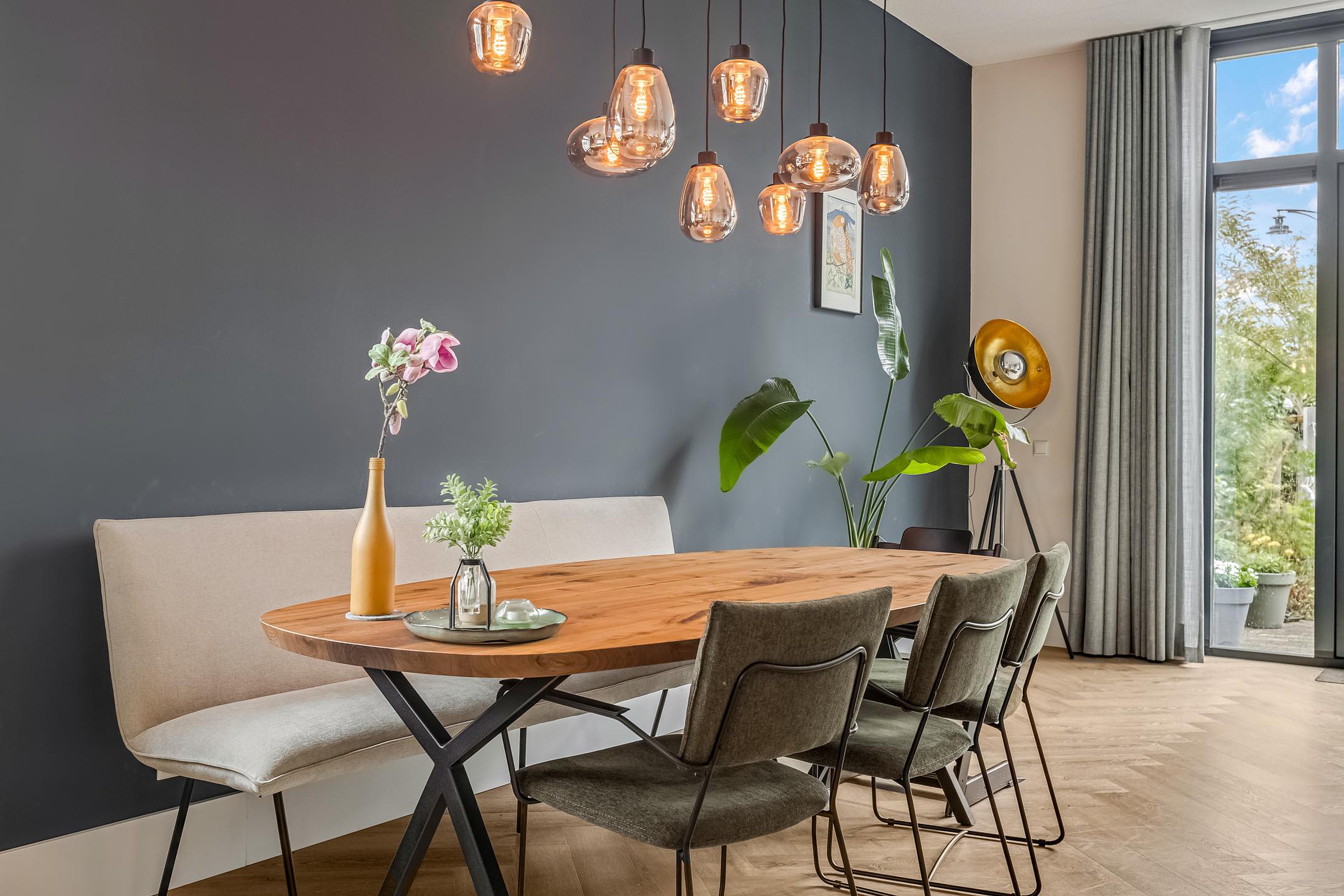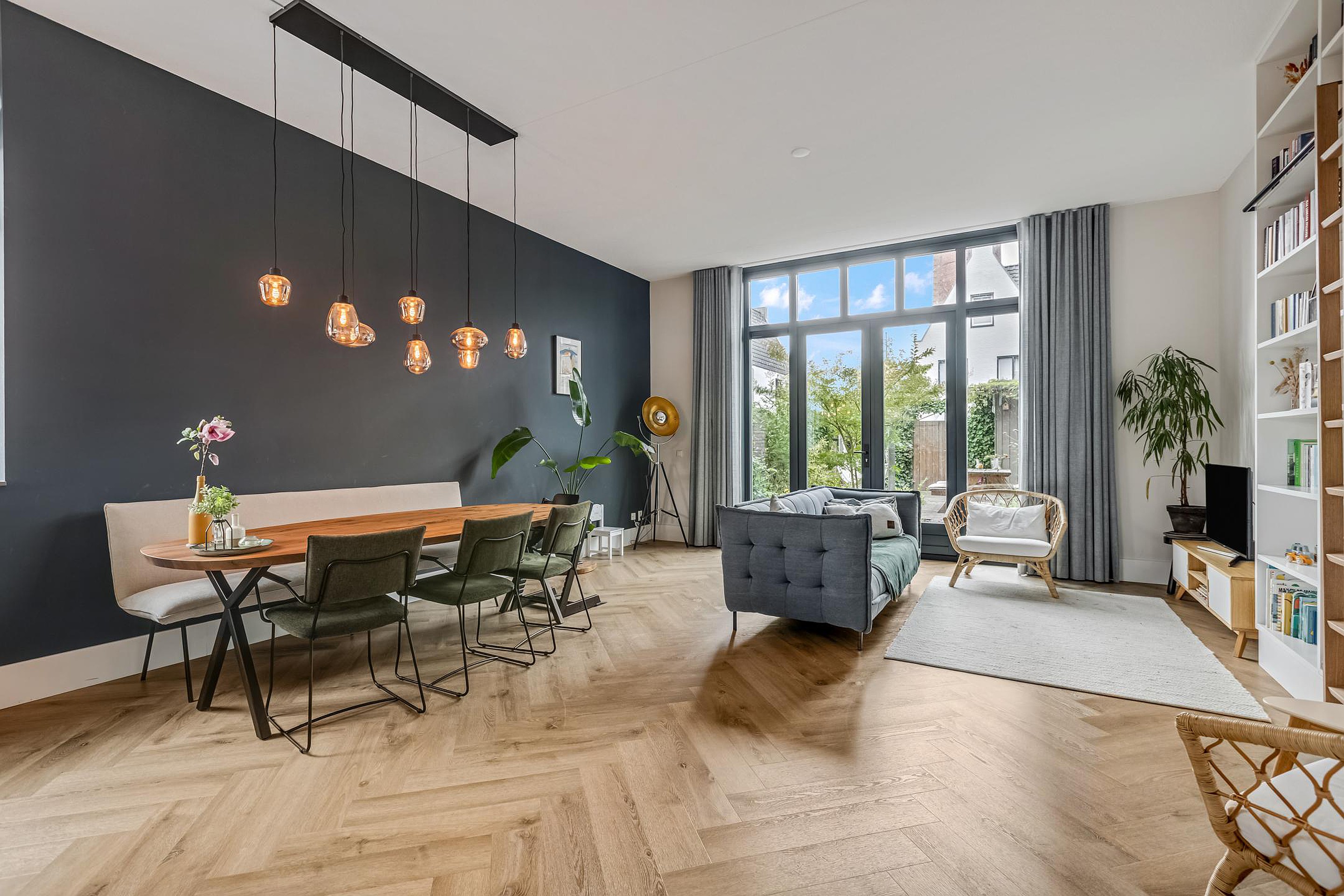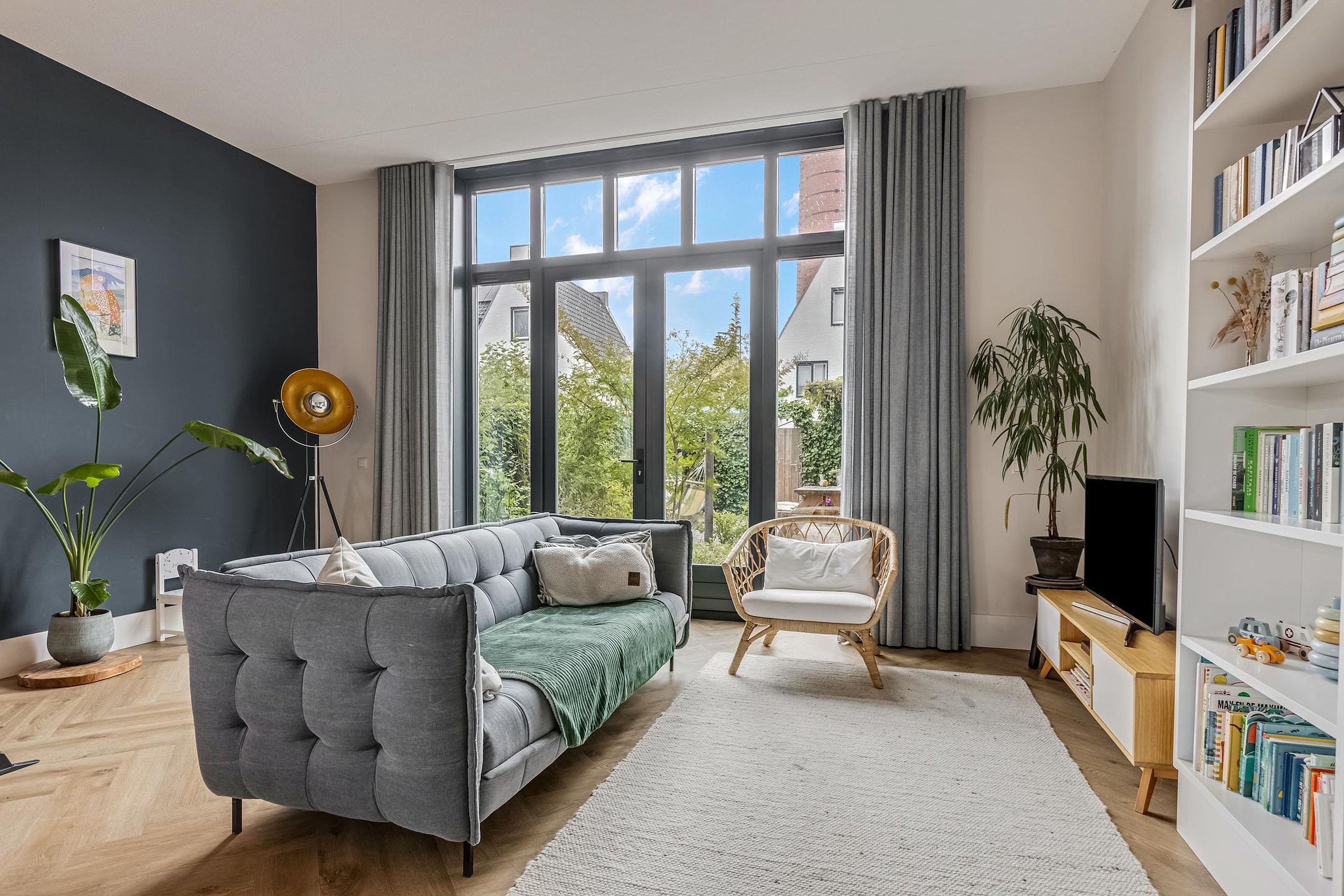 De standaard schuifpui heeft plaatsgemaakt voor een op maat gemaakte pui met openslaande deuren naar de tuin. Van hieruit is mooi de grote schoorsteen in zijn geheel te zien. De hoge ramen van vloer tot plafond brengen veel licht binnen en benadrukken de hoogte van de ruimte. De woonkamer biedt genoeg plek voor een ruime zit- een eethoek en beschikt over een praktische trapkast en een extra werkplek.