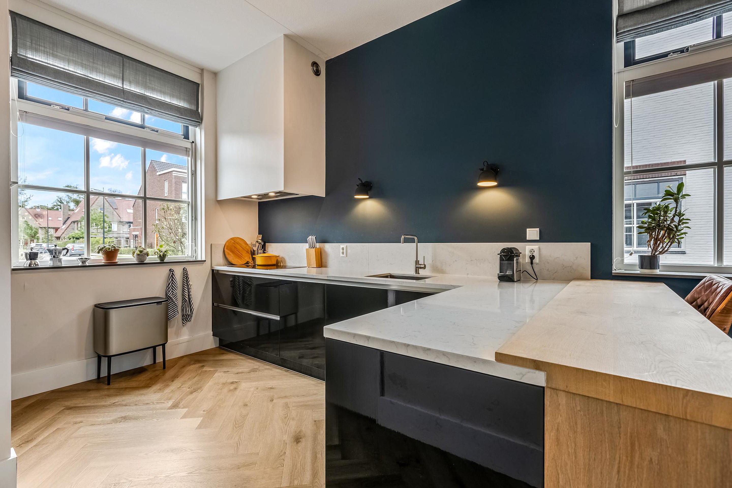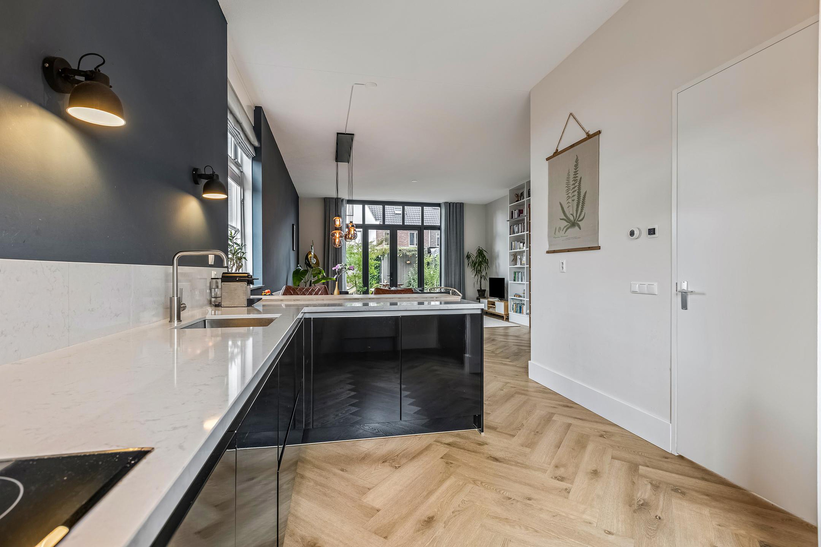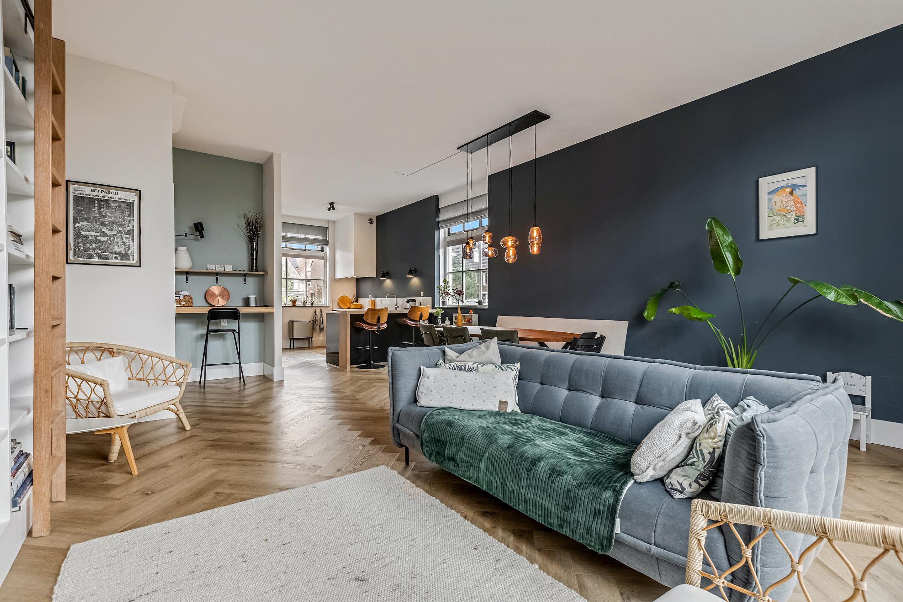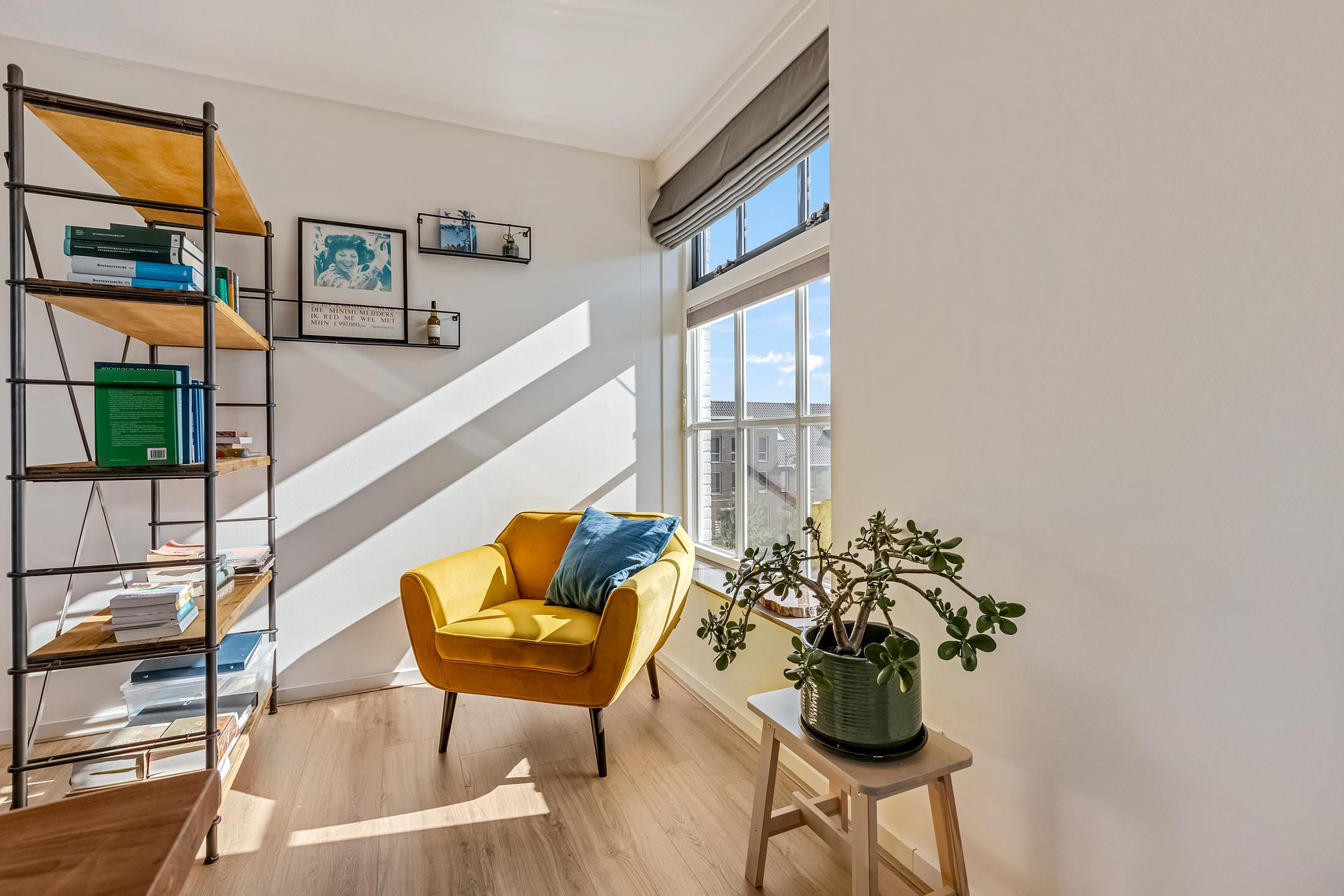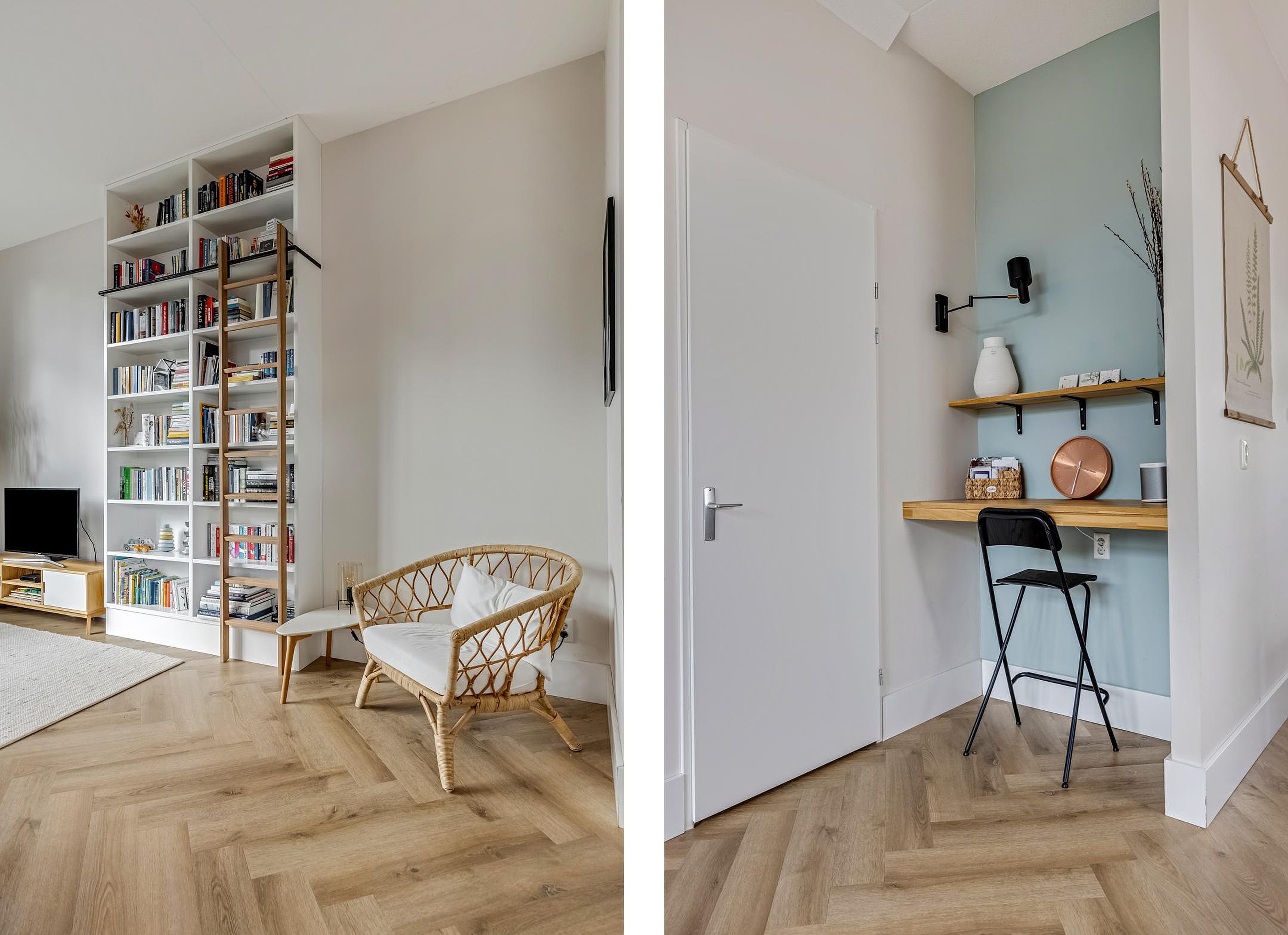De standaard schuifpui heeft plaatsgemaakt voor een op maat gemaakte pui met openslaande deuren naar de tuin. Van hieruit is mooi de grote schoorsteen in zijn geheel te zien. De hoge ramen van vloer tot plafond brengen veel licht binnen en benadrukken de hoogte van de ruimte. De woonkamer biedt genoeg plek voor een ruime zit- een eethoek en beschikt over een praktische trapkast en een extra werkplek.