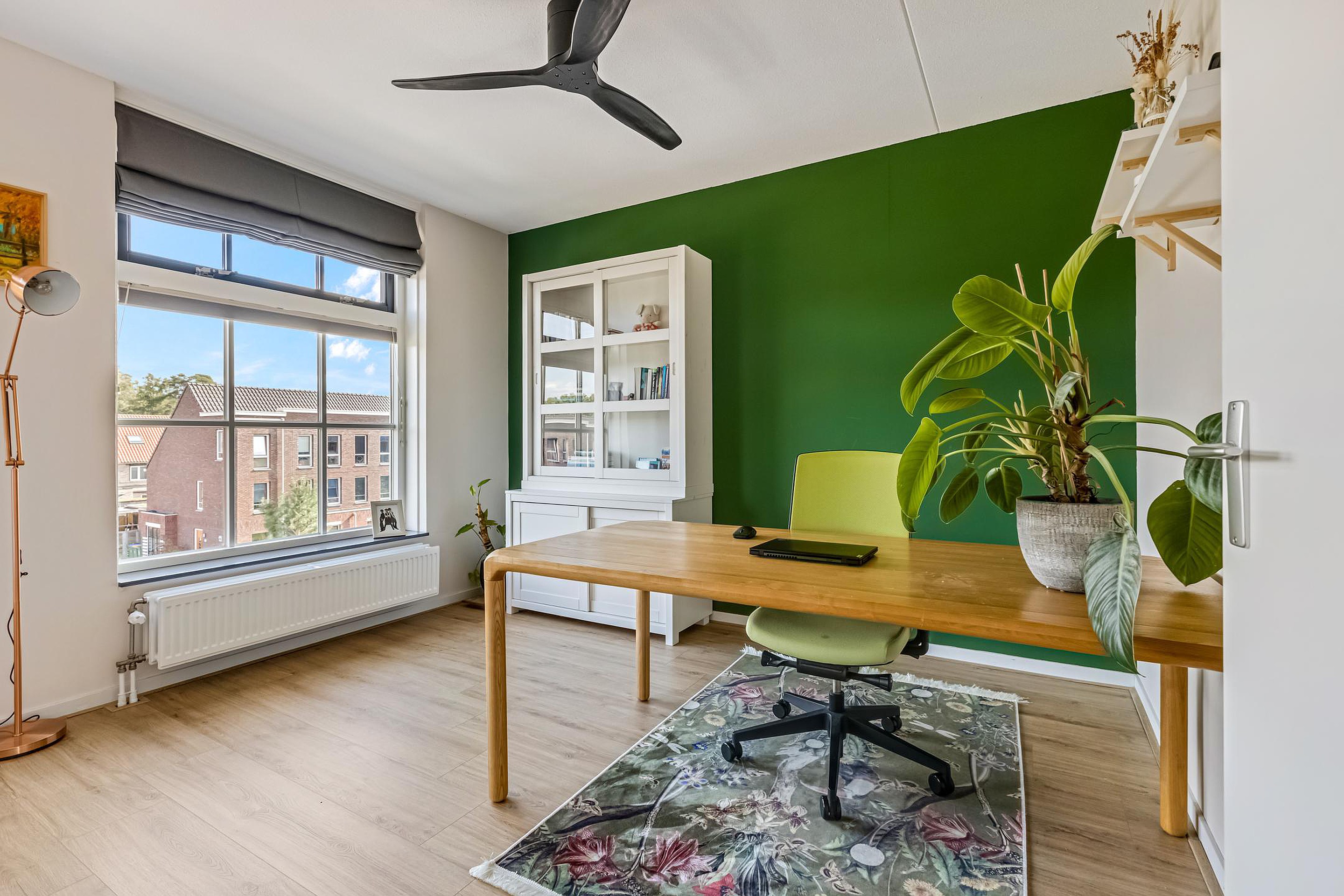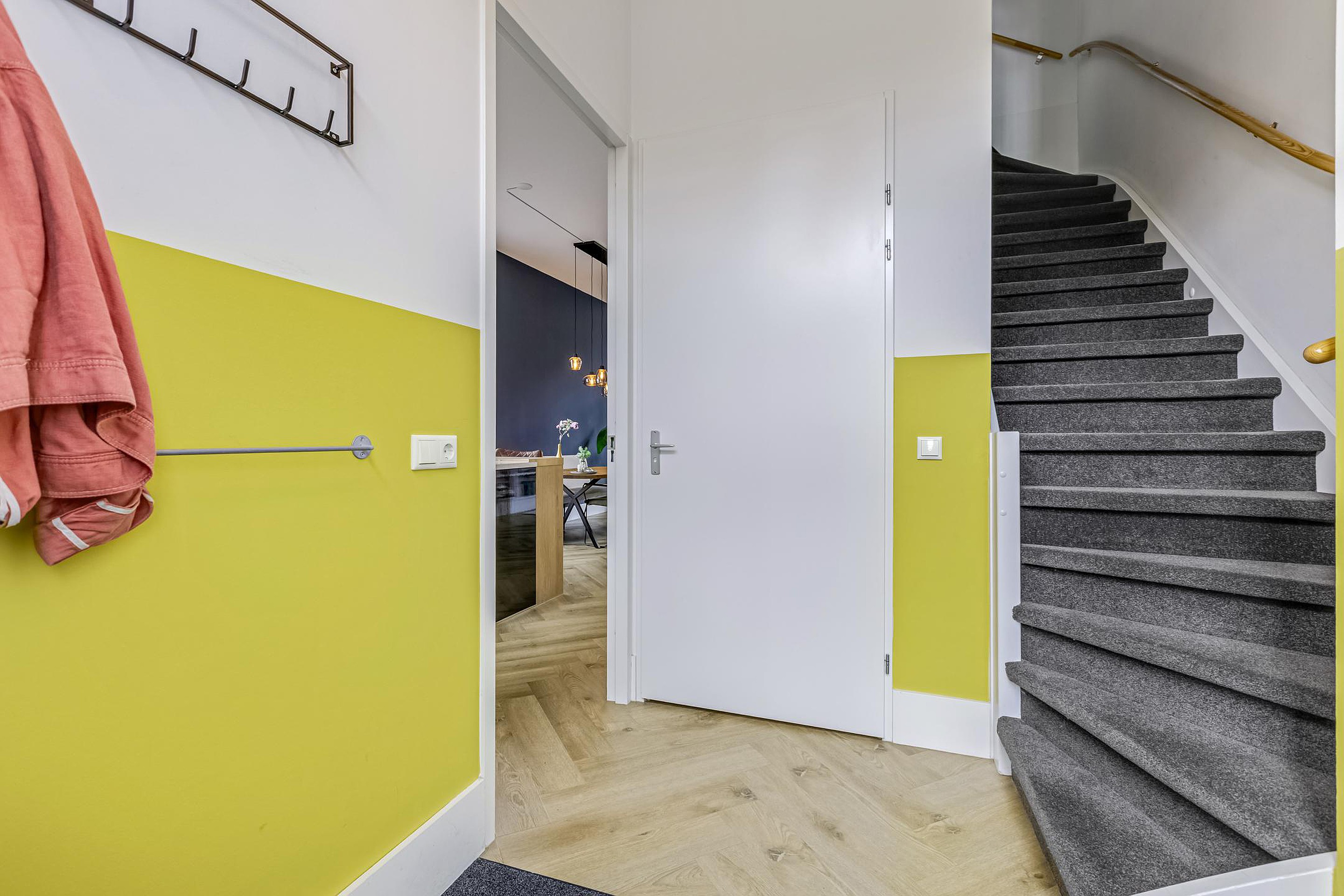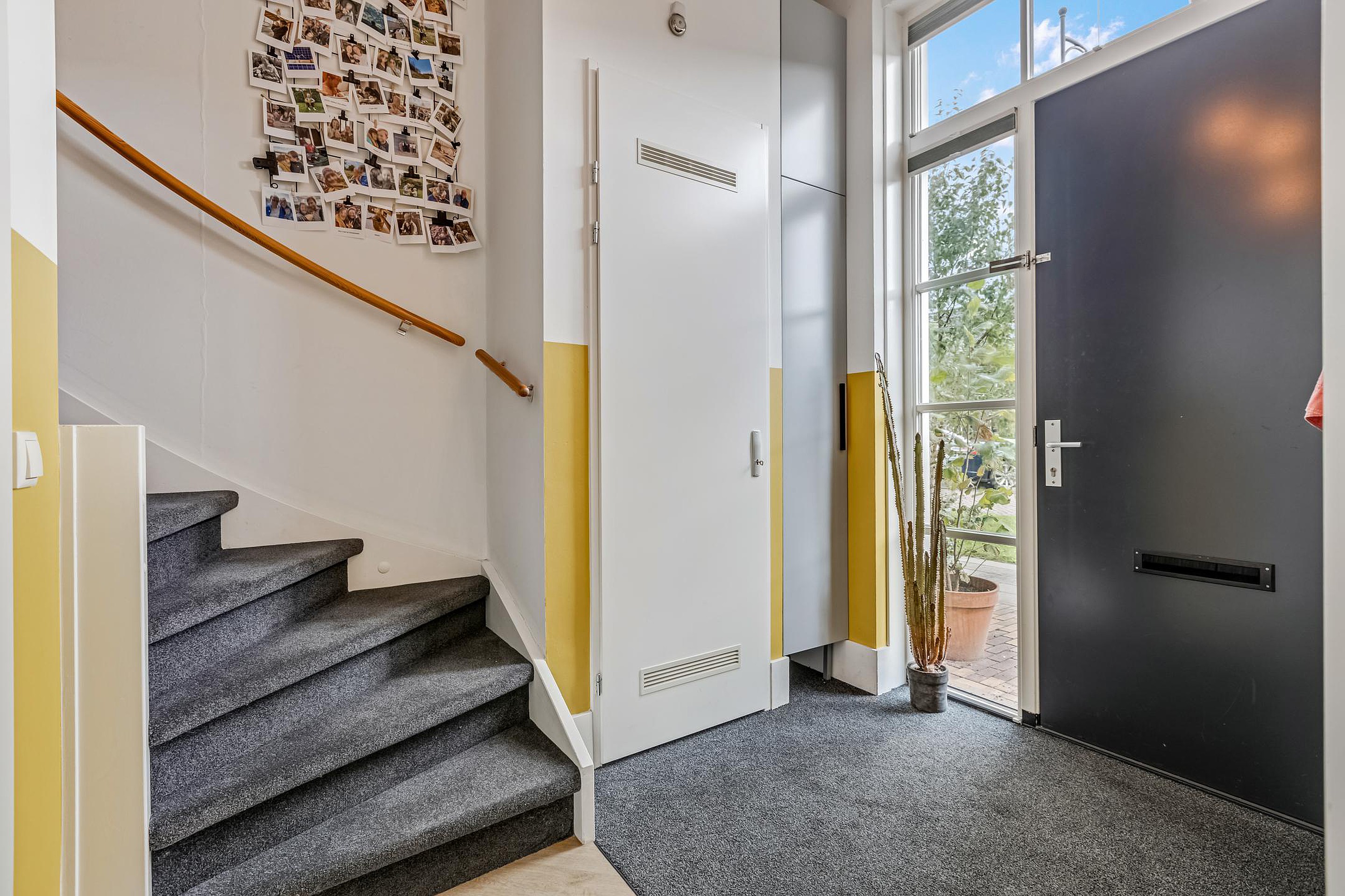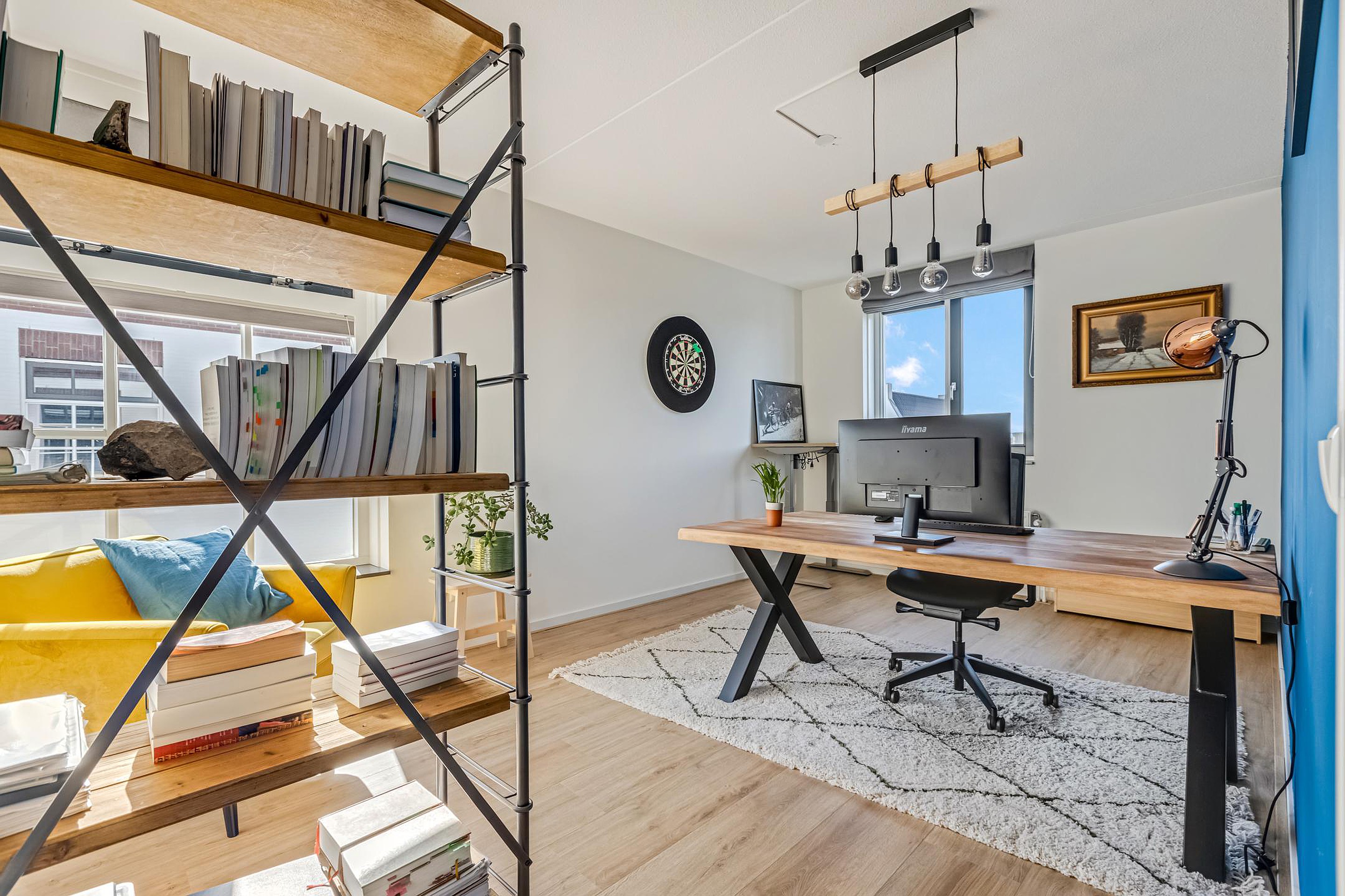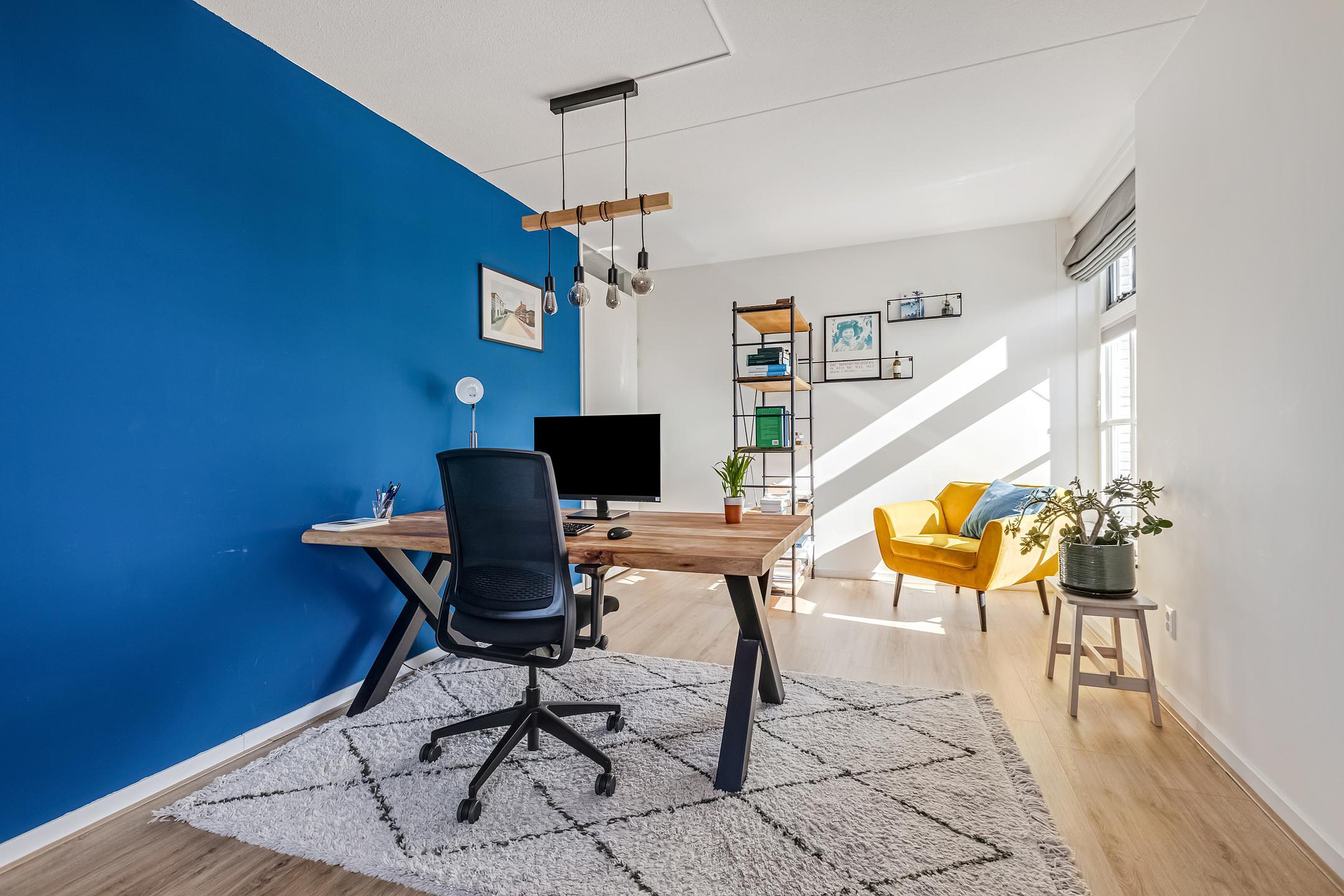 De standaard schuifpui heeft plaatsgemaakt voor een op maat gemaakte pui met openslaande deuren naar de tuin. Van hieruit is mooi de grote schoorsteen in zijn geheel te zien. De hoge ramen van vloer tot plafond brengen veel licht binnen en benadrukken de hoogte van de ruimte. De woonkamer biedt genoeg plek voor een ruime zit- een eethoek en beschikt over een praktische trapkast en een extra werkplek.