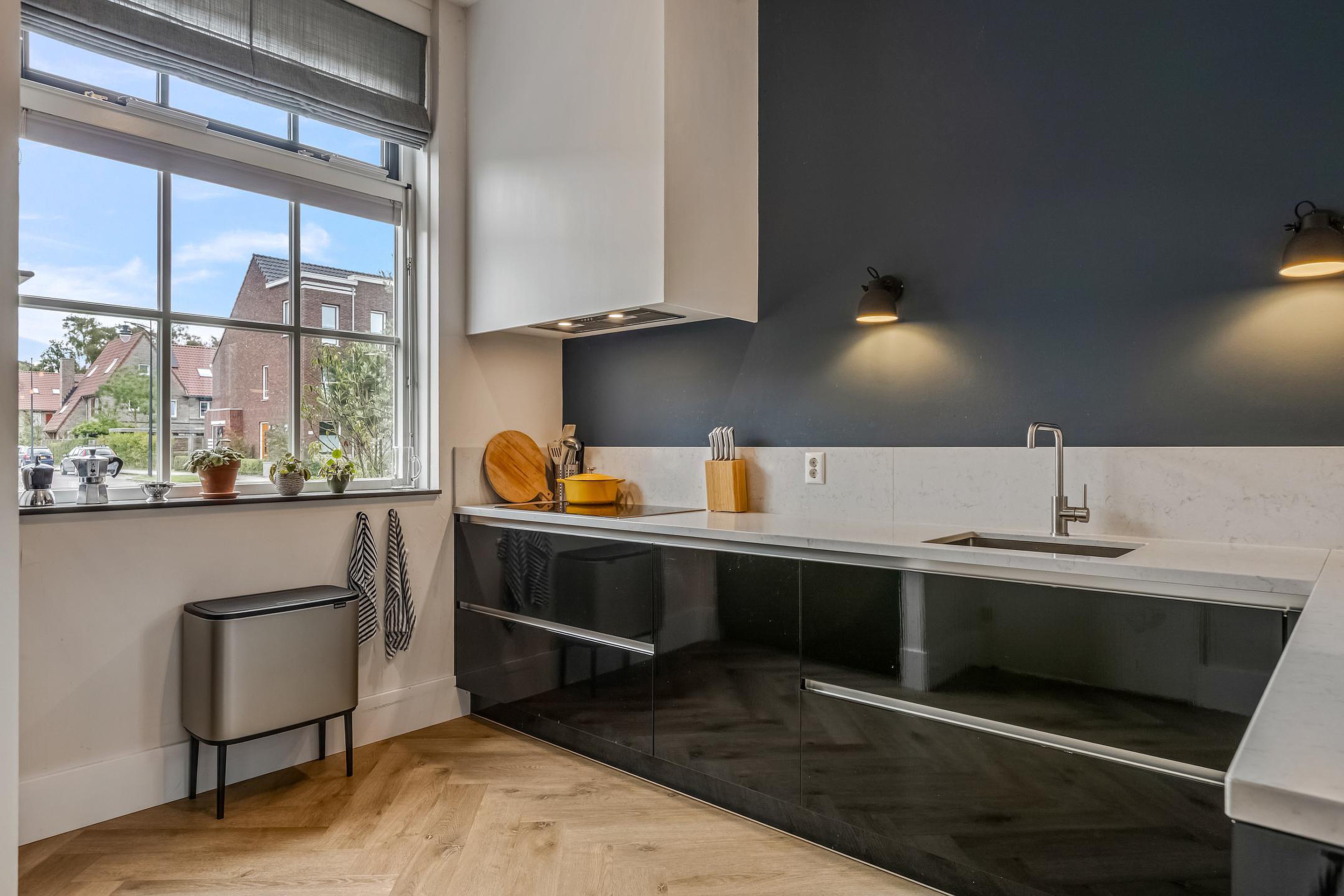 De hoekkeuken heeft een op maat gemaakte apparatenwand tot aan het plafond. De zwarte, greeploze fronten in strijklak, brede lades en aluminium details geven de keuken een luxe uitstraling. De keuken is uitgerust met twee koelkasten, vaatwasser, inductiekookplaat, afzuigkap met schouw, een oven en een combi-oven.