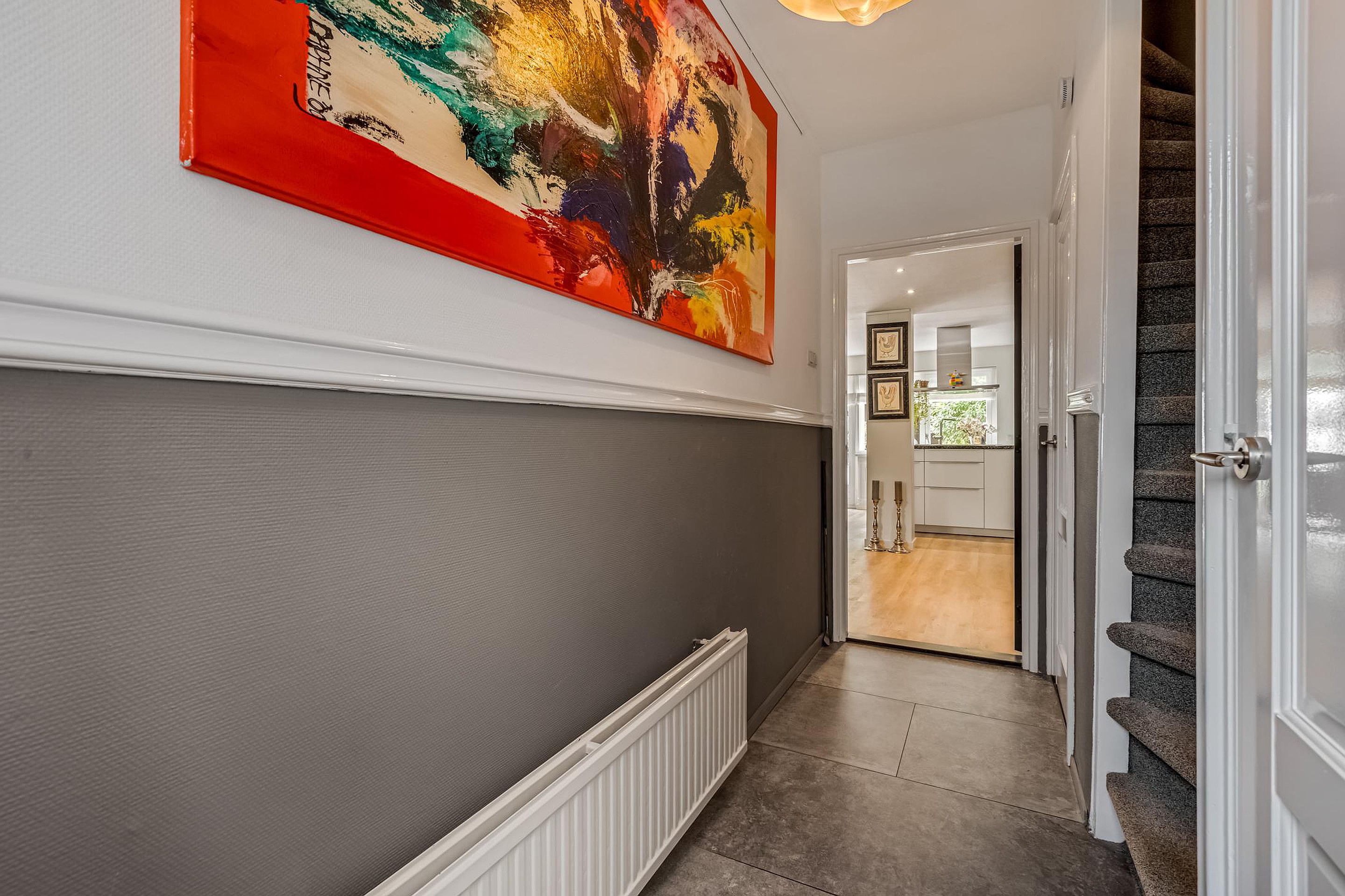 Begane grond Via de statige voortuin met strakke indeling en leilinden bereik je de voordeur, fraai omlijst en passend bij de charmante uitstraling van het huis. Aan de gevel bevindt zich een elektrisch zonnescherm.