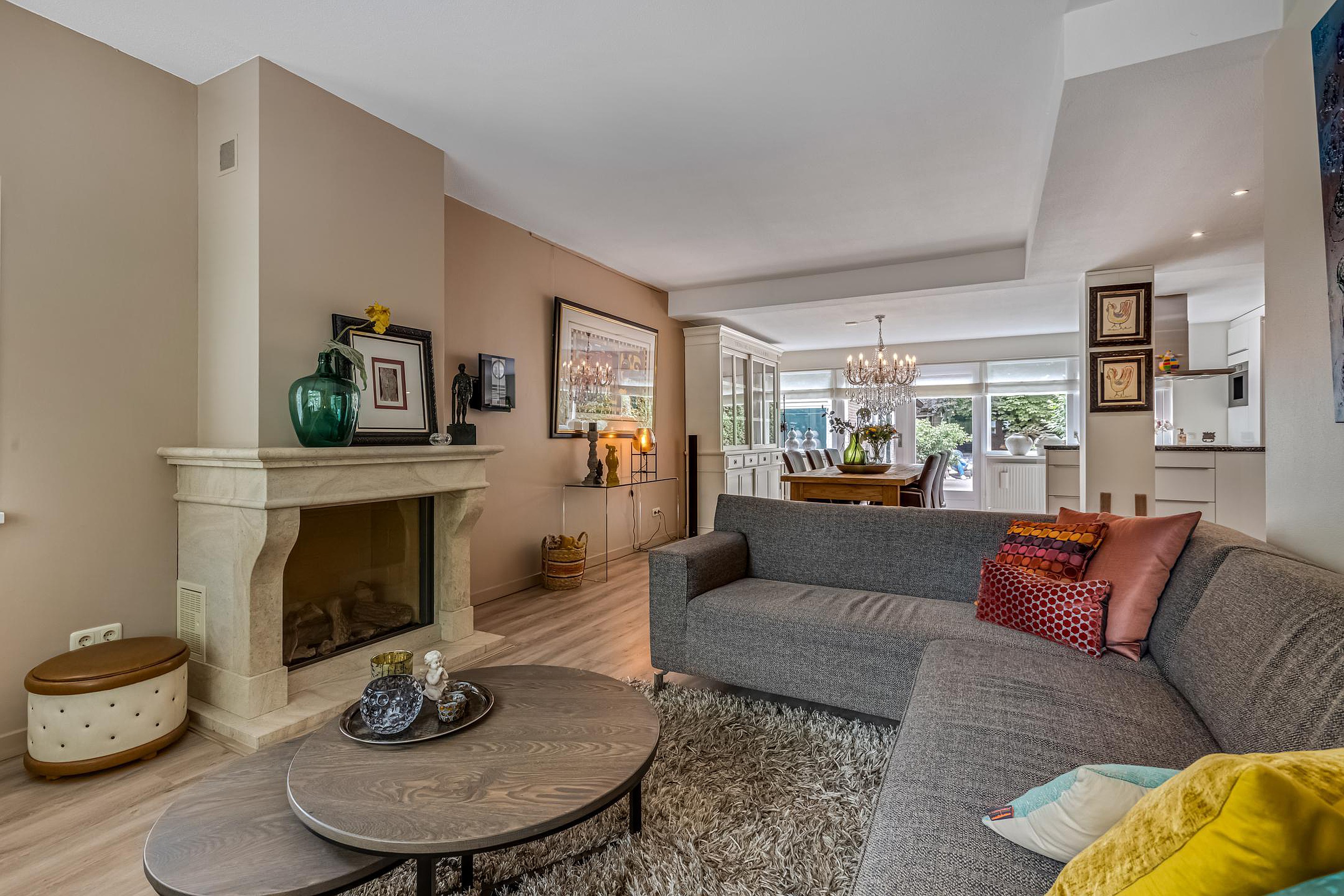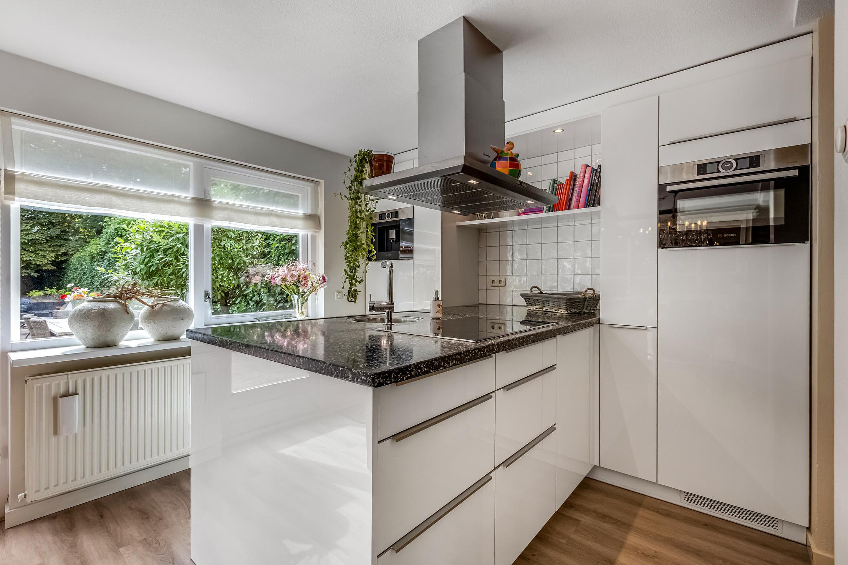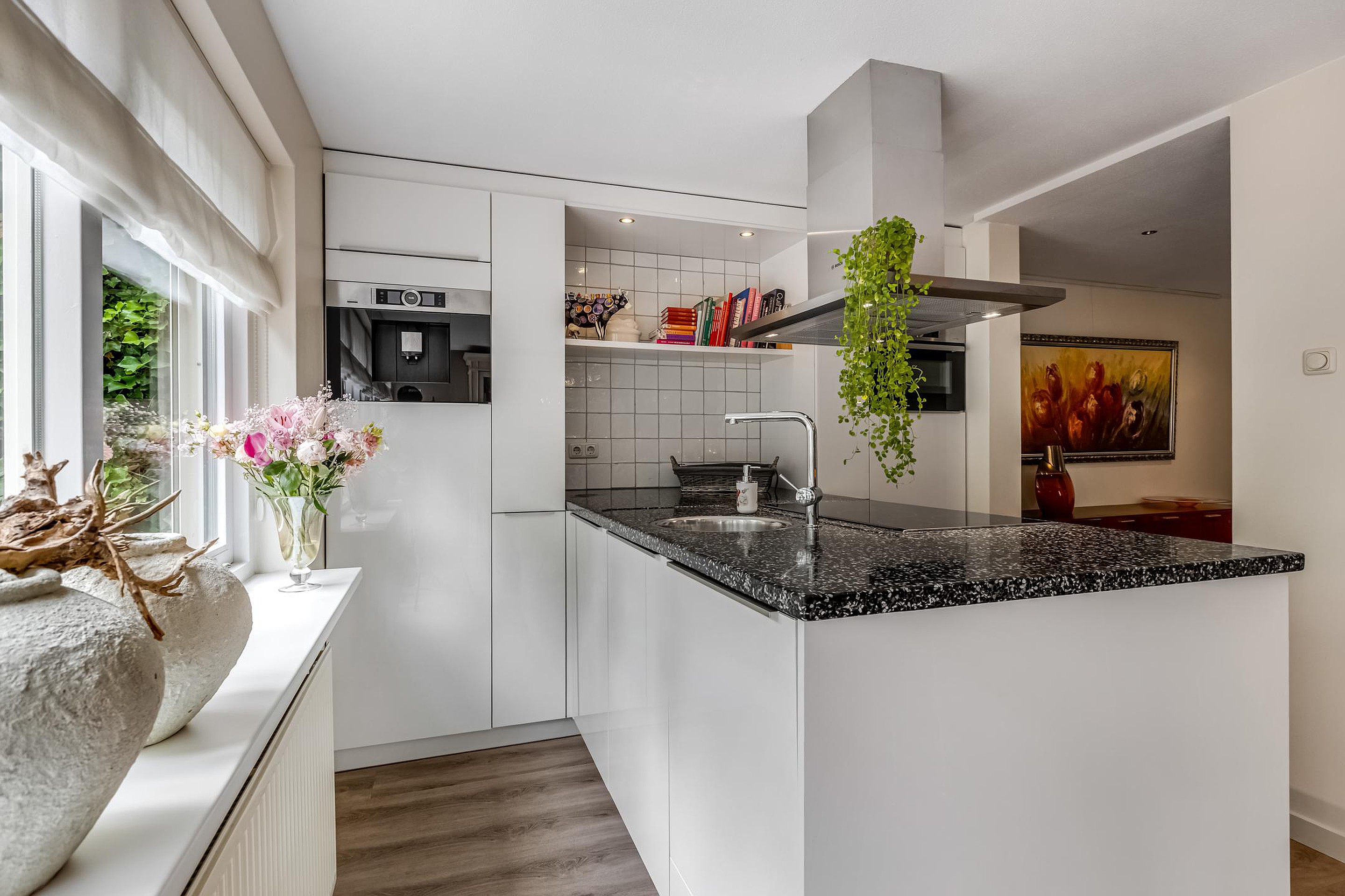 De uitgebouwde woonkamer is ruim en licht, voorzien van een gezellige gashaard en een laminaatvloer. Hier is volop ruimte voor een royale zithoek. De open keuken (2019), gelegen aan de achterzijde, is een droom voor kookliefhebbers: voorzien van een natuurstenen werkblad, spoelbak met luxe kraan, vijf zones inductiekookplaat, afzuigkap, combi-oven, koelkast, vaatwasser, ingebouwde koffiemachine en veel opbergruimte.