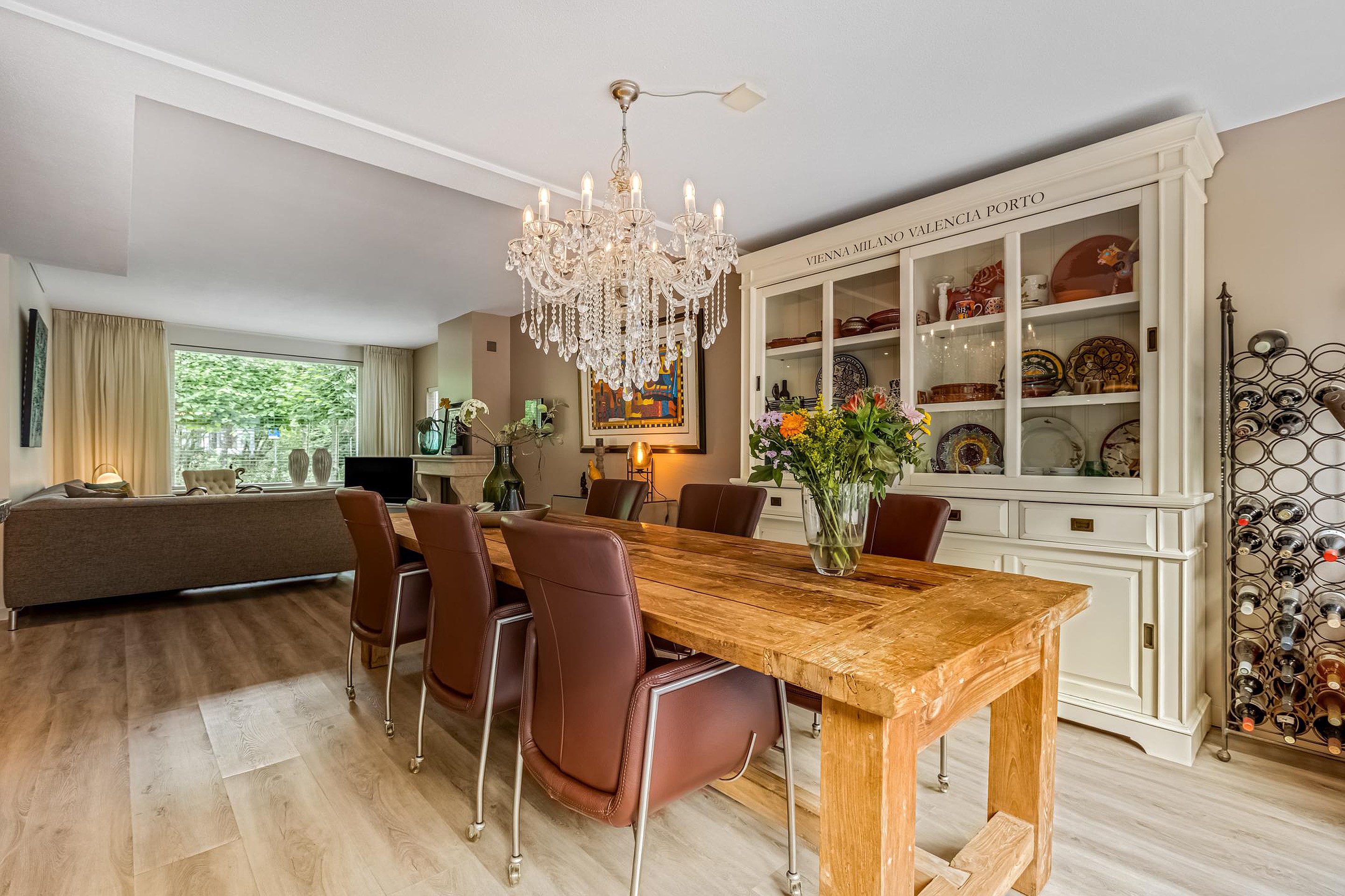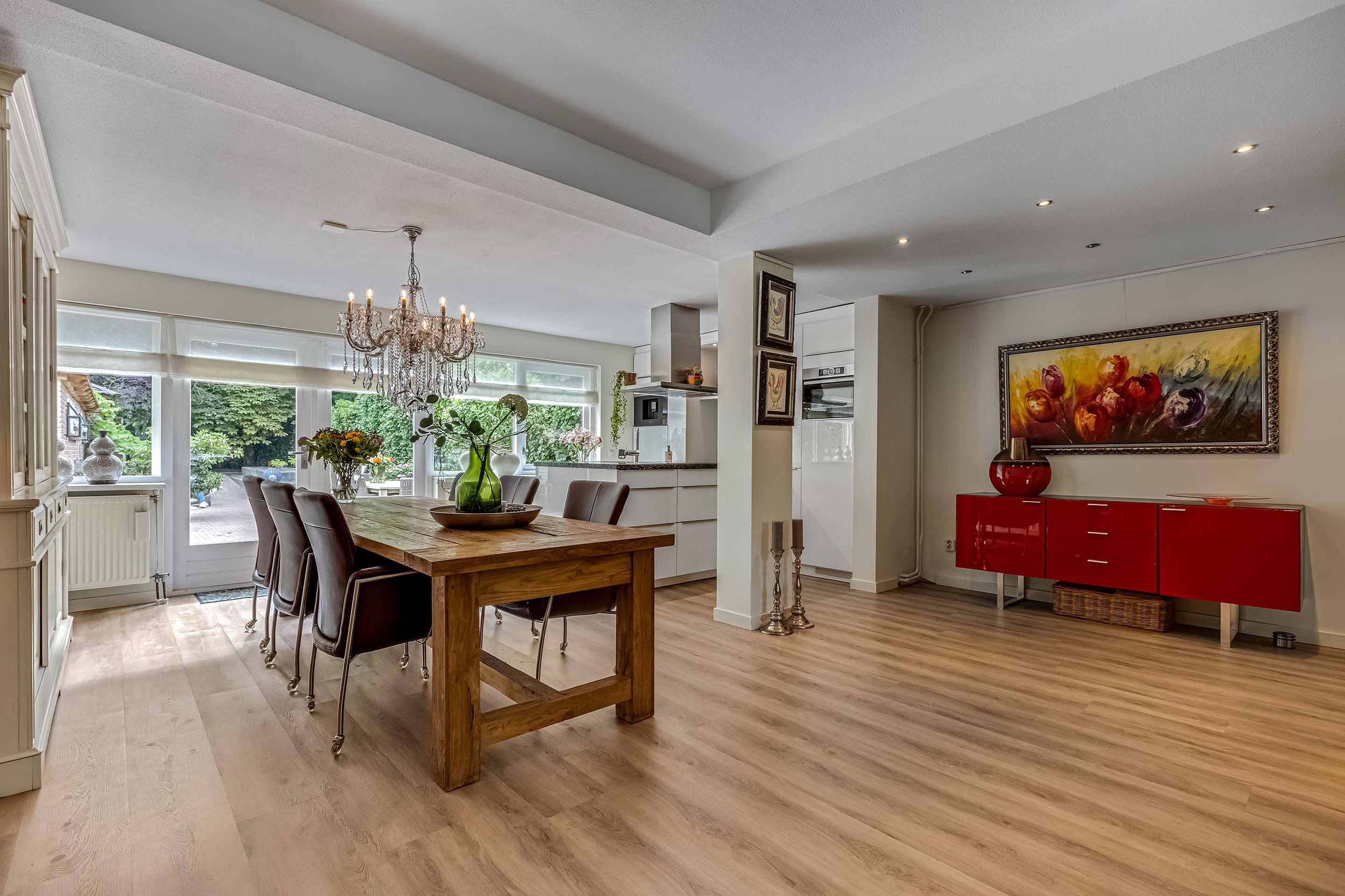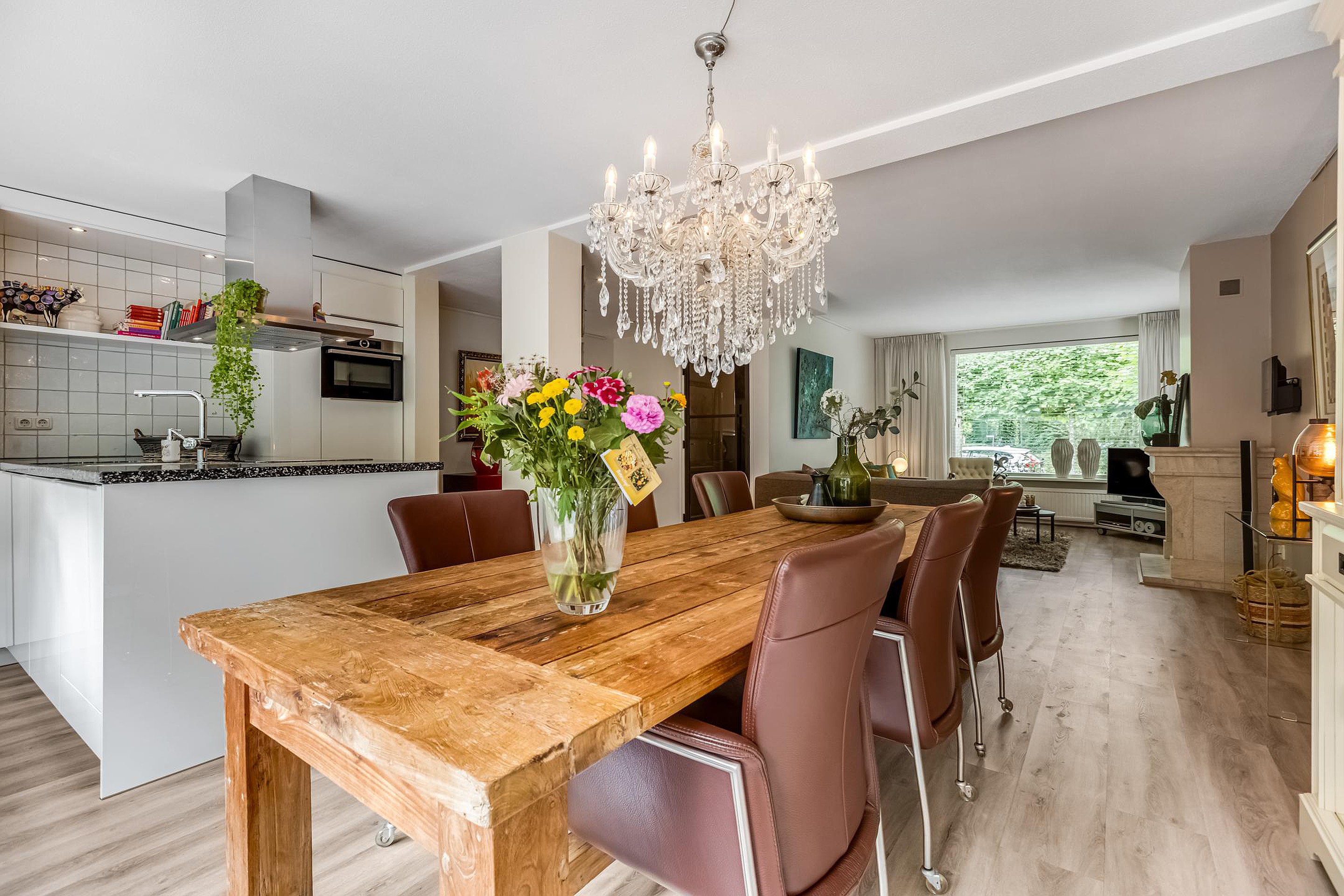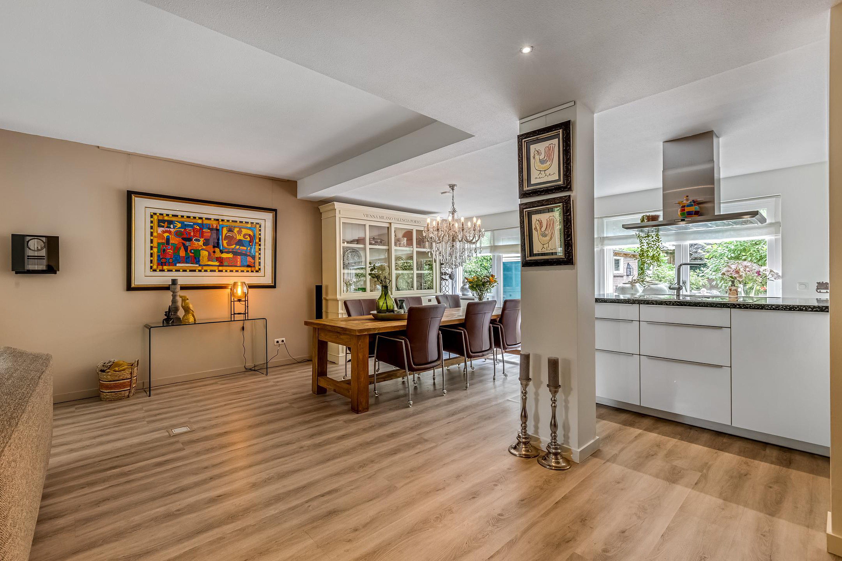 De uitgebouwde woonkamer is ruim en licht, voorzien van een gezellige gashaard en een laminaatvloer. Hier is volop ruimte voor een royale zithoek. De open keuken (2019), gelegen aan de achterzijde, is een droom voor kookliefhebbers: voorzien van een natuurstenen werkblad, spoelbak met luxe kraan, vijf zones inductiekookplaat, afzuigkap, combi-oven, koelkast, vaatwasser, ingebouwde koffiemachine en veel opbergruimte.