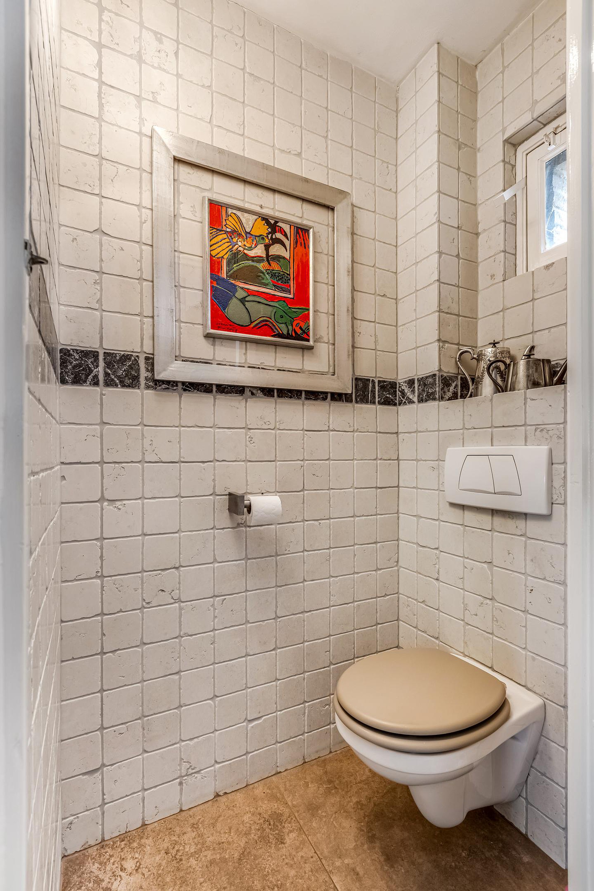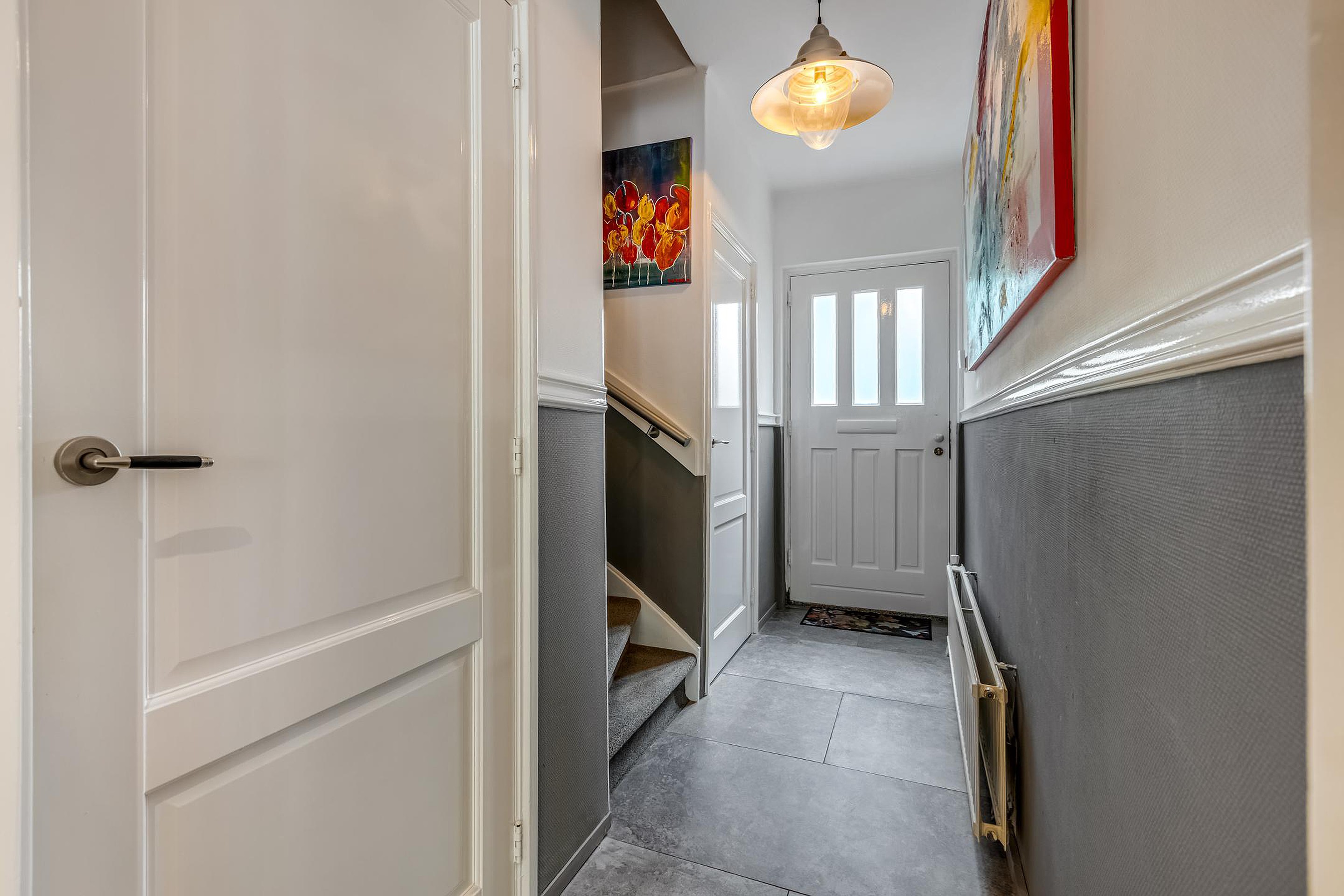 In de lange hal bevinden zich de trapopgang, een toiletruimte en een praktische kelder op stahoogte (ca. 7 m2) met vernieuwde meterkast (2004 – 8 groepen, 2 aardlek-schakelaars).