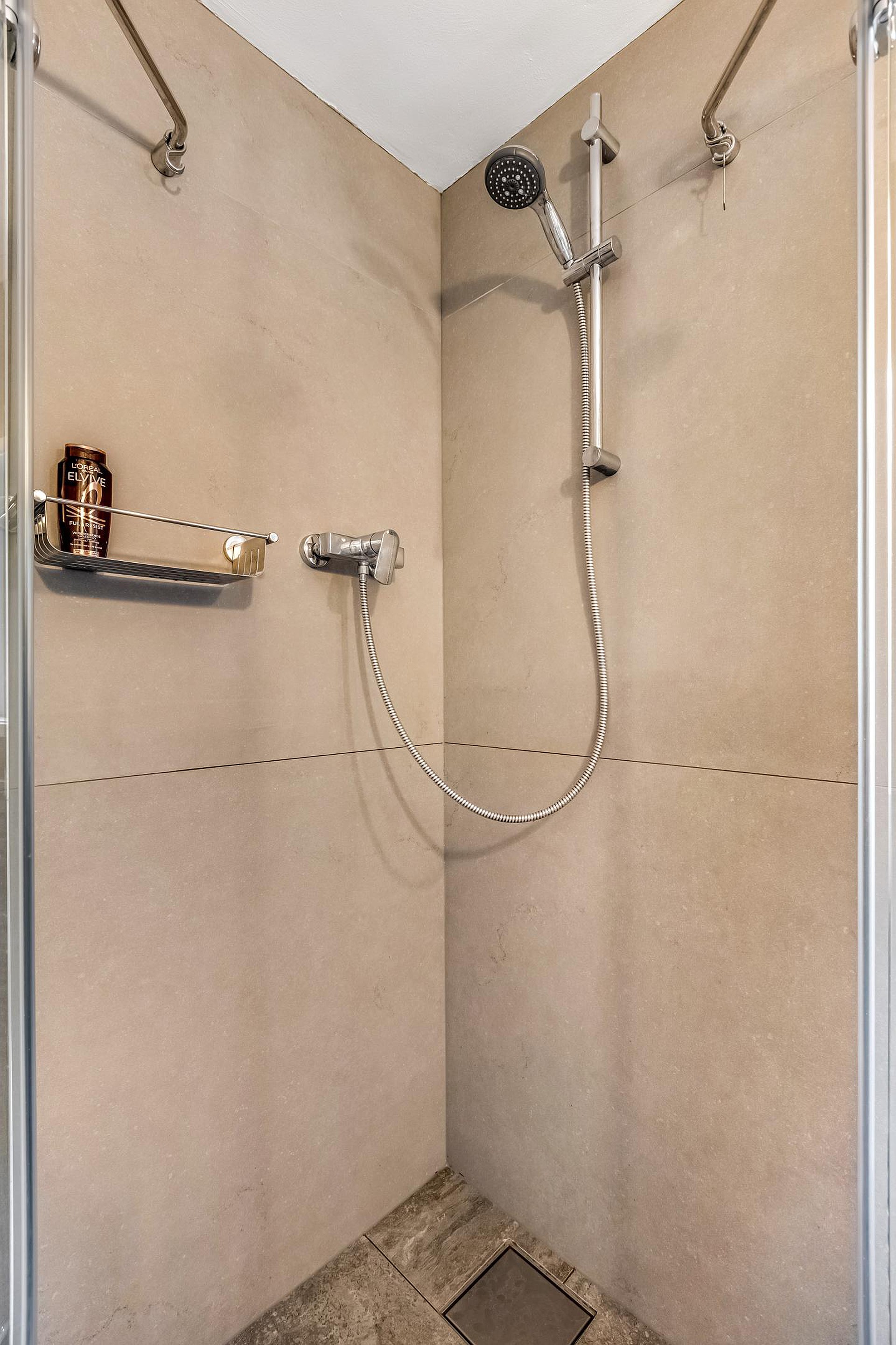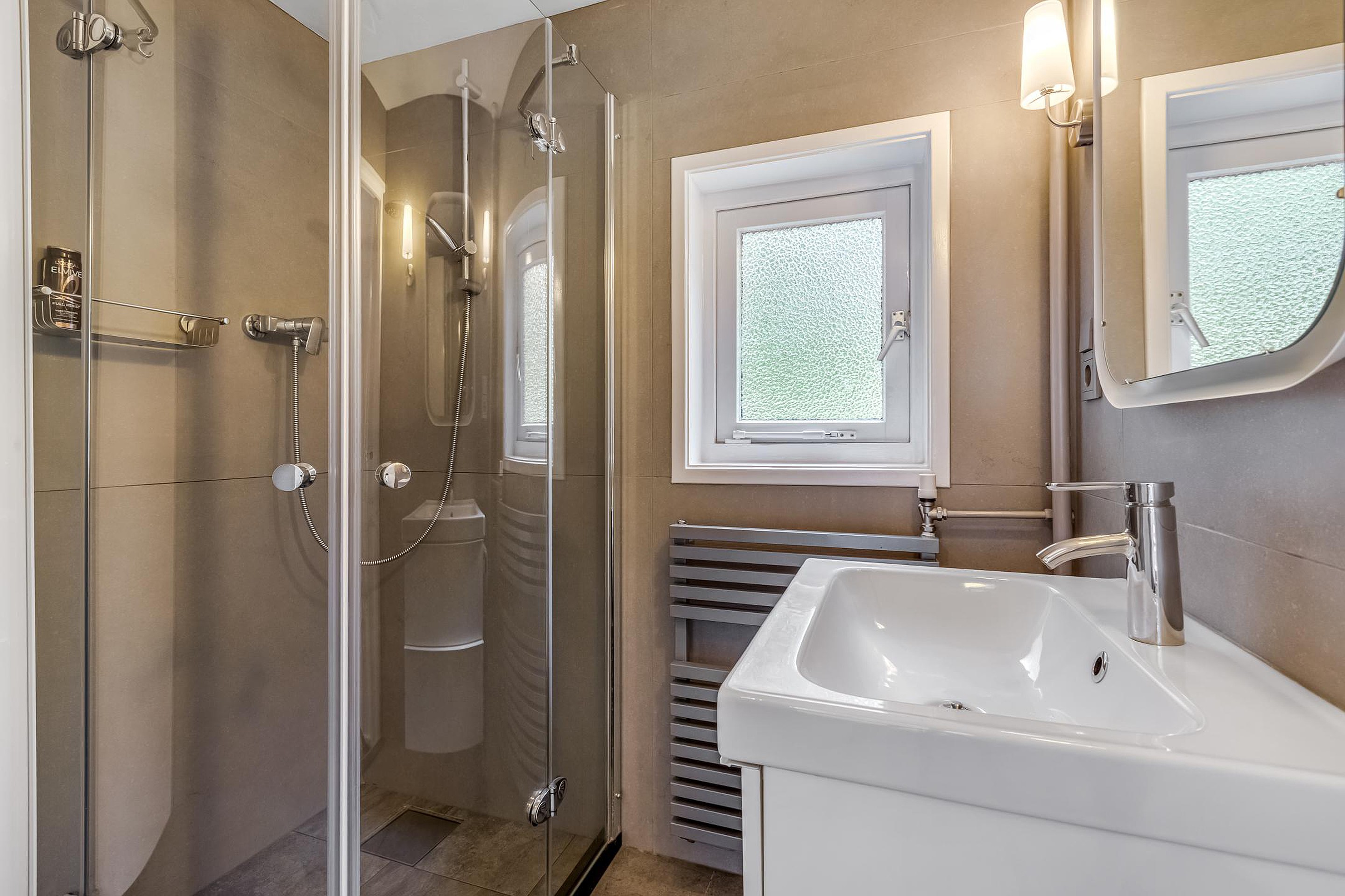 De badkamer is compact en voorzien van een douche, wastafelmeubel met spiegel en stopcontact, handdoekradiator en een raam voor natuurlijk daglicht.