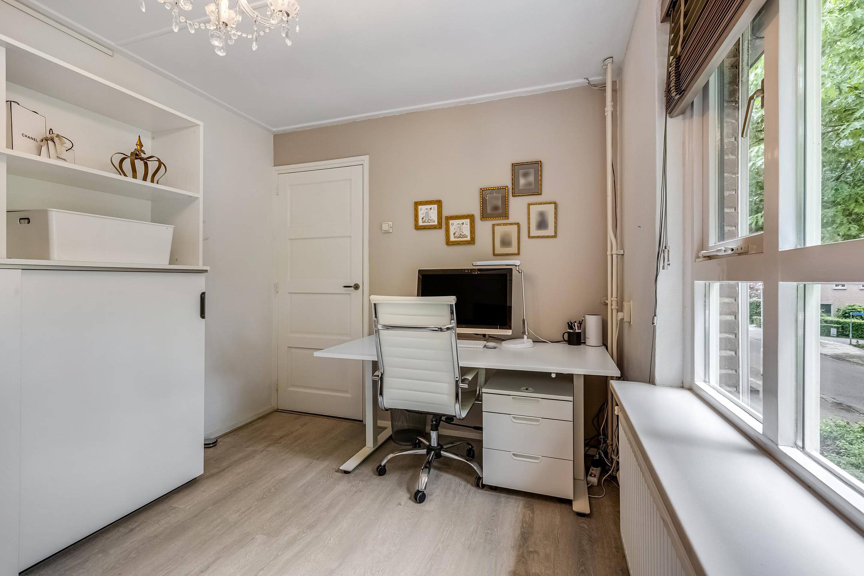 Eerste verdieping De overloop geeft toegang tot drie slaapkamers en de badkamer. Aan de voorzijde bevindt zich een slaapkamer van ca. 10 m2, momenteel in gebruik als kantoor.