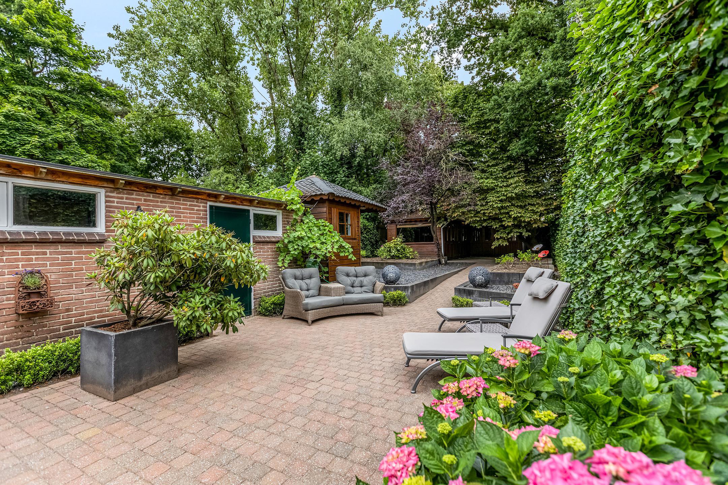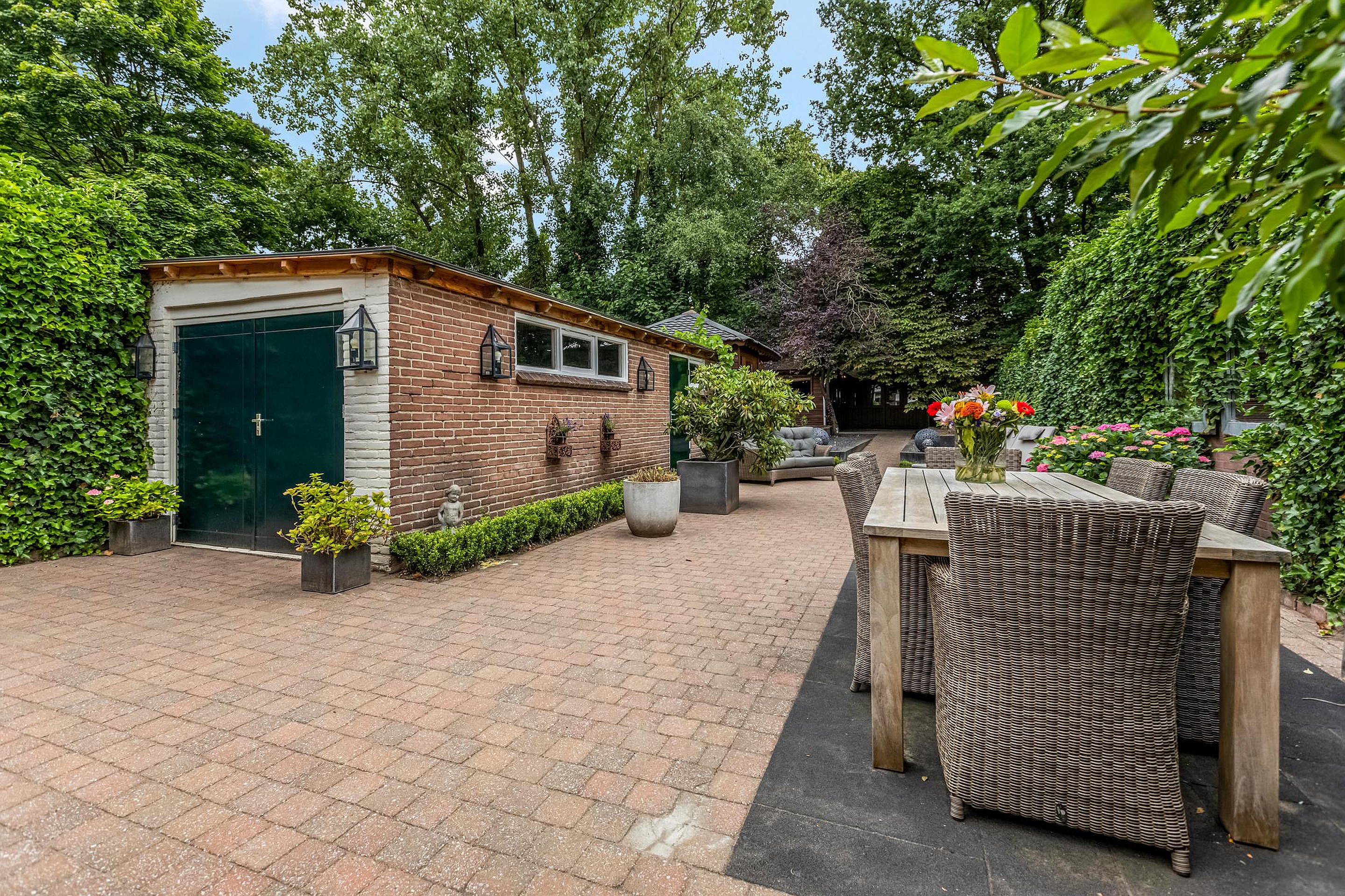 - Vrijstaande stenen garage, twee bergingen, houten tuinhuis en grote tuinkamer/veranda