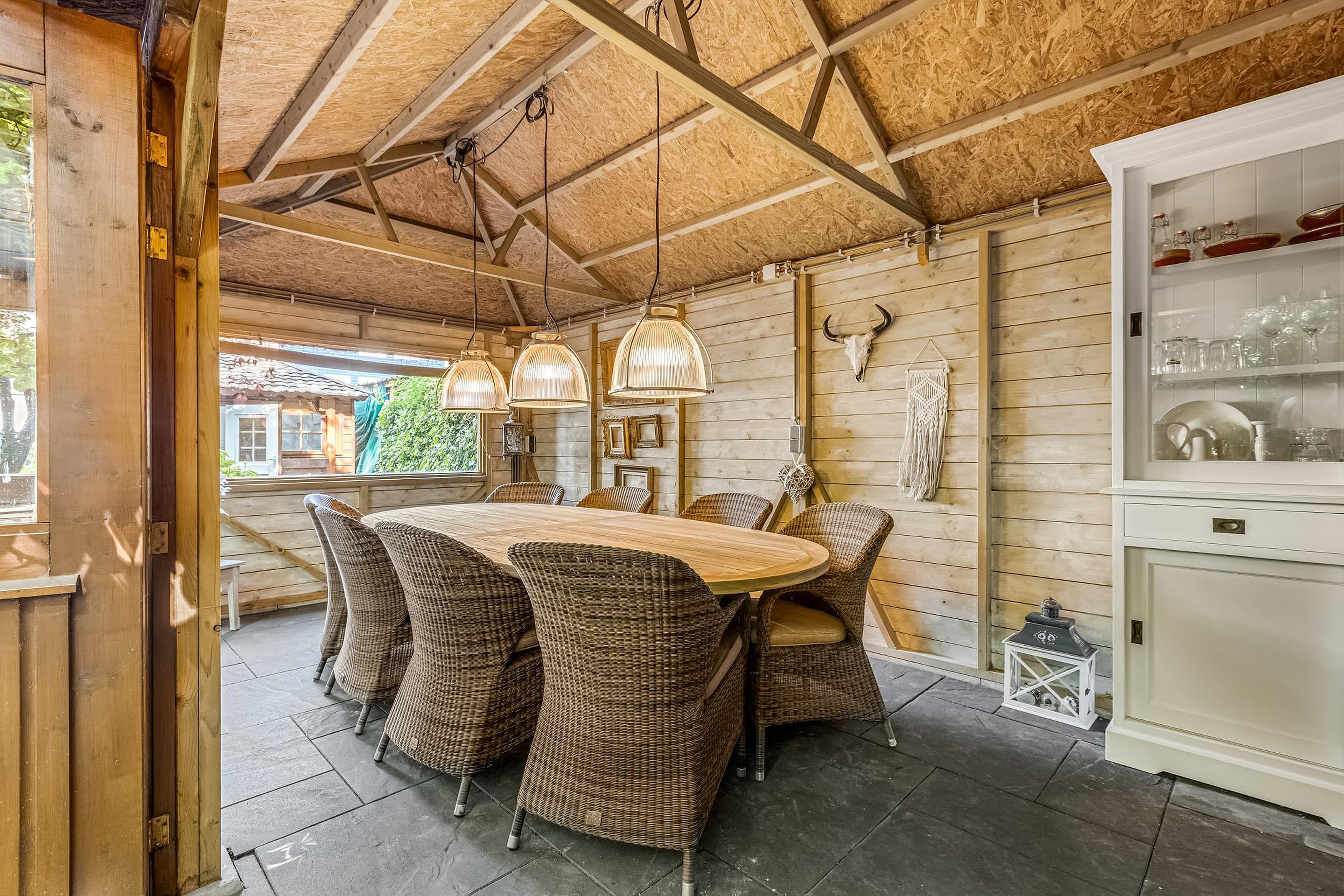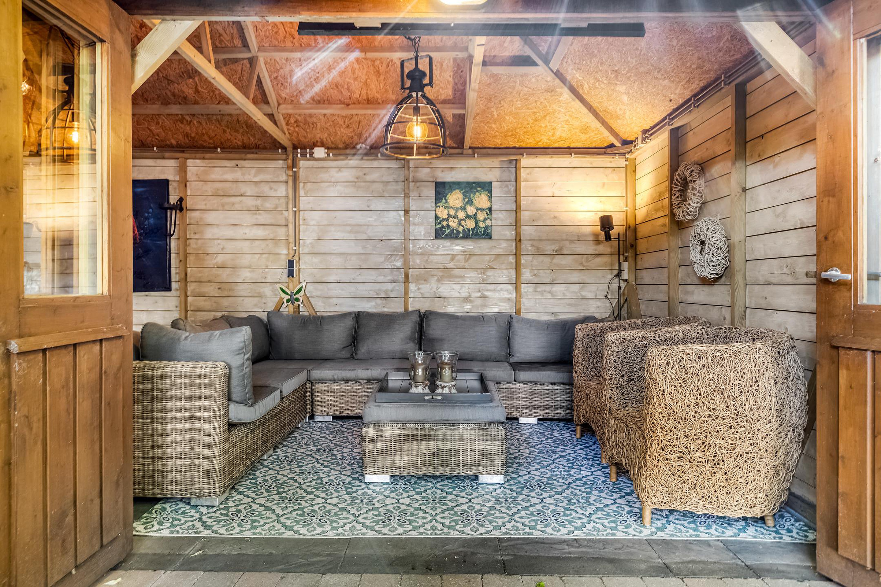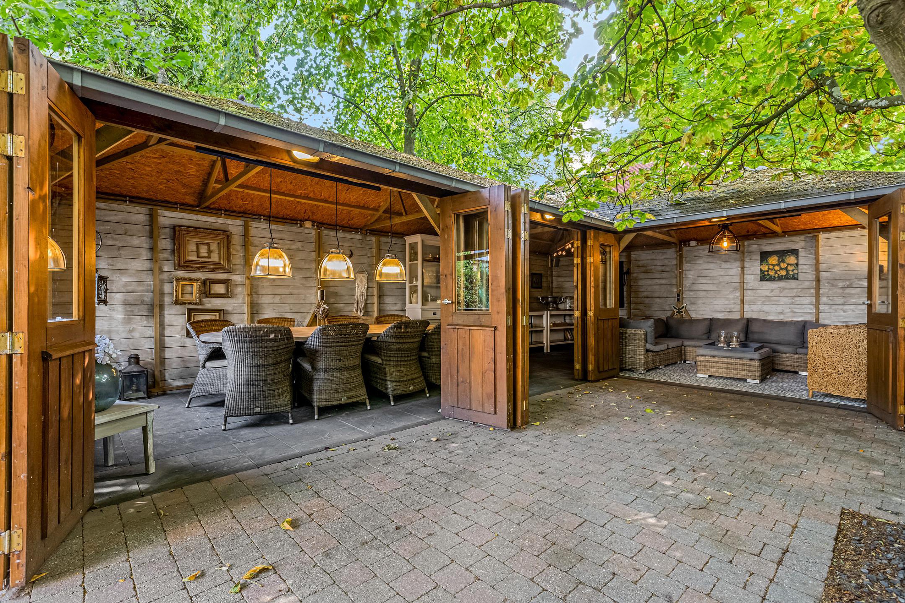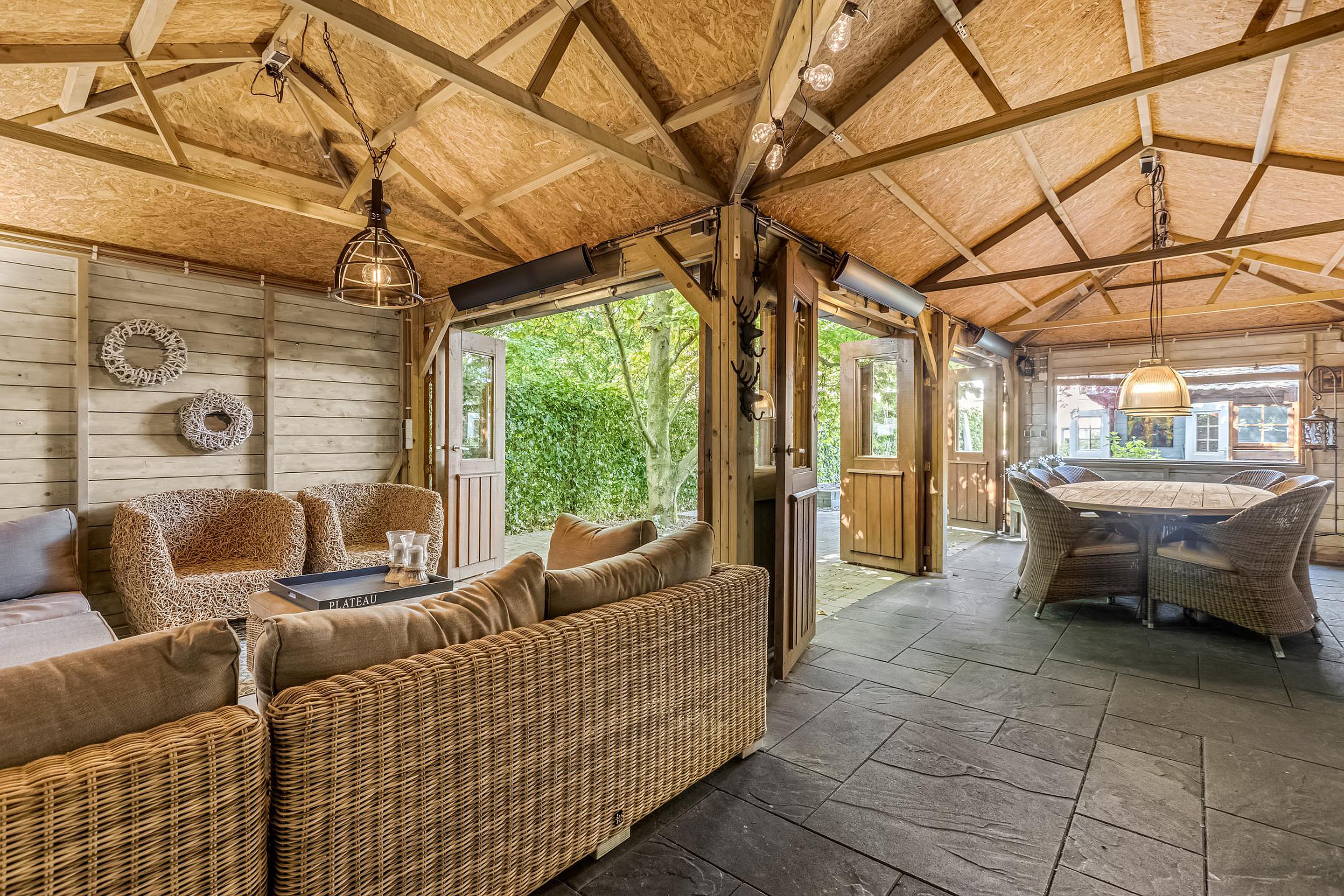 De grote houten tuinkamer/veranda van ca. 35 m2 is een absolute eyecatcher. Deze ruimte is afsluitbaar met opvouwbare deuren en voorzien van infrarood verwarming – perfect als tweede woonkamer of buitenkeuken. Een plek waar je het hele jaar door kunt genieten van buitenleven, ongeacht het weer.