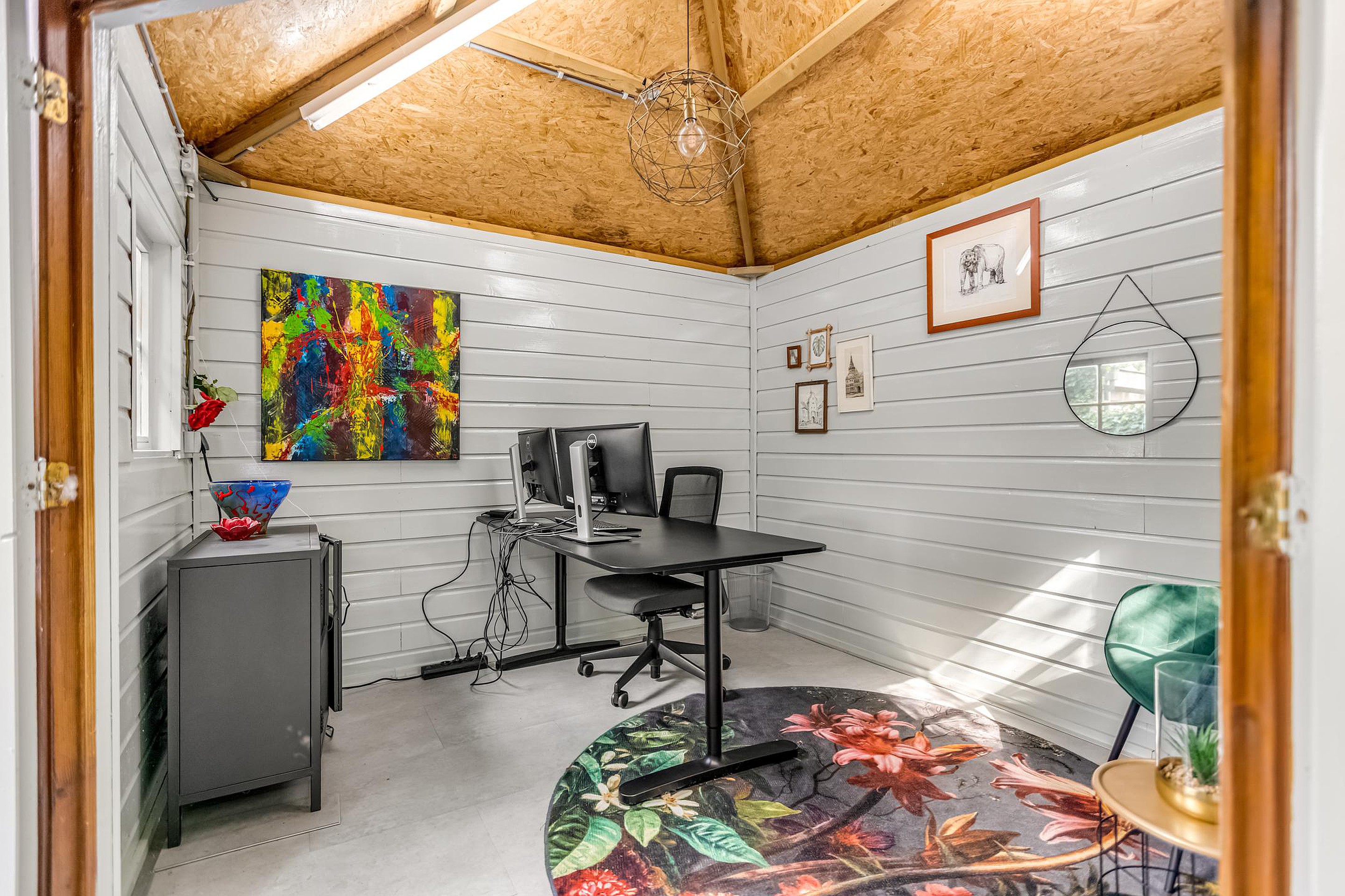 De lange oprit biedt plek voor twee auto’s en leidt naar een vrijstaande stenen garage (ca. 5,16 x 2,77 m), met een aansluitende stenen berging. Beide zijn voorzien van elektra.. Achter de berging bevindt zich een houten tuinhuis, dat nu in gebruik is als kantoor. Deze ruimte is voorzien van een airco-unit die zowel kan koelen als verwarmen.