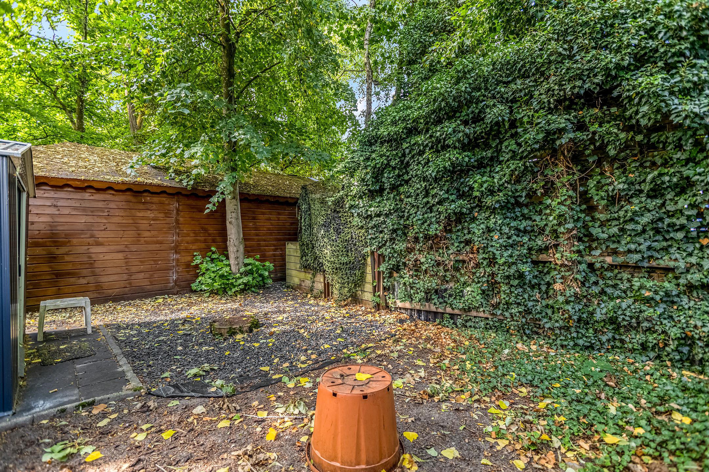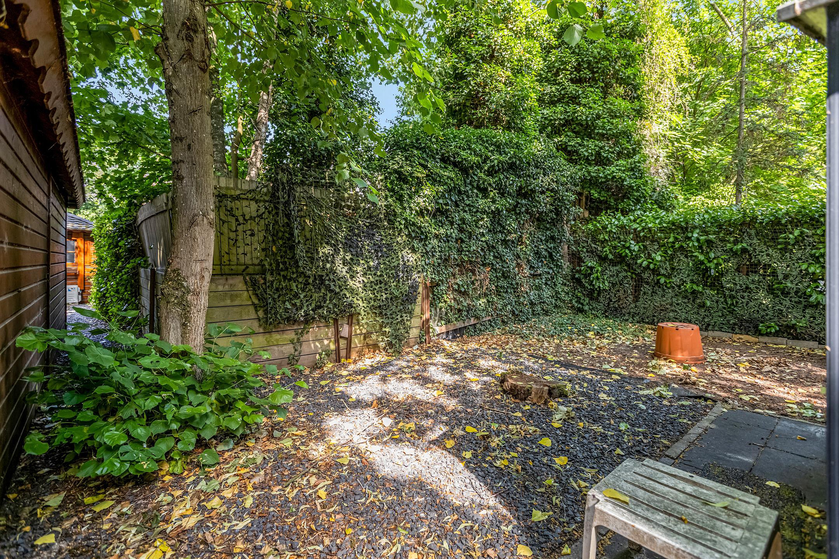 Tuin De achtertuin is uitzonderlijk diep (ca. 32 meter) en fraai aangelegd met diverse plantenperken, bloemen, bomen en meerdere terrassen. Je kunt op elk moment van de dag kiezen voor zon of schaduw. Dankzij de ligging op het oosten, geniet je van een heerlijke ochtendzon. De tuin is onderhoudsarm aangelegd en biedt veel privacy. Via een poort aan de zijkant is de tuin ook bereikbaar vanaf de oprit.
