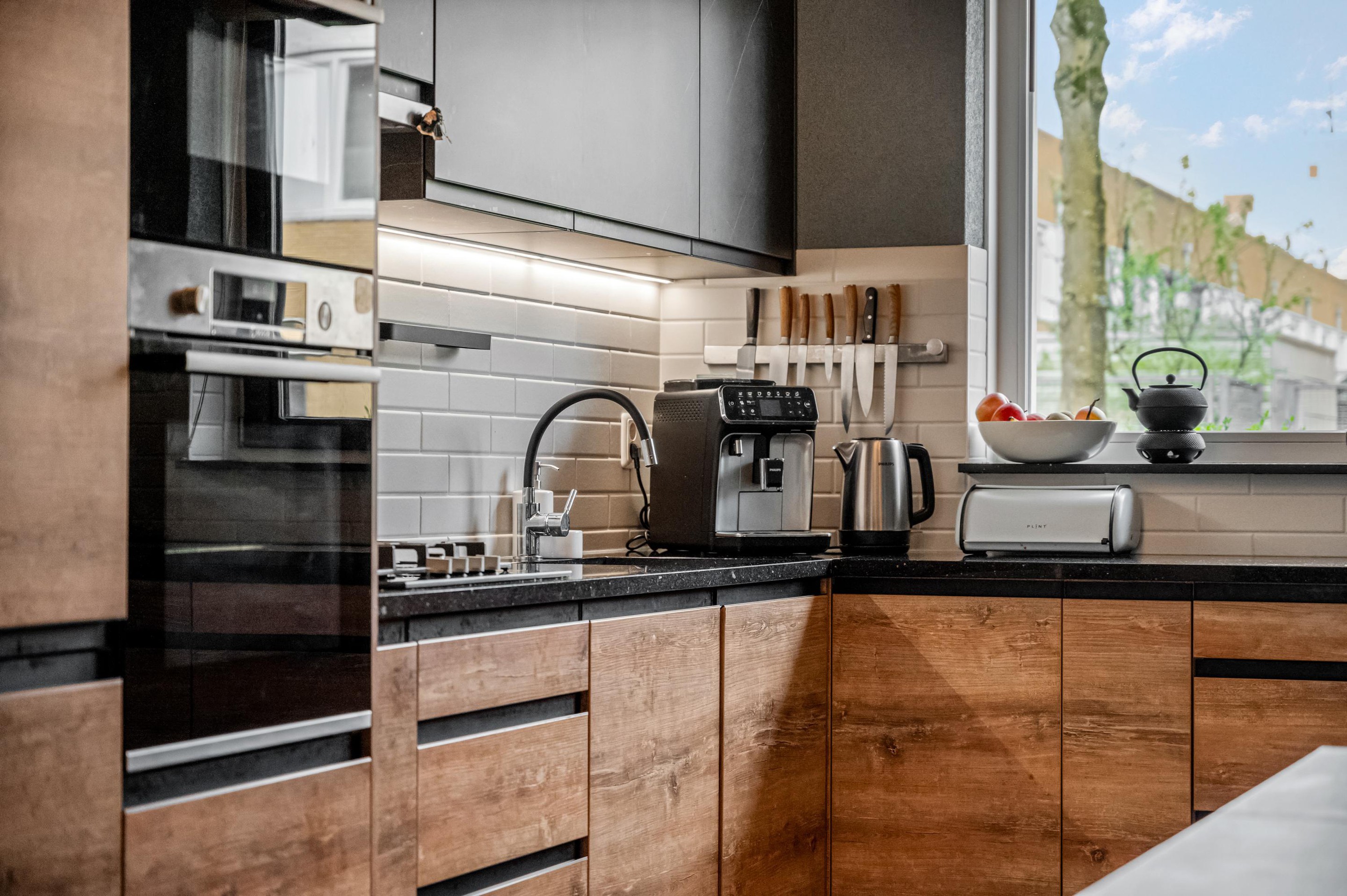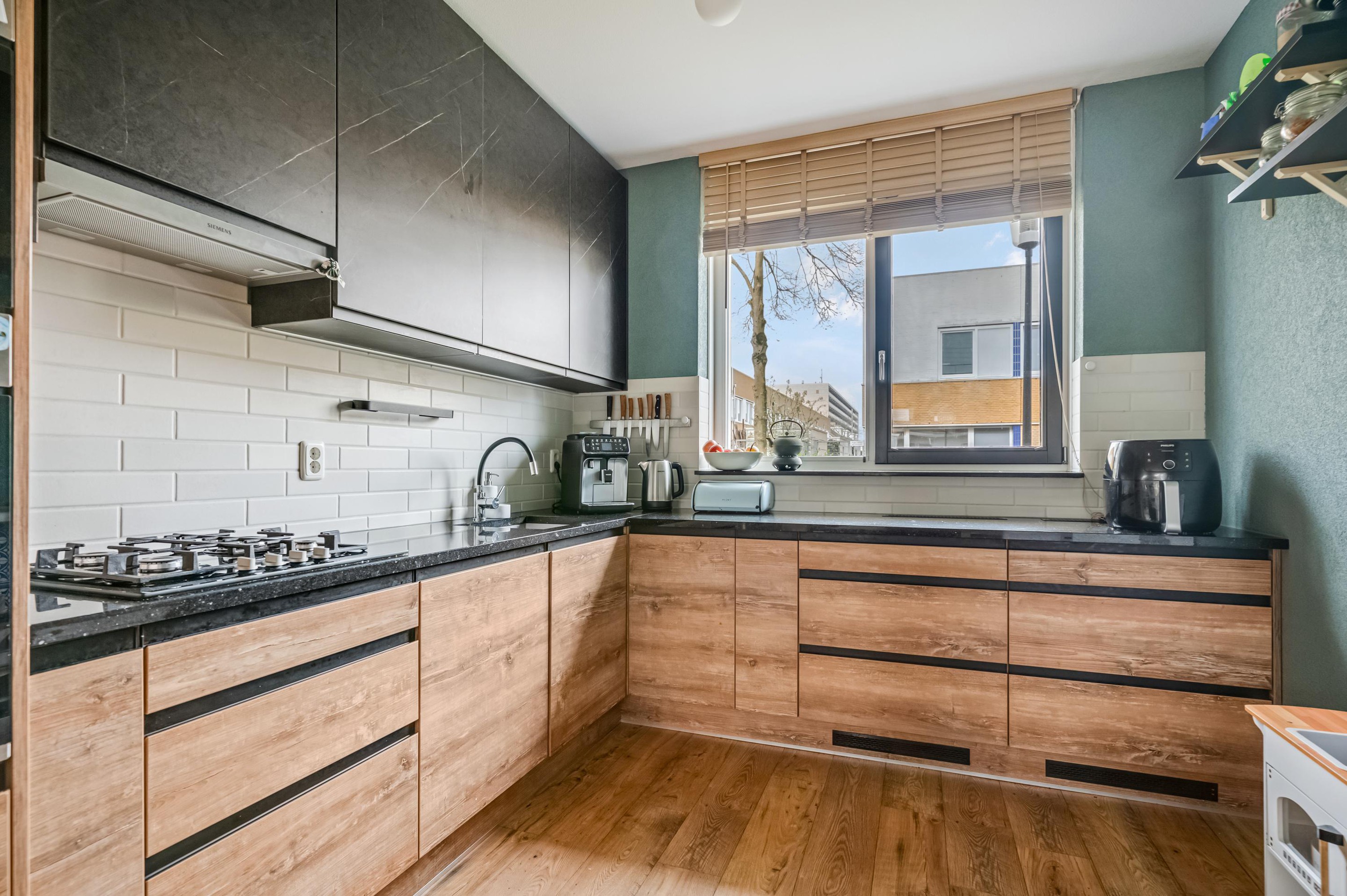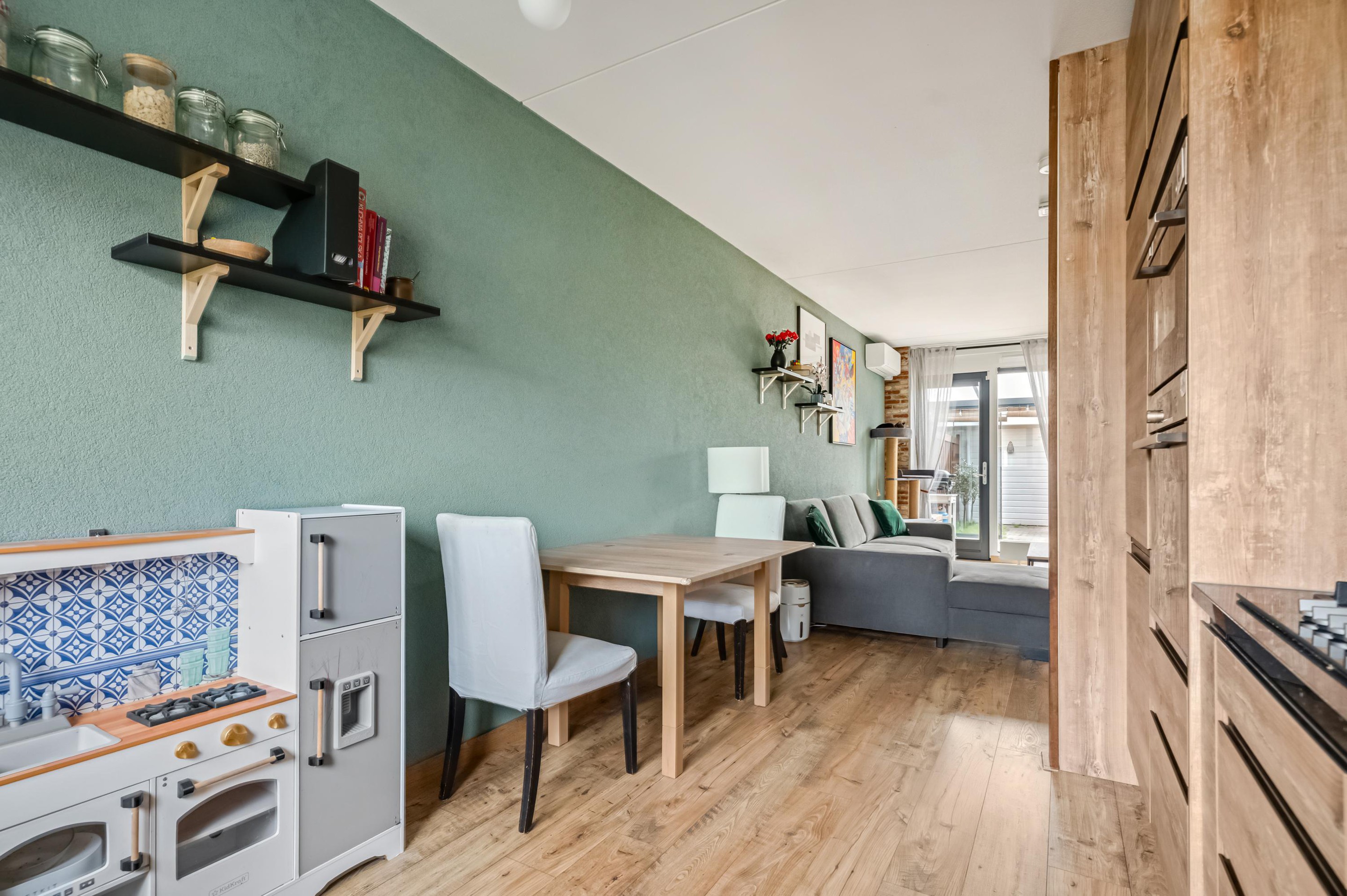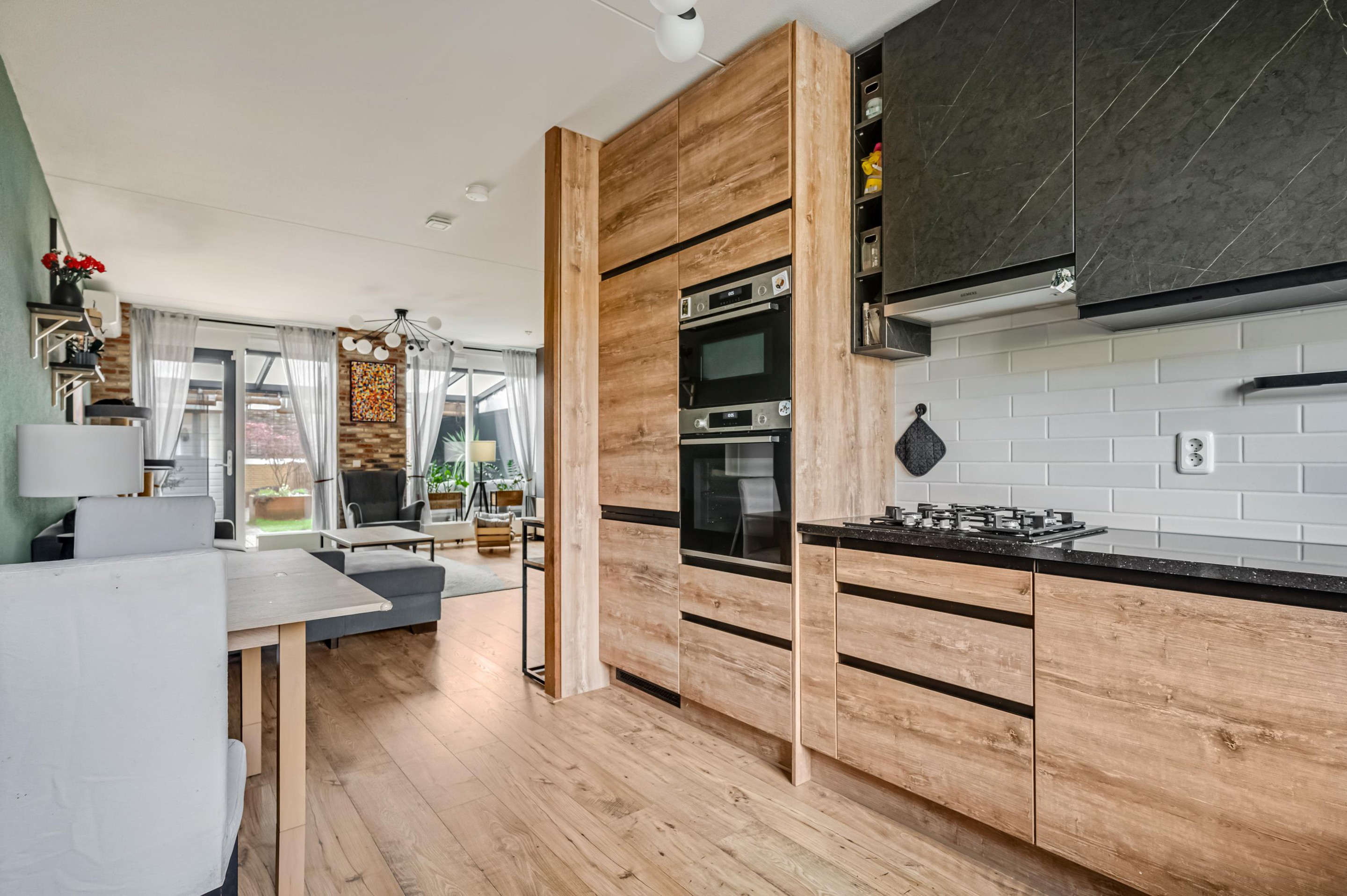 Aan de voorzijde bevindt zich de keuken in praktische L-opstelling. Deze is compleet uitgerust met een 4-pits gasfornuis, afzuigkap, oven, combi-oven, koel/vriescombinatie en vaatwasser. Of je nu snel iets bereidt of uitgebreid kookt: hier kan het allemaal. De aangrenzende eethoek is een heerlijke plek met uitzicht op de voortuin – perfect voor lange ontbijtjes of gezellige diners. De woonkamer ligt aan de tuinzijde en is verrassend ruim. Dankzij de grote raampartijen ontstaat een mooie verbinding met buiten. De indeling biedt volop mogelijkheden voor een comfortabele zithoek, werkplek of speelhoek. Vanuit de woonkamer loop je direct de tuinkamer in, waardoor binnen en buiten naadloos in elkaar overlopen.