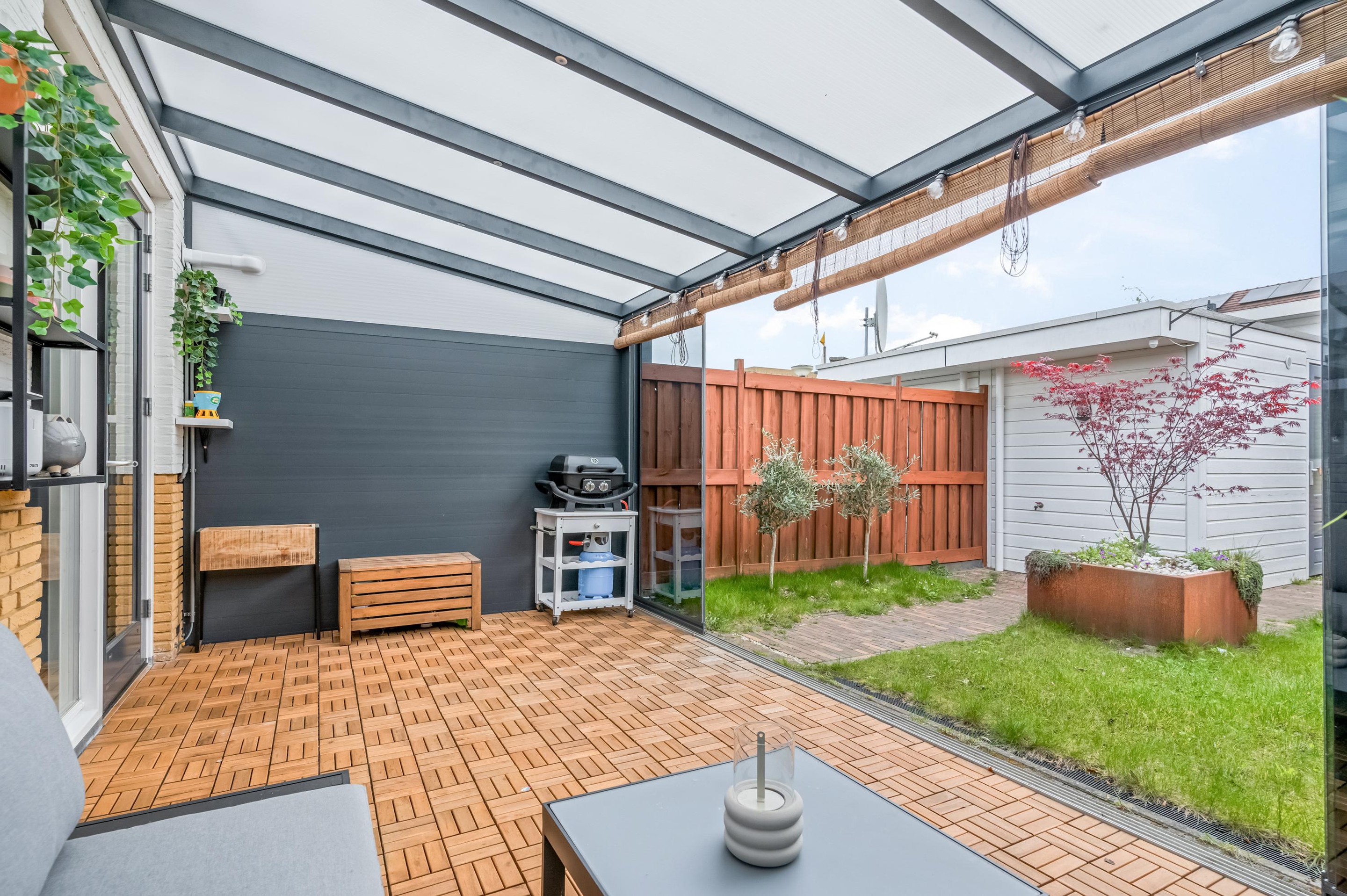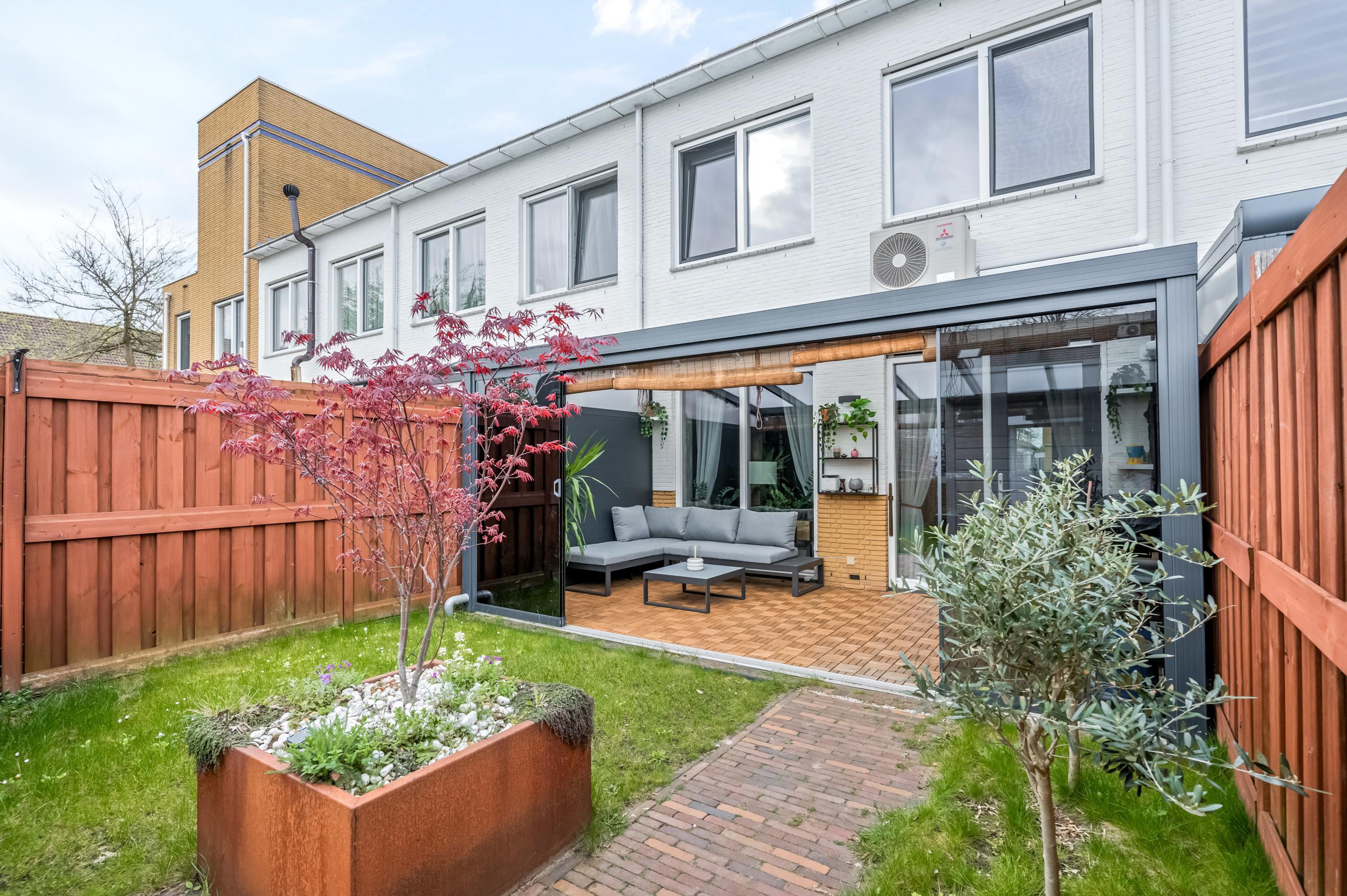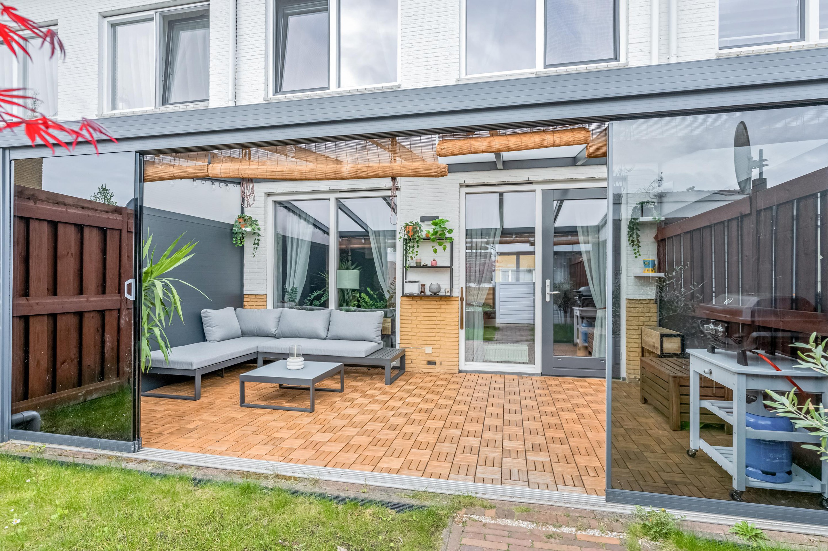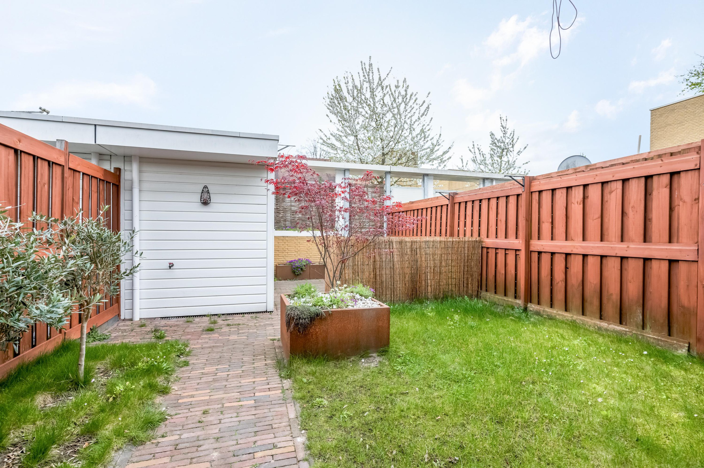 Achterin de tuin staat een houten berging, ideaal voor fietsen en opslag. Via de achterom bereik je direct de speeltuin: praktisch en perfect voor gezinnen.