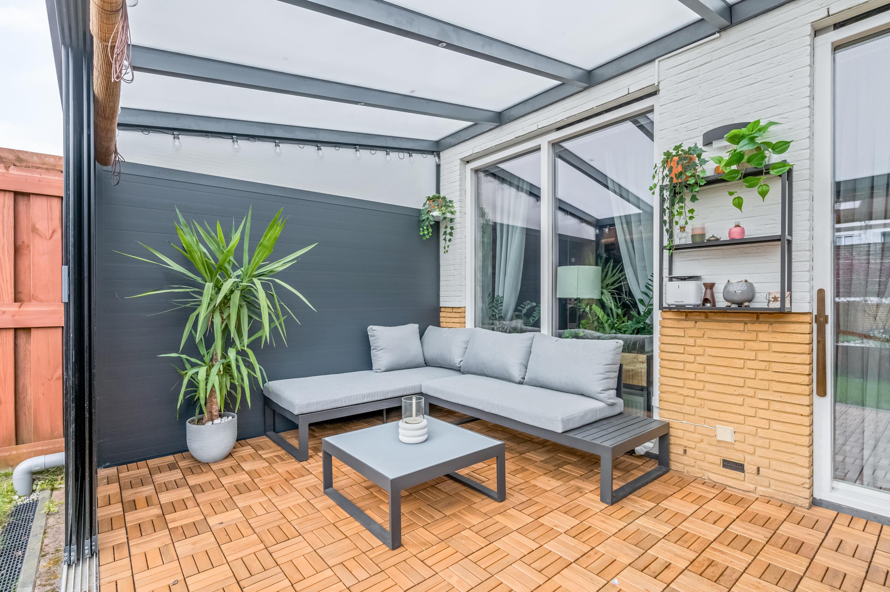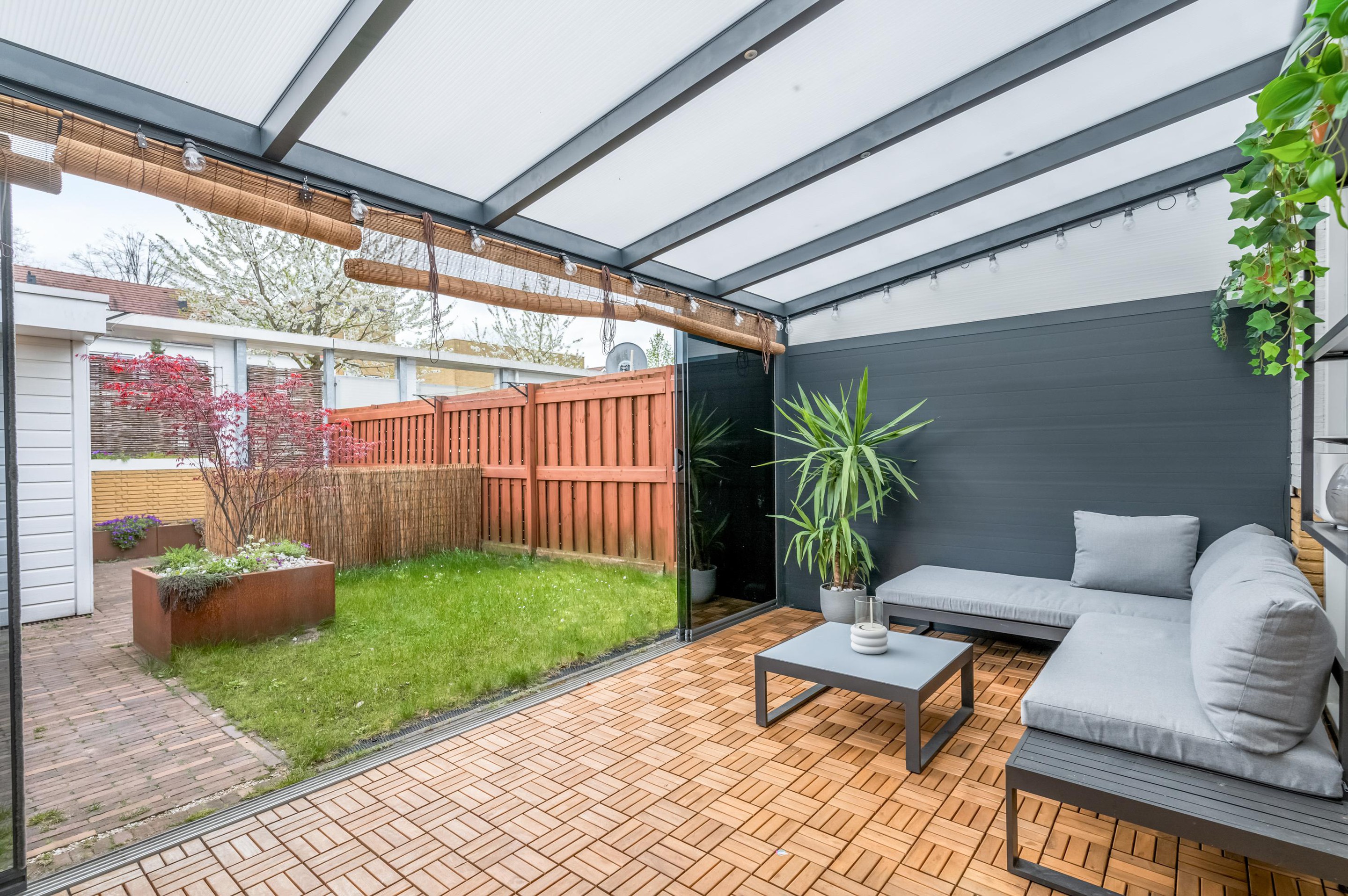 Tuin De achtertuin is strak aangelegd, onderhoudsvriendelijk en gelegen op het oosten. In de tuinkamer zit je hier het hele jaar door comfortabel en beschut. De tuin beschikt over twee gazonstroken, nette bestrating en een plantenbak – een fijne plek om te ontspannen en te genieten van het buitenleven.