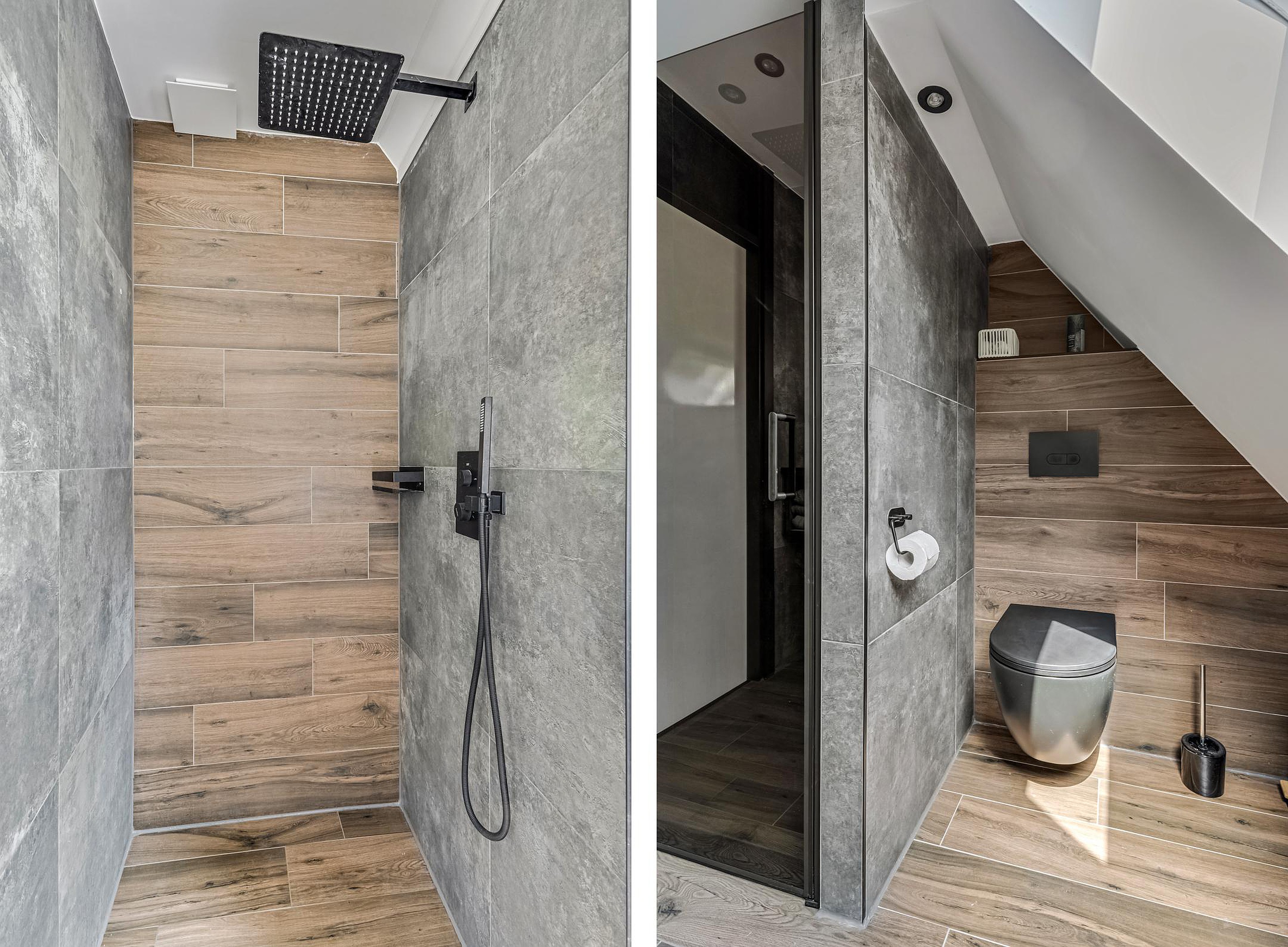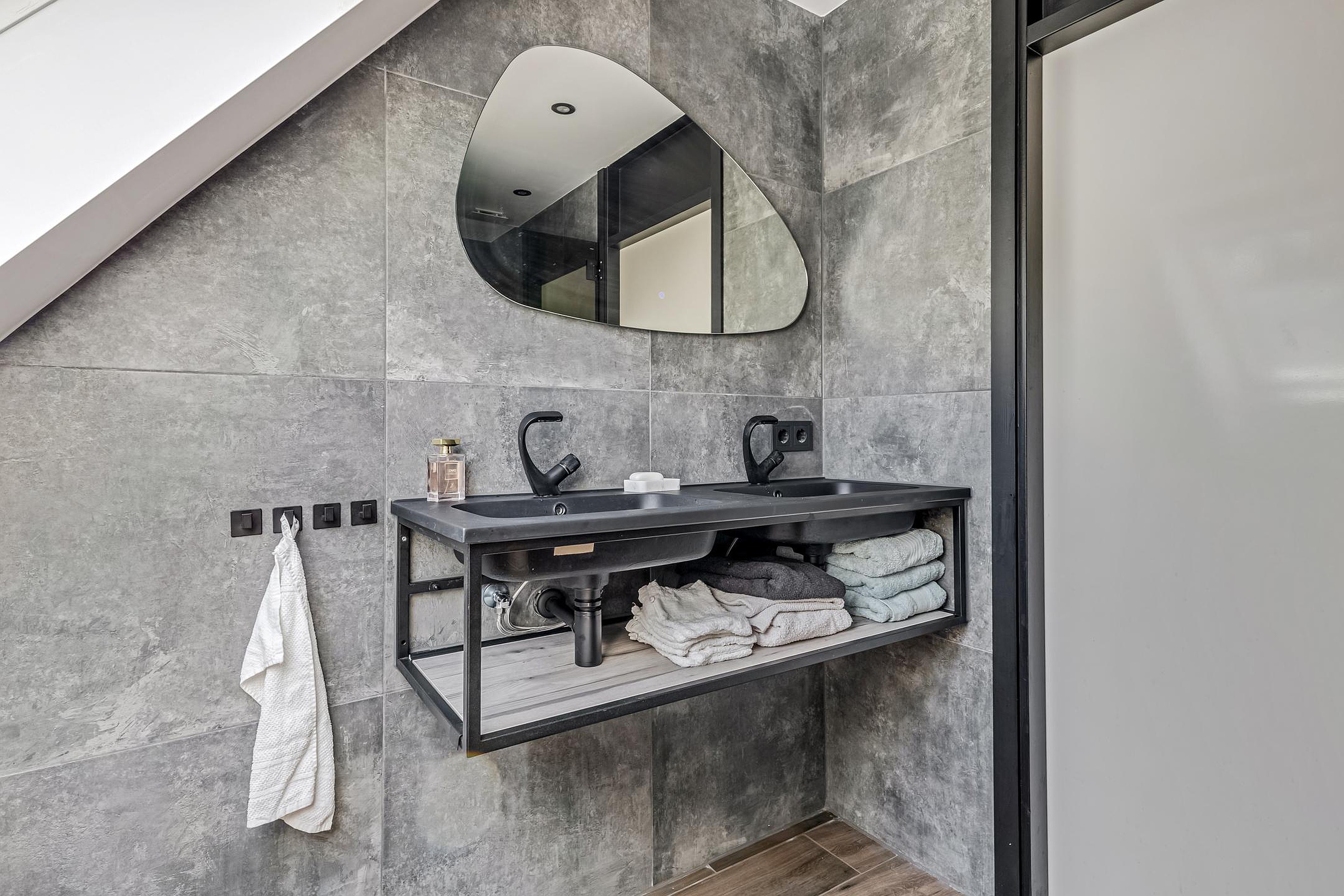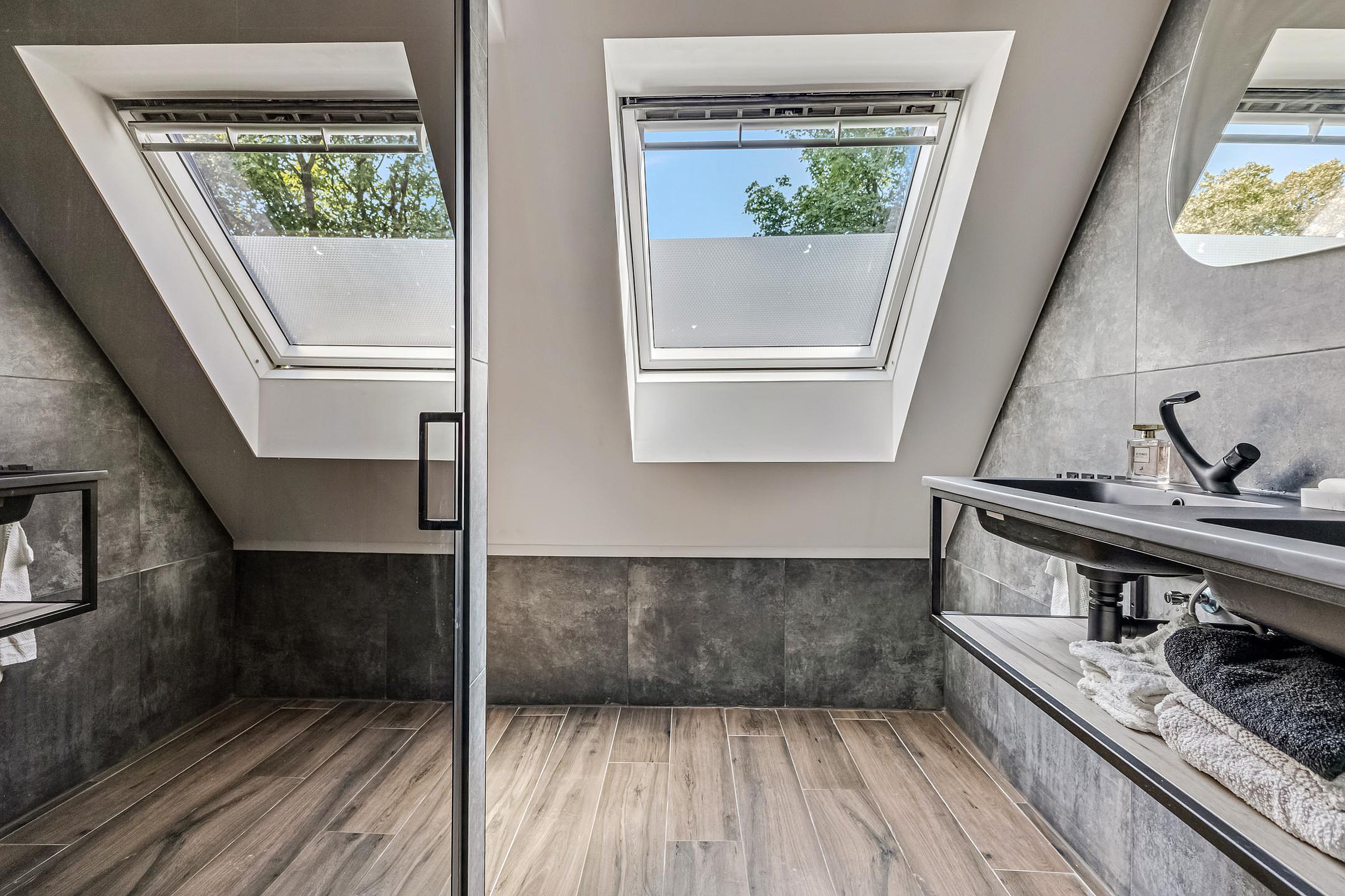 Eerste verdieping Overloop, 3 slaapkamers voorzien van dakramen, vernieuwde badkamer (2025) et dubbele wastafels, inloopdouche met rookglazen deur met heerlijke stortdouche en handdouche, 2e toilet, ventilatie en fijn daglicht d.m.v. een groot dakraam (ca 2021).