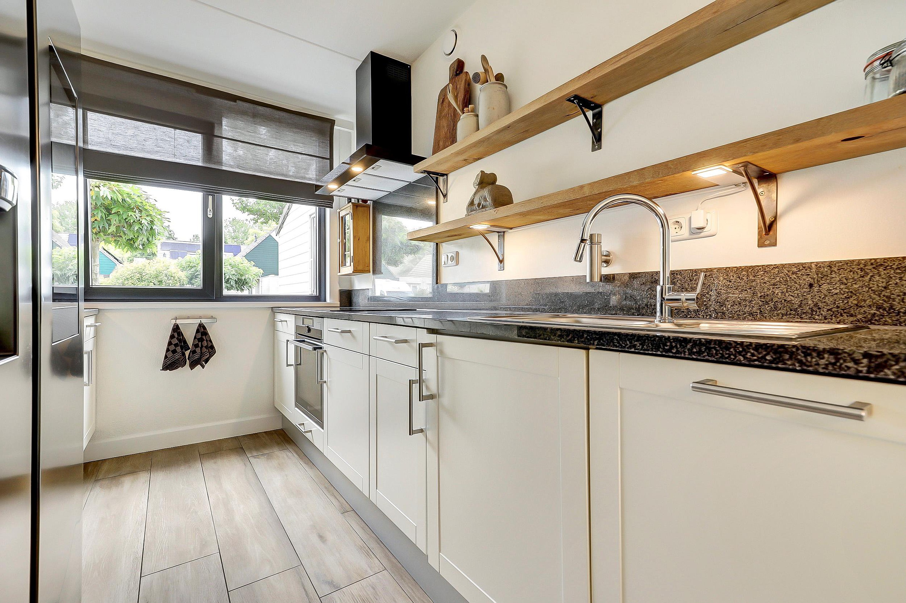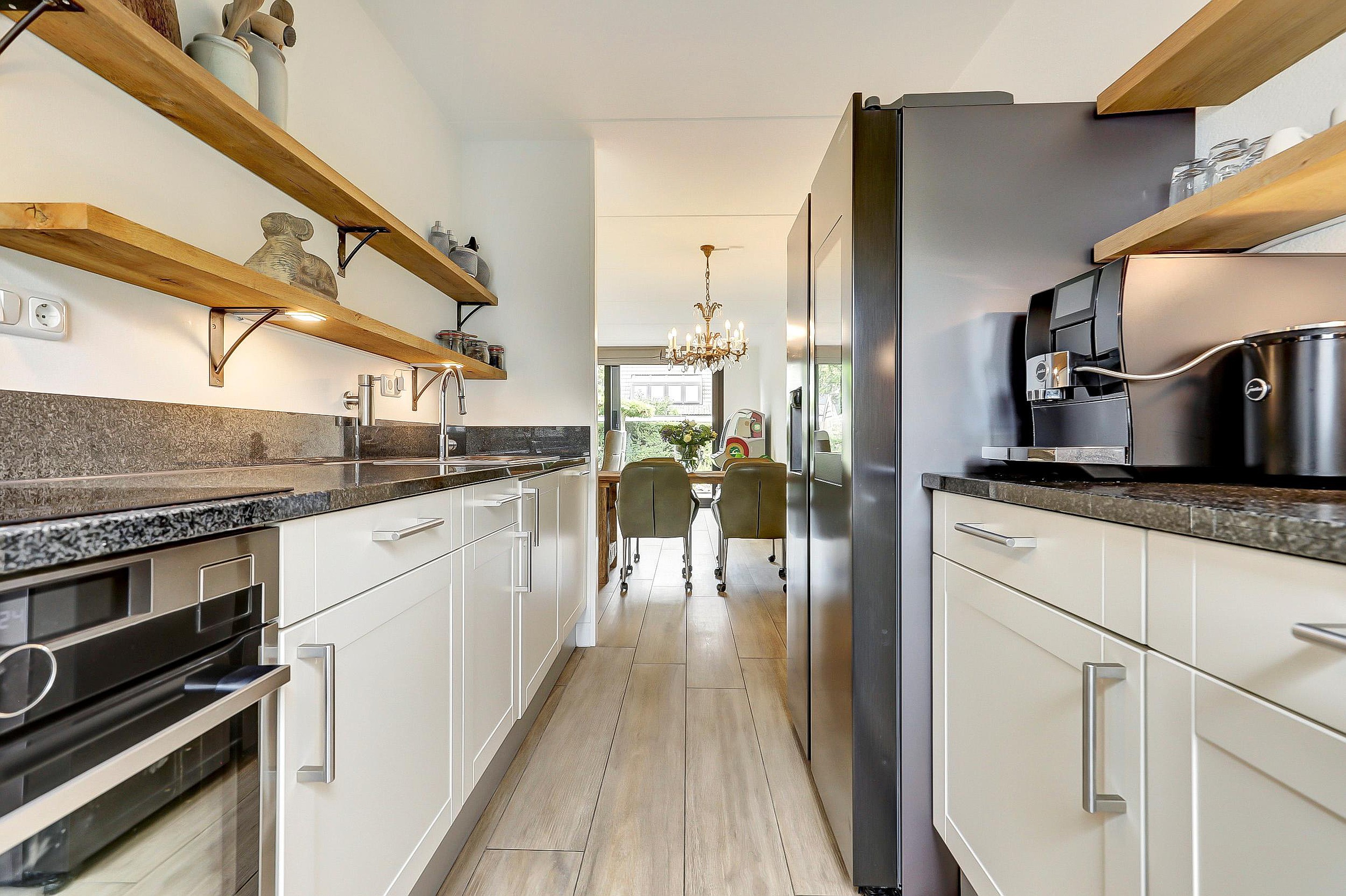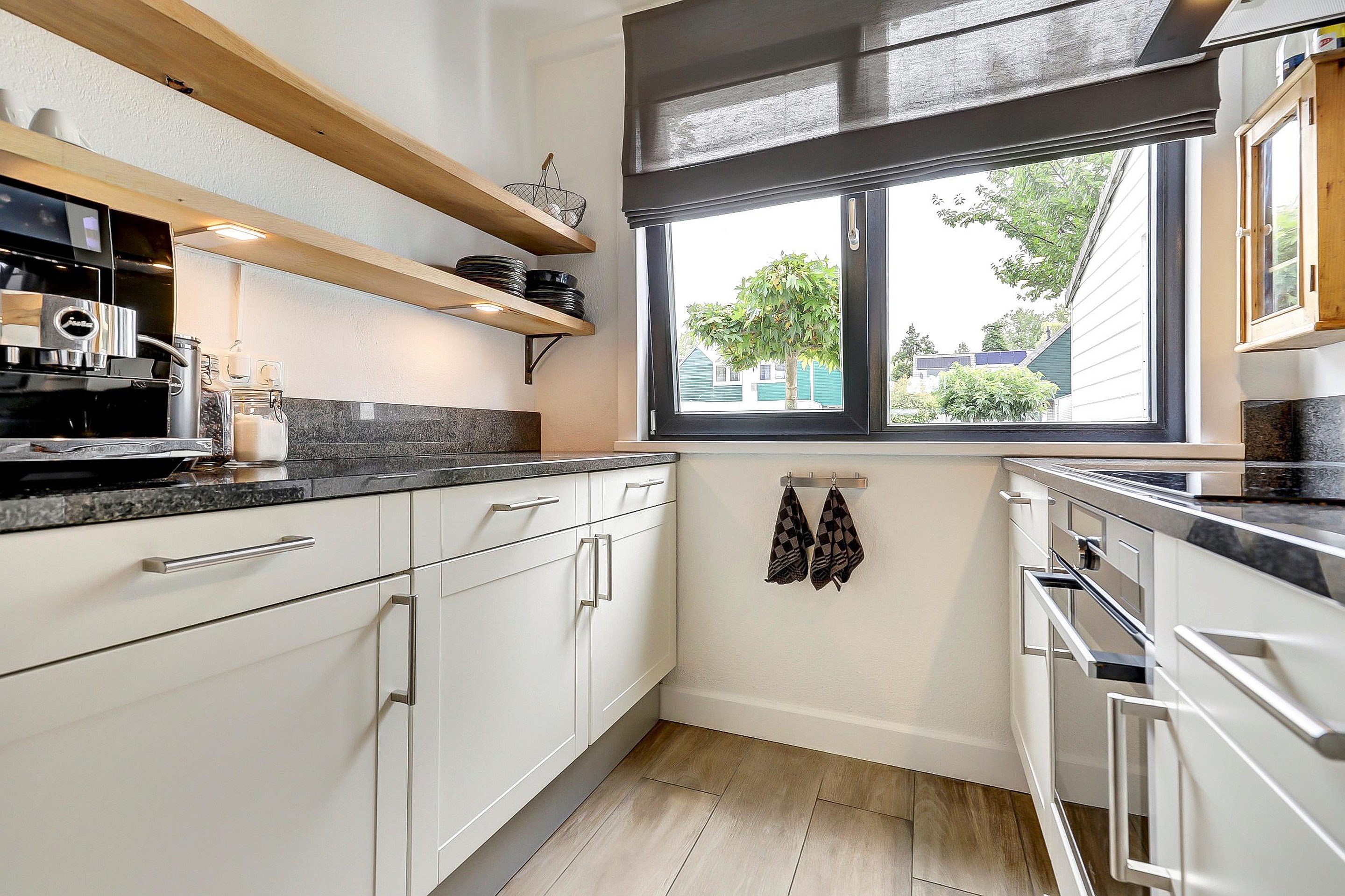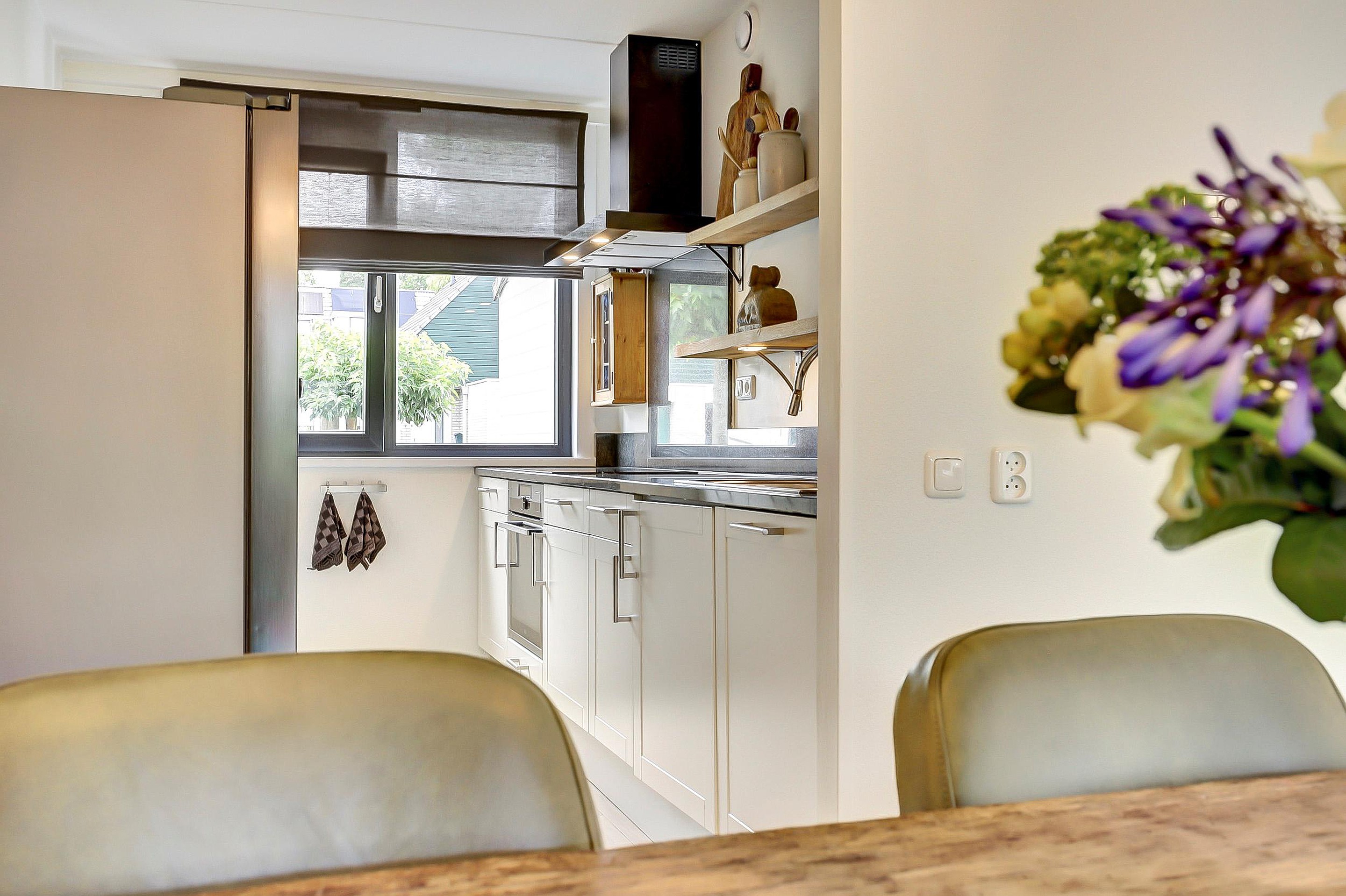 De halfopen keuken bevindt zich aan de voorzijde en is een echte blikvanger! Hier kookt u met plezier dankzij de moderne opstelling, voorzien van een keramische kookplaat, afzuigkap, luxe (stoom)oven, vaatwasser, (losse) Amerikaanse koelkast en een natuurstenen werkblad.