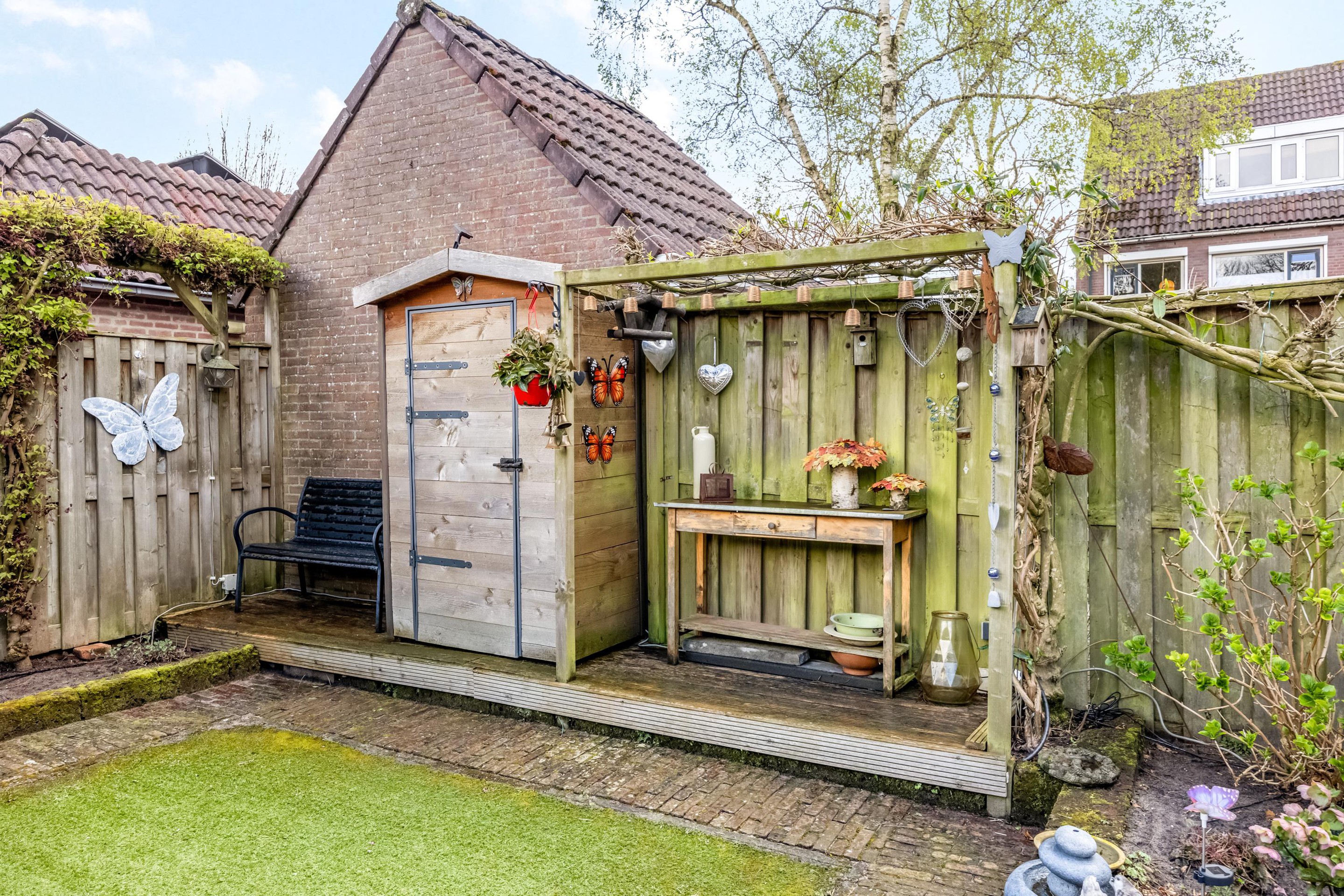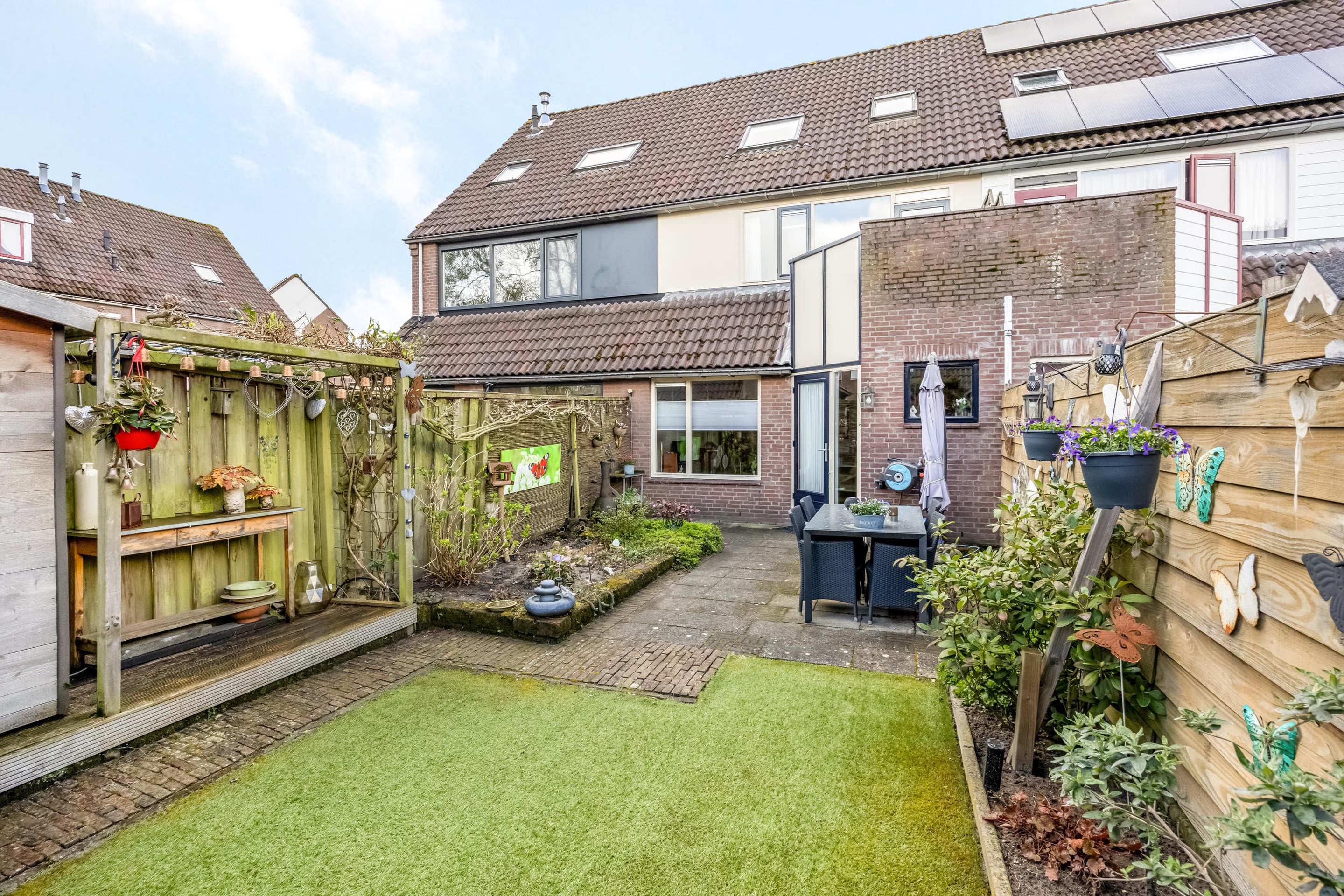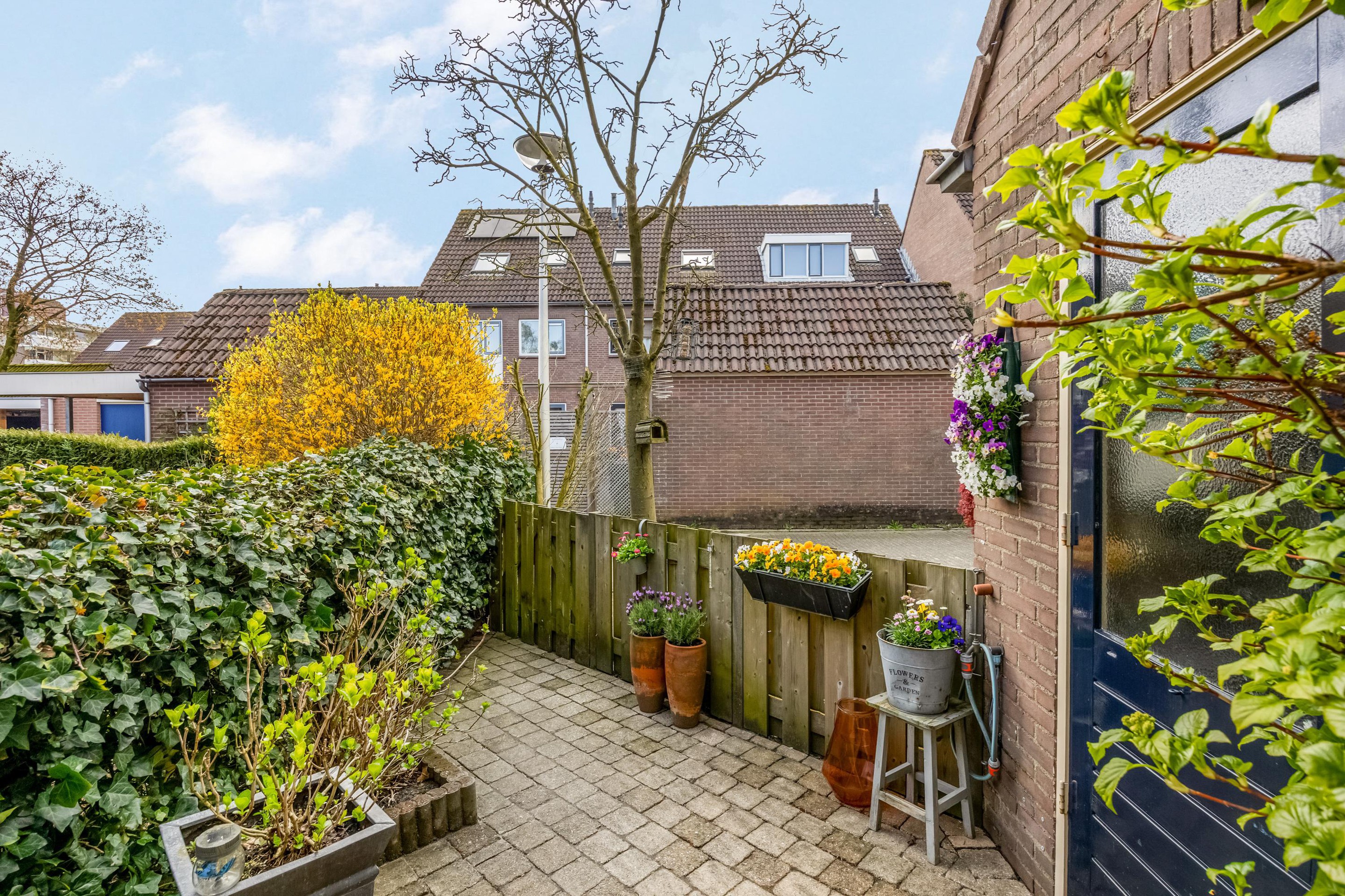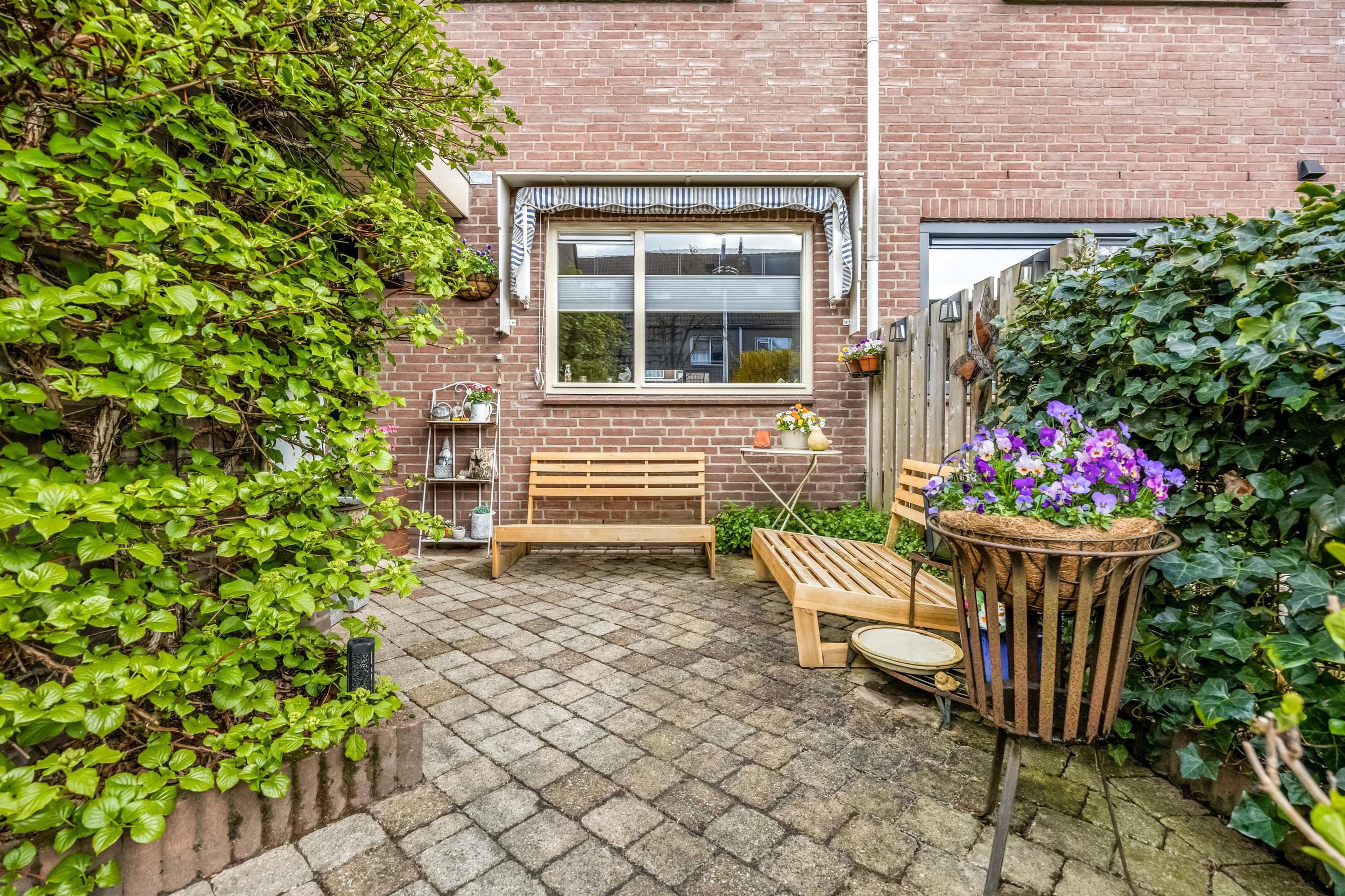 De fraai aangelegde voortuin zorgt voor extra privacy en een groene, rustige uitstraling. De diepe achtertuin, gelegen op het oosten, is verzorgd ingericht met een mooie mix van groen en bestrating. Hier geniet je van zon, rust en ruimte. Via de achterom bereik je eenvoudig de steeg.