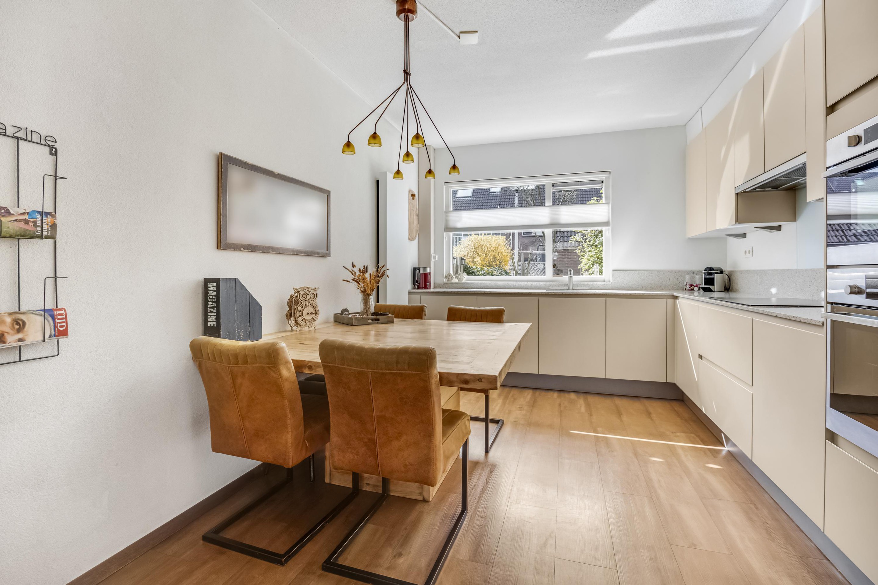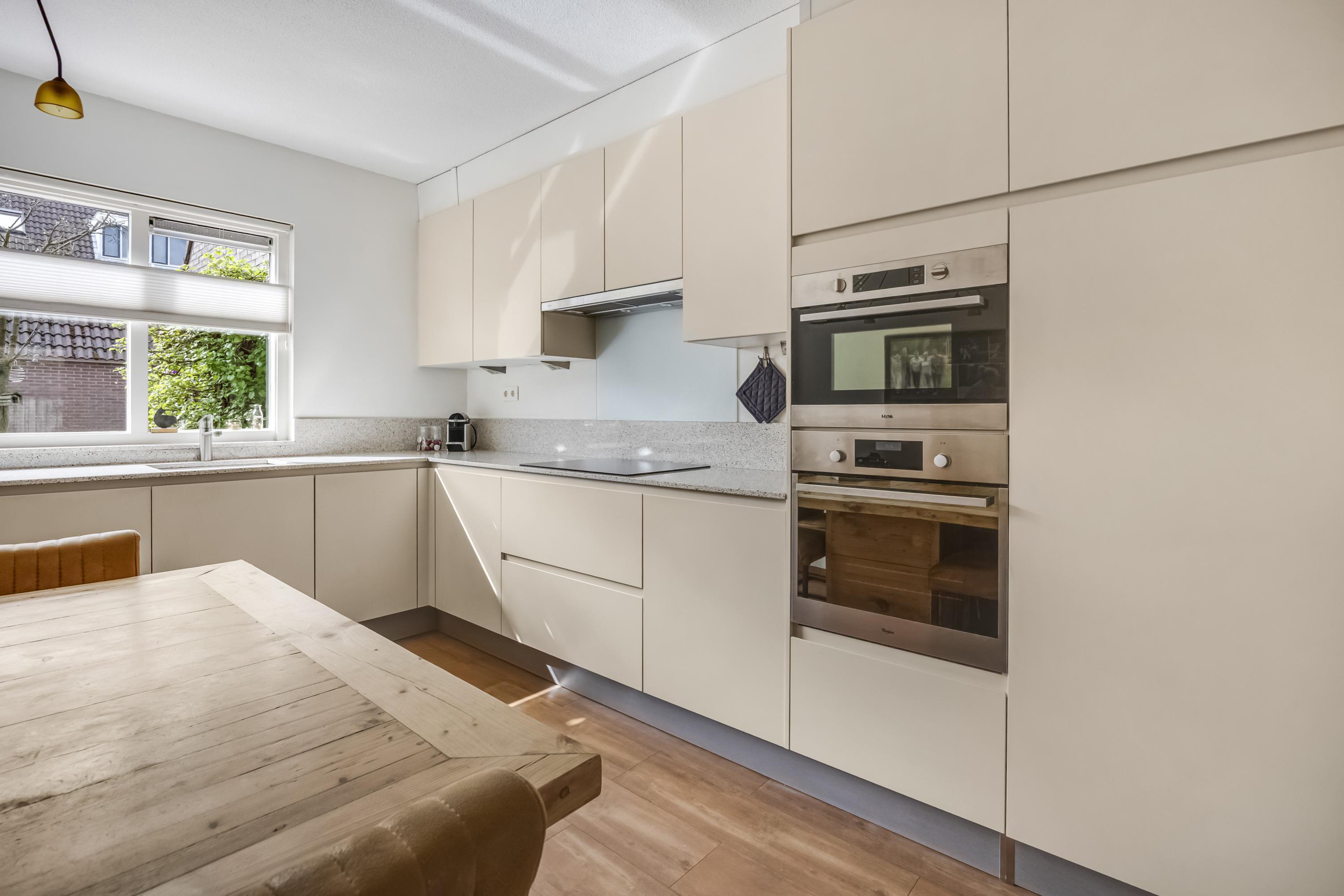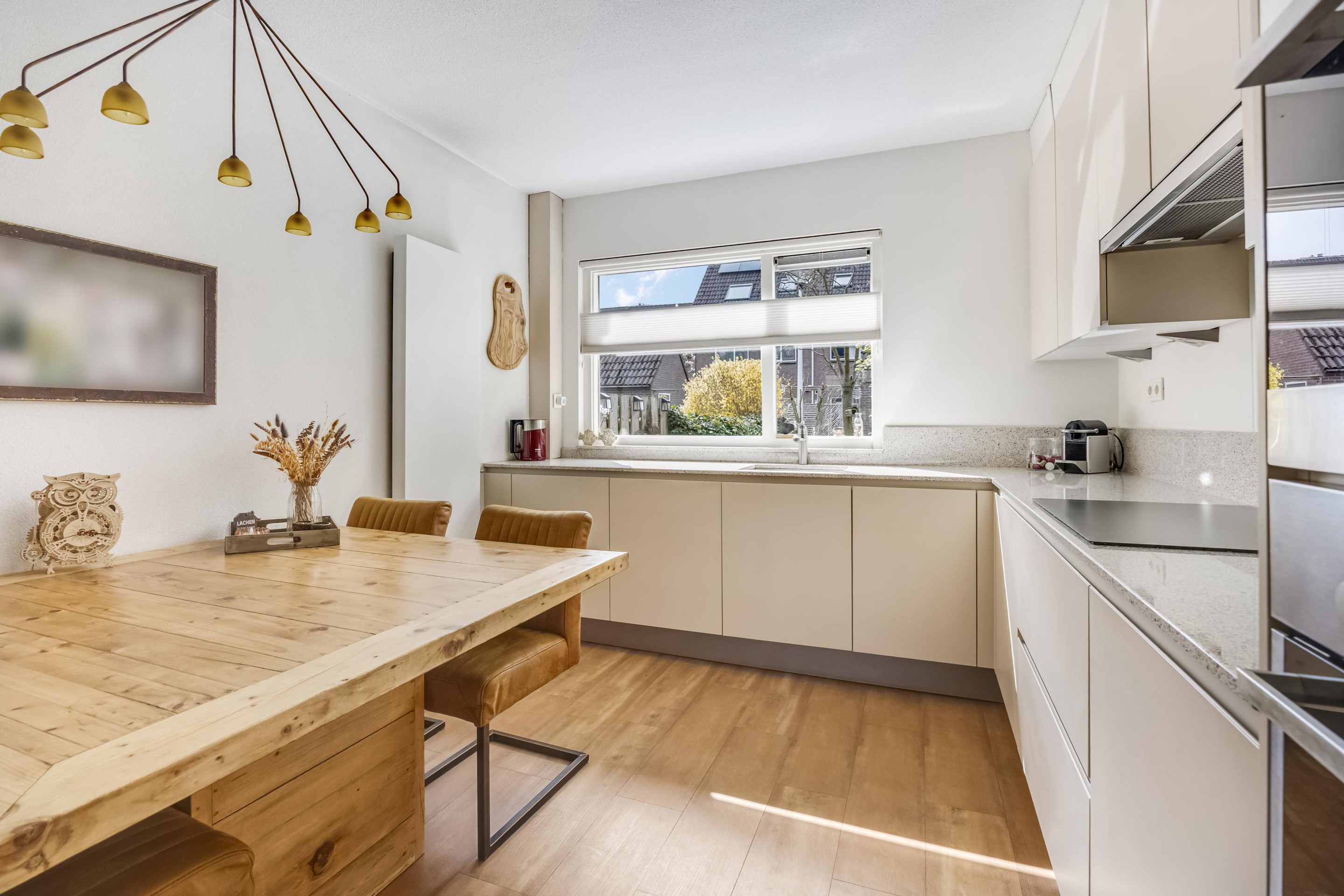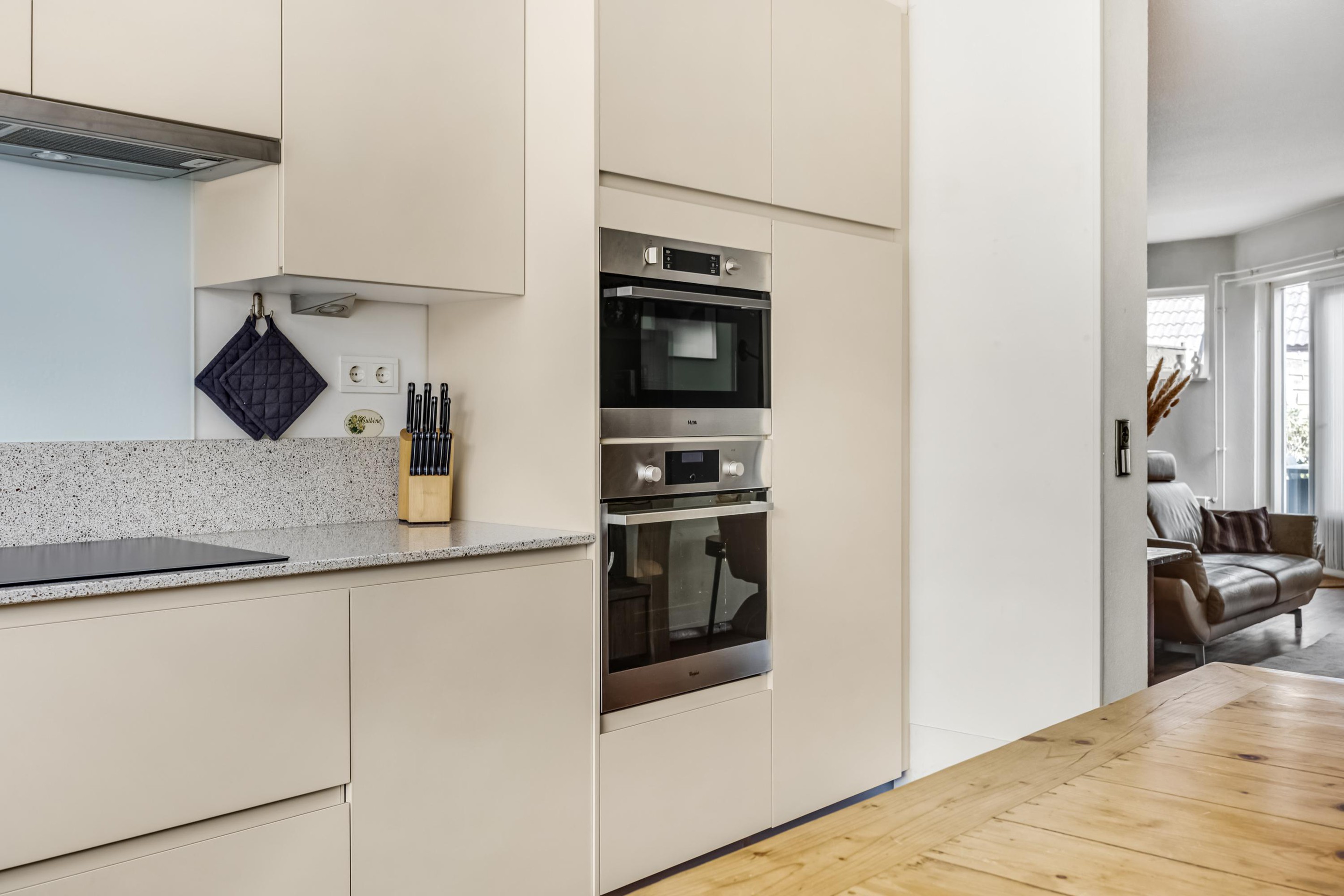 Begane grond Via de overdekte entree kom je binnen in de verzorgde hal met meterkast, garderobe-nis en modern toilet met fonteintje. De lichte woonkamer is tuingericht en biedt een fijne leefruimte met direct contact met de achtertuin. Aan de voorzijde bevindt zich de moderne, neutrale open keuken, compleet uitgerust met diverse inbouwapparatuur zoals een inductiekookplaat, oven, combi-magnetron, vaatwasser en koel-/vriescombinatie. De gehele begane grond is afgewerkt met een stijlvolle PVC-vloer, wat zorgt voor een rustige en eigentijdse uitstraling.