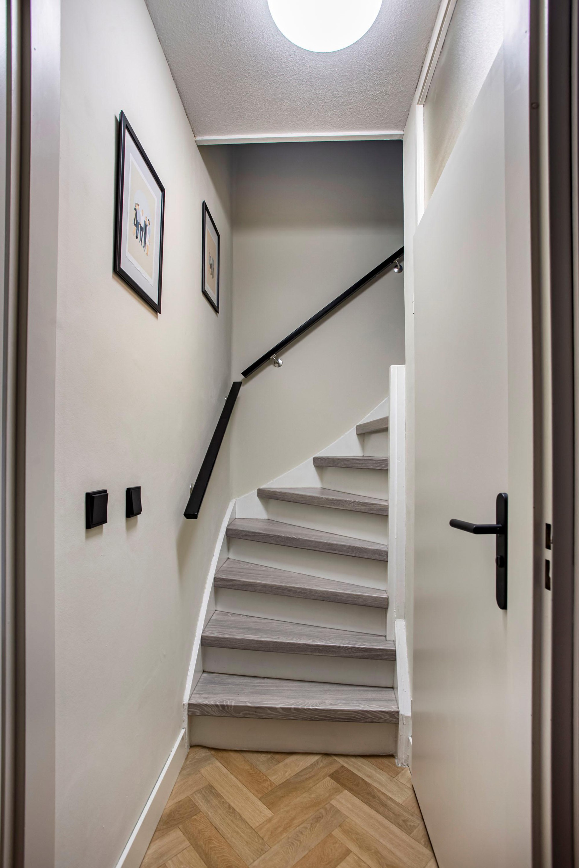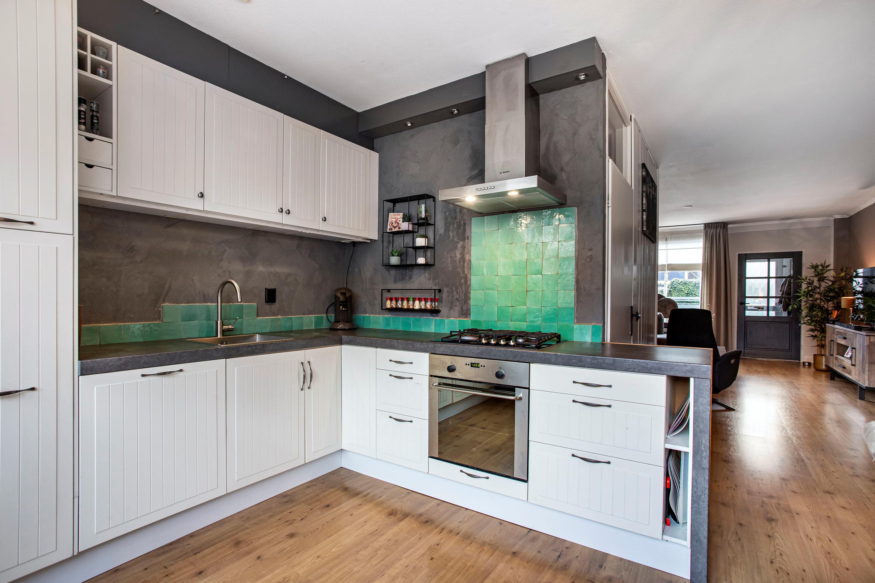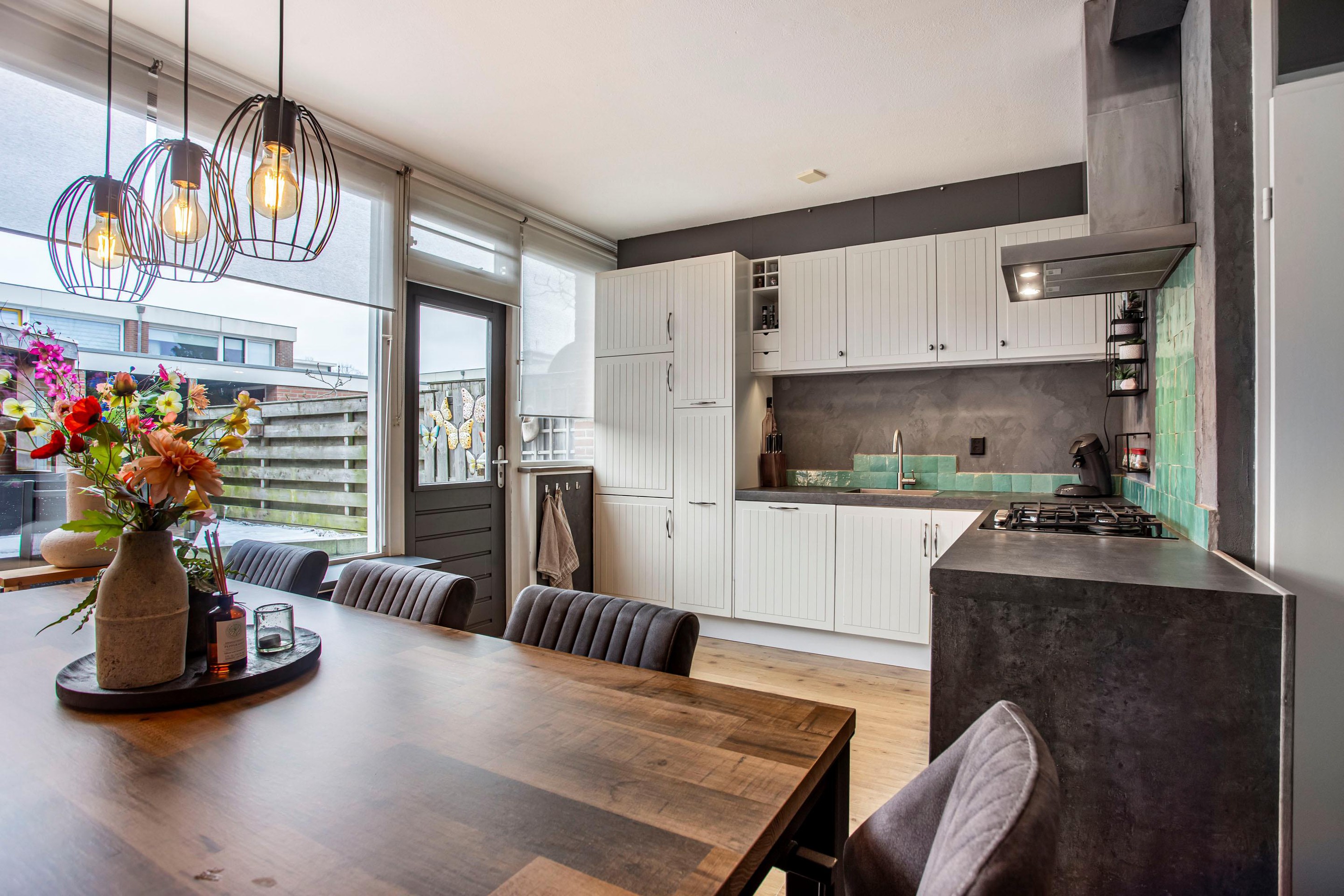 In de entree bevinden zich de meterkast en toegang tot de gezellige woonkamer. Deze ruimte heeft een knusse uitstraling, ideaal voor wie houdt van een behaaglijke, besloten sfeer in huis. Via de woonkamer bereik je de praktische trapkast en de ruim opgezette keuken in lichte kleurstelling. De keuken is voorzien van volop kastruimte en diverse inbouwapparatuur, waaronder een nieuwe koelkast (2025), vriezer, vaatwasser (2019), gaskookplaat, oven en afzuigkap.