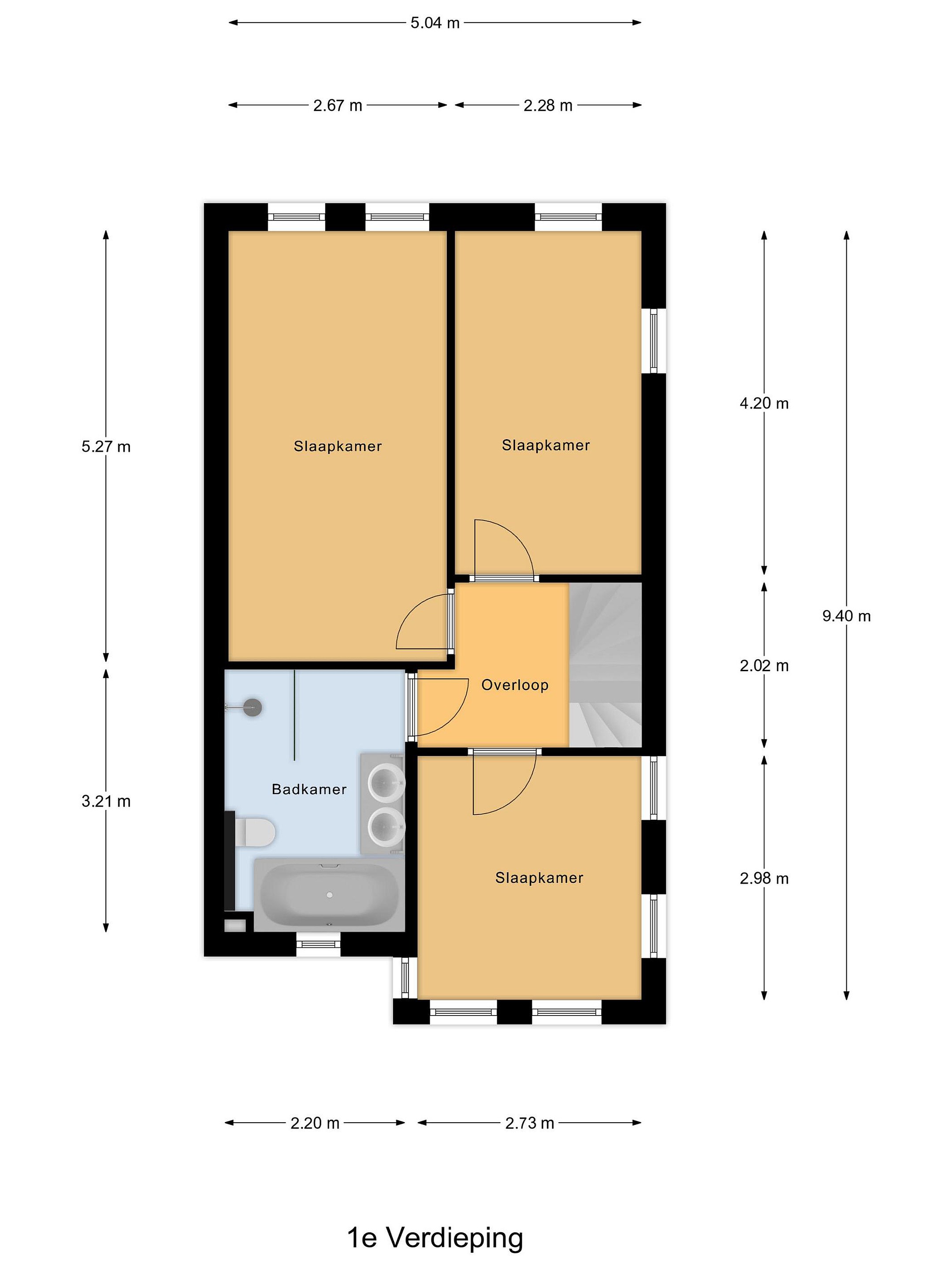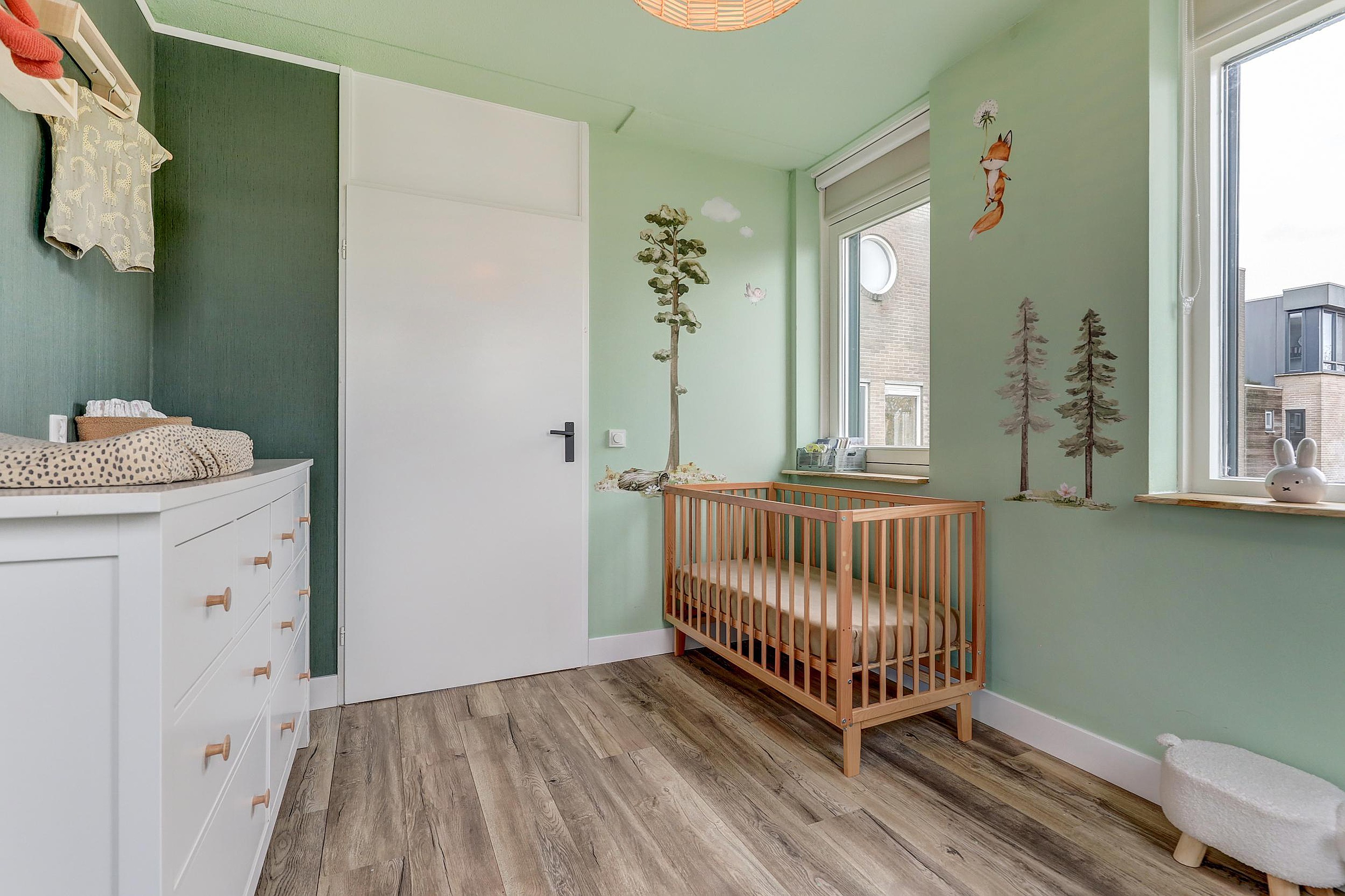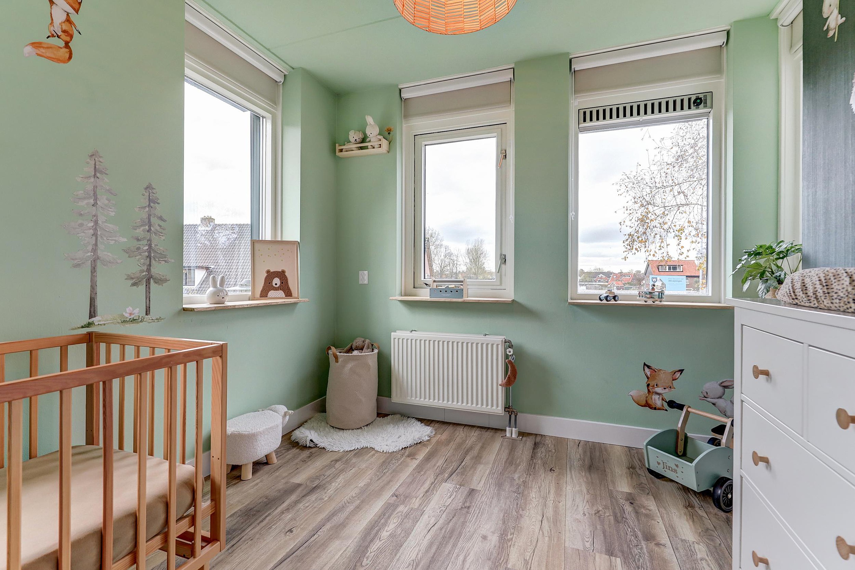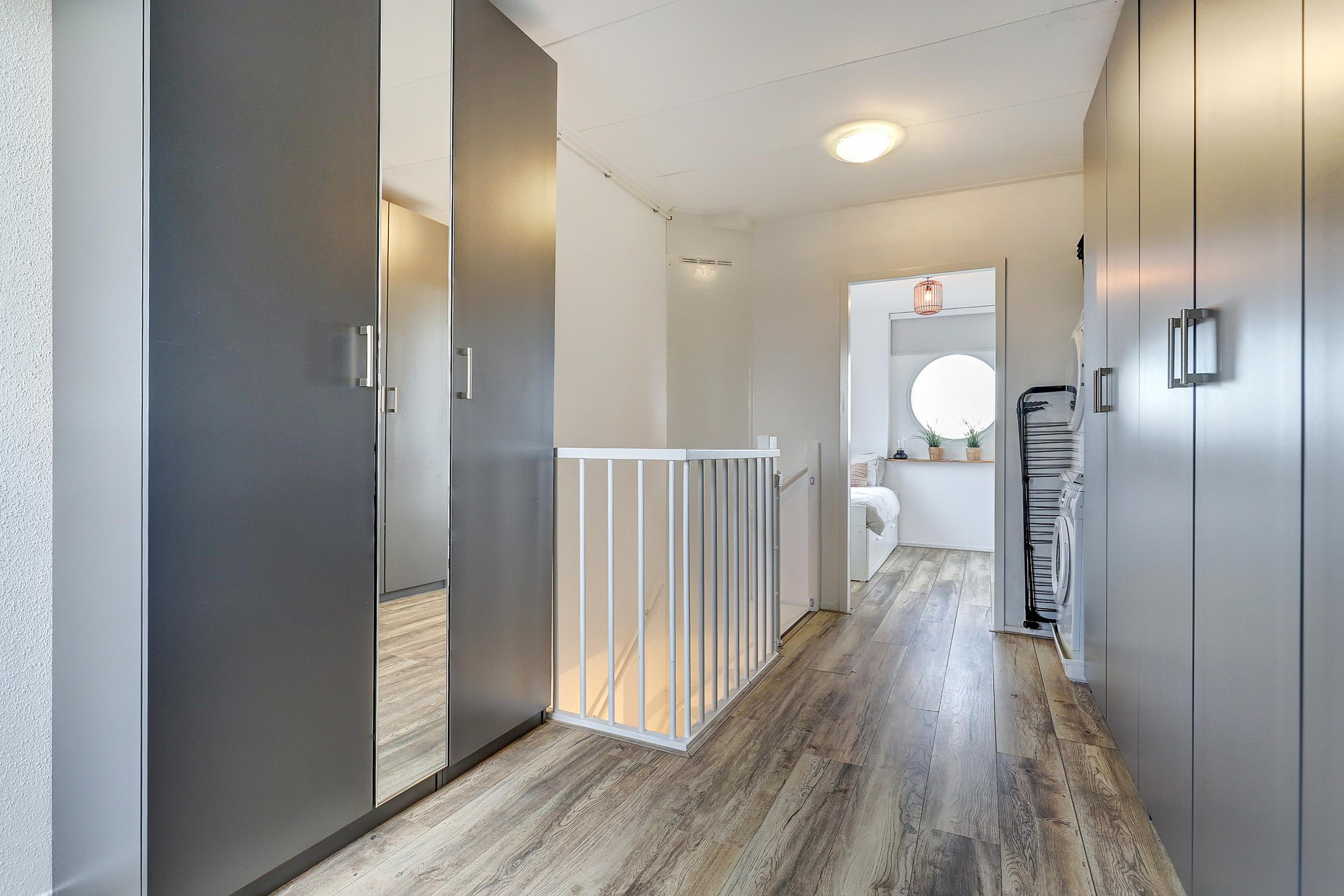 De overloop geeft toegang tot drie slaapkamers en de badkamer. De gehele verdieping (m.u.v. de badkamer) is afgewerkt met een fraaie laminaatvloer. De slaapkamers aan de voor- en achterzijde, gelegen aan de rechterkant van de woning, beschikken over extra lichtinval dankzij de zijgevelramen.