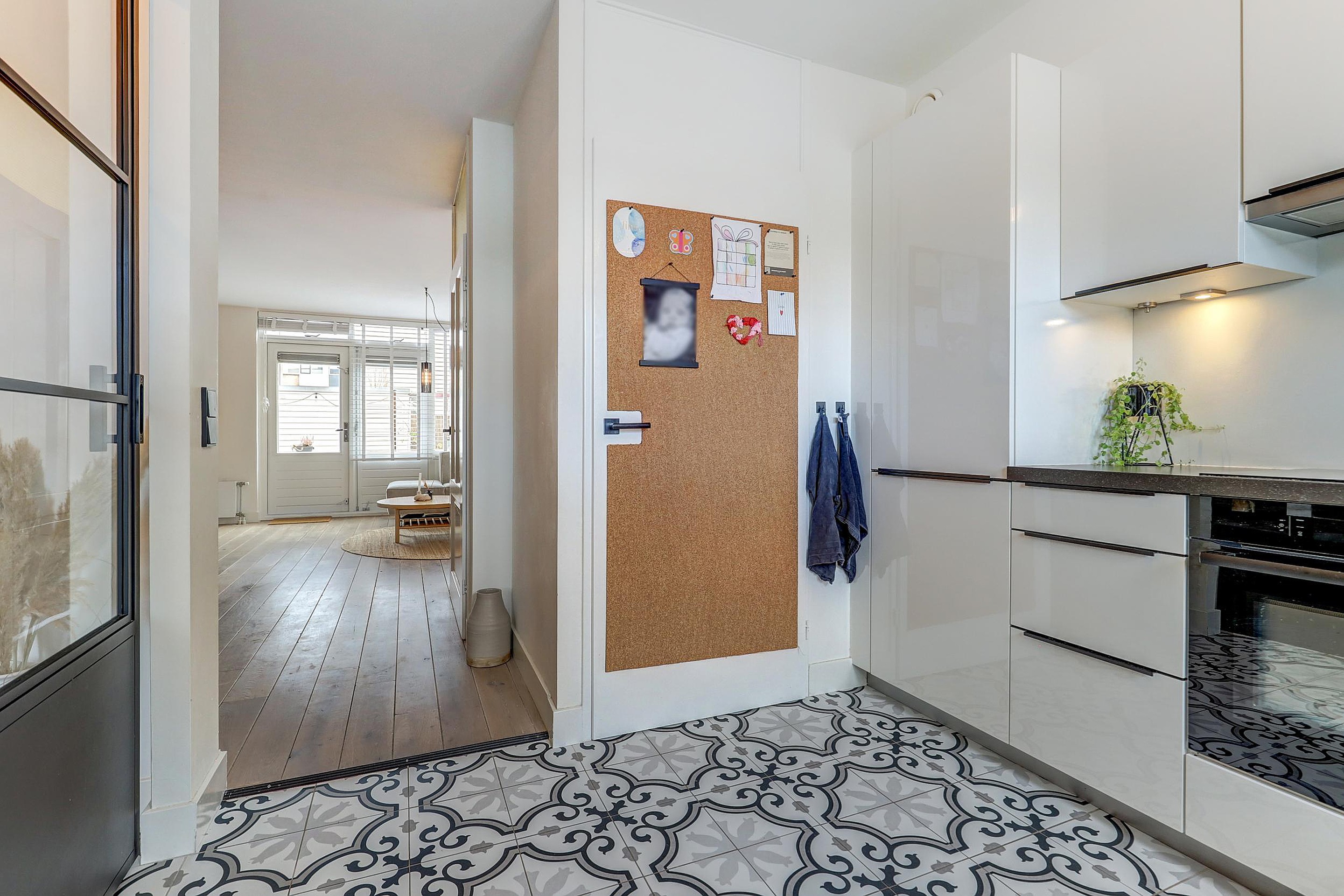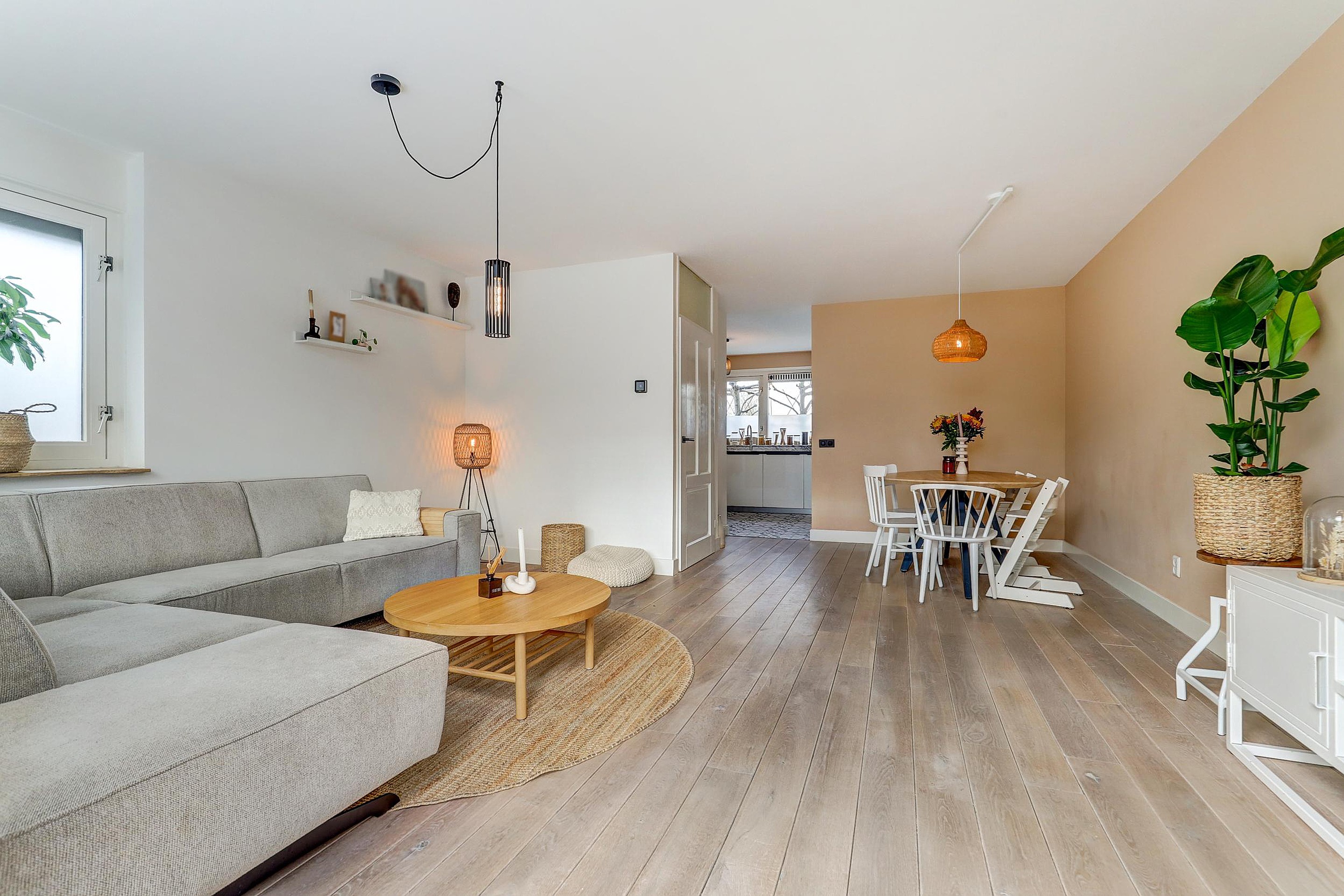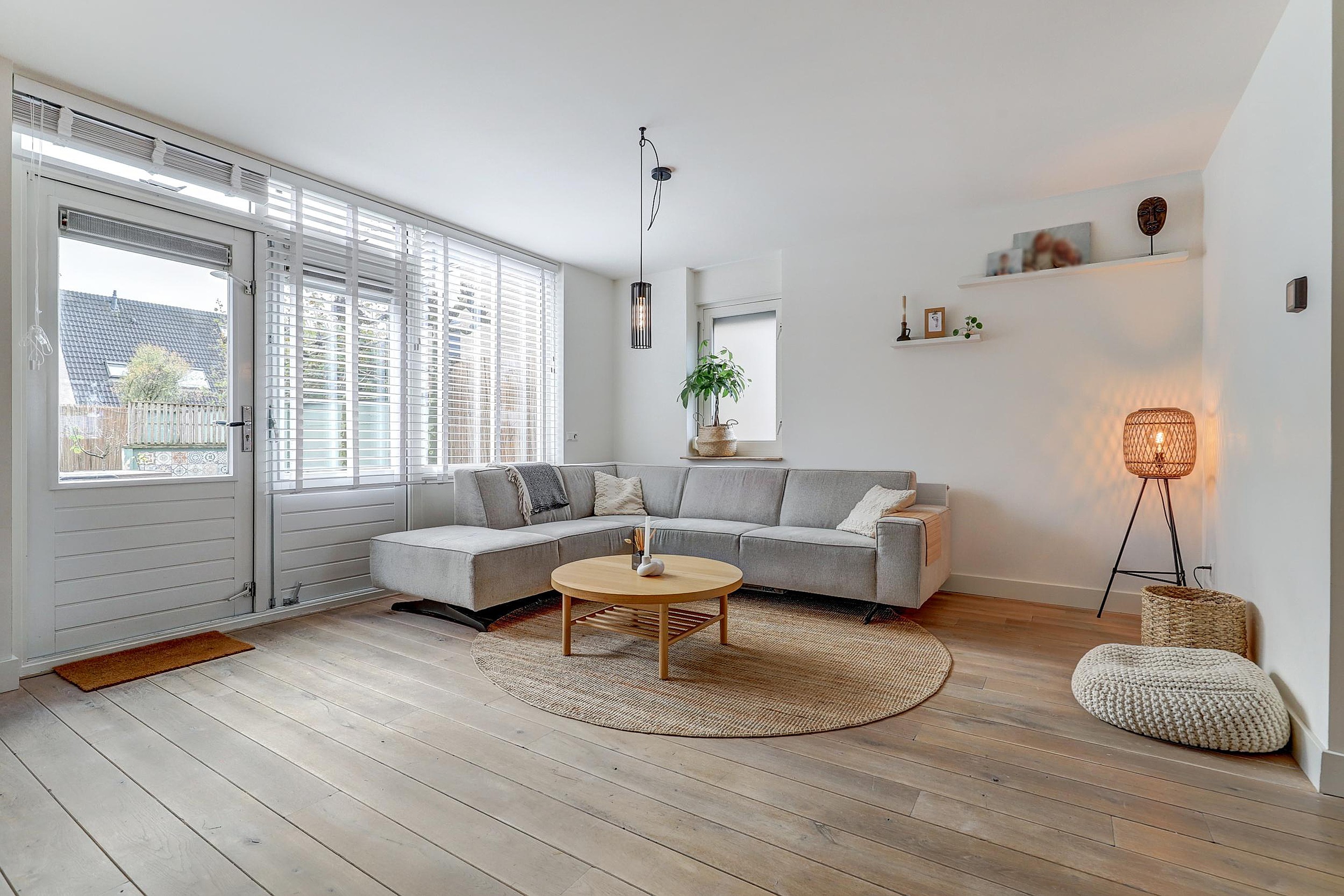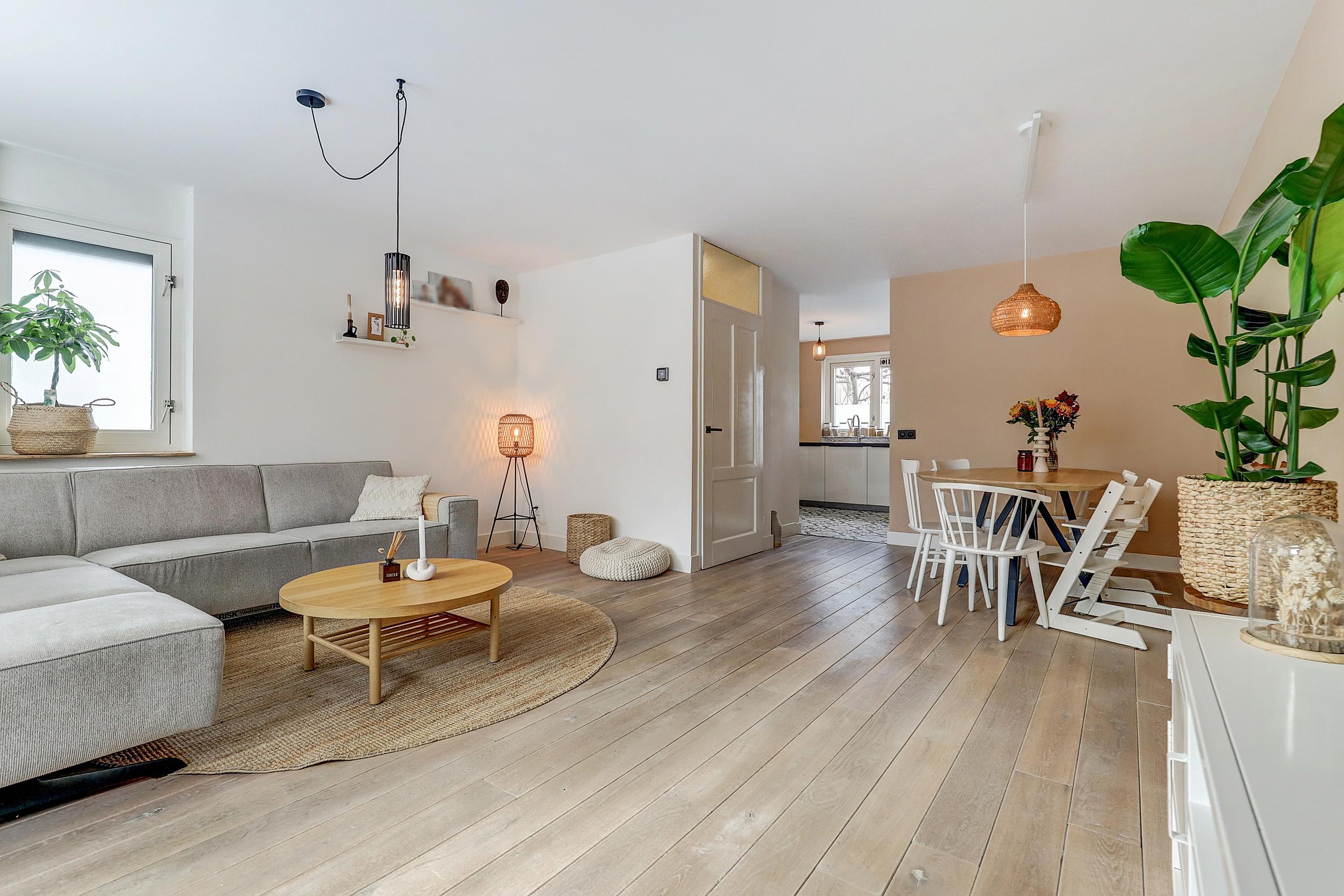 Entree, hal, meterkast, toilet met fonteintje en toegang tot zowel de keuken als de woonkamer. Doordat de woning op een hoek ligt, geniet de woonkamer van extra daglicht via het zijgevelraam. De dubbele openslaande deuren naar de achtertuin geven een mooie verbinding met buiten, terwijl de fraaie houten vloer zorgt voor een warme uitstraling.