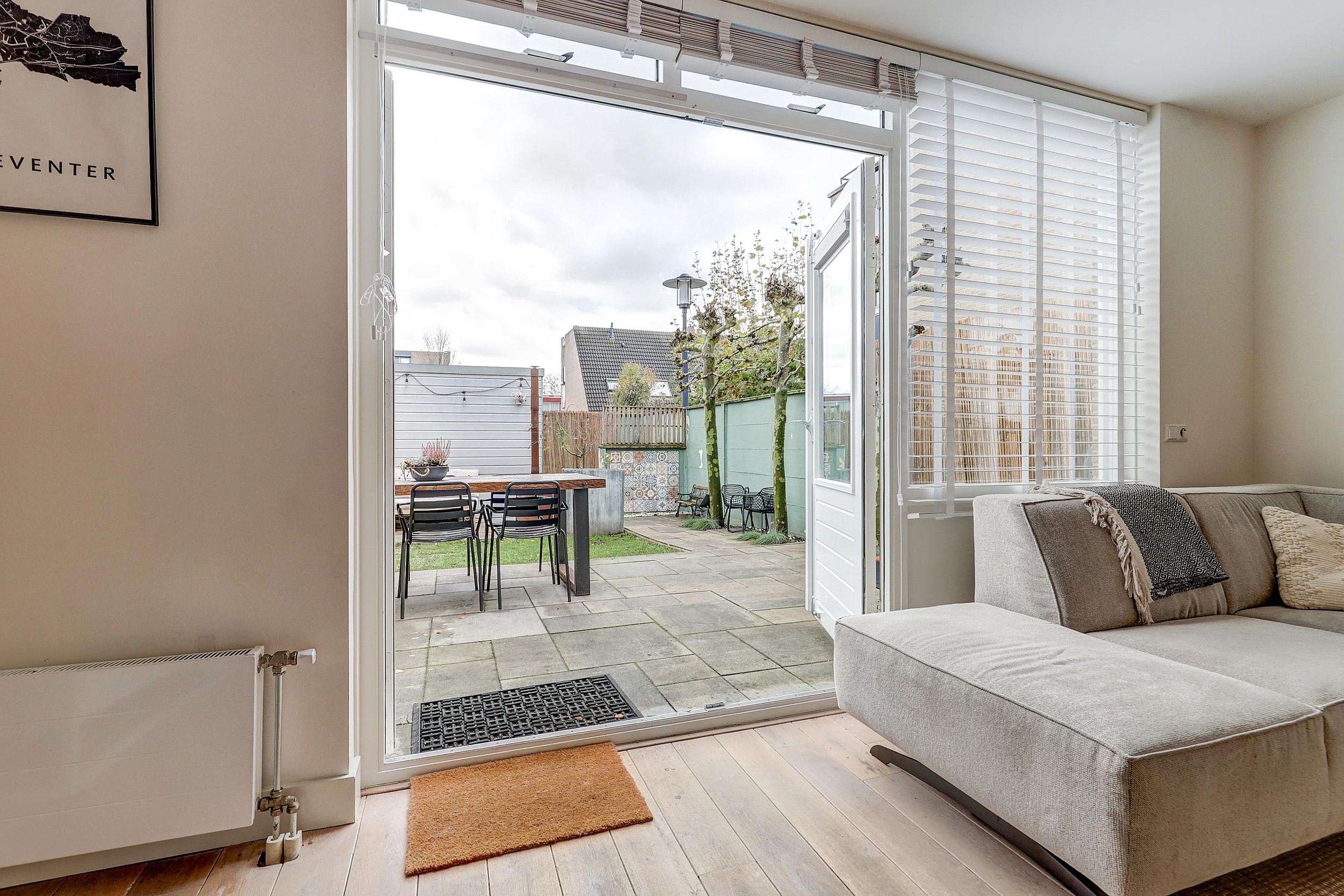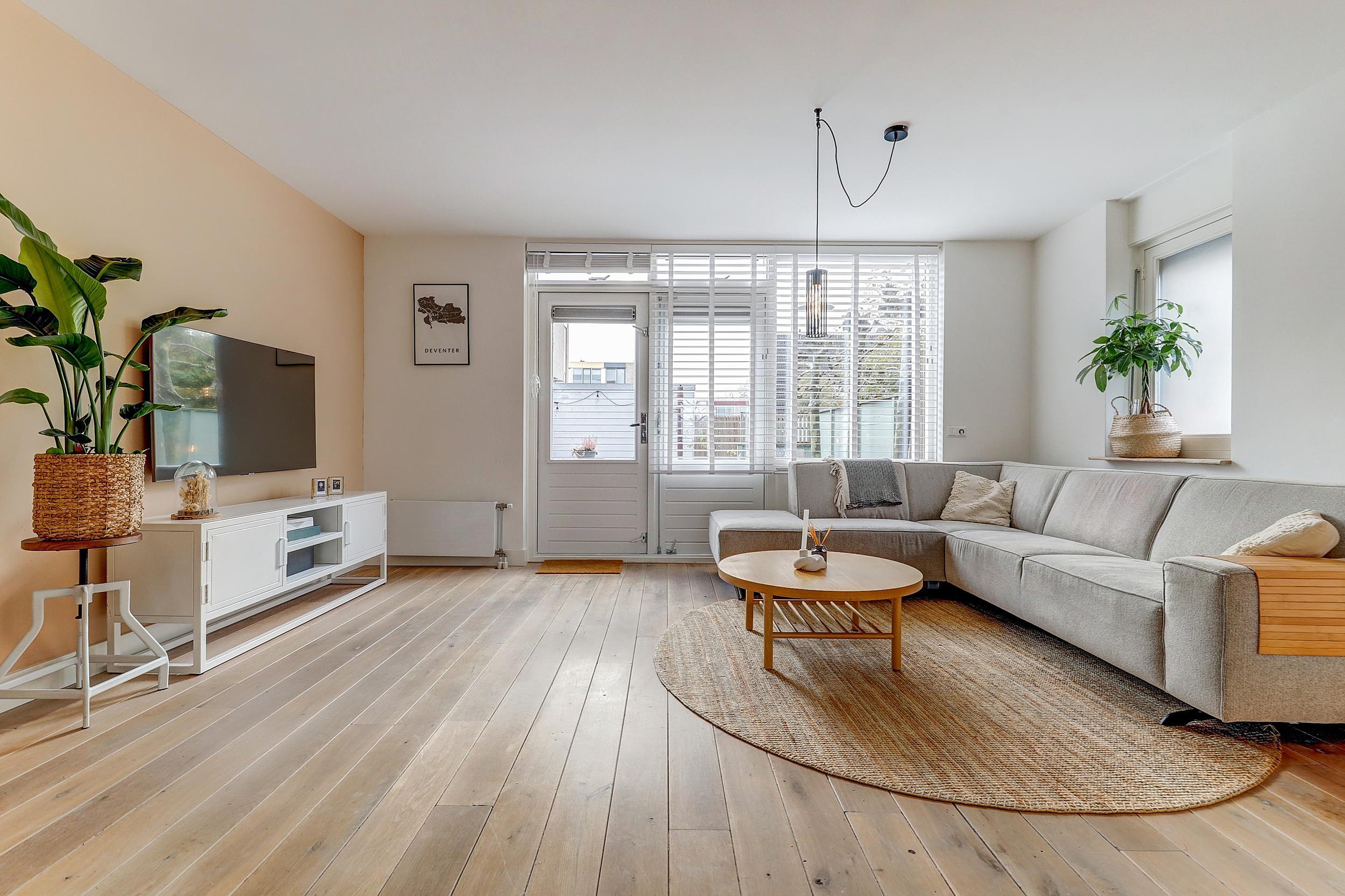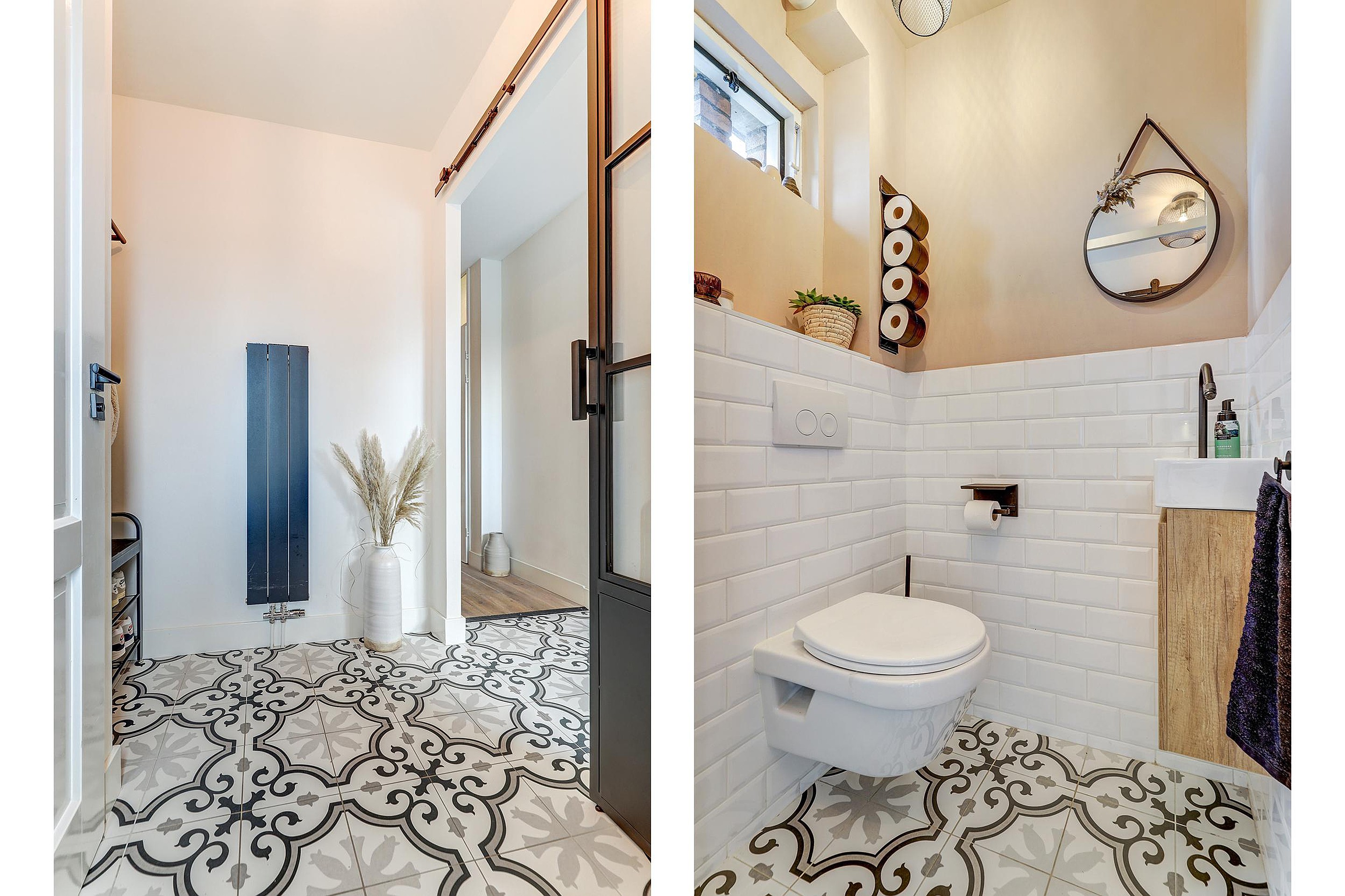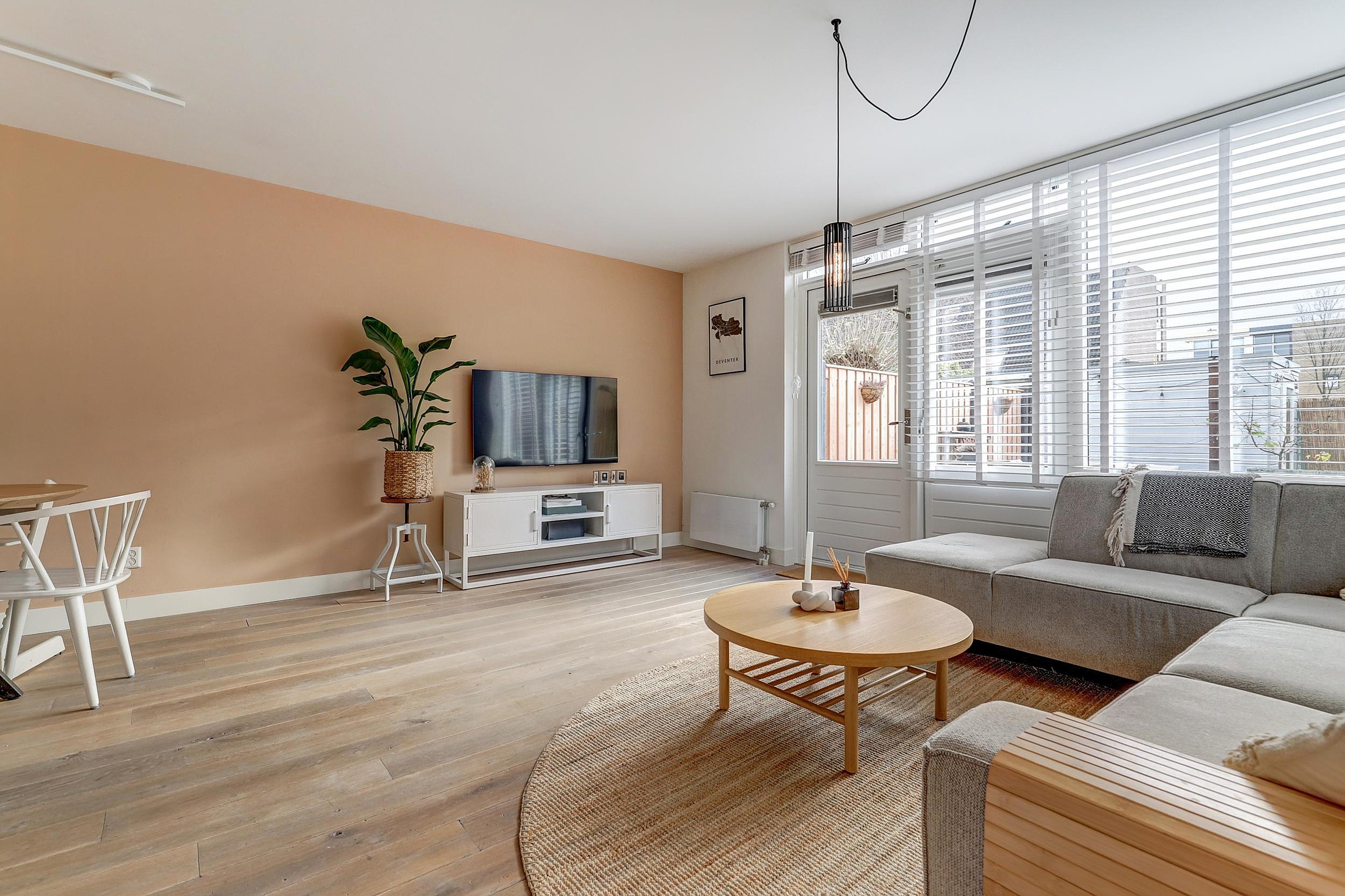 Entree, hal, meterkast, toilet met fonteintje en toegang tot zowel de keuken als de woonkamer. Doordat de woning op een hoek ligt, geniet de woonkamer van extra daglicht via het zijgevelraam. De dubbele openslaande deuren naar de achtertuin geven een mooie verbinding met buiten, terwijl de fraaie houten vloer zorgt voor een warme uitstraling.