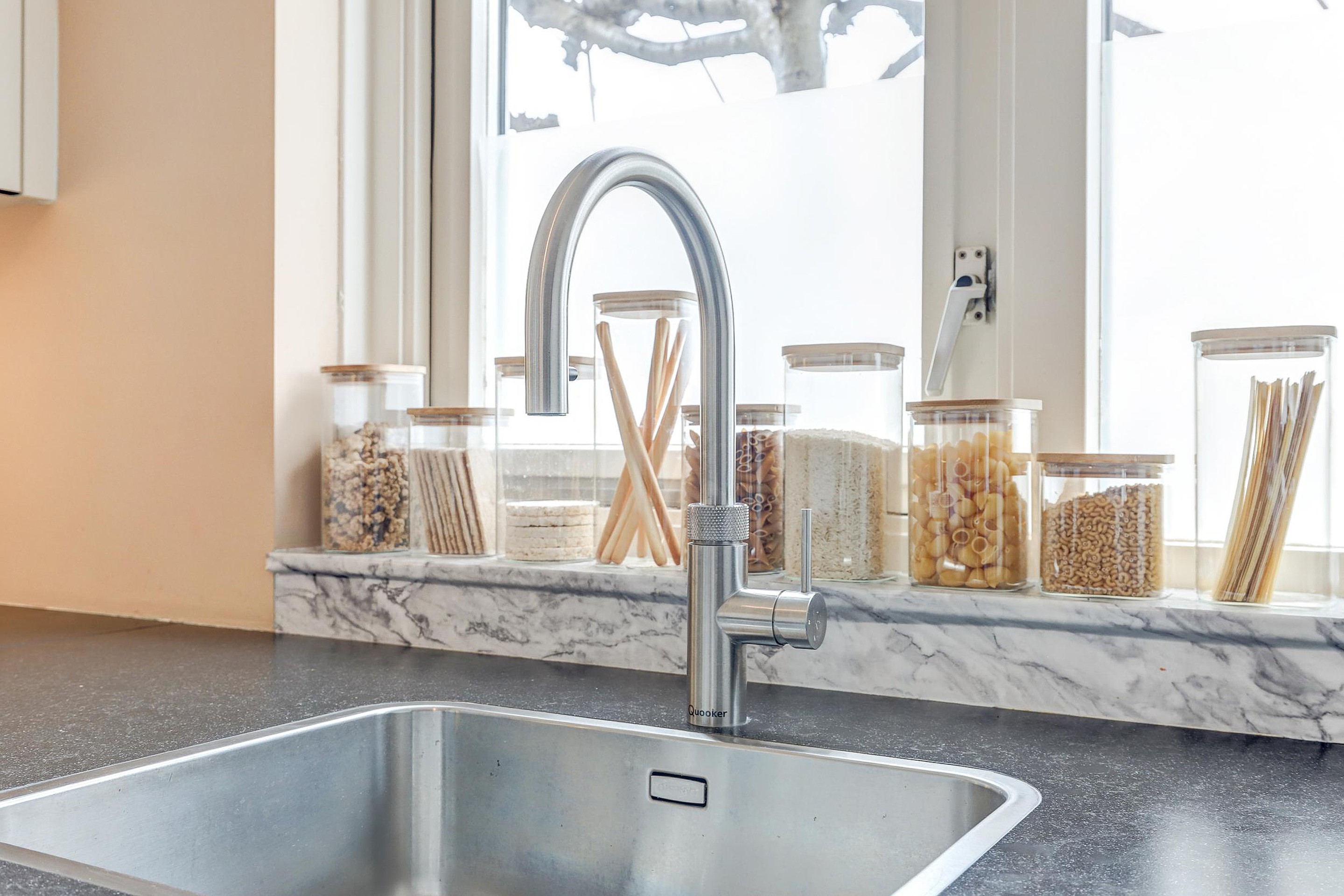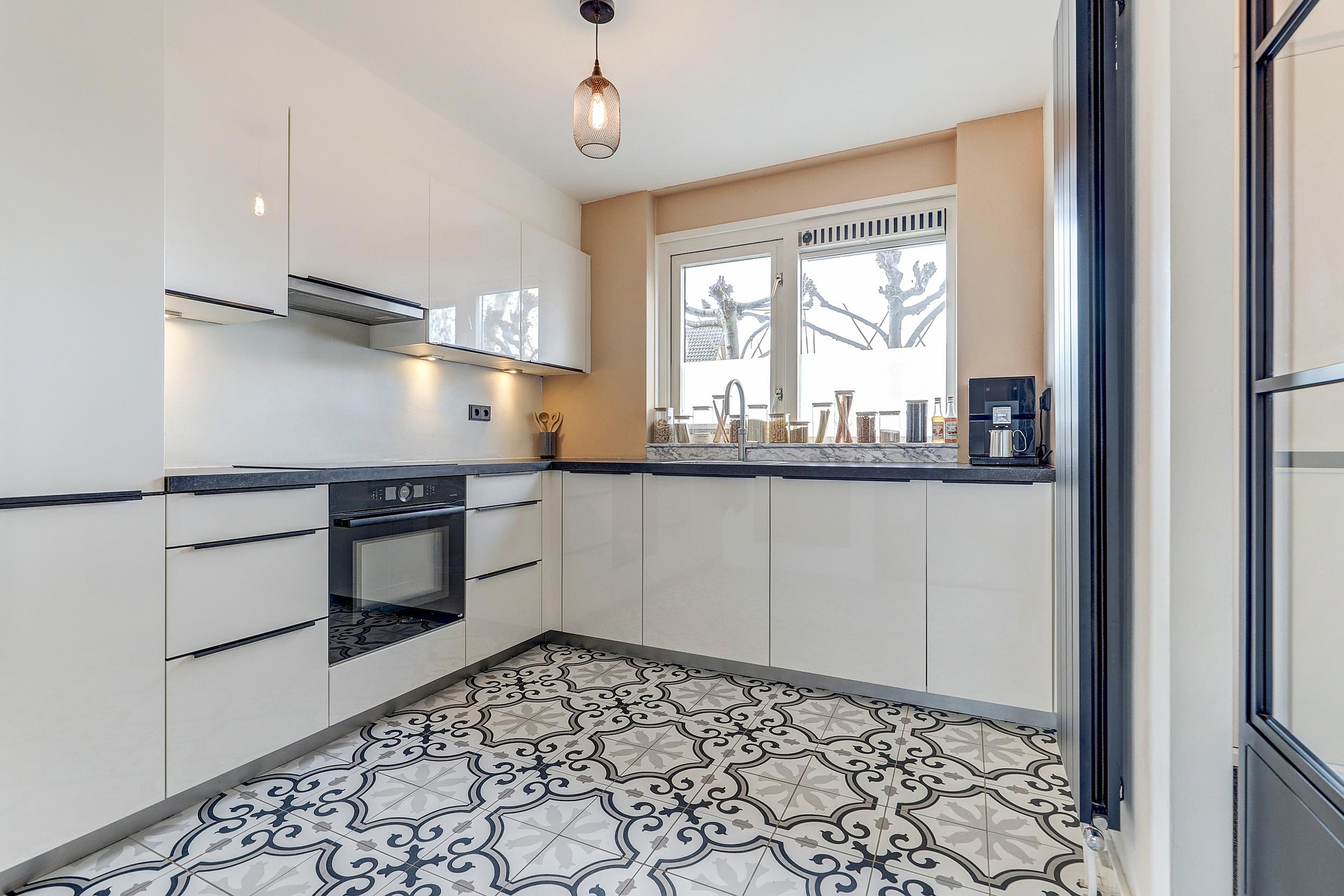 Aan de voorzijde bevindt zich de keuken, uitgevoerd in een praktische L-opstelling. Deze is compleet uitgerust met een inductiekookplaat, combi-magnetron, afzuigkap, koelkast, vaatwasser, spoelbak met Quooker-kraan, veel kastruimte en een speelse tegelvloer. Vanuit de keuken is er toegang tot de trapkast.
