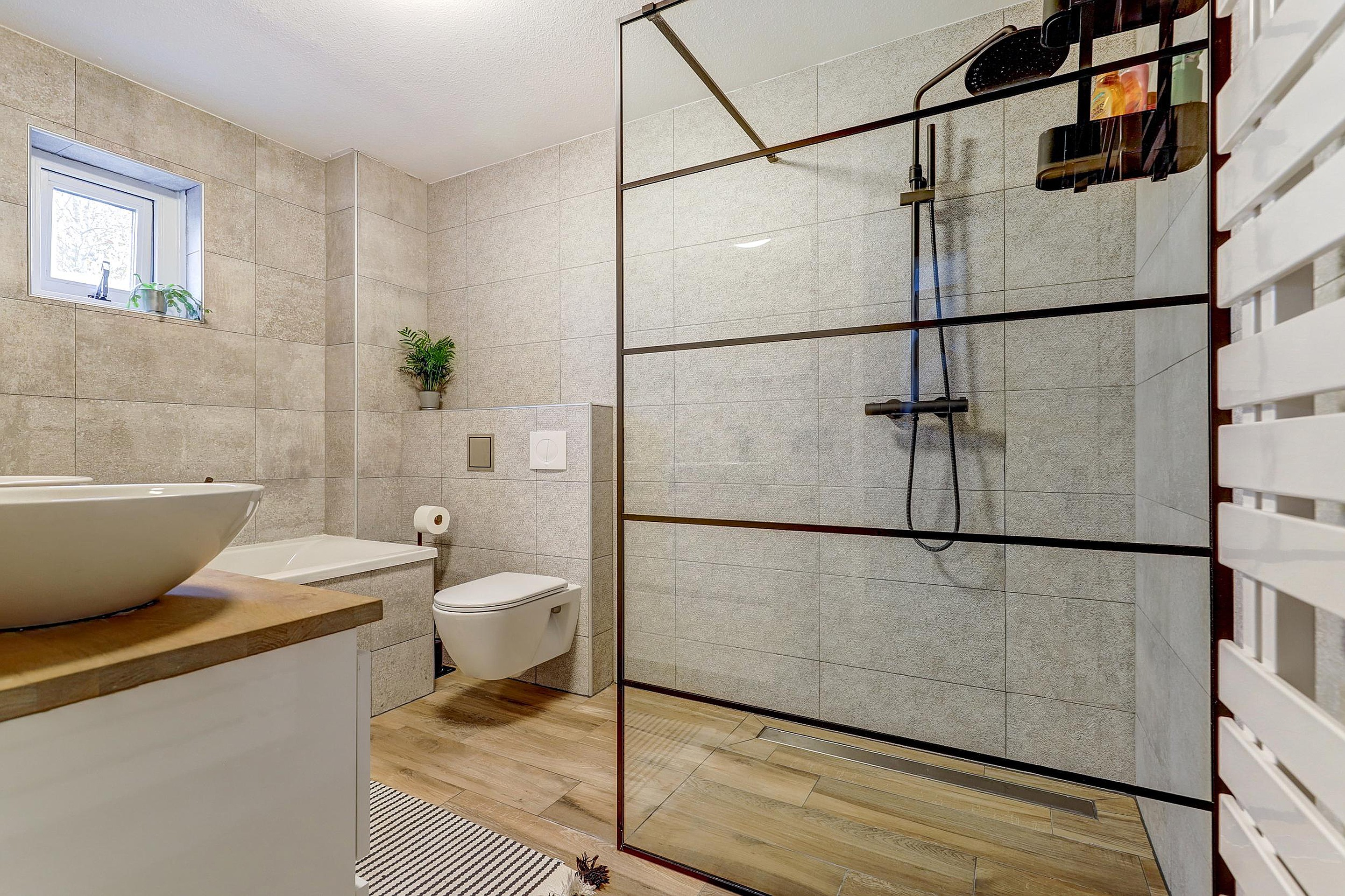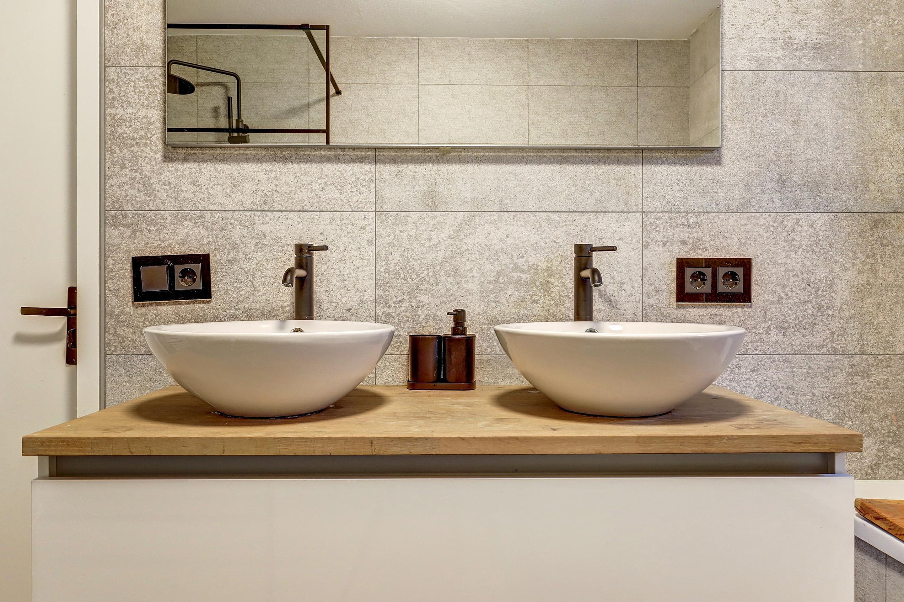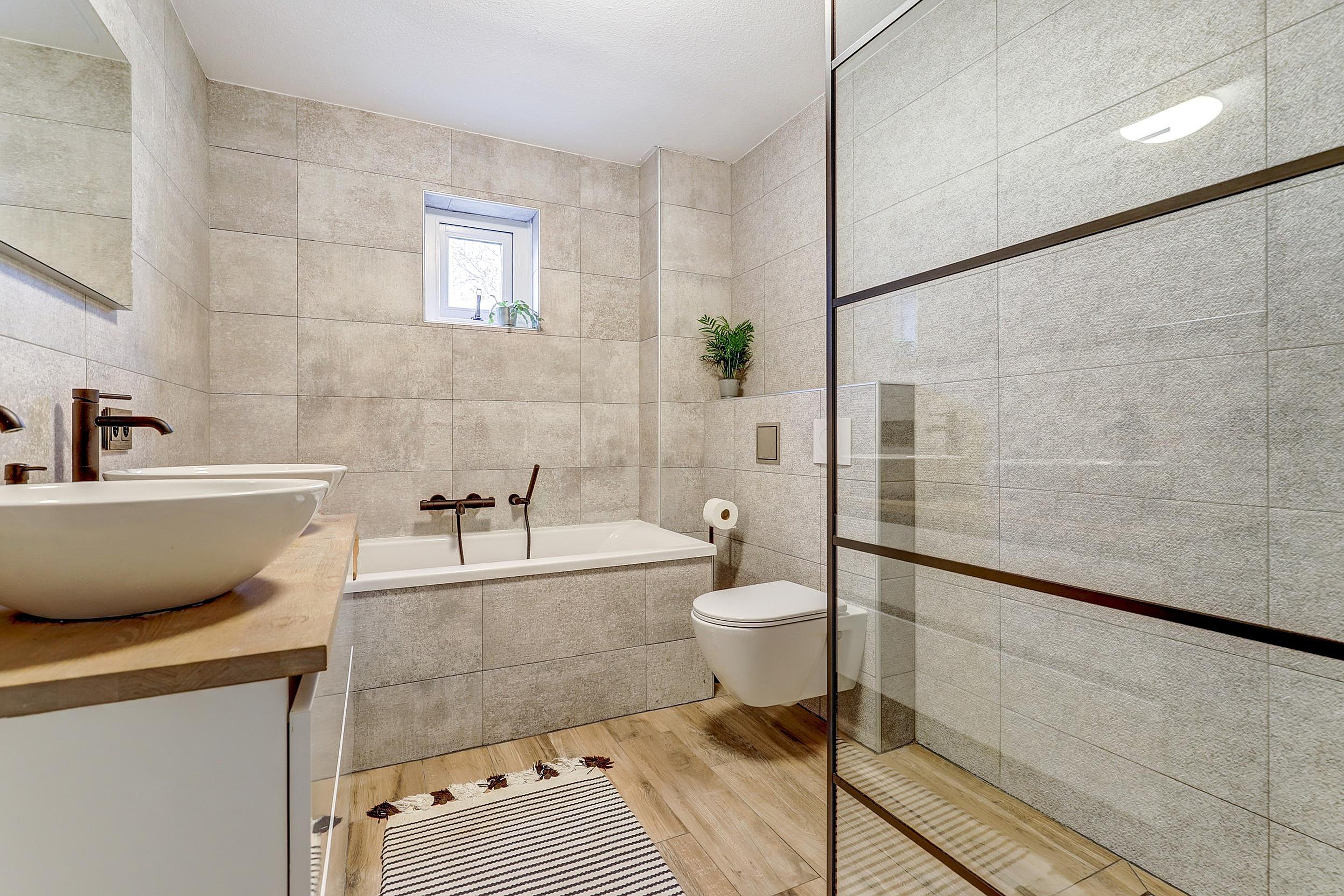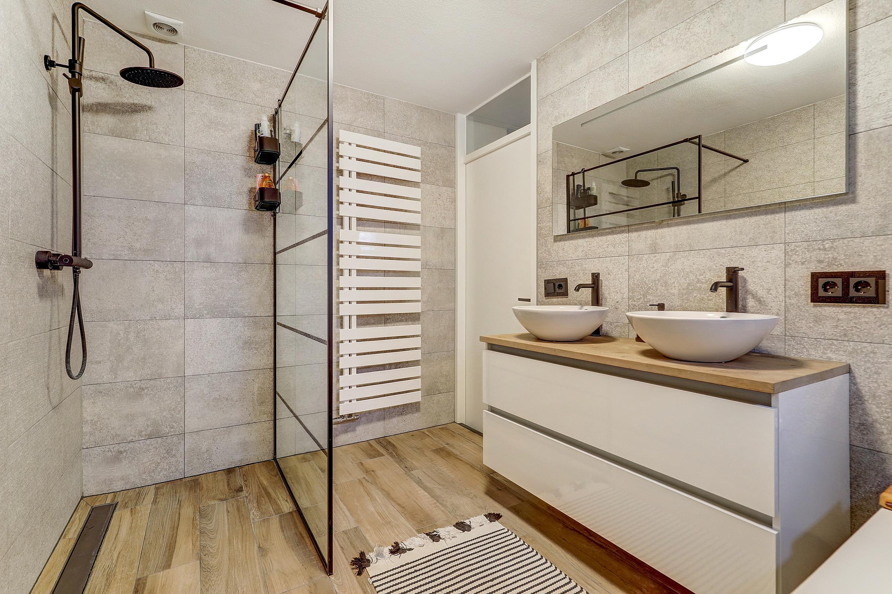 De luxe badkamer is compleet uitgerust: een tweede (zwevend) toilet, ruime inloopdouche, ligbad, dubbele wastafel met meubel, designradiator en mechanische ventilatie. Het geheel is tot aan het plafond betegeld voor een nette, tijdloze uitstraling.