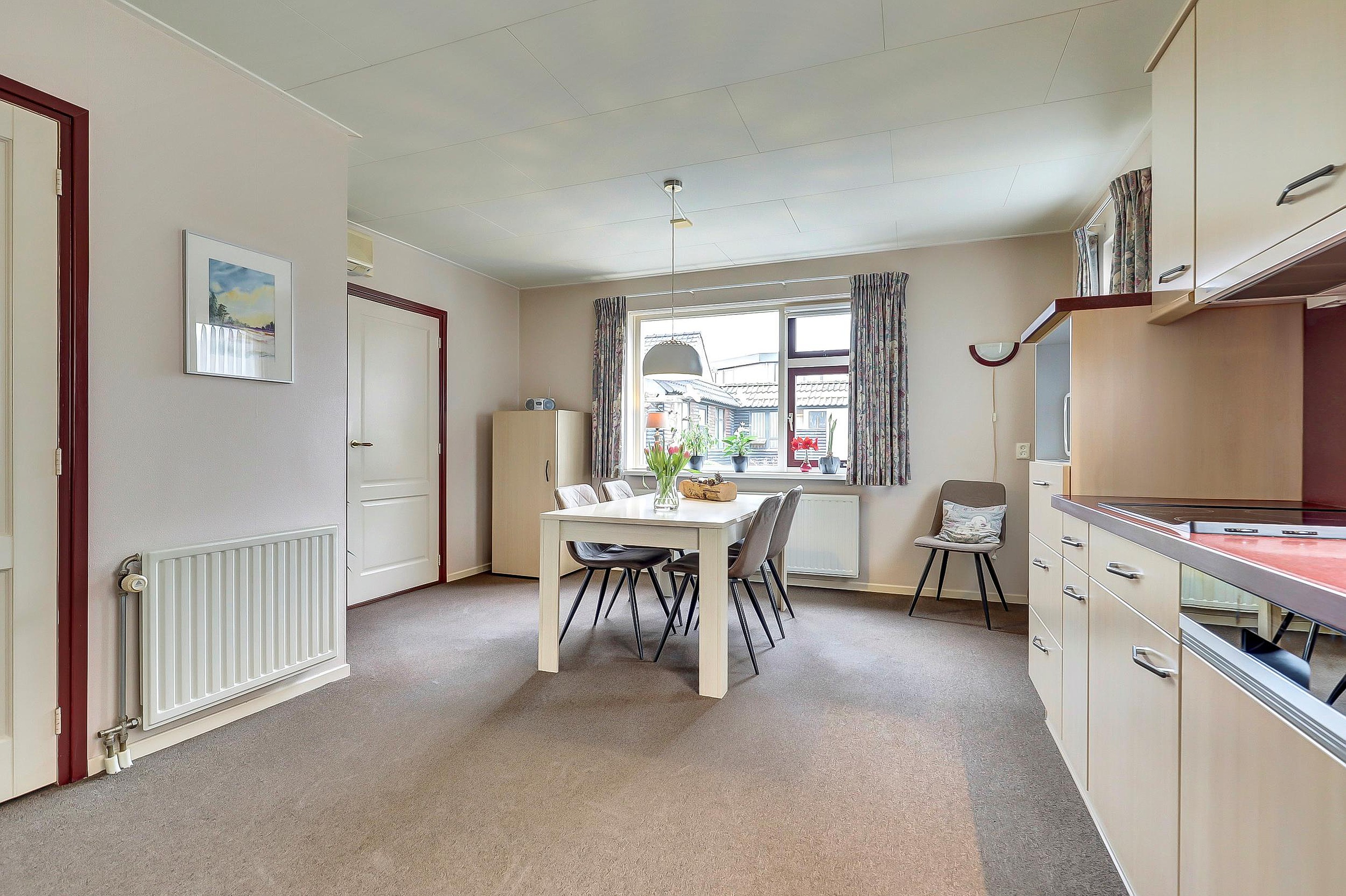 Vanuit de woonkamer bereikt u de royale woon-/leefkeuken van maar liefst 22 m2. Het keukenblok is opgesteld in een L-vorm en voorzien van diverse inbouwapparatuur. Er is volop ruimte voor een grote eettafel en u kijkt hier prettig uit over de achtertuin.
