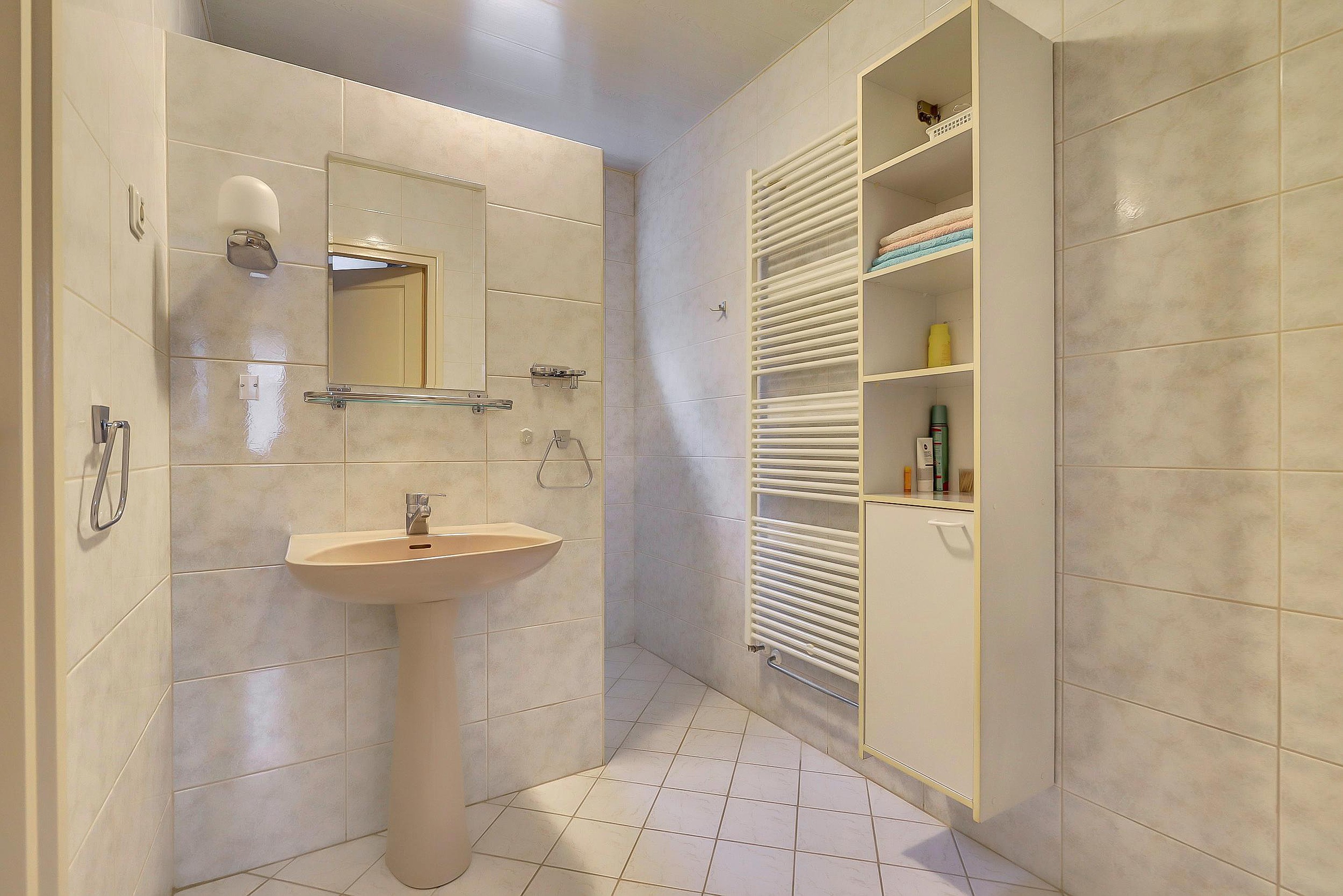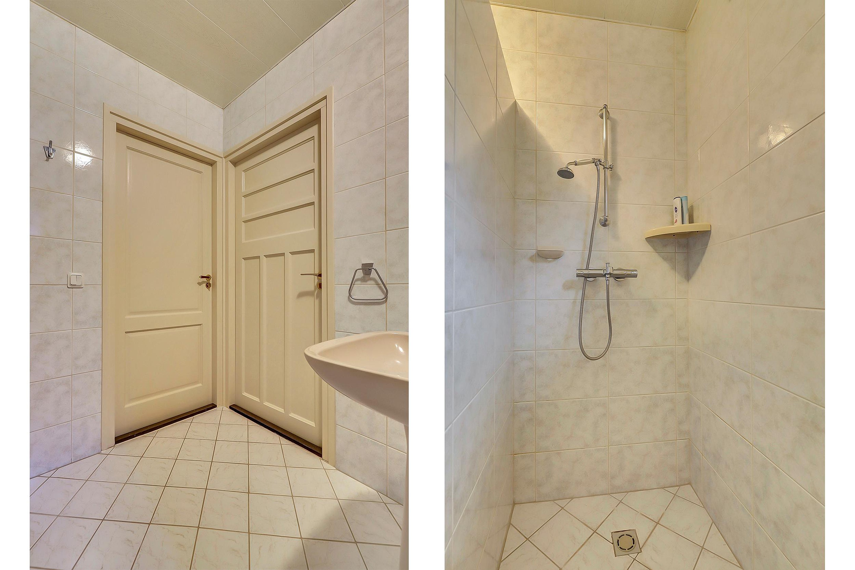Aangrenzend aan de woonkeuken bevinden zich de bijkeuken en de badkamer. De badkamer is uitgerust met een wastafel, inloopdouche, badkamermeubel en een designradiator. In de bijkeuken vindt u de C.V.-installatie, de aansluiting voor de wasmachine, een vaste kast en een deur naar de achtertuin.