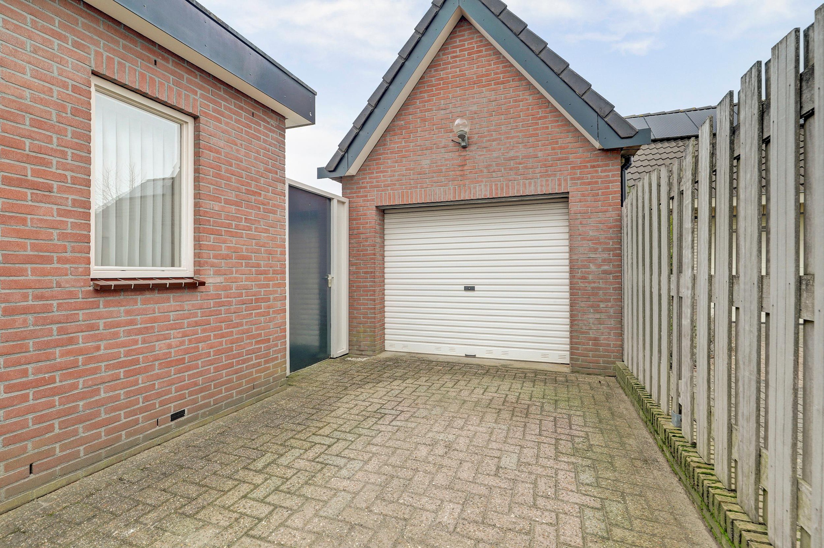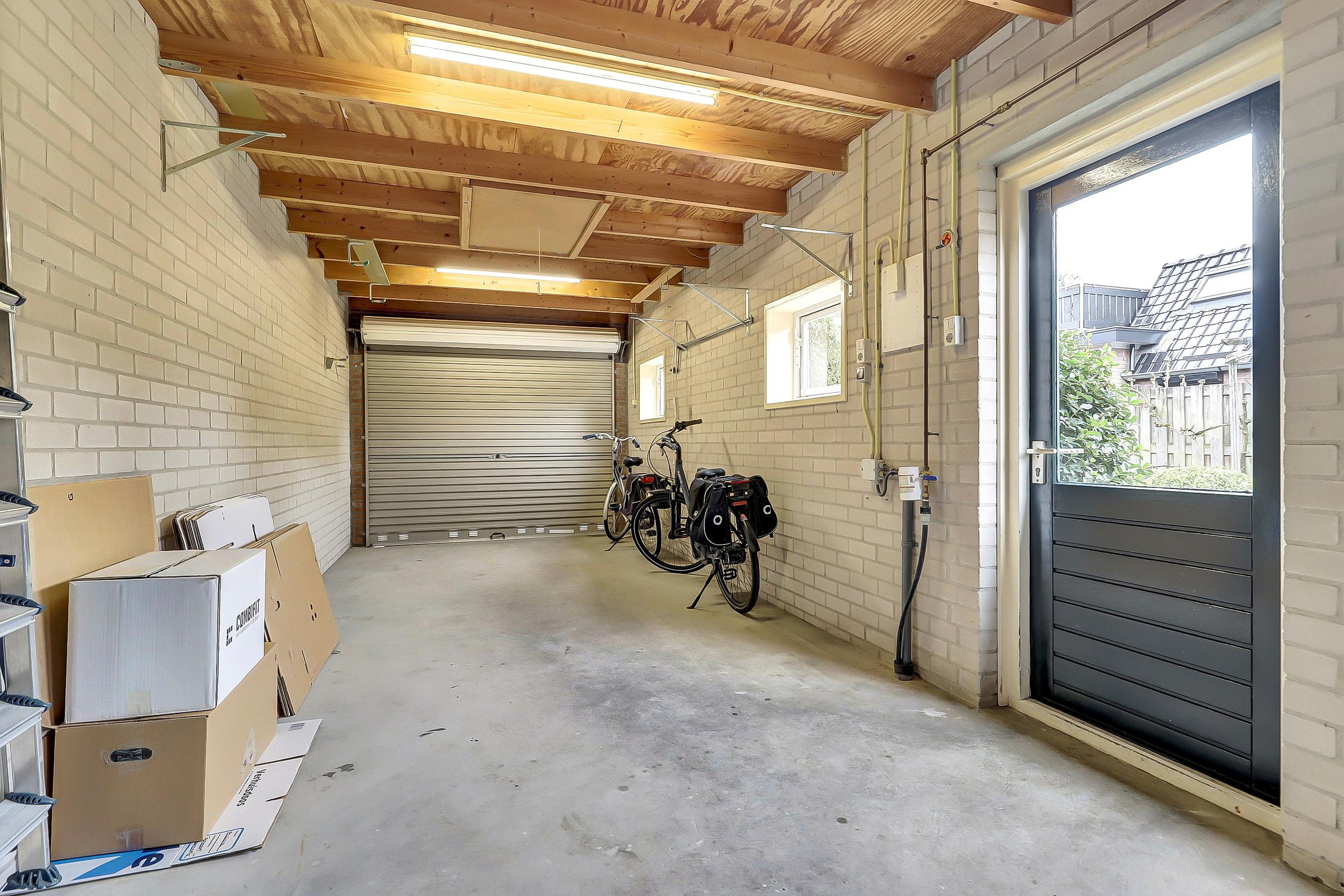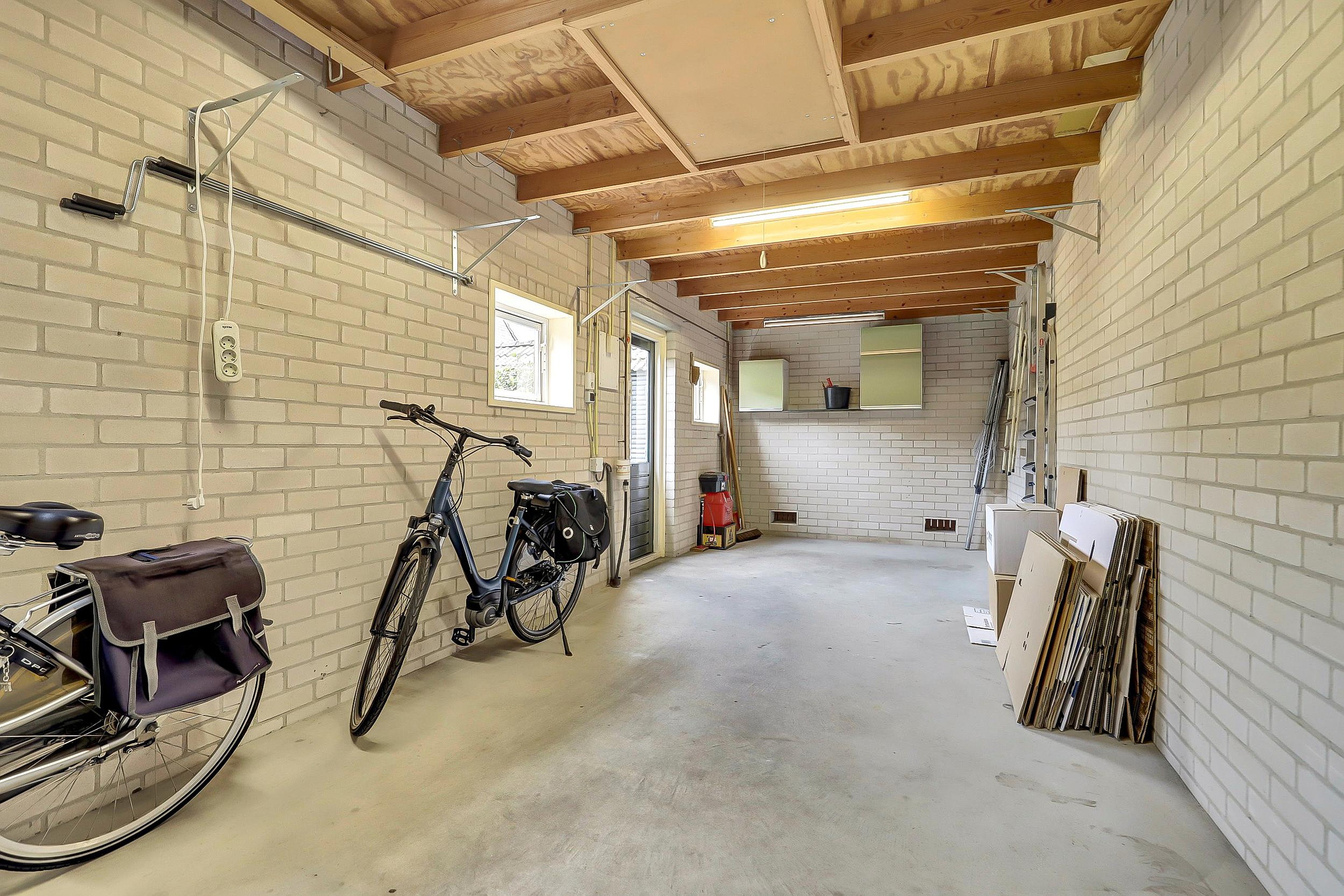 Naast de woning staat een royale stenen garage met overheaddeur en vliering. De garage is circa 7,9 meter diep en 2,91 meter breed, voorzien van elektra en beschikt aan de achterzijde over een deur naar de achtertuin. Daarnaast is er in de tuin nog een ruime berging aanwezig.