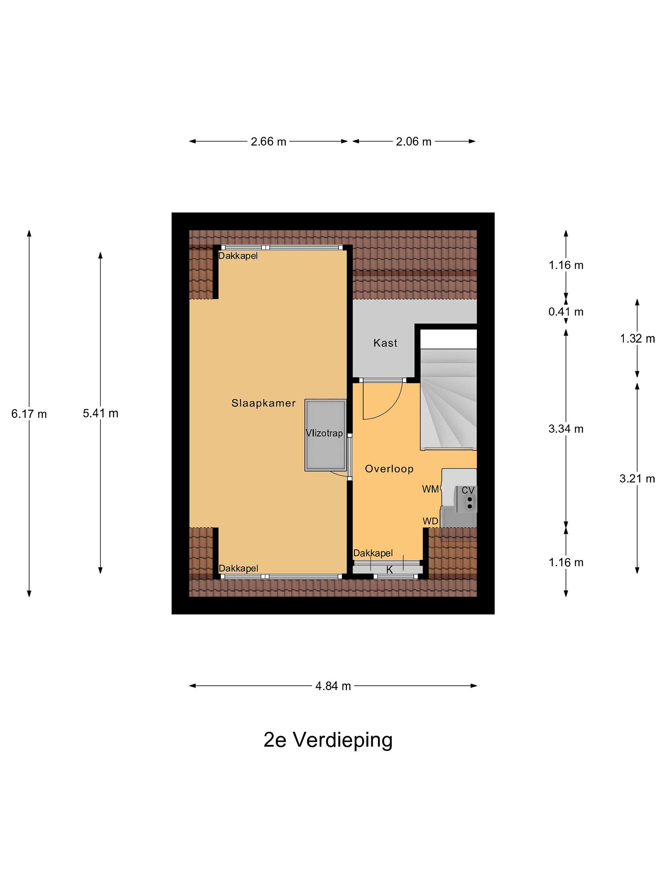 Bereikbaar via een vaste trap. Voorzolder met bergkast, aansluitingen voor wasmachine en droger en de C.V.-installatie.