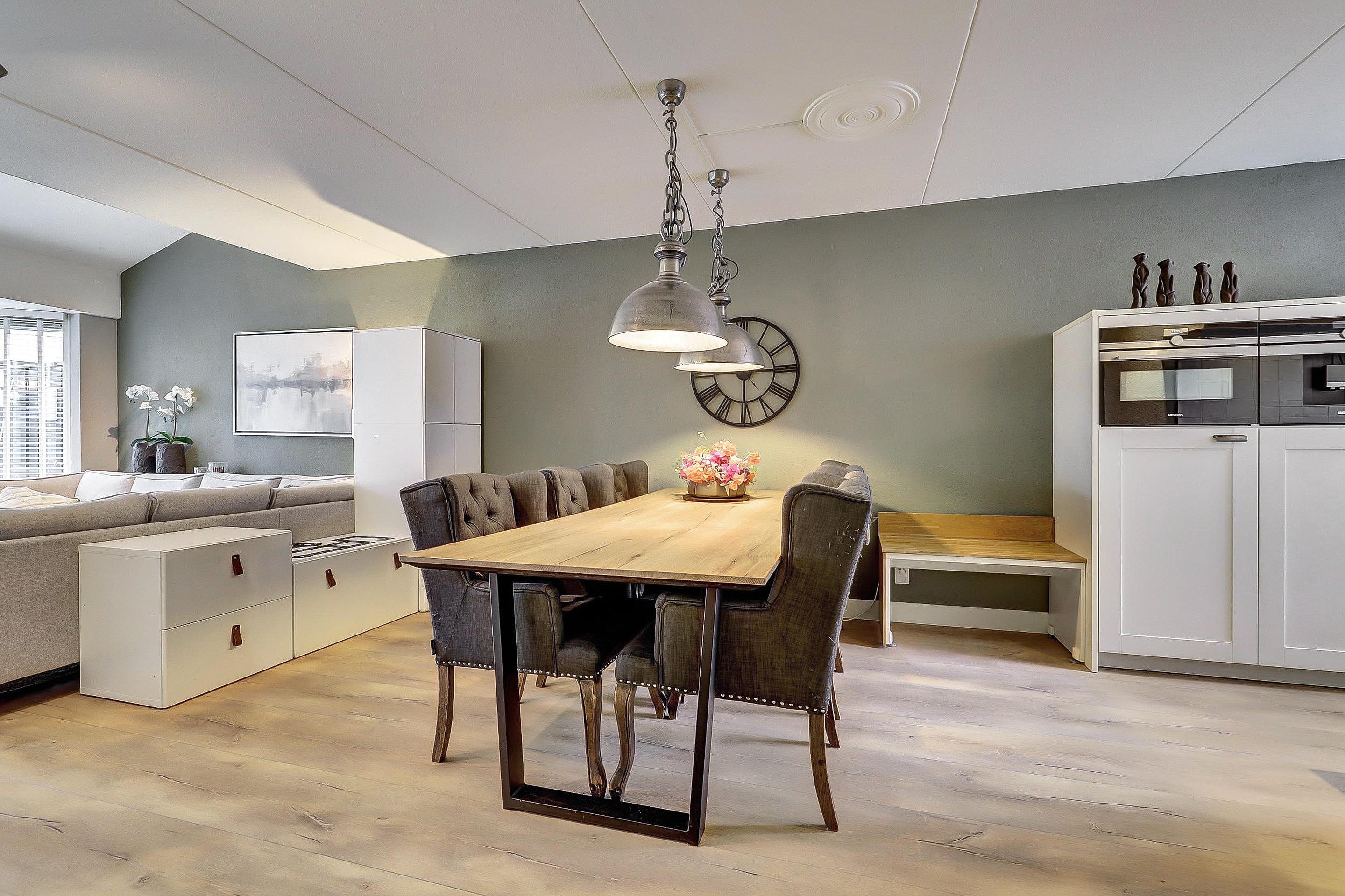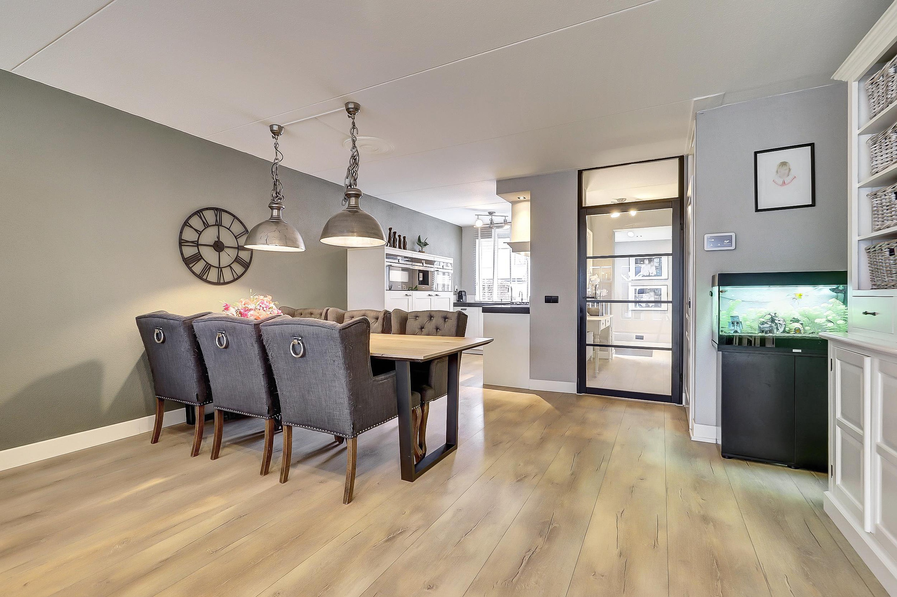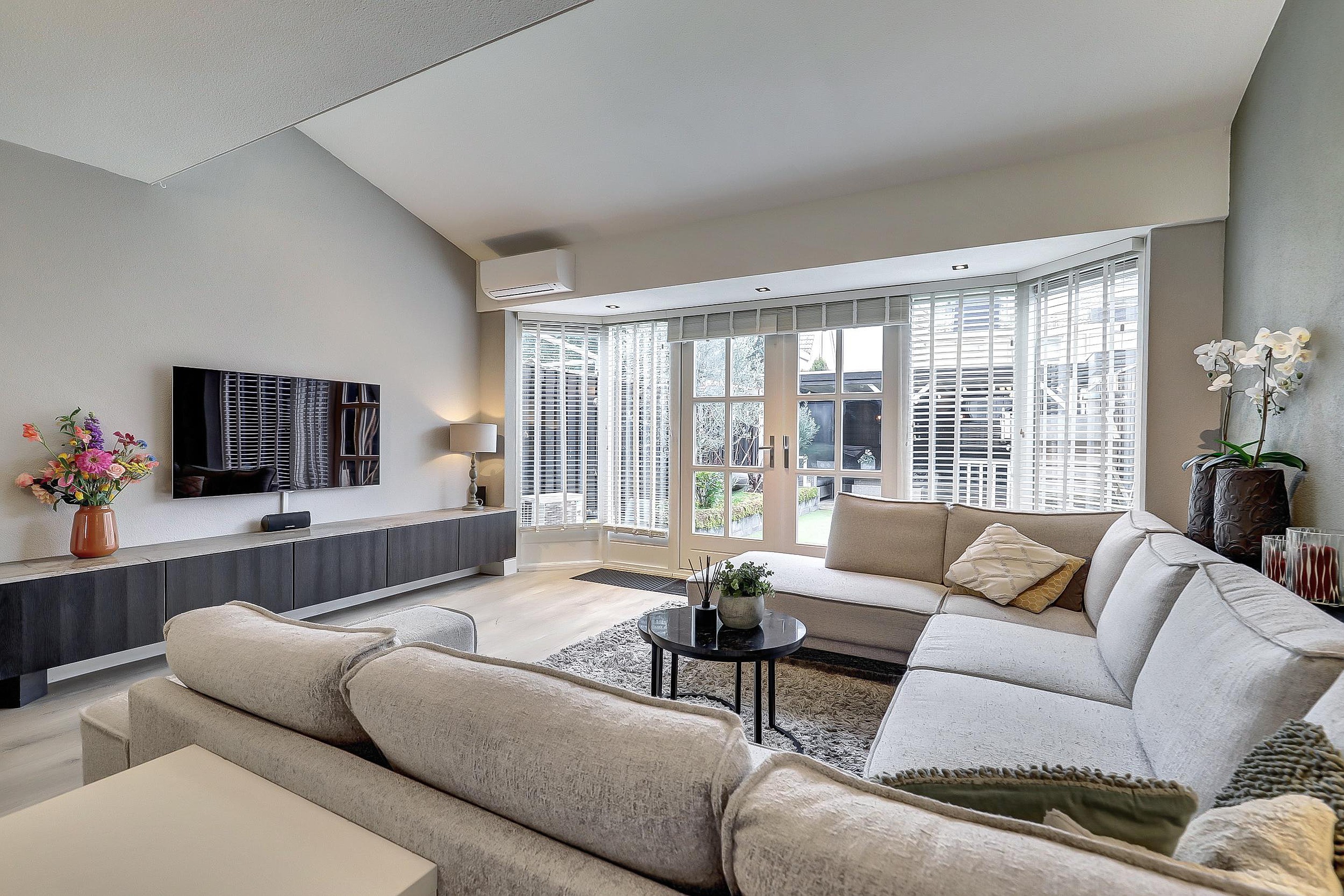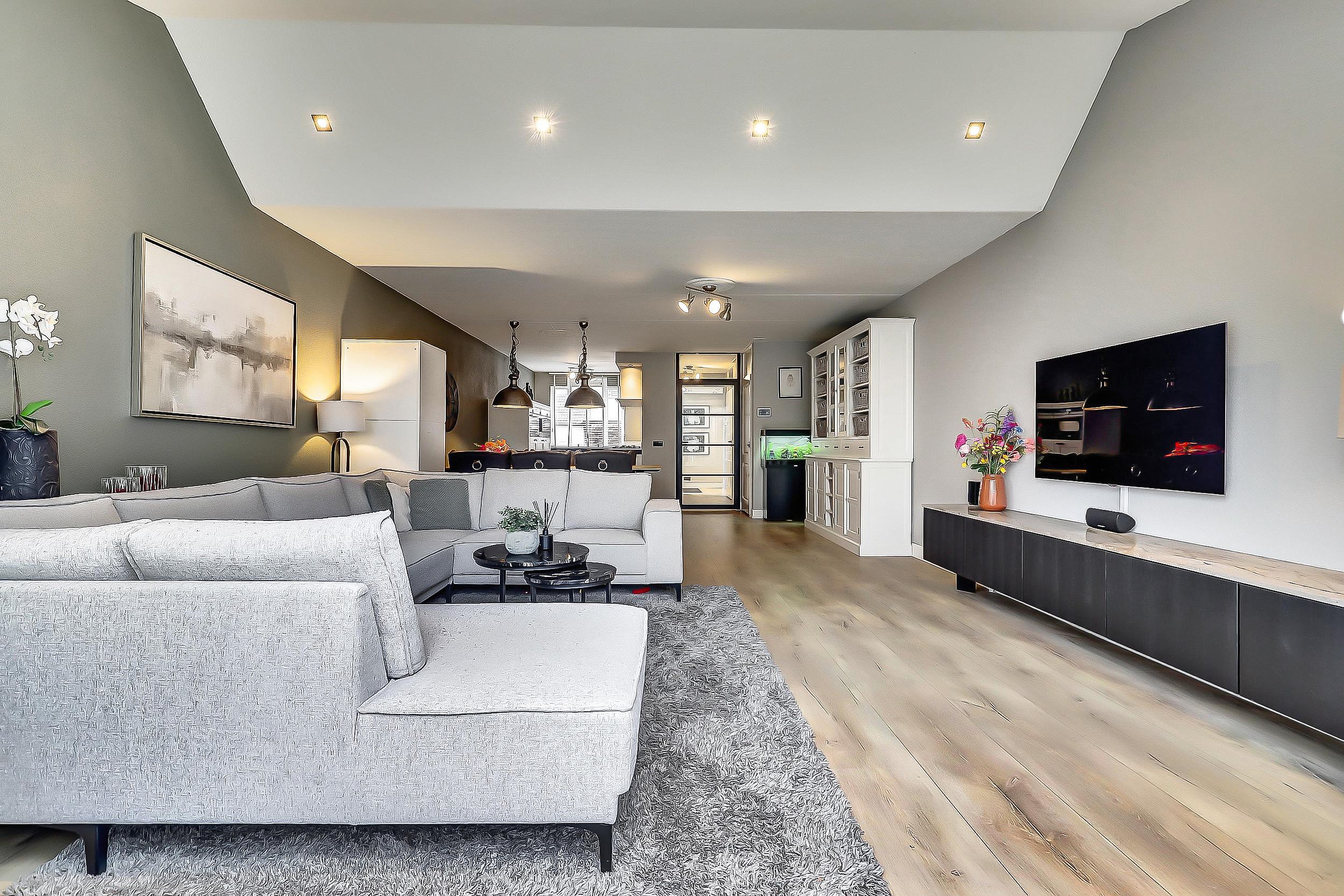 De royale woonkamer is aan de achterzijde uitgebouwd met maar liefst 15 m2 en voelt heerlijk licht en ruim aan. De woonkamer is voorzien van een keurige laminaatvloer, praktische trapkast, een airco-unit en dubbele openslaande deuren naar de tuin.