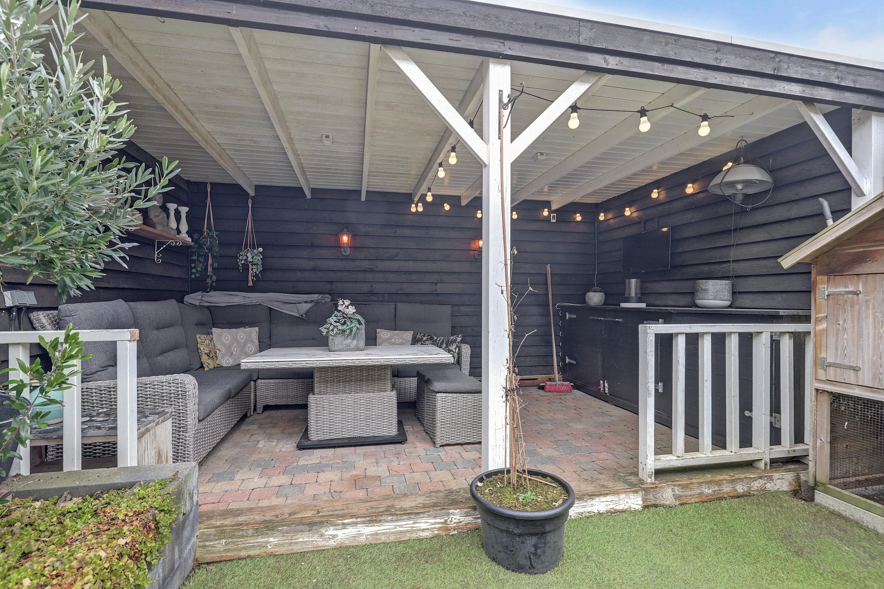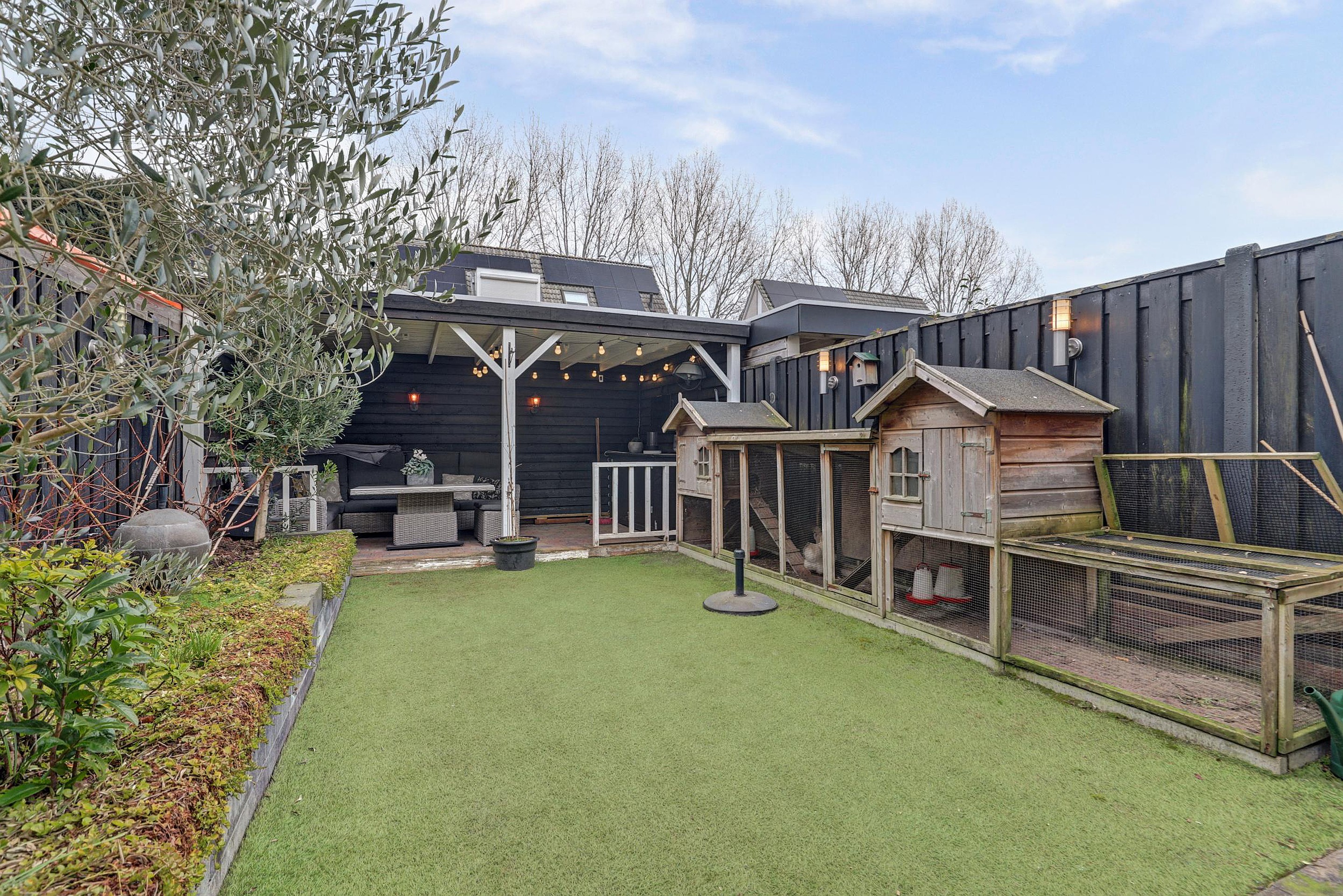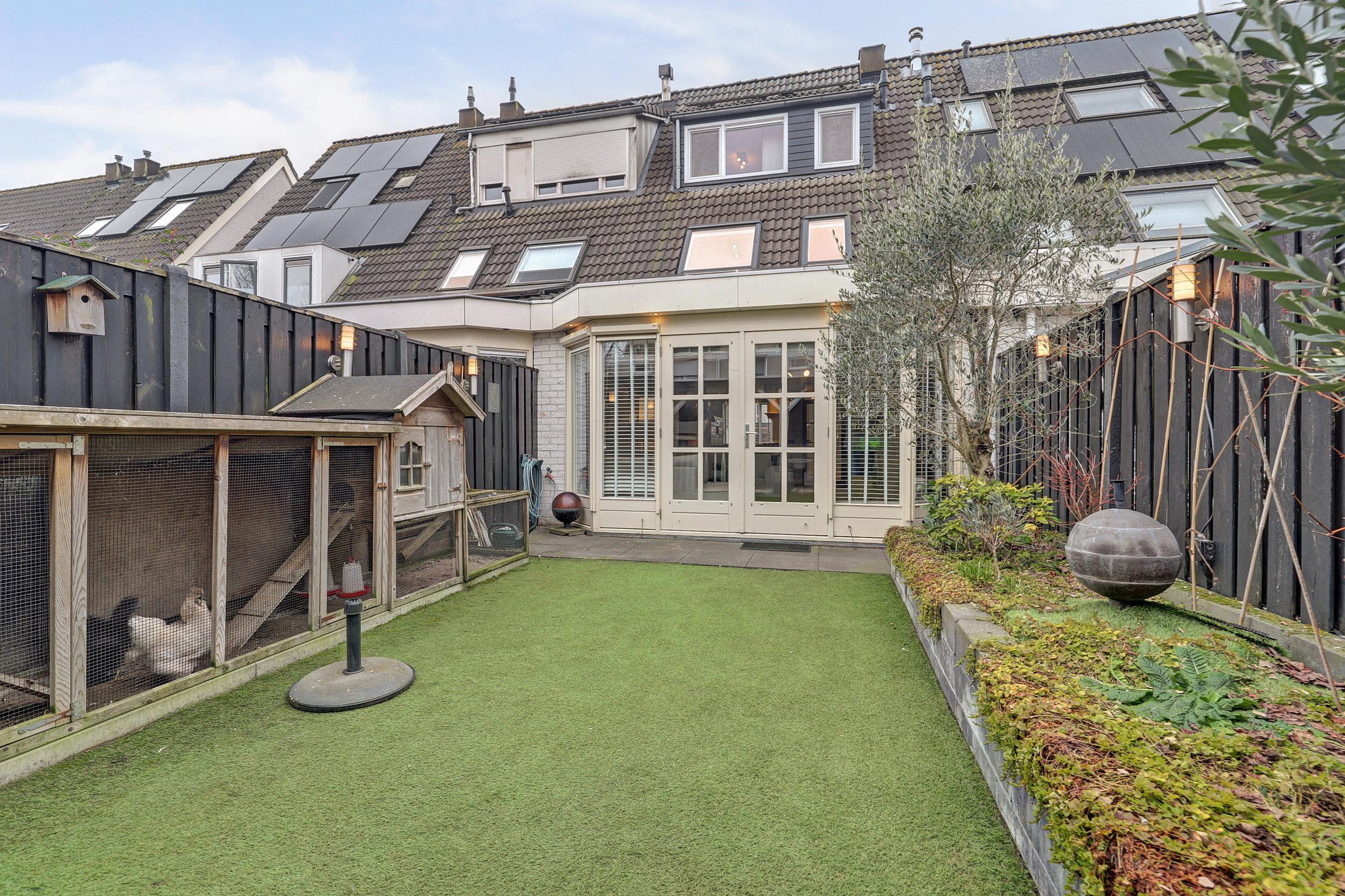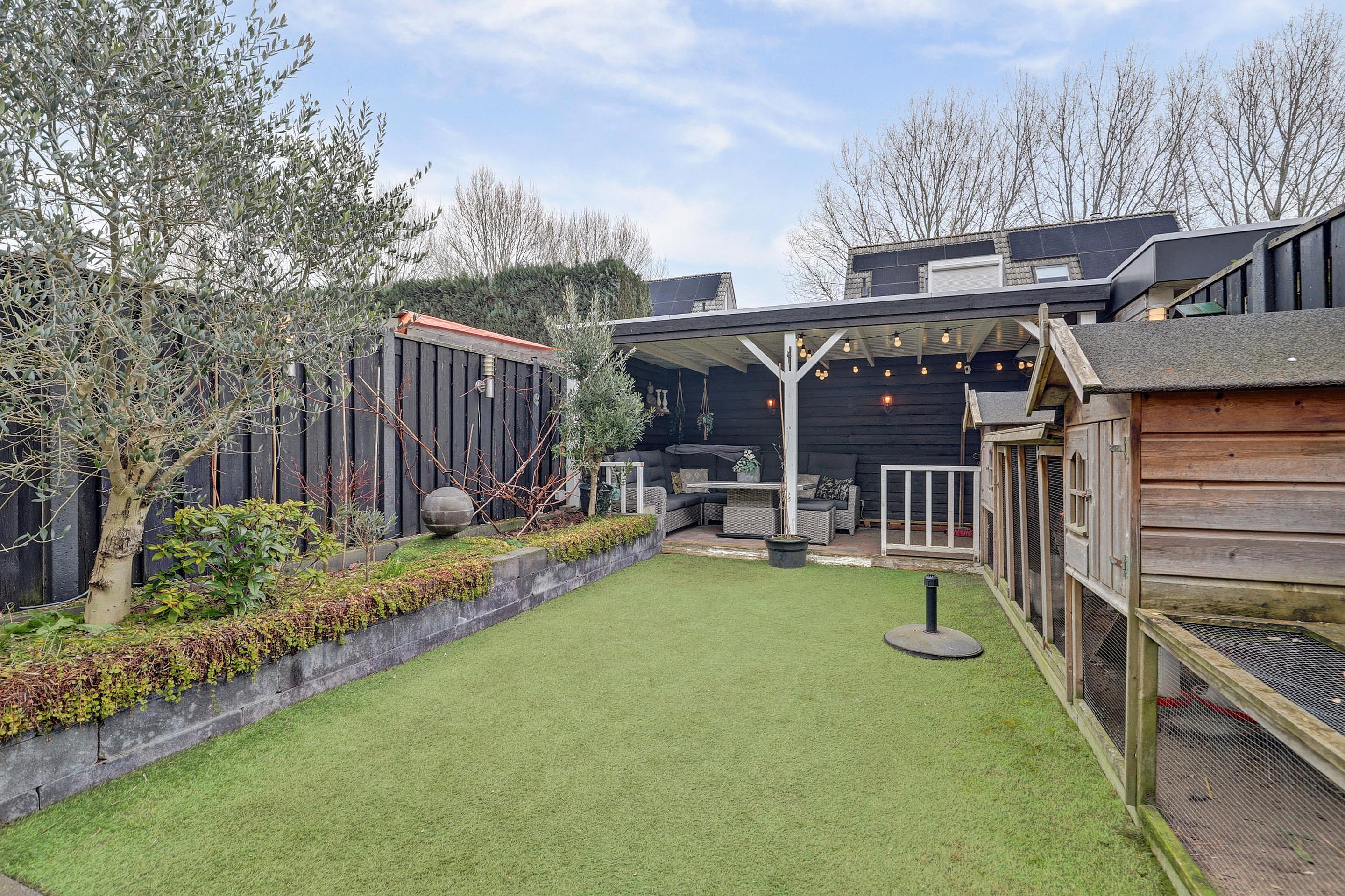 De keurig aangelegde achtertuin ligt op het oosten, is circa 5 meter breed en 9,5 meter diep en onderhoudsvriendelijk ingericht met kunstgras. Achterin bevindt zich een fraaie en gezellige veranda van ca. 15 m2 (3 x 5 m), een heerlijke plek om in de zomer te genieten.