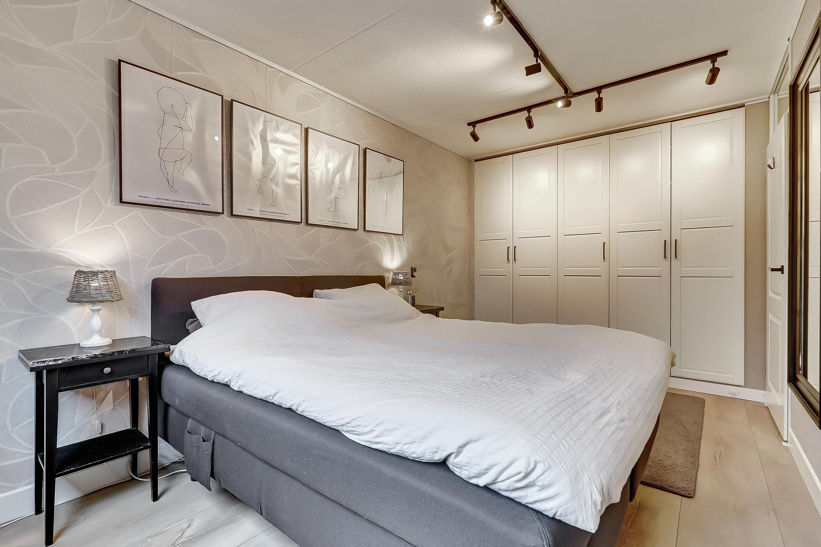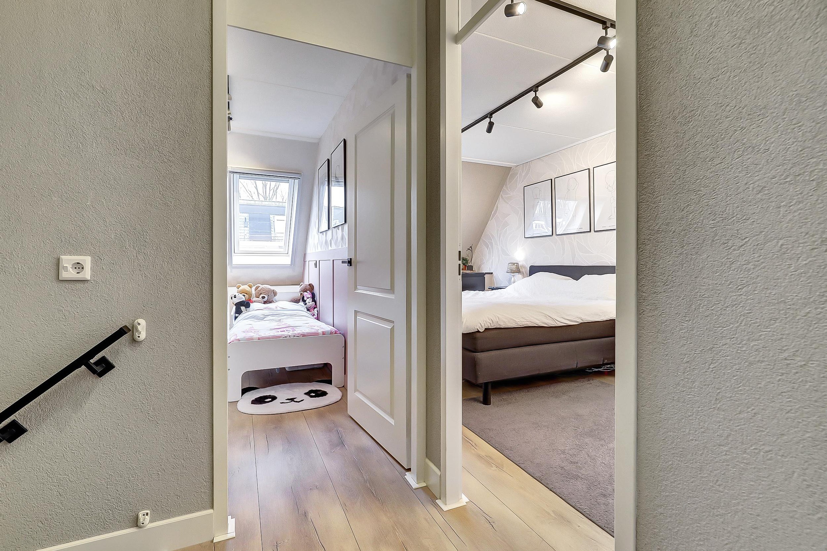 Overloop met toegang tot twee ruime slaapkamers, beide voorzien van een laminaatvloer. De ouderslaapkamer beschikt over een flinke vaste kast.