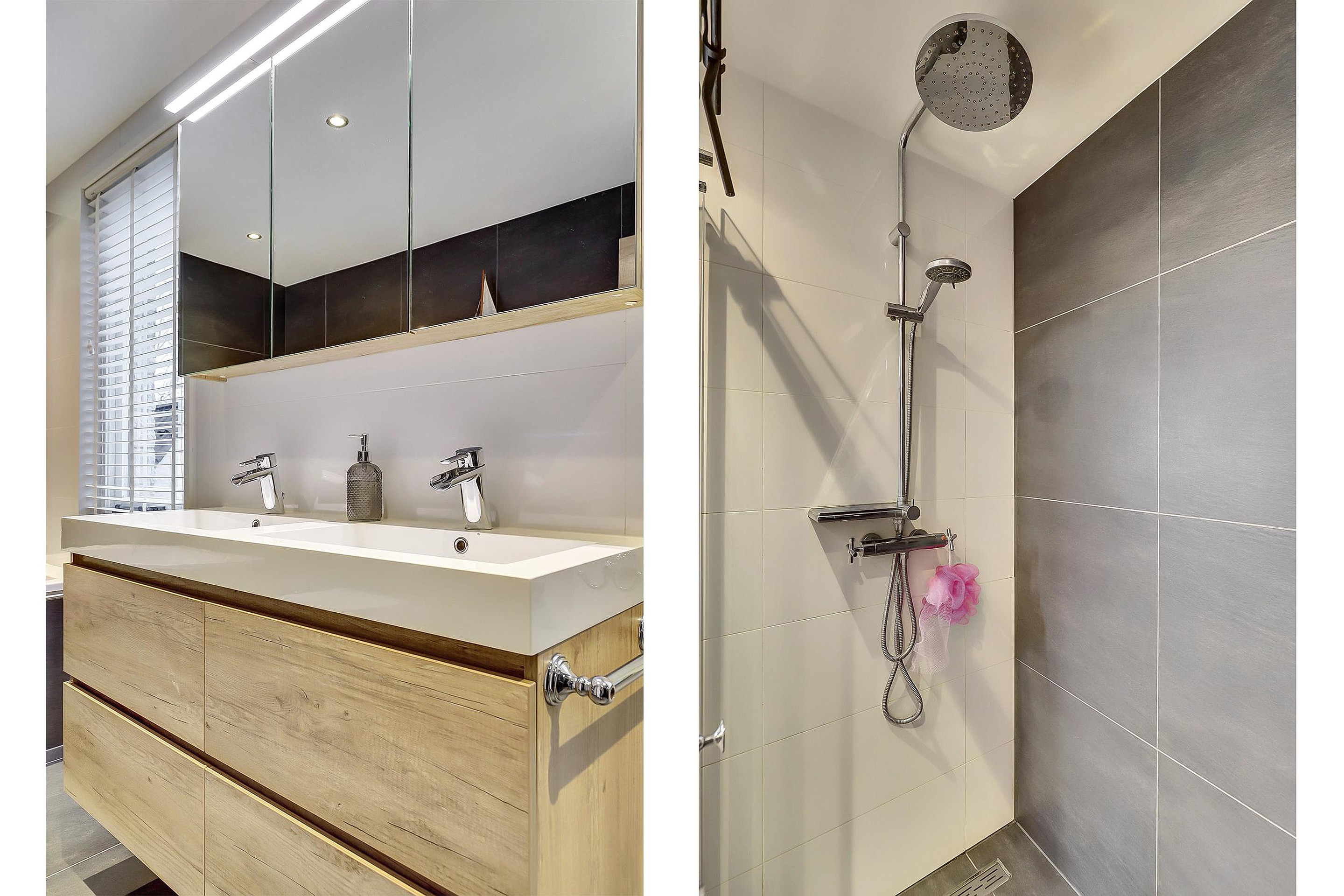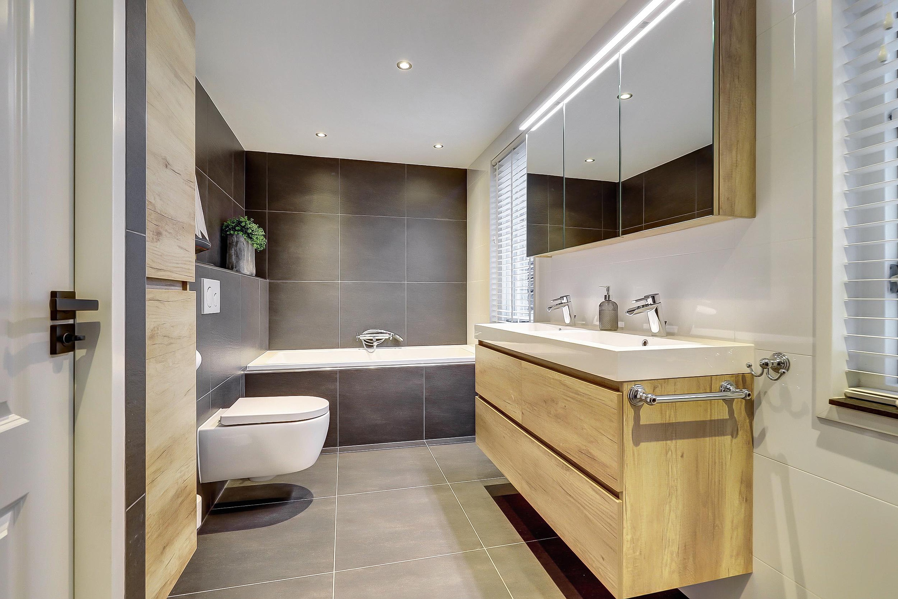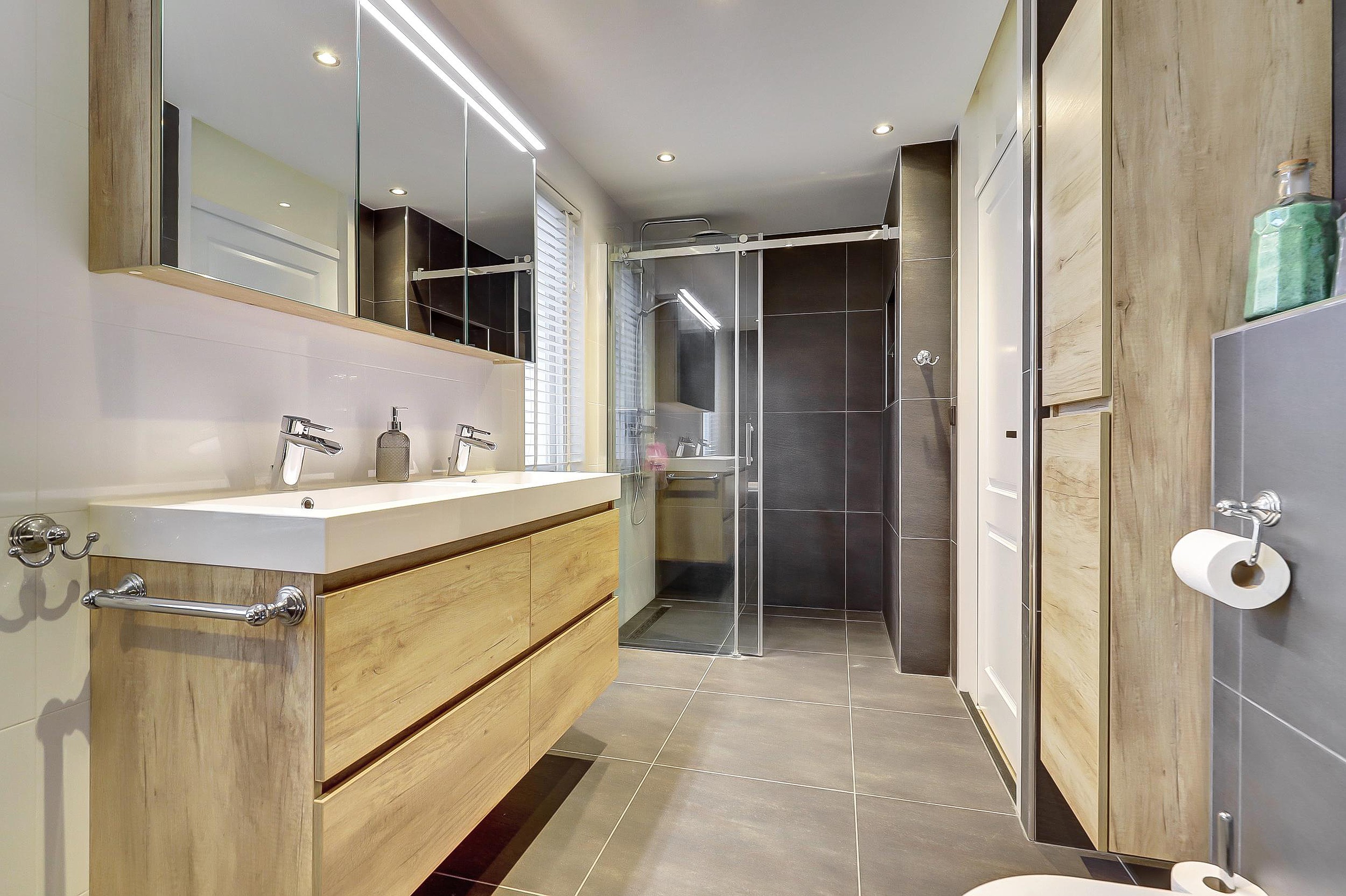 Een echte verrassing is de badkamer (2017), die zich uitstrekt over de volledige breedte van de woning. Met bijna 9 m2 is deze uitzonderlijk ruim en stijlvol uitgevoerd met een ligbad, inloopdouche, tweede zwevend toilet, dubbele wastafel met meubel én twee ramen voor natuurlijke ventilatie en daglicht.