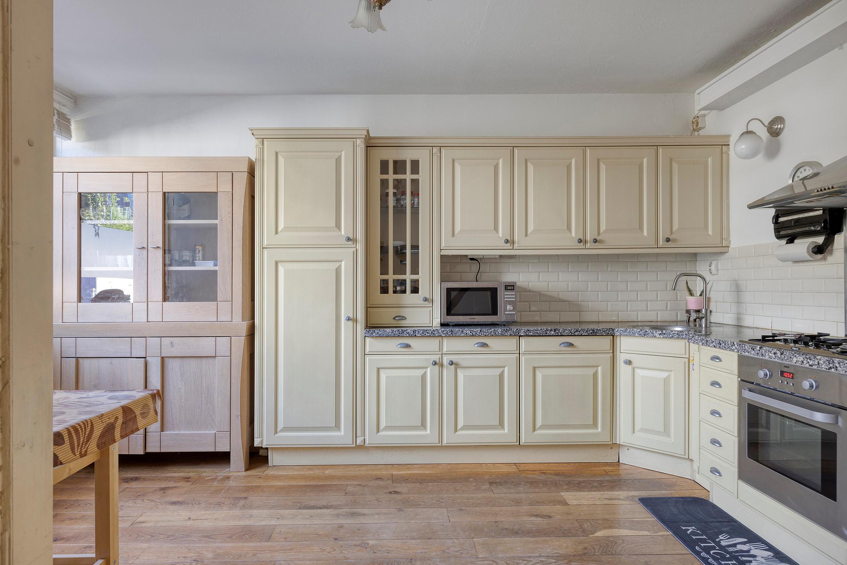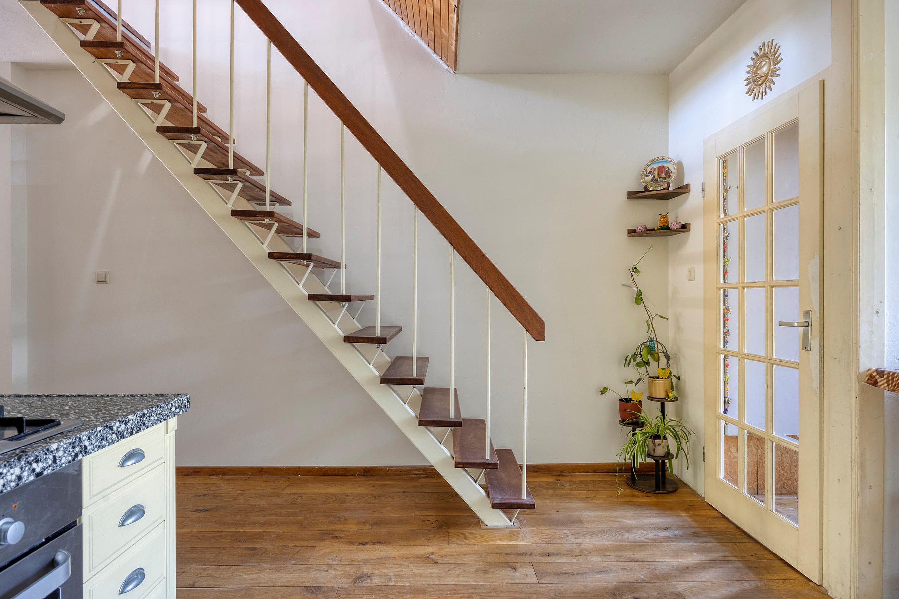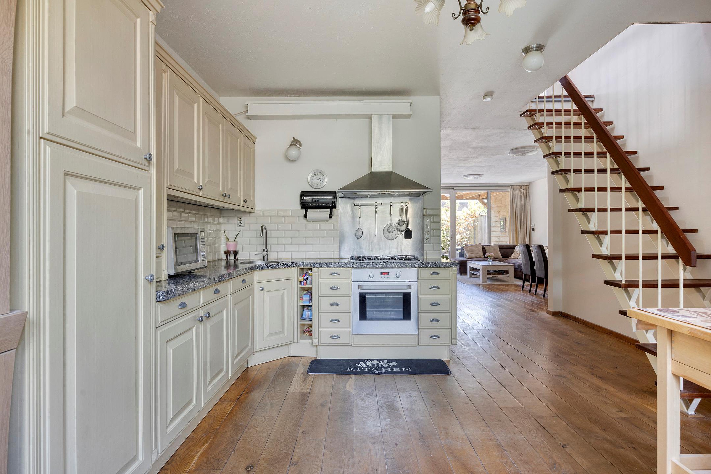 Via de voortuin en de entree met meterkast loop je naar de ruime sfeervolle woonkamer. Meteen al bij binnenkomst valt de eikenhouten vloer op. Deze loopt door van de open keuken naar de woonkamer. Niet alleen de eikenhouten vloer geeft het huis een mooie uitstraling, ook de licht gestucte muren in alle vertrekken dragen hun steentje hieraan bij. Verder heb je via de woonkamer toegang tot een portaal naar de toiletruimte met fonteintje. De keuken is gelegen aan de voorzijde en is geplaatst in een hoekopstelling. De ruimte is uitgevoerd in een lichte kleurstelling. De keuken is van alle gemakken voorzien zoals: een 5 pits gasstel, vaatwasser, koelkast, granieten werkblad en afzuigkap. Bij de hoekkeuken is ook een fijne ontbijt-hoek gecreëerd.