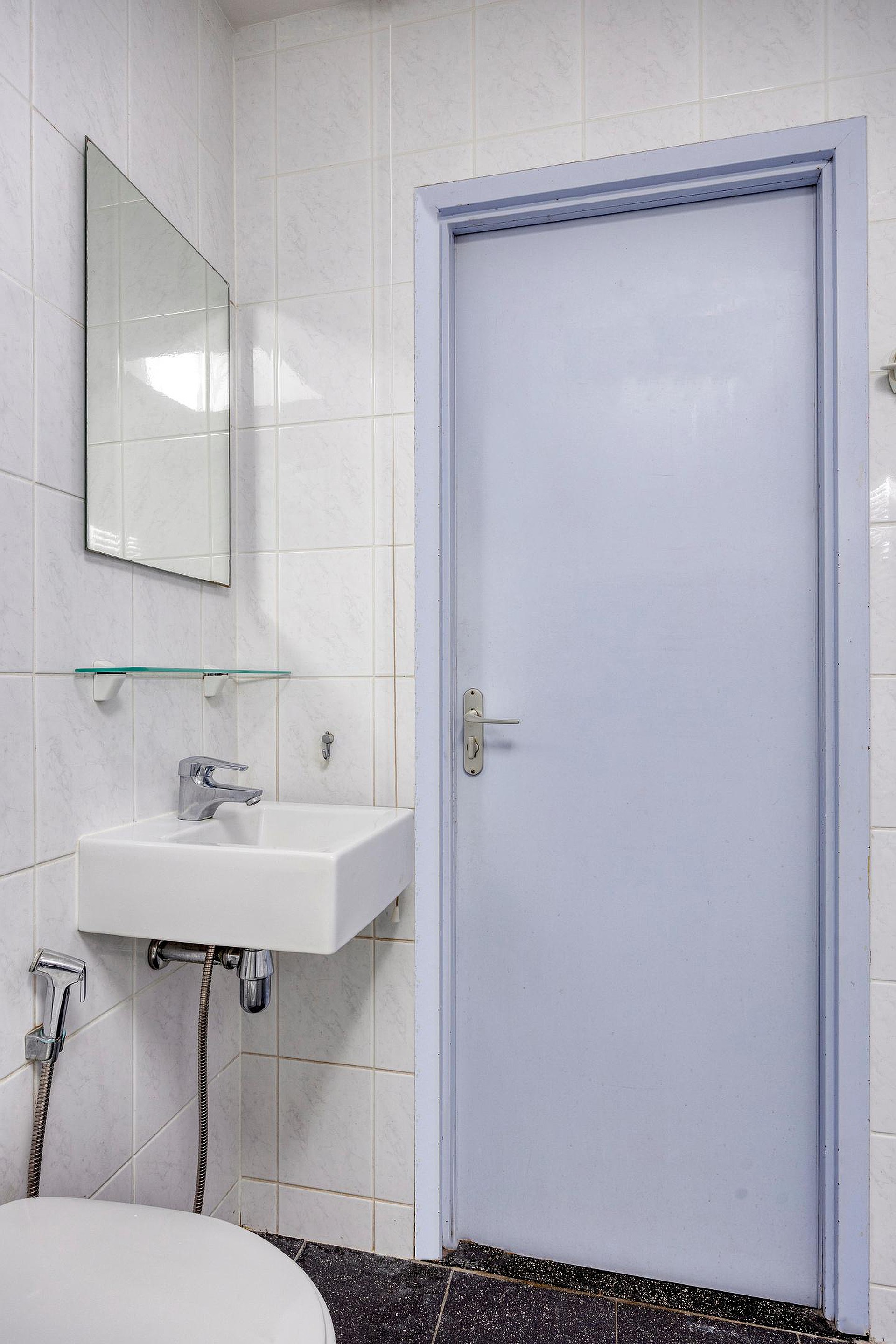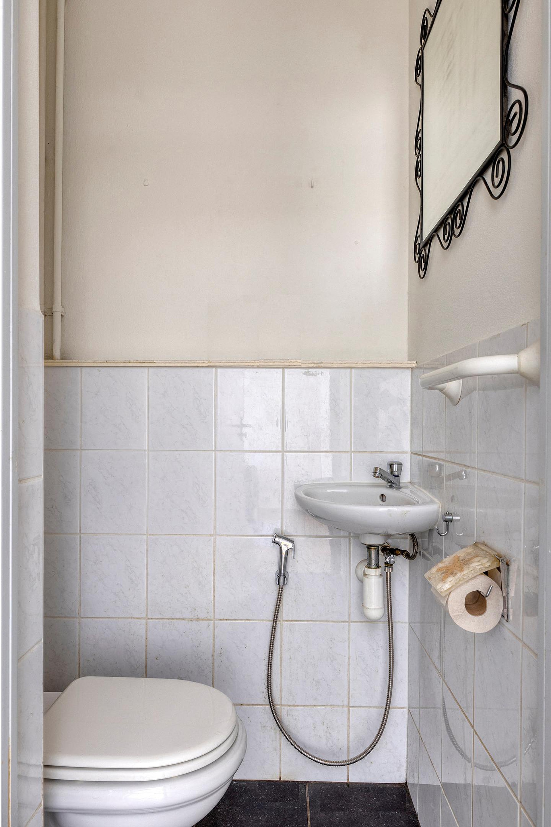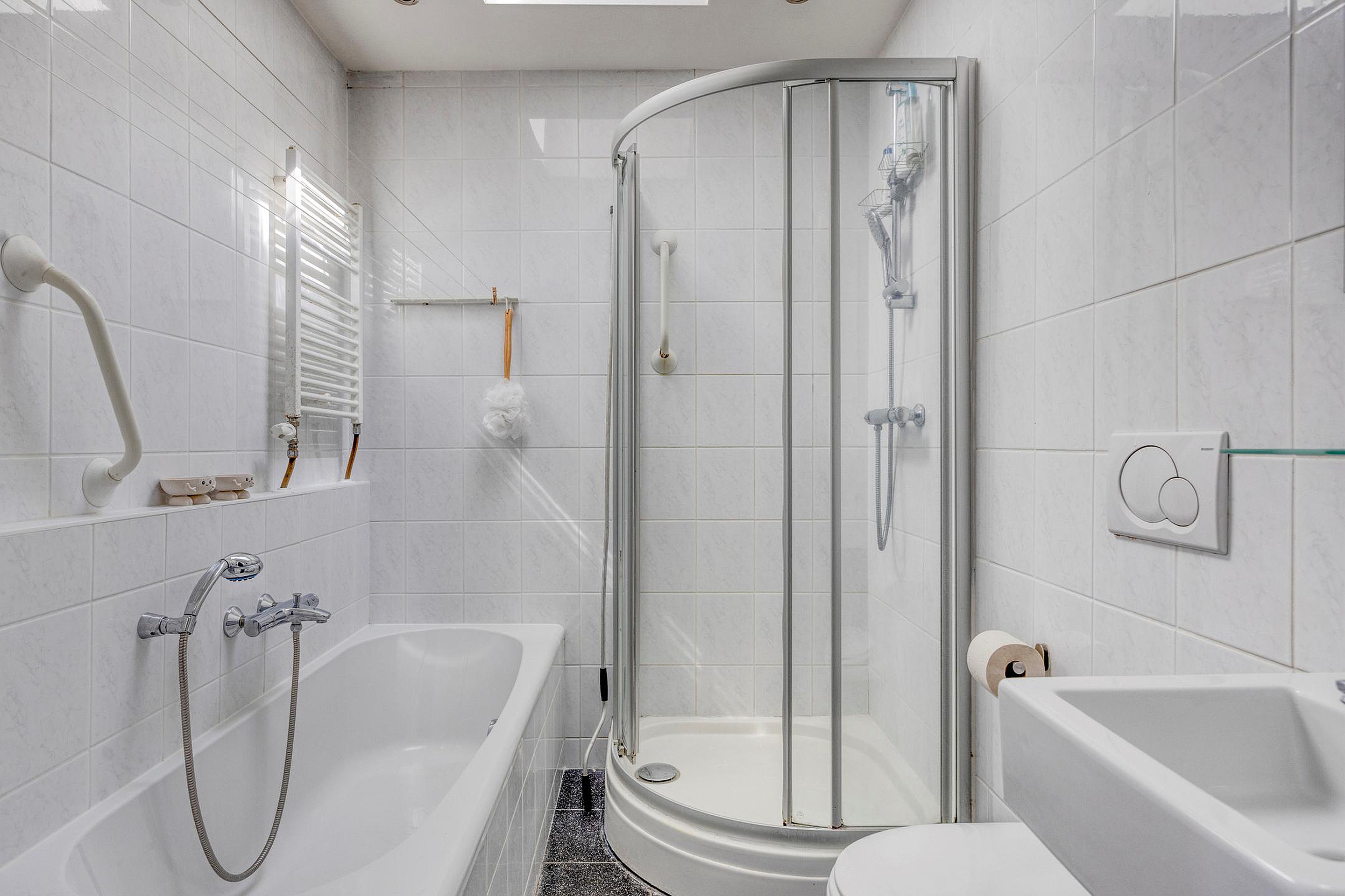 De nette, geheel betegelde badkamer is voorzien van een wastafel, een wandcloset, een ligbad en een ruime douche.