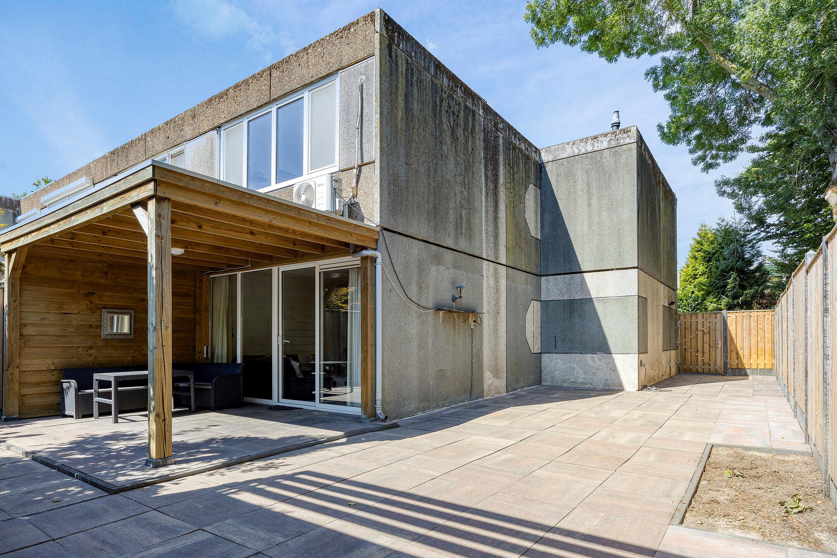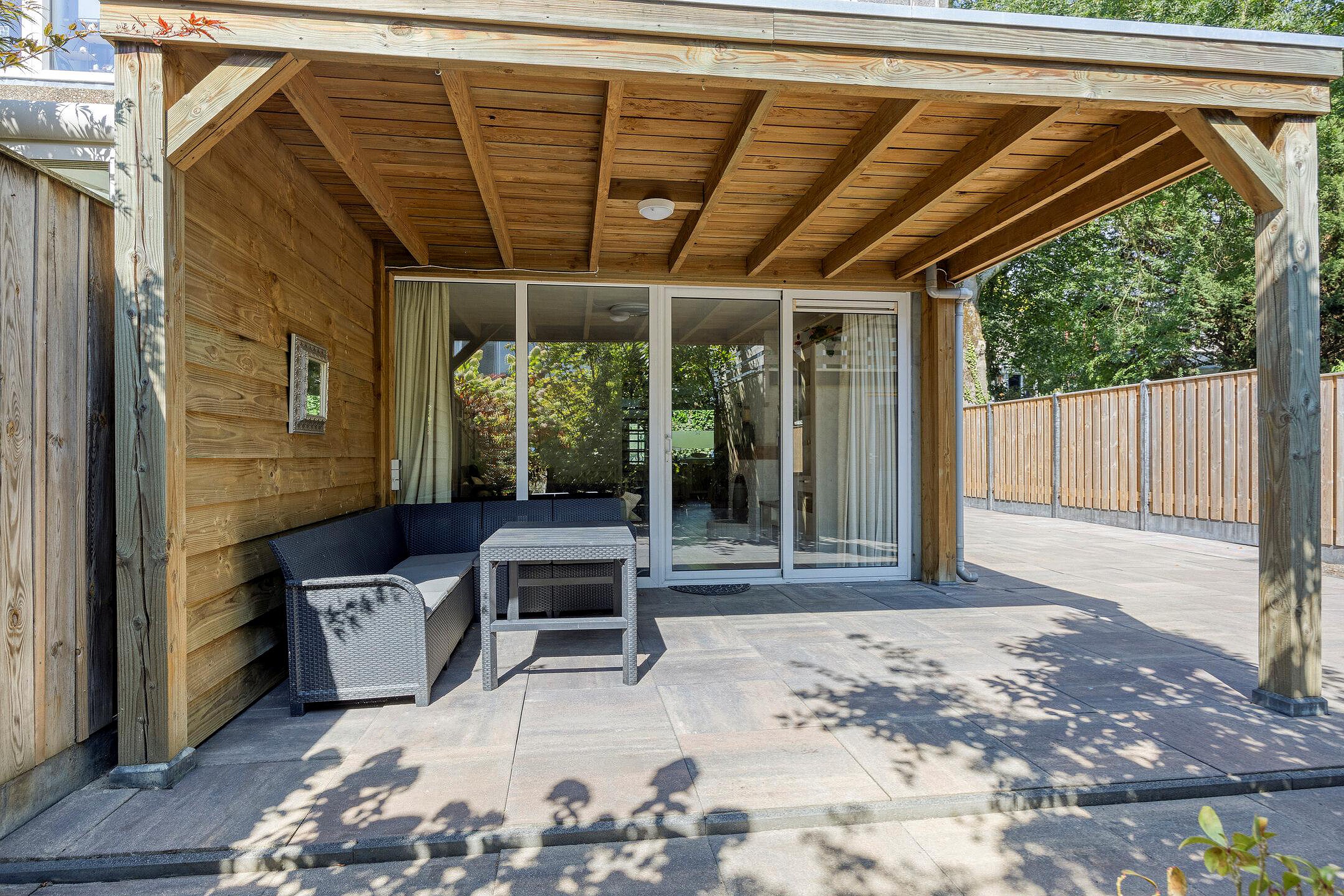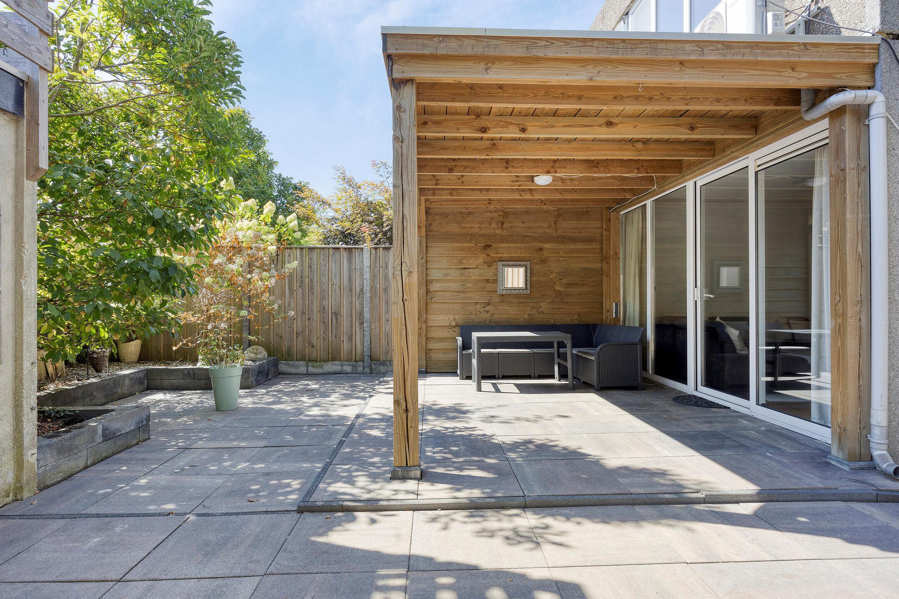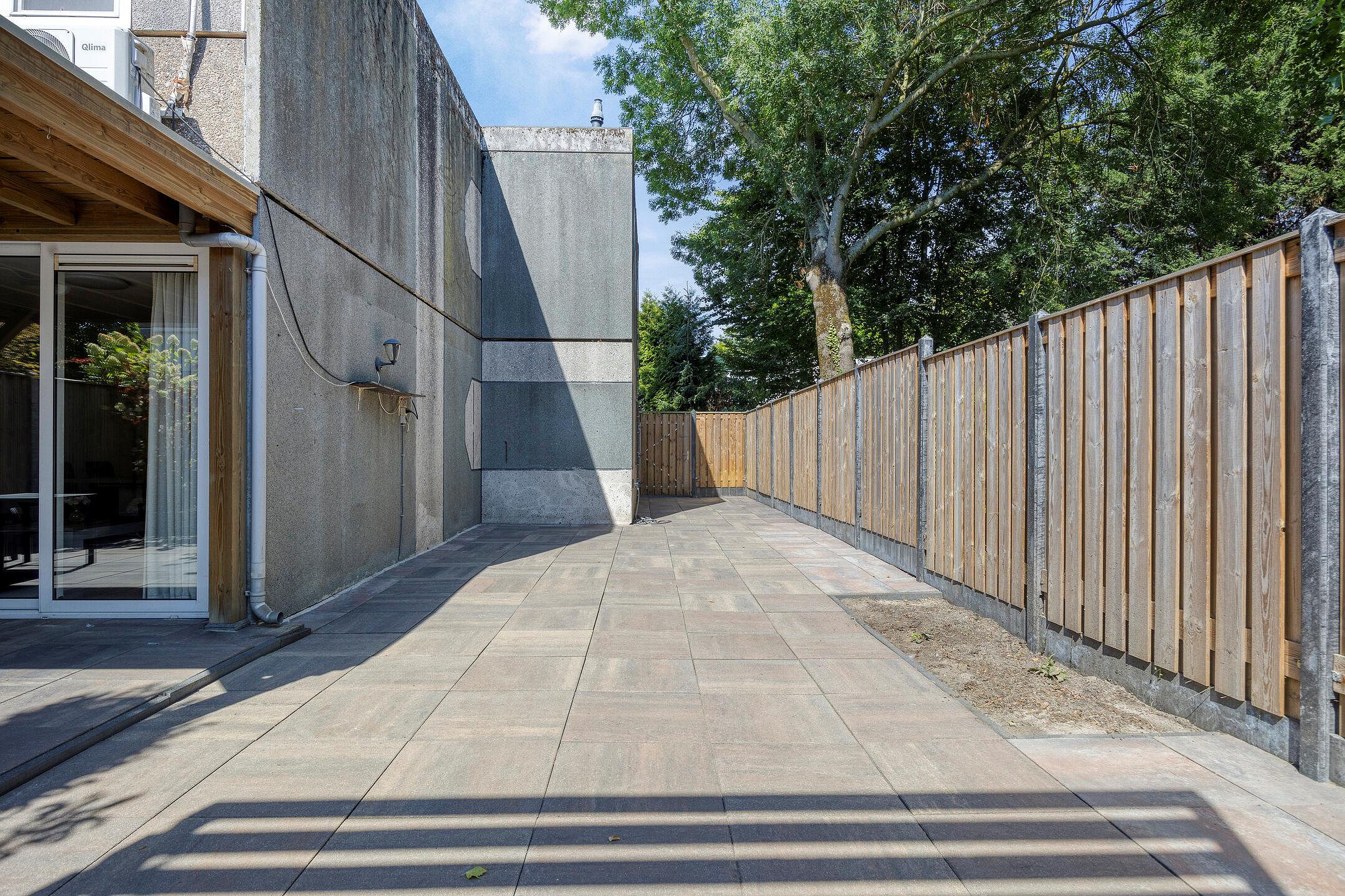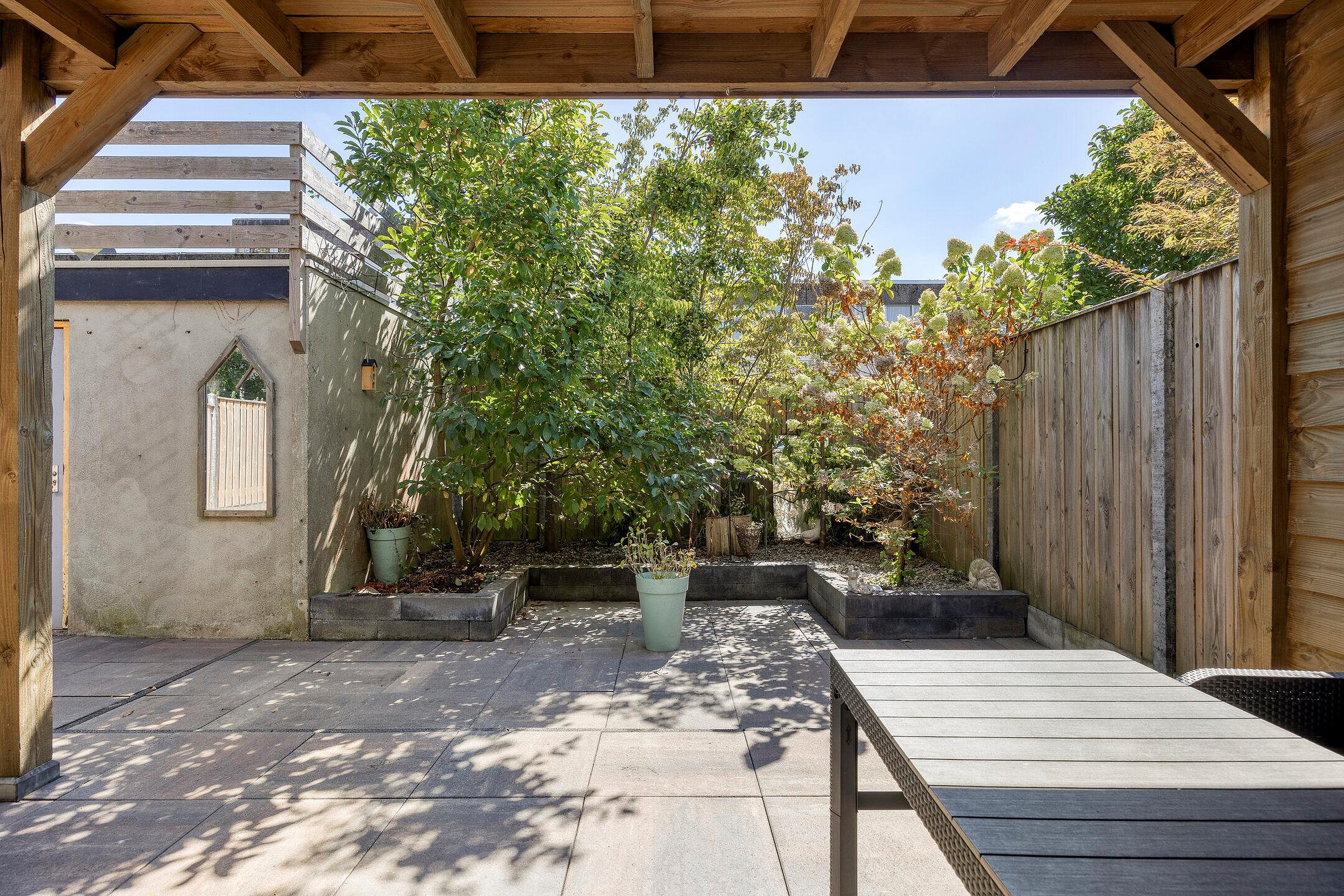 Rondom het huis ligt een verzorgde tuin. In de keurig betegelde achtertuin kun je op een zomerse avond nog lang behaaglijk buiten zitten onder de overkapping. De tuin is gelegen op het zuiden en dankzij de schutting heb je hier voldoende privacy.