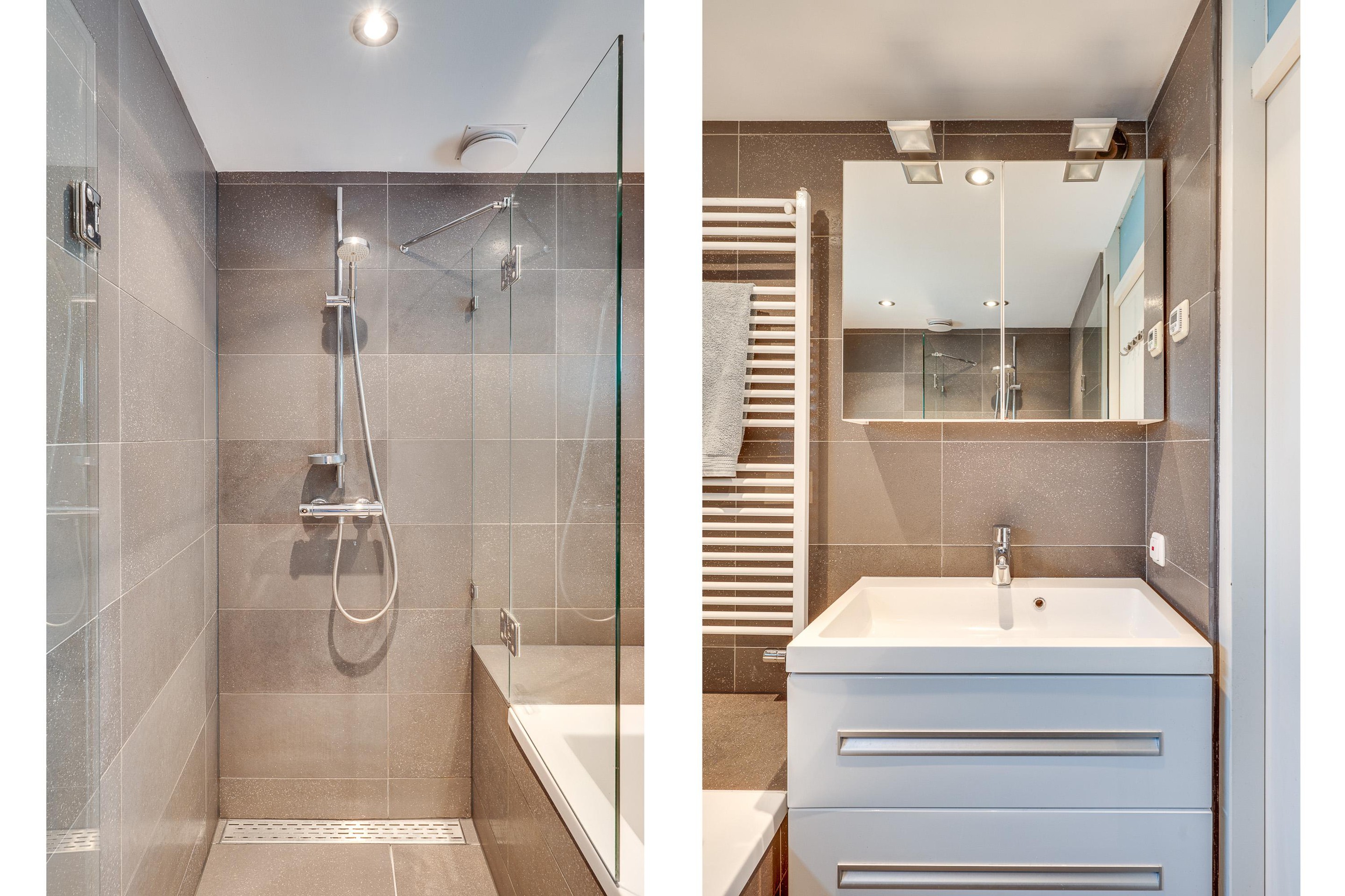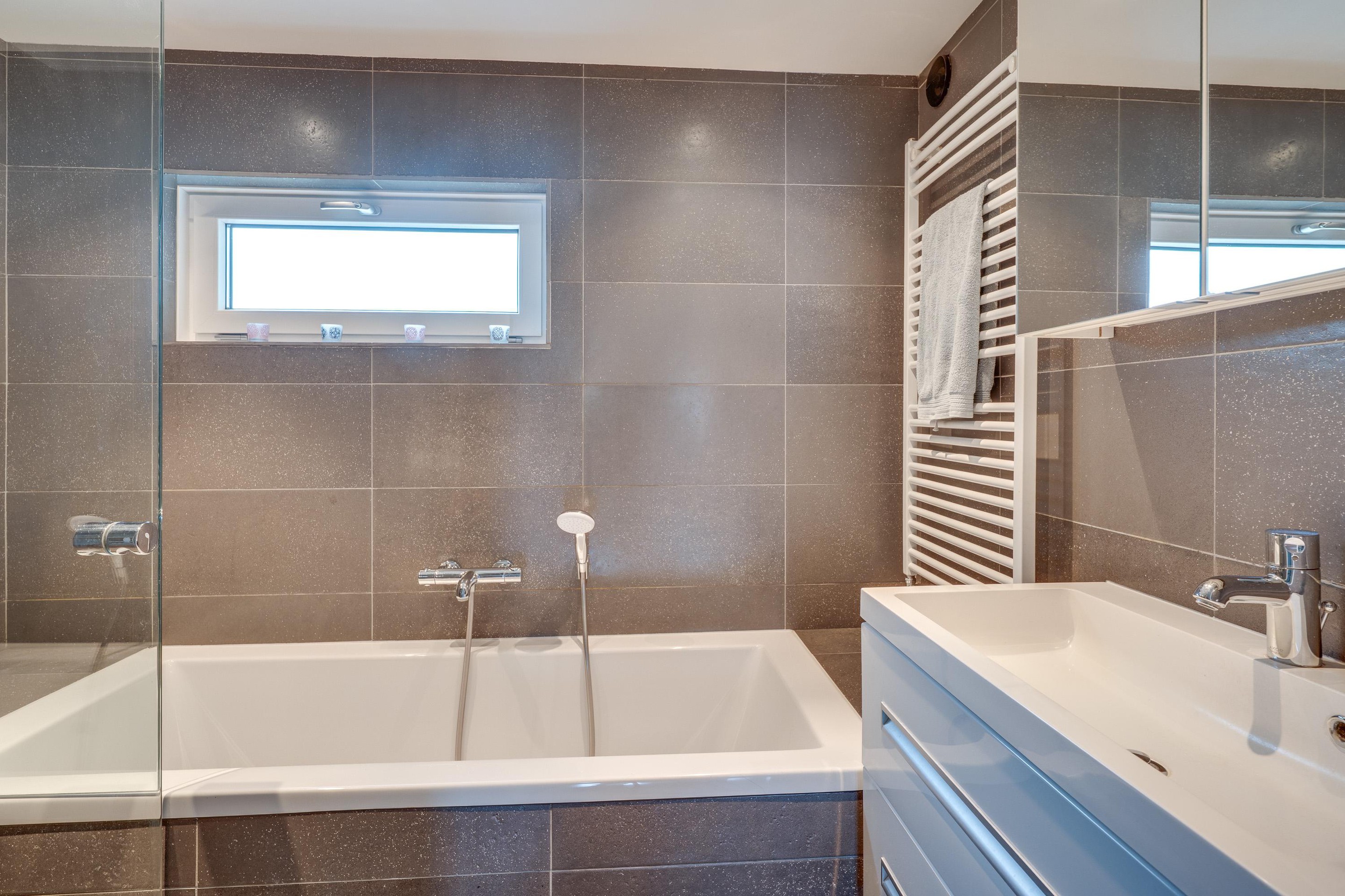 De vernieuwde badkamer is stijlvol betegeld en voorzien van een inloopdouche, ligbad, modern wastafelmeubel en designradiator. Op de overloop bevindt zich bovendien een separaat tweede toilet.