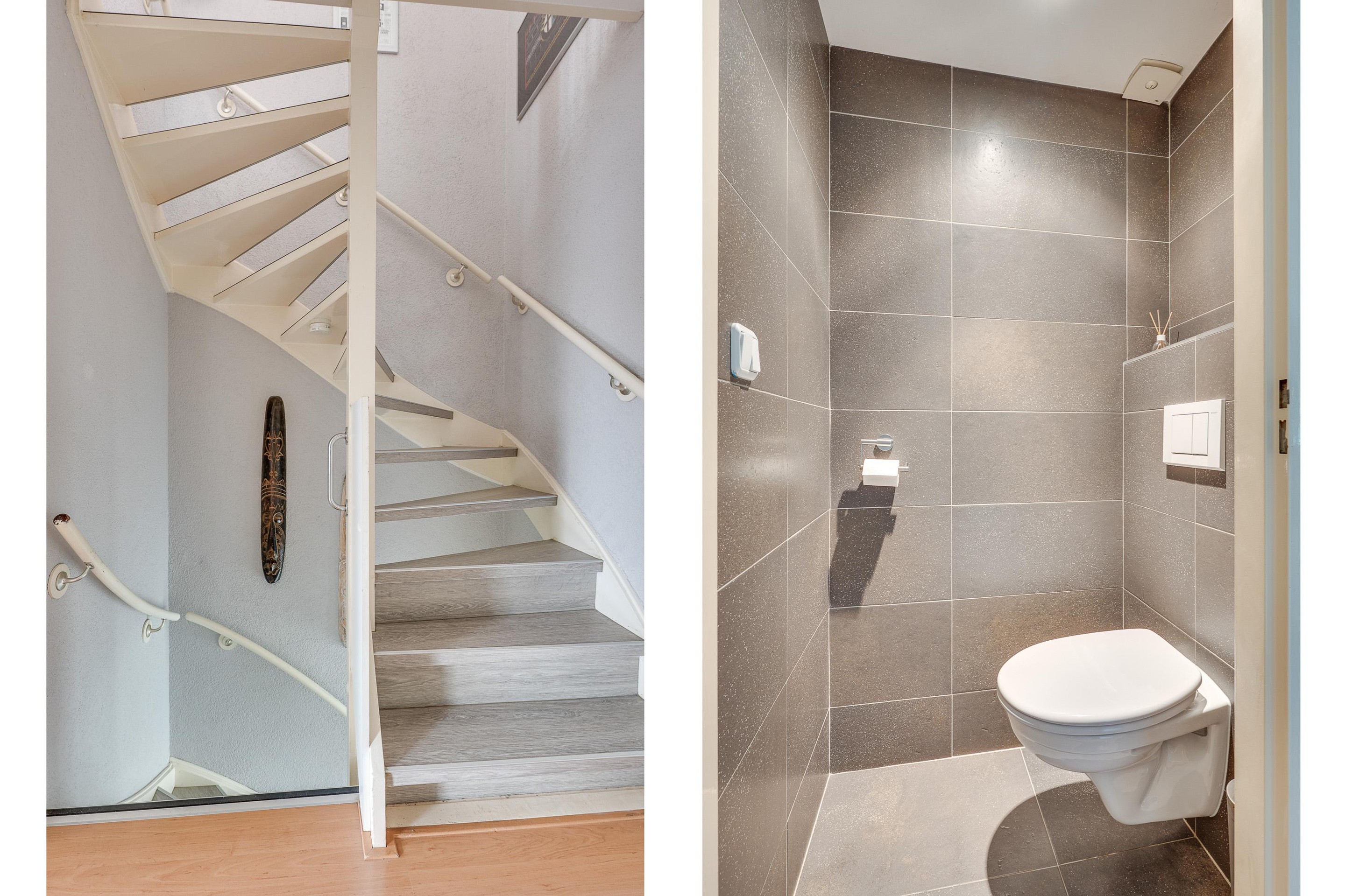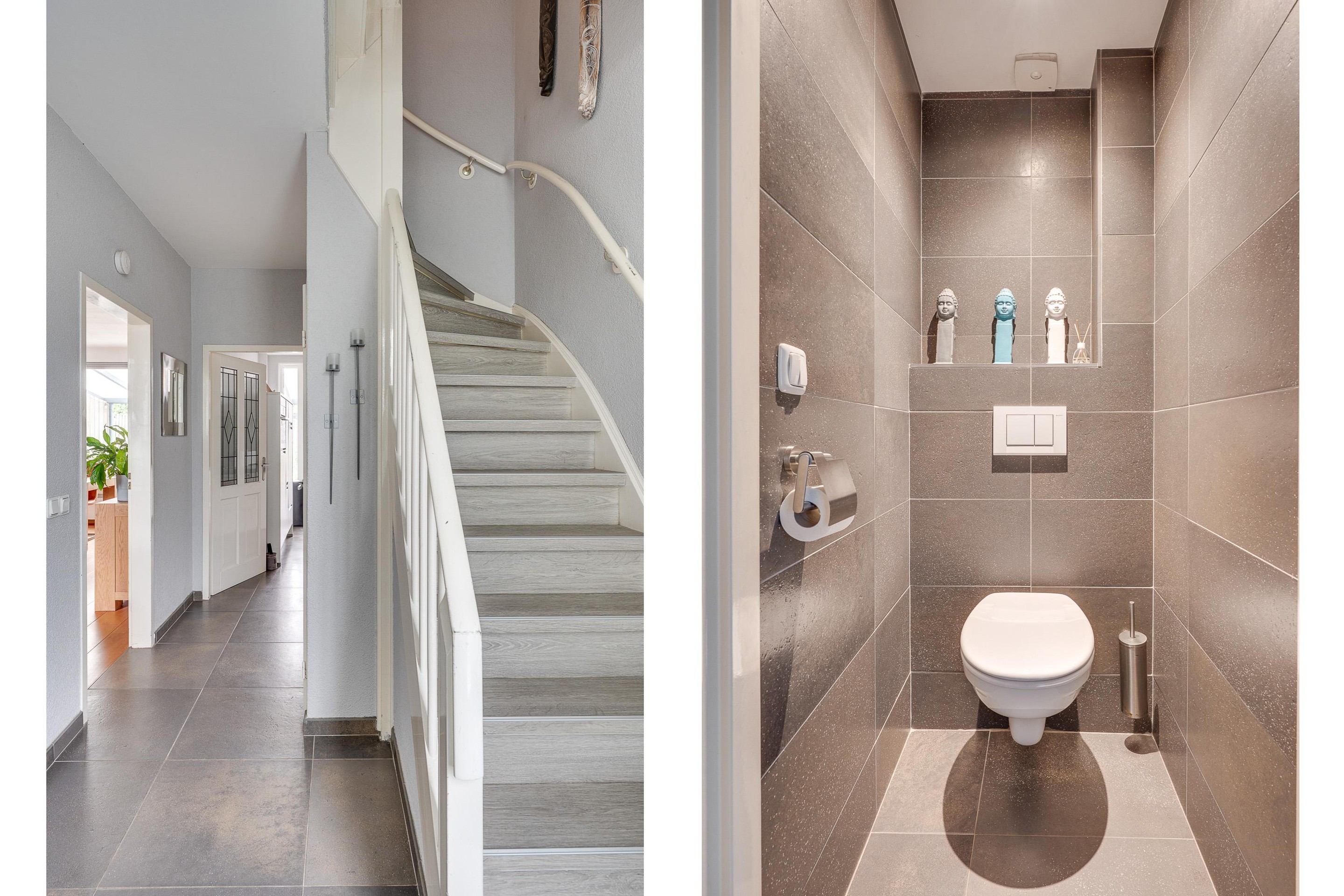 Begane grond Via de verzorgde voortuin bereik je de entree van de woning. De ruime hal met garderobe biedt toegang tot de vernieuwde meterkast en de modern betegelde toiletruimte met hangend closet.