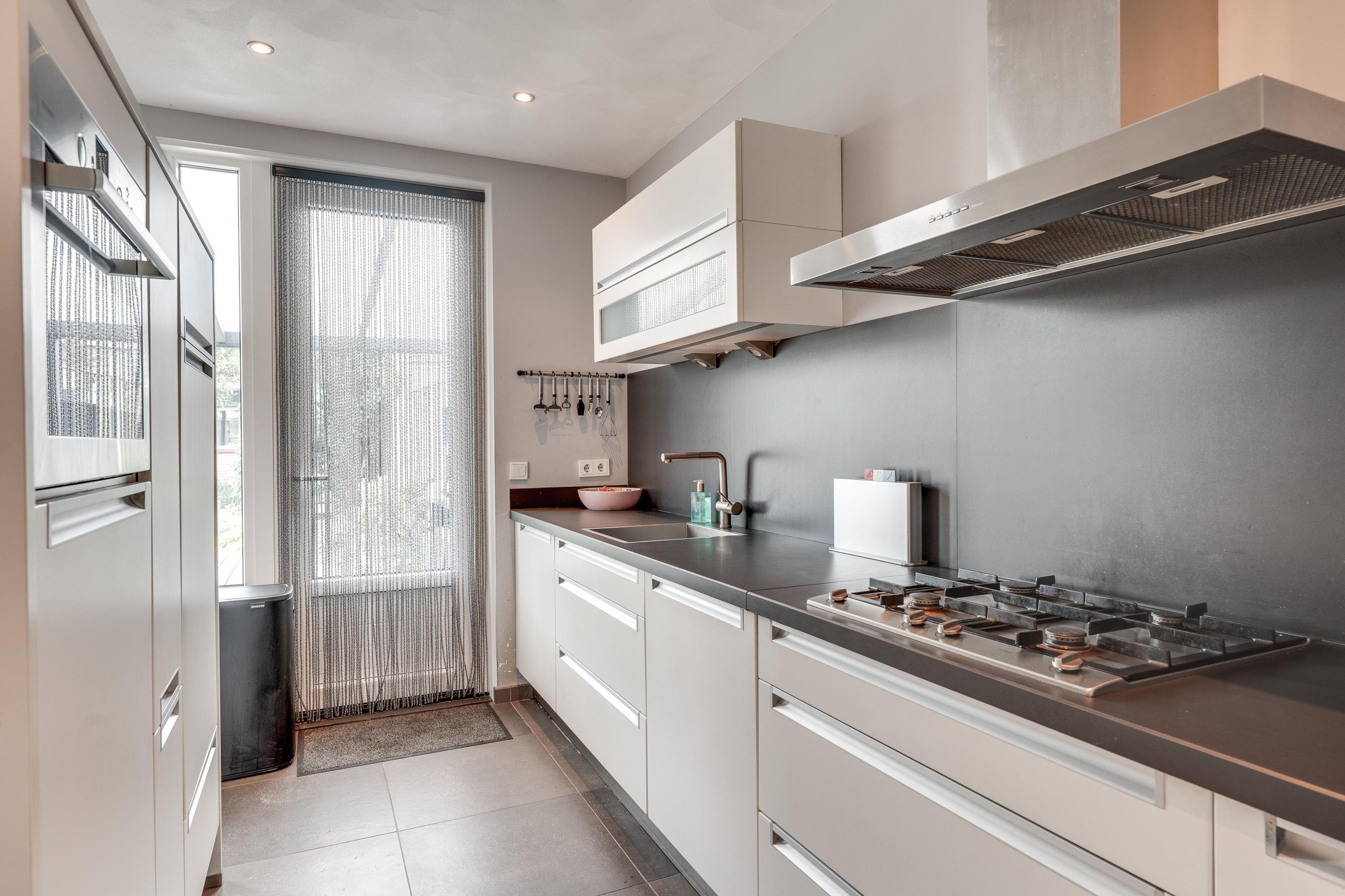 Via de keuken stap je direct de tuin in, waar een overdekt terras uitnodigt tot ontspannen genieten in elk seizoen.