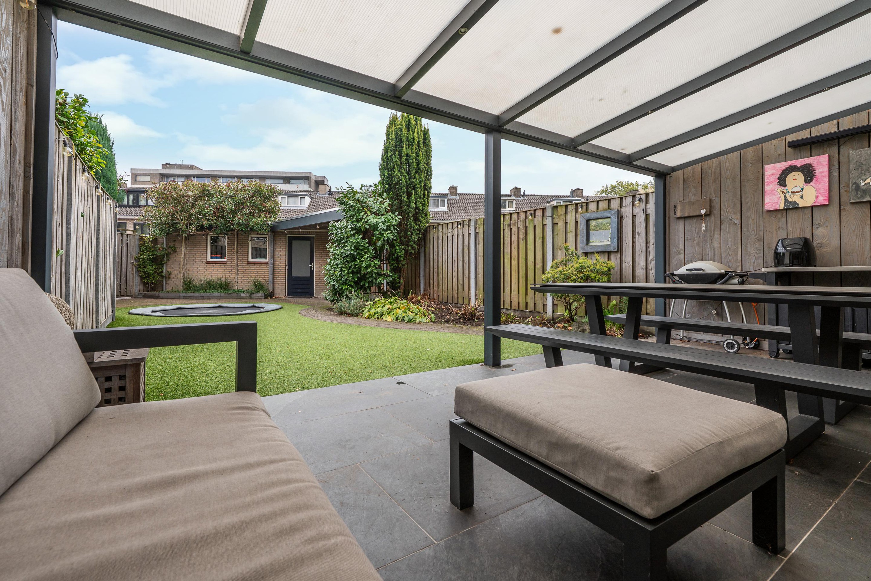 De diepe achtertuin is een heerlijke plek om te genieten van het buitenleven. De grote terrasoverkapping zorgt ervoor dat je hier al vroeg in het voorjaar en tot laat in het najaar comfortabel kunt zitten.