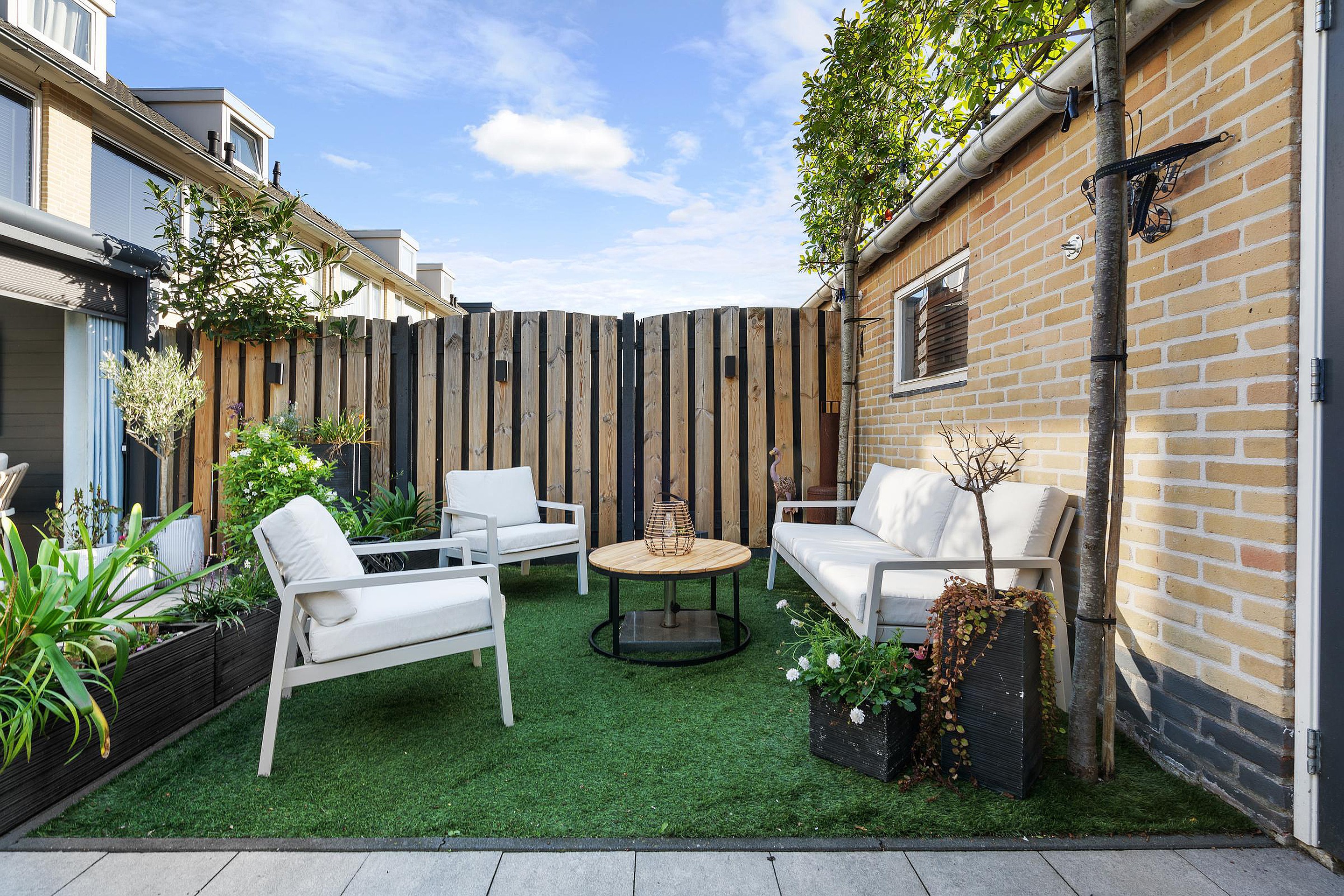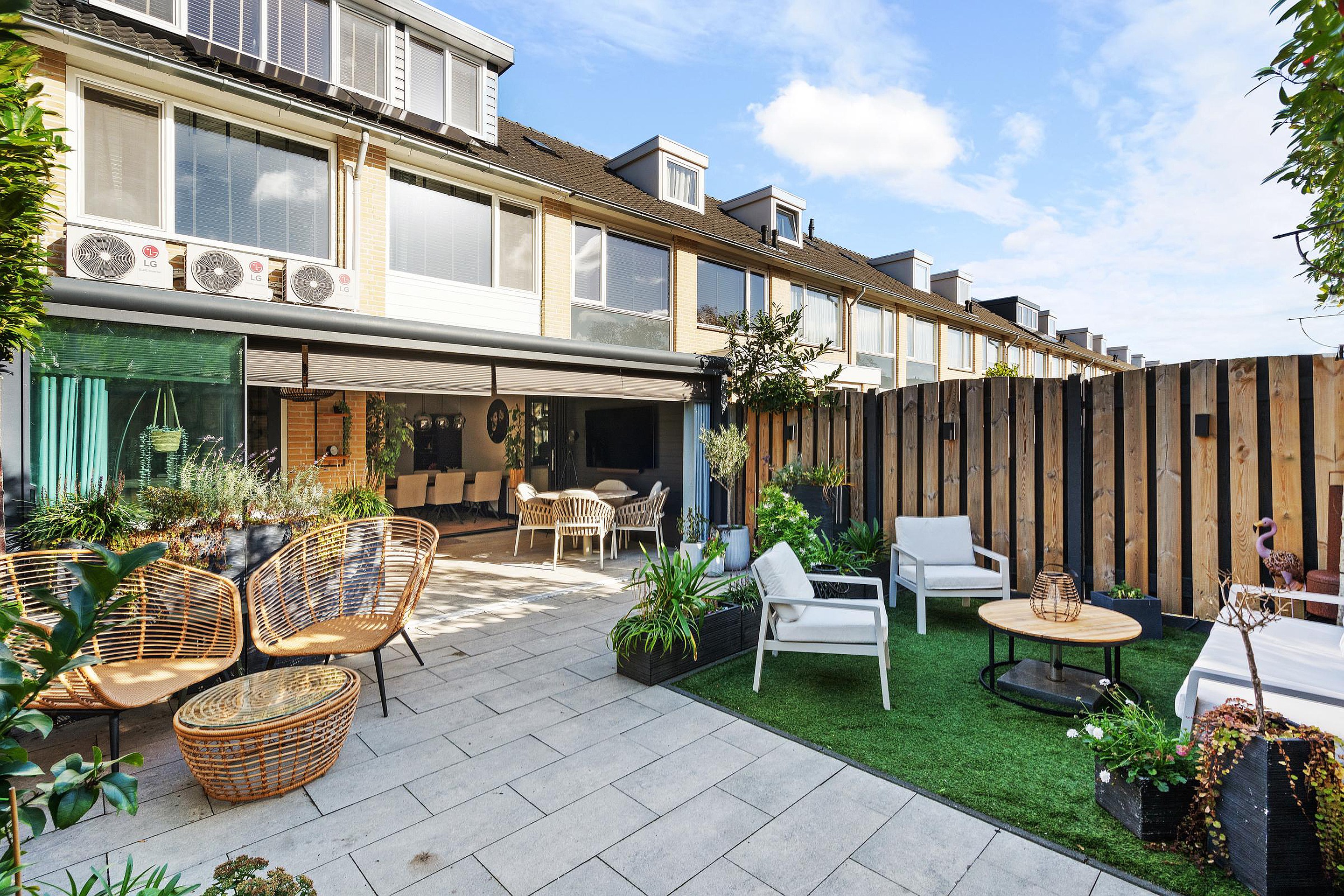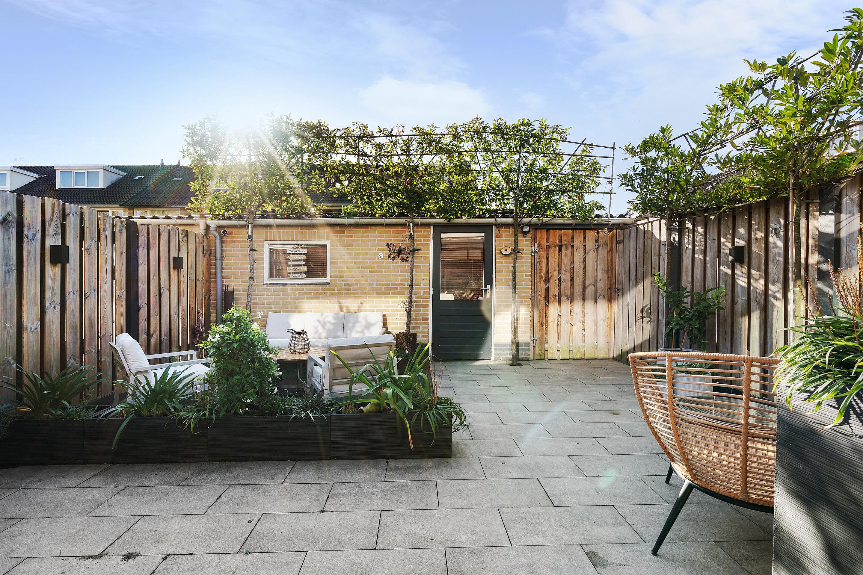 De achtertuin ligt op het zuiden en is vrijwel geheel betegeld en volledig omheind, met mogelijkheid tot verplaatsbare plantenborders. Vanuit de achtertuin zijn een aparte berging, fietsenhok en de achterom bereikbaar.