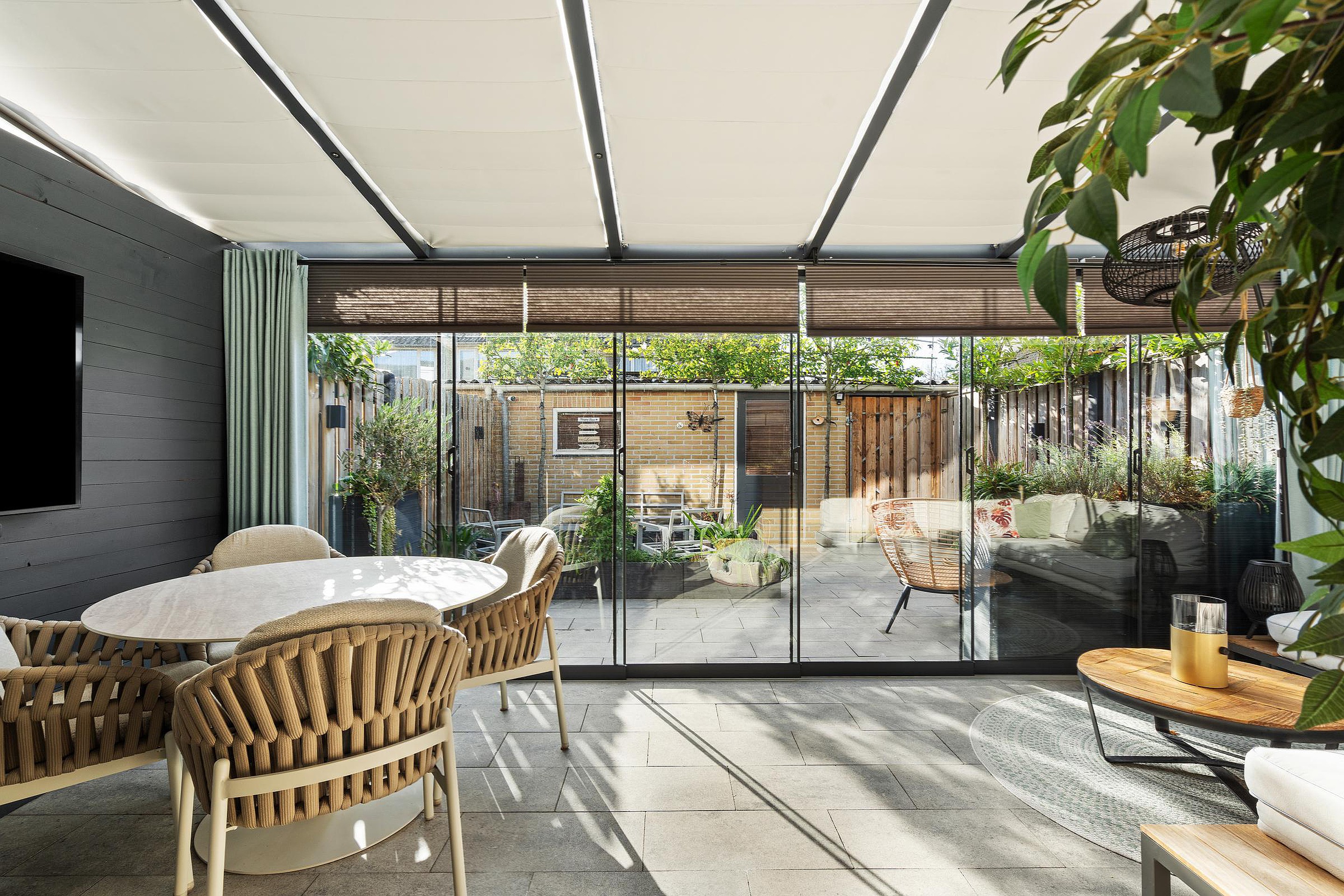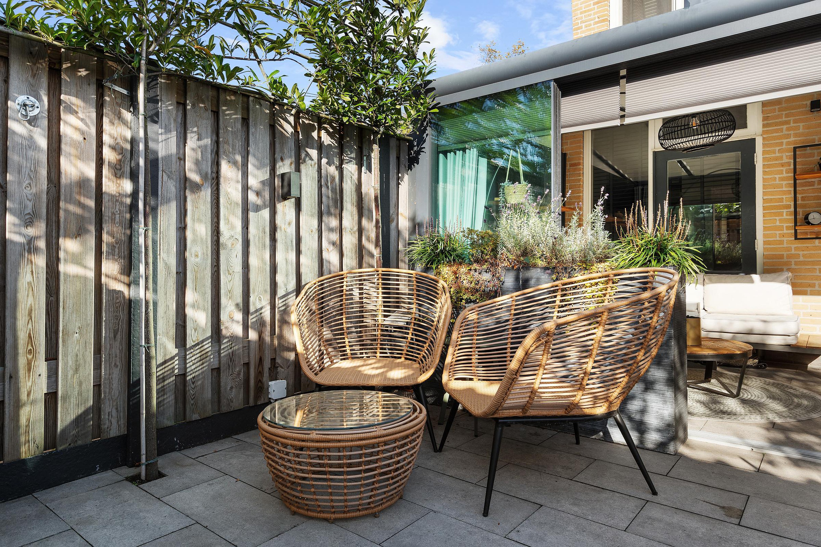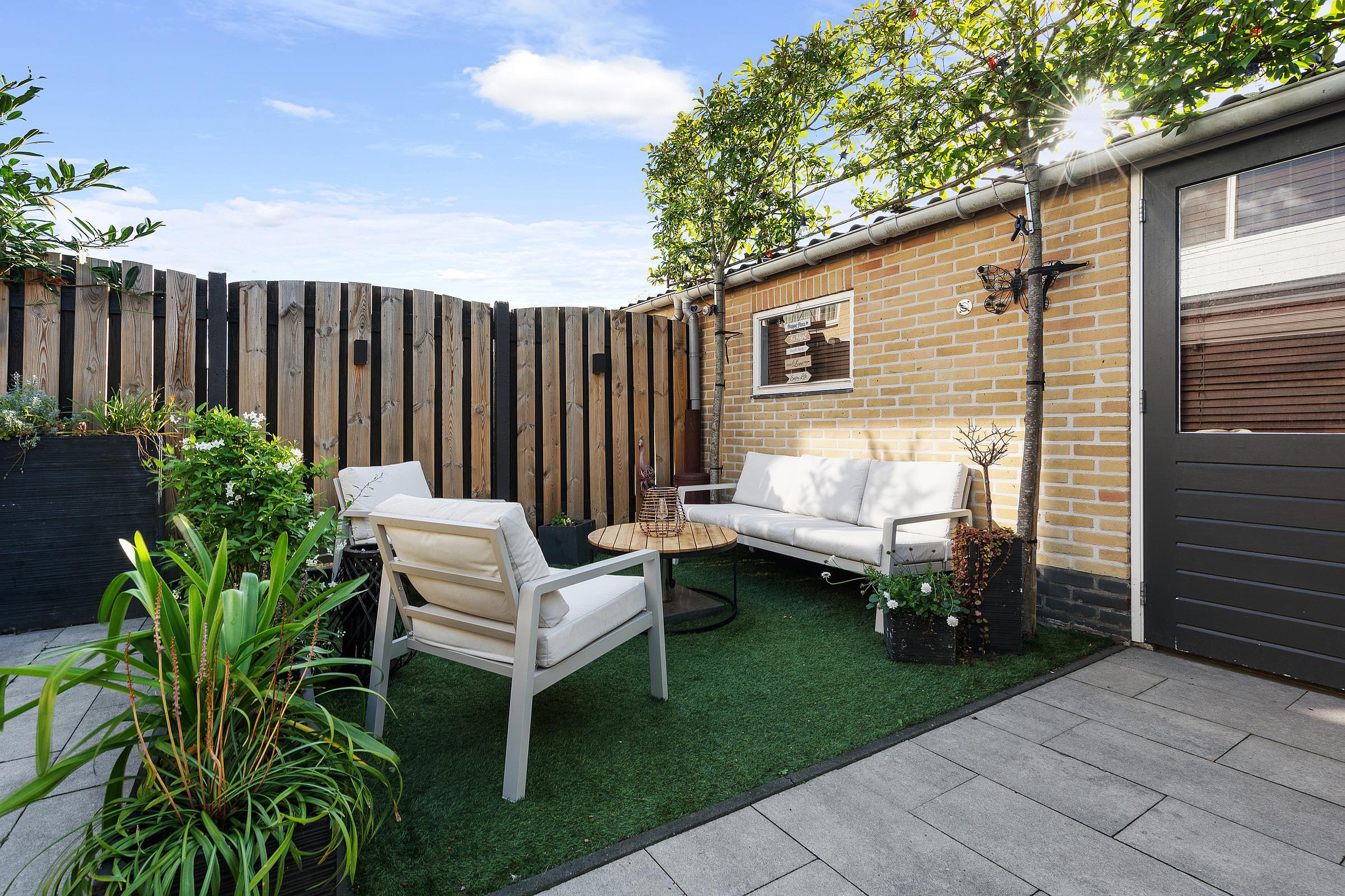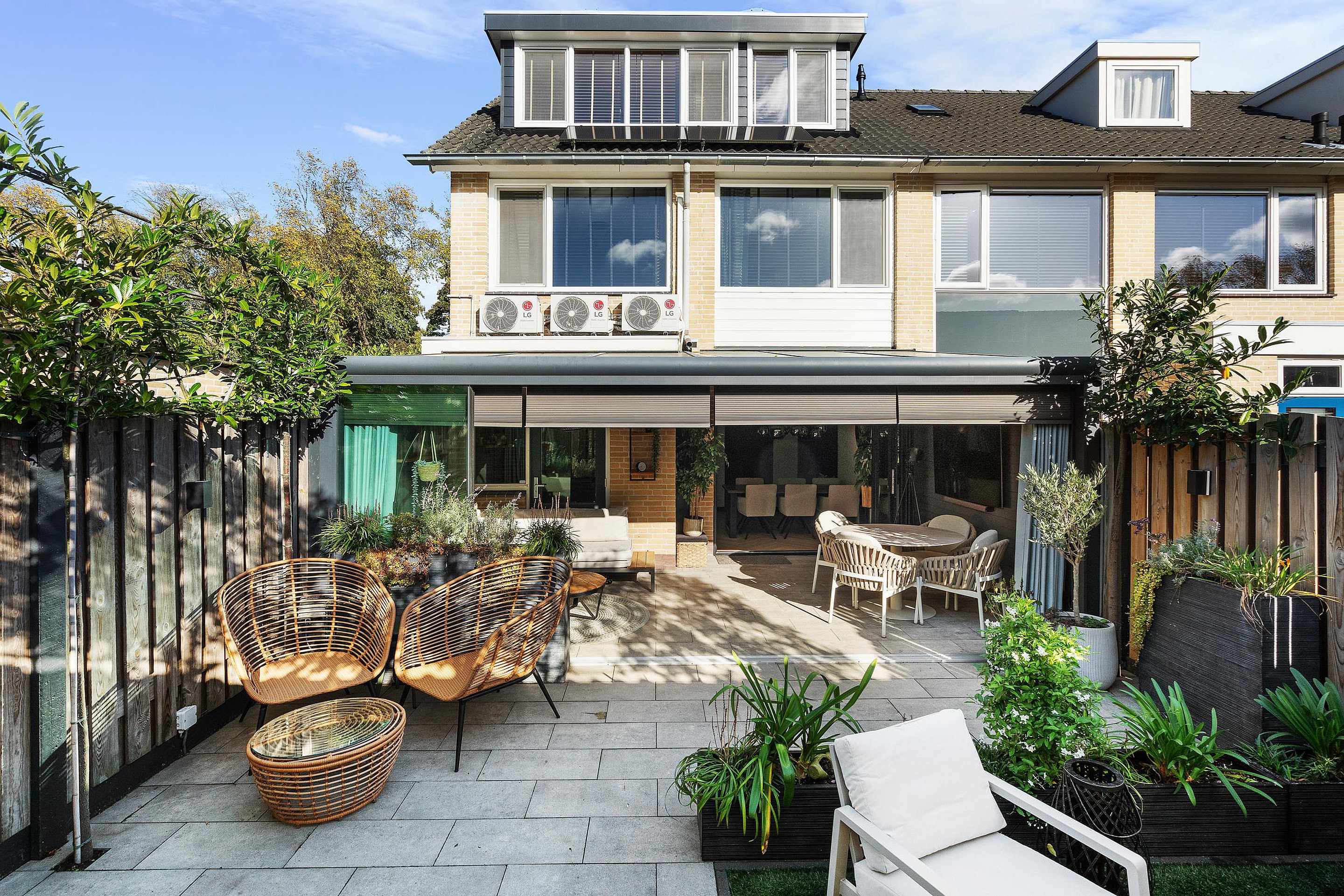 De achtertuin ligt op het zuiden en is vrijwel geheel betegeld en volledig omheind, met mogelijkheid tot verplaatsbare plantenborders. Vanuit de achtertuin zijn een aparte berging, fietsenhok en de achterom bereikbaar.