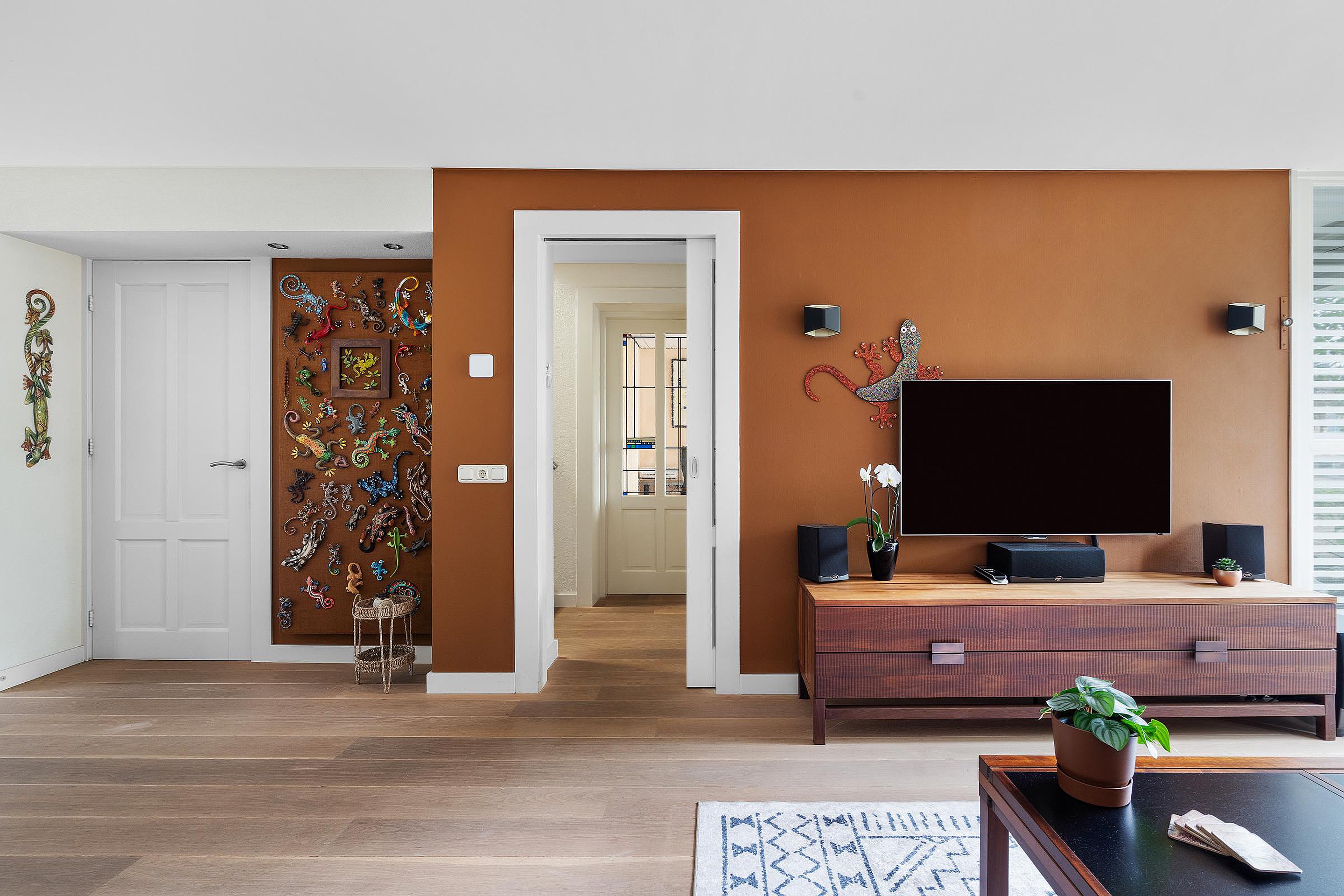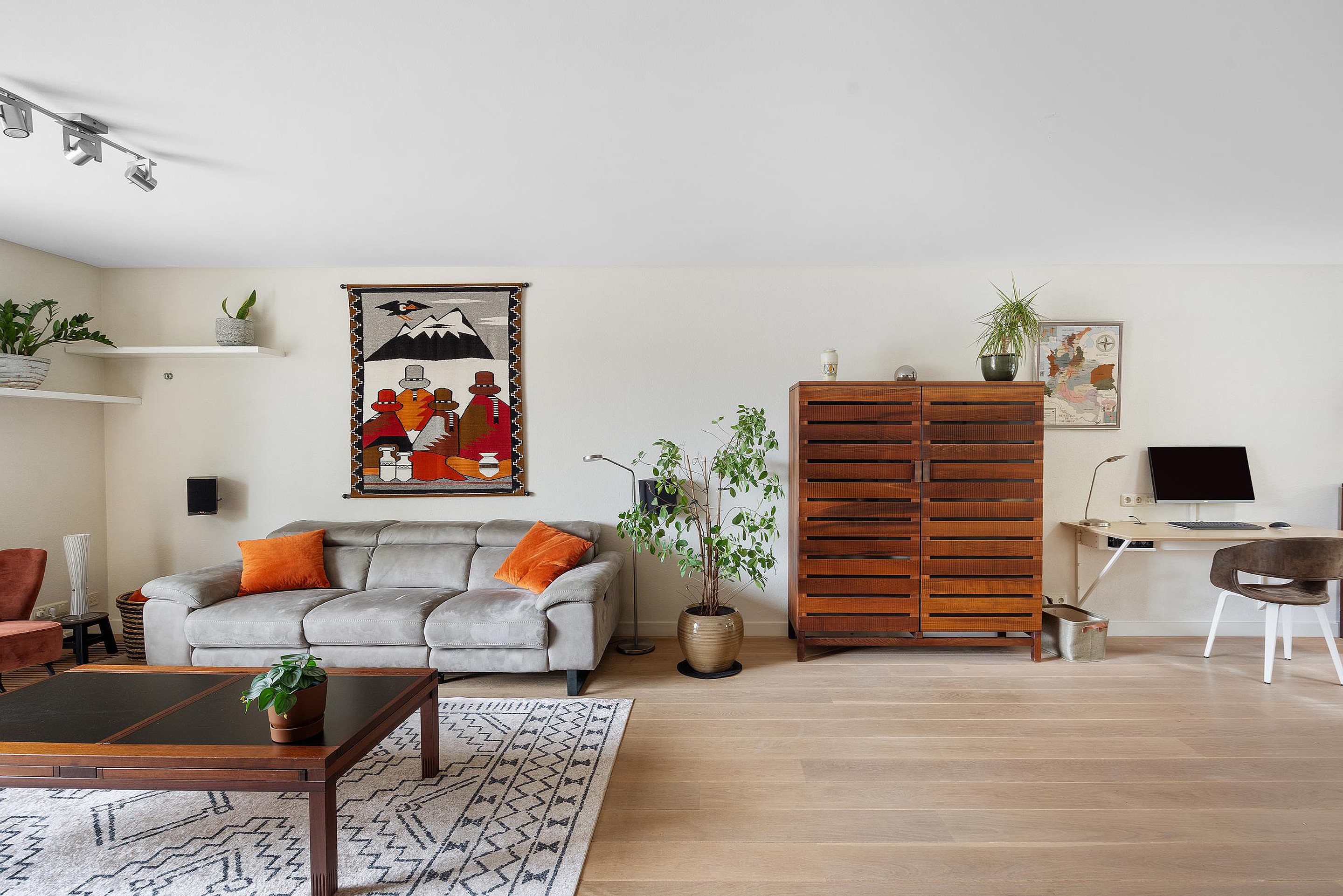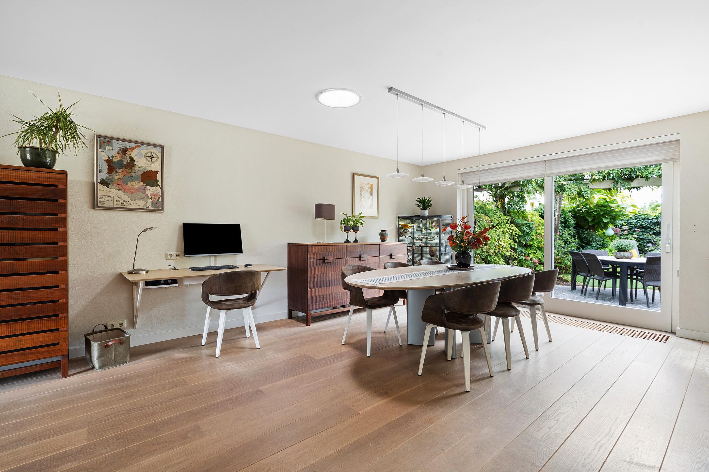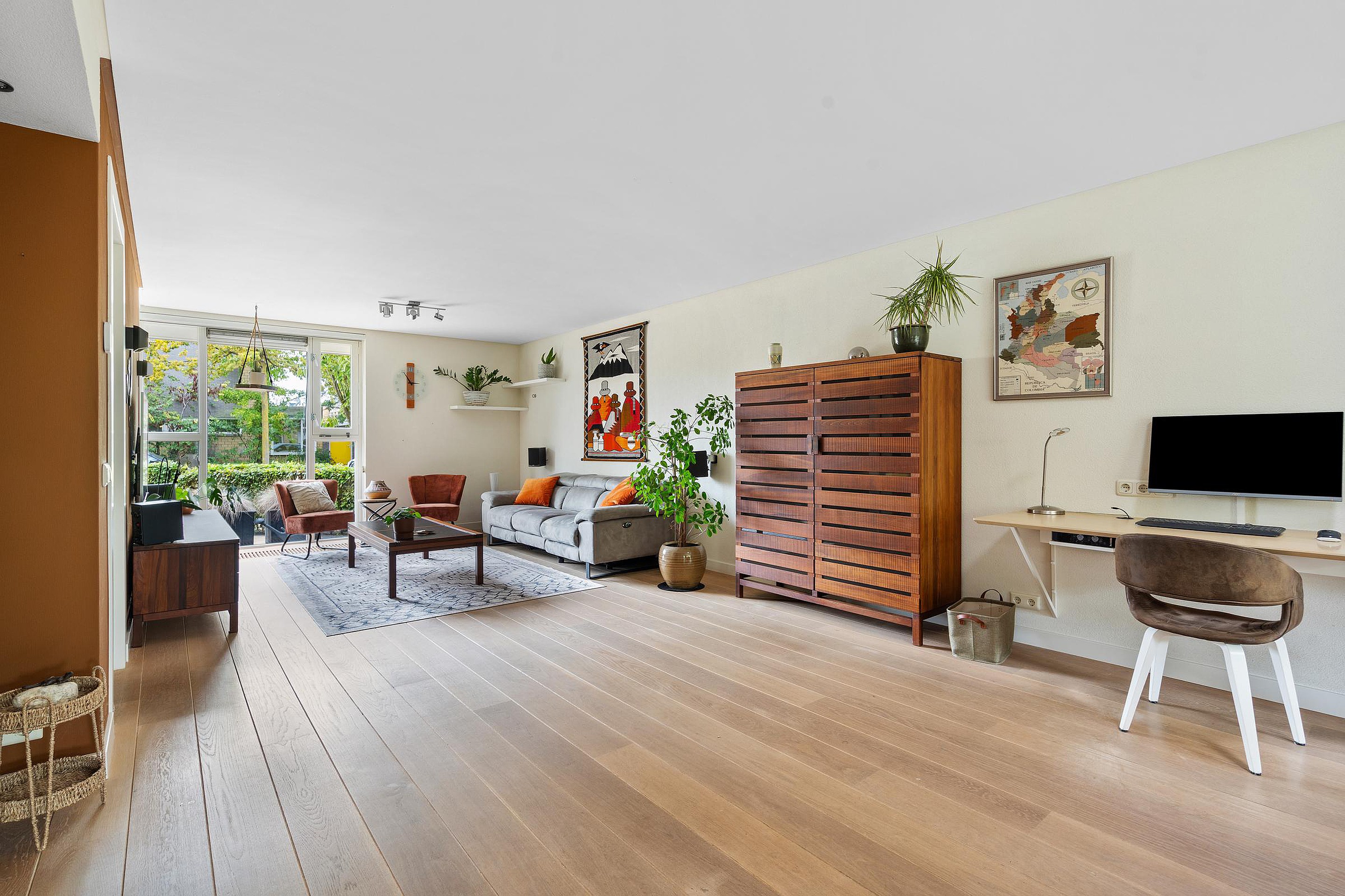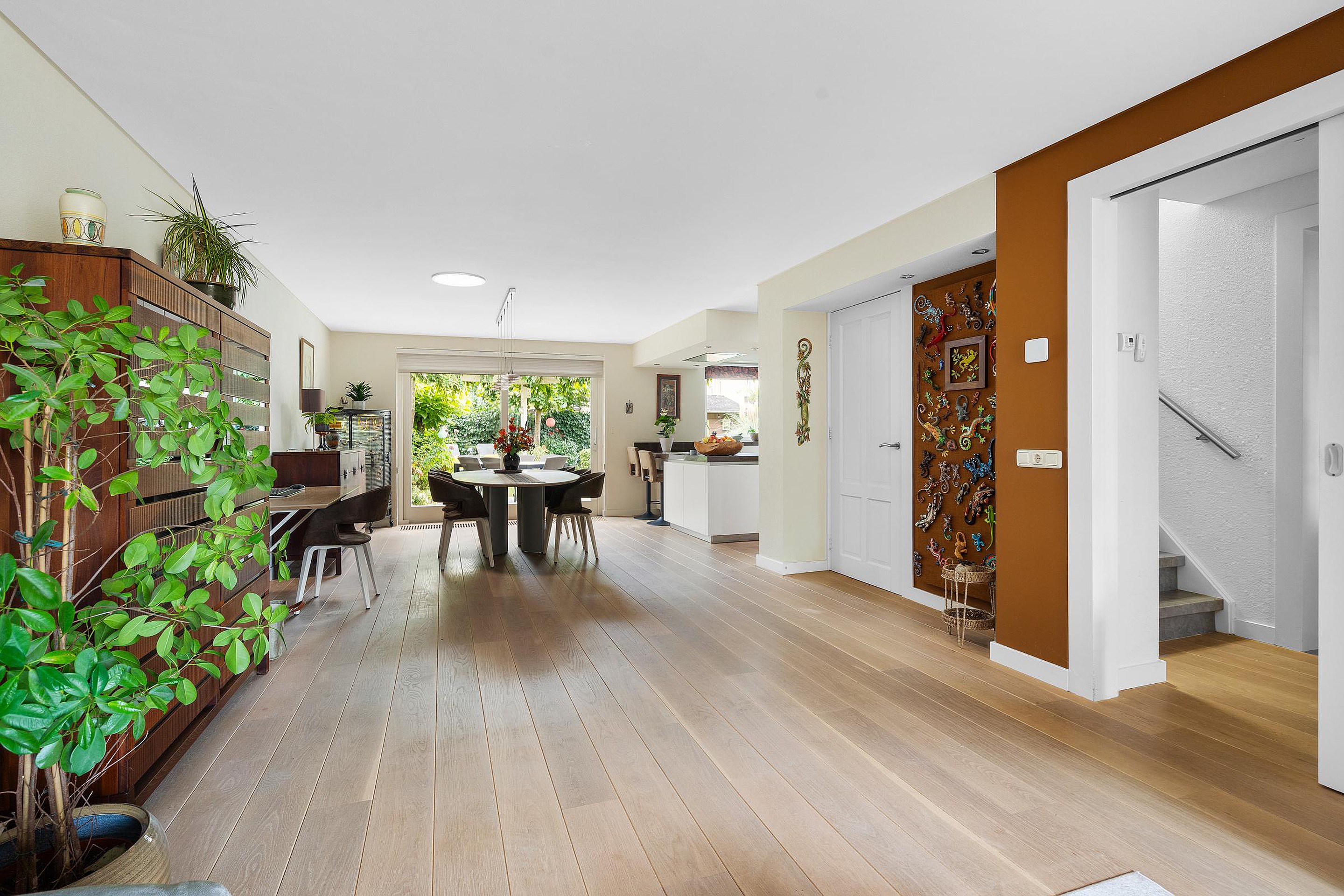 De imposante L-vormige woonkamer is heerlijk licht dankzij de grote raampartijen en biedt volop ruimte voor een comfortabele zithoek en een ruime eethoek. De woonkamer is voorzien van een massief Amerikaans eiken vloer met convectorputten. Vanuit de woonkamer zijn een handige trapkast en de open keuken bereikbaar.