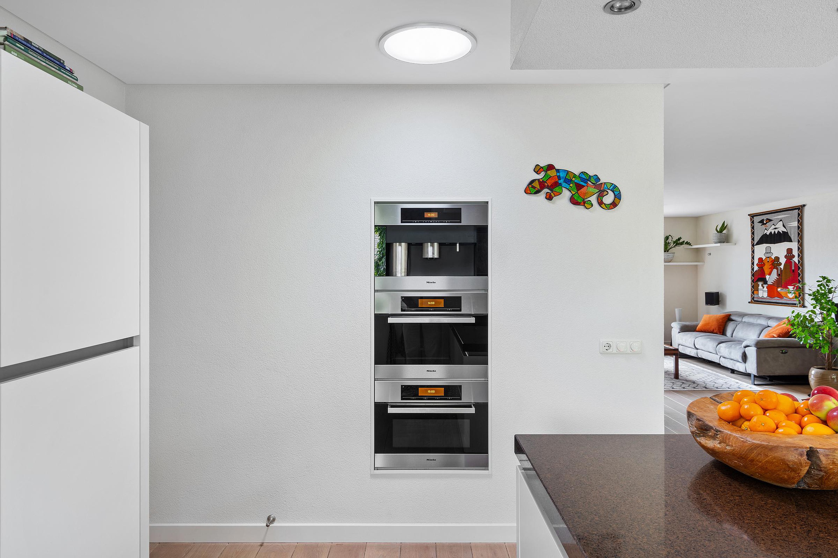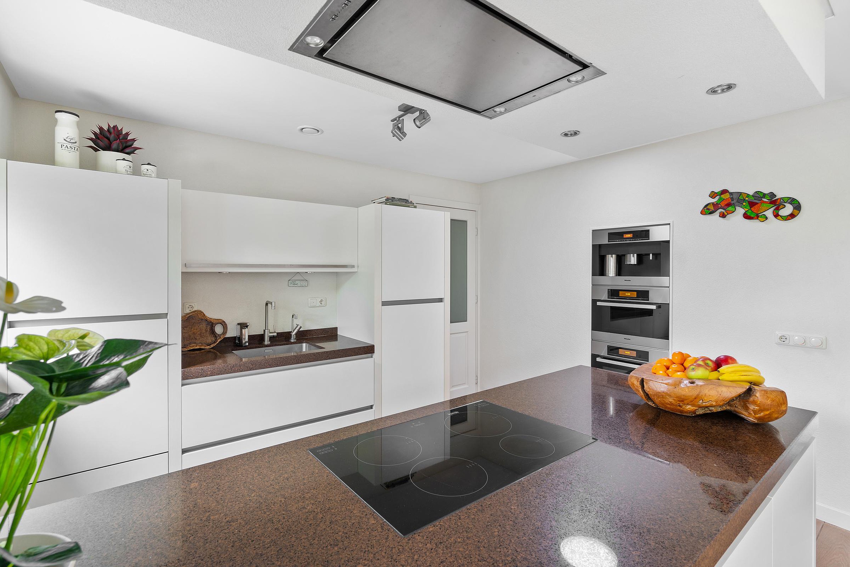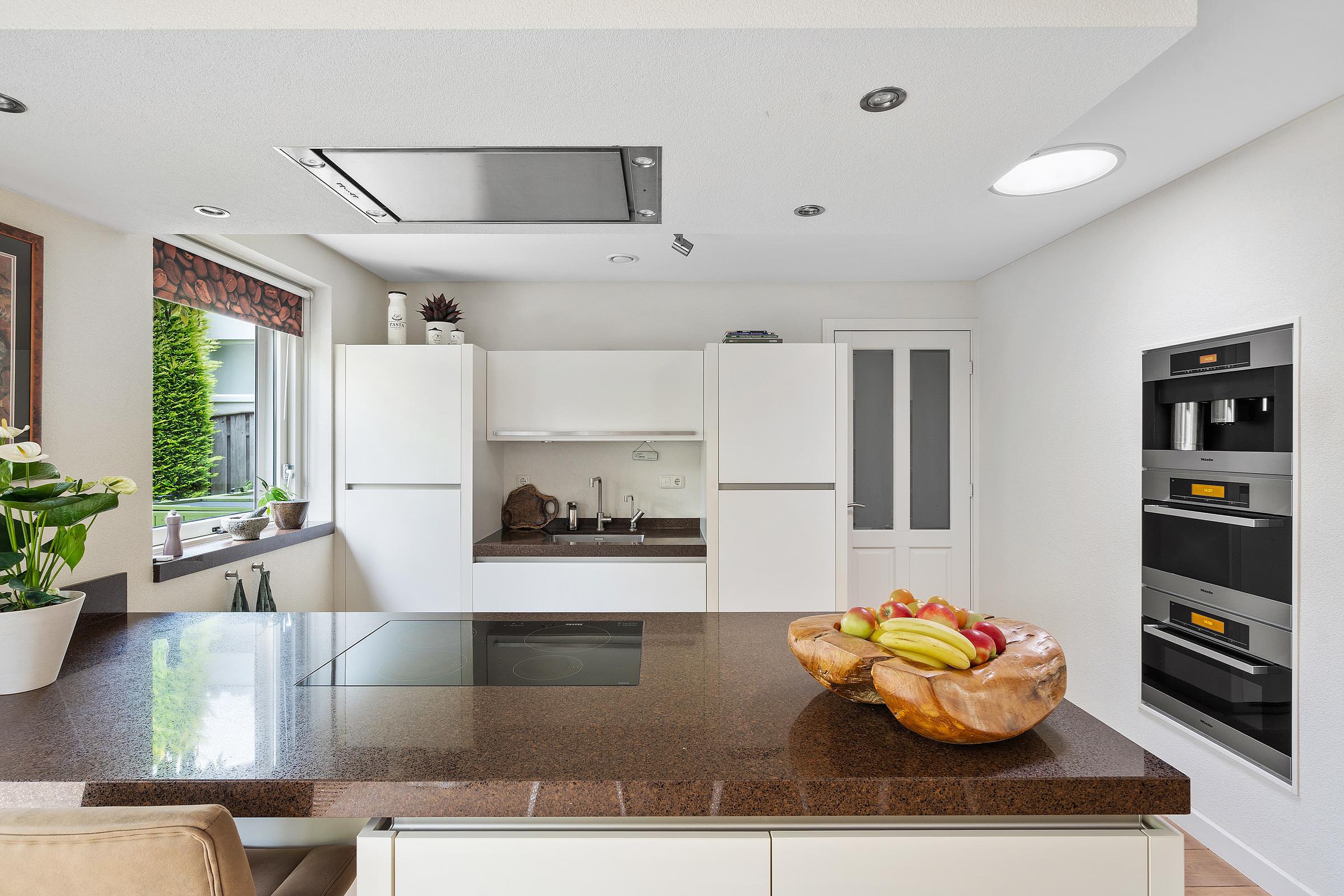 De professionele open keuken is praktisch ingedeeld met een groot kookeiland met geïntegreerde ontbijtbar en voorzien van alle denkbare, high-end inbouwapparatuur (o.a. Miele + Quooker). Vanuit de keuken is een portaal bereikbaar dat toegang biedt tot de bijkeuken, het gastentoilet en een compacte werkruimte.