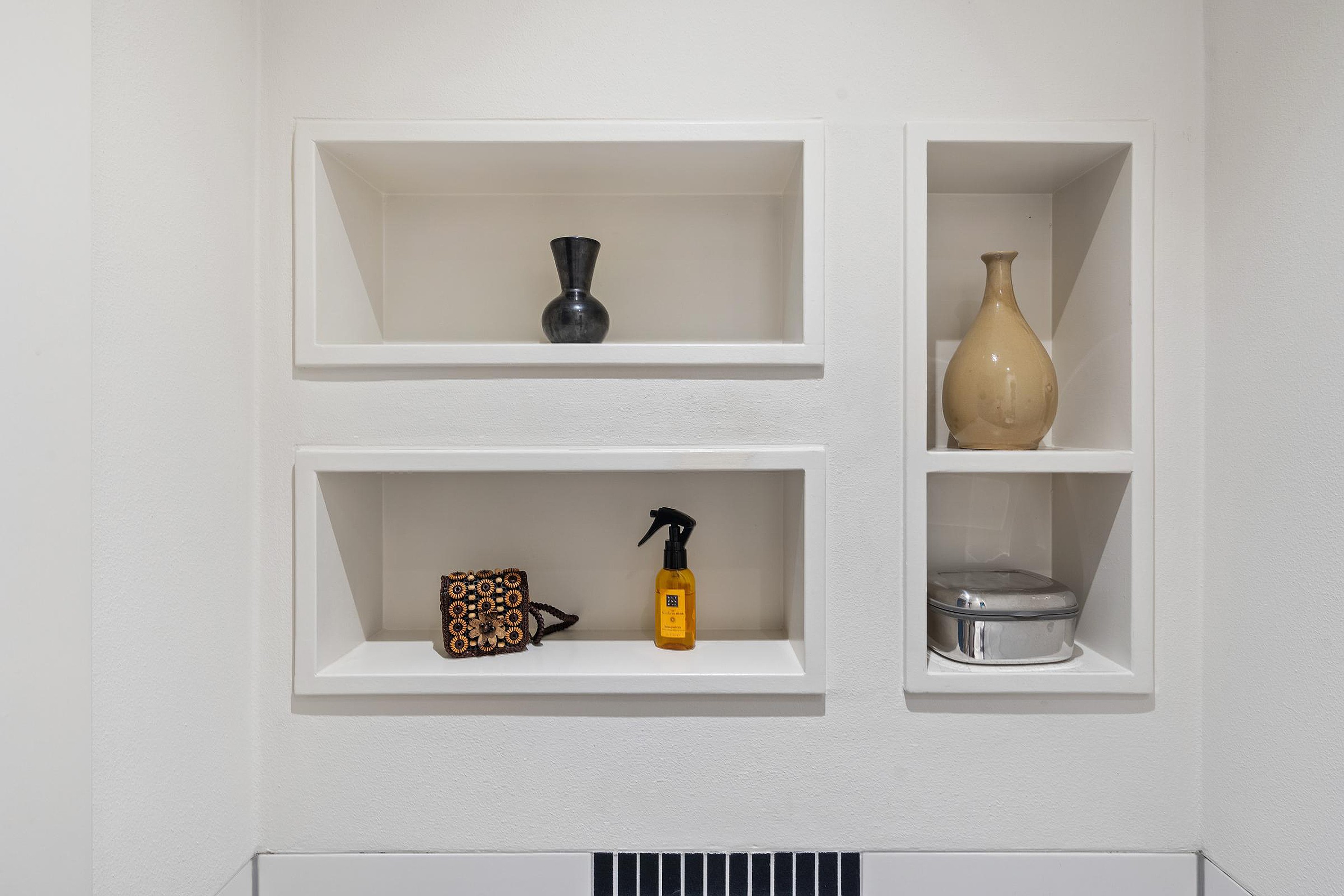 De bijkeuken beschikt over veel kastruimte een werkblad en aansluitingen voor diverse apparatuur.