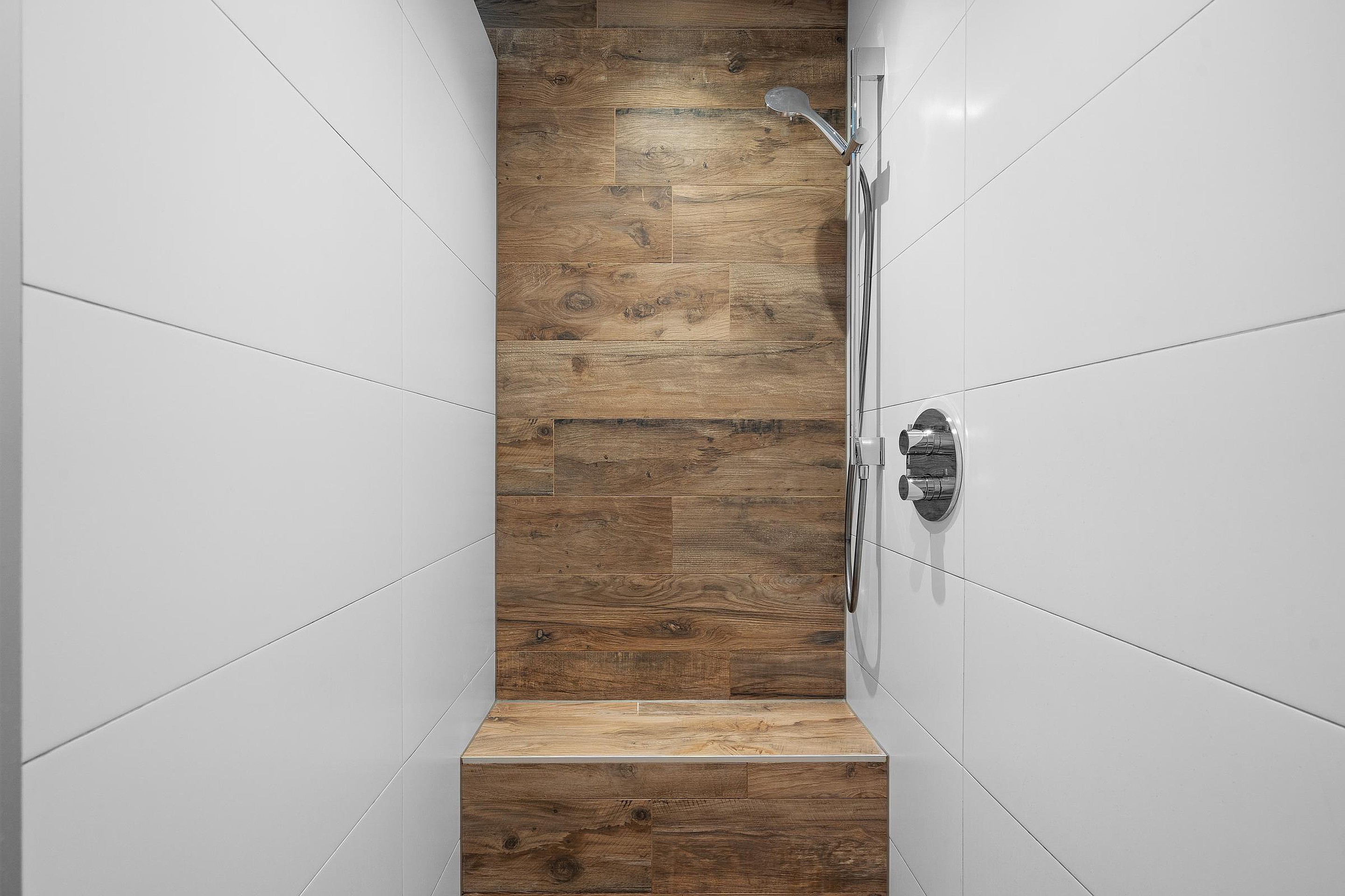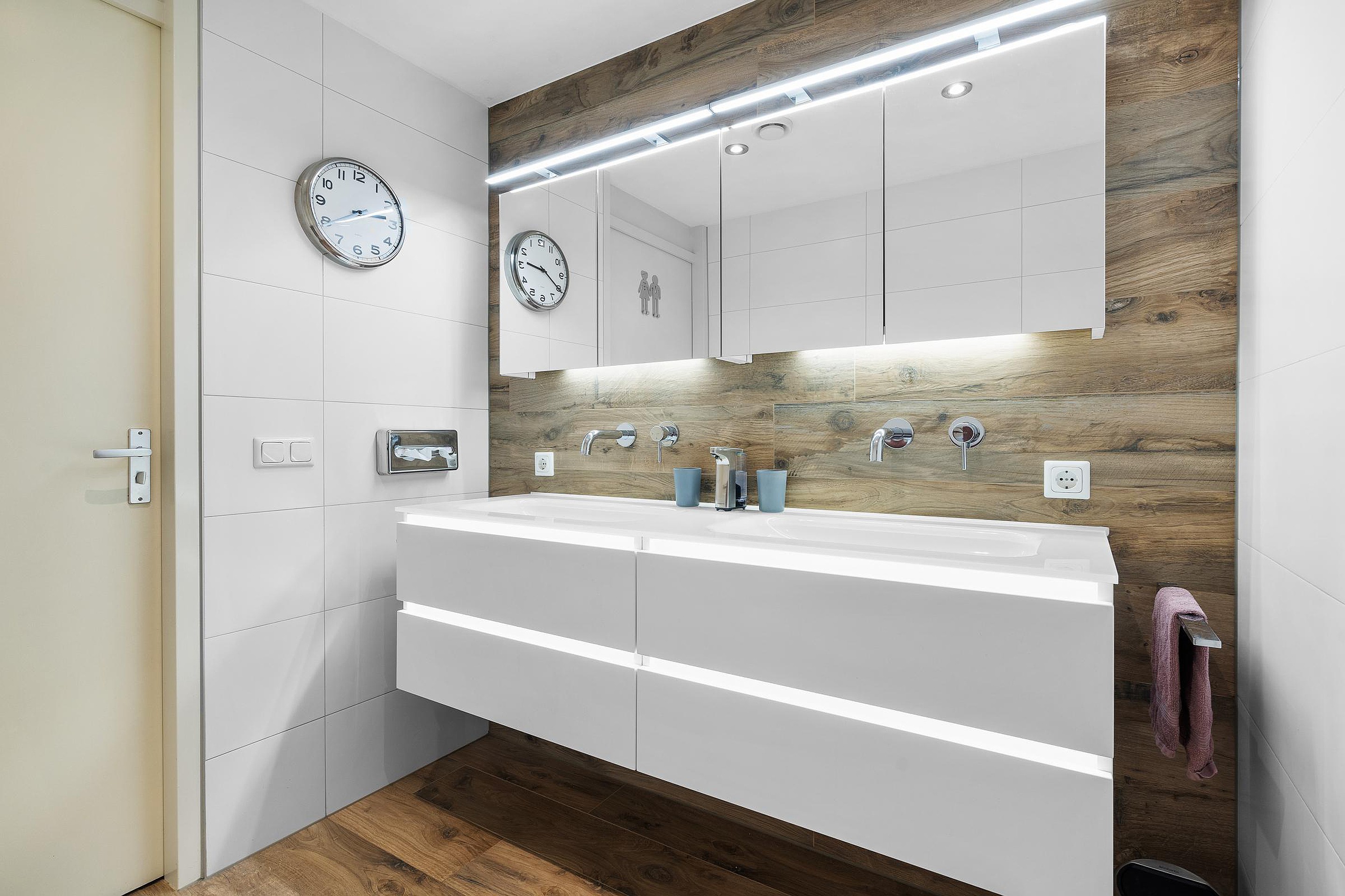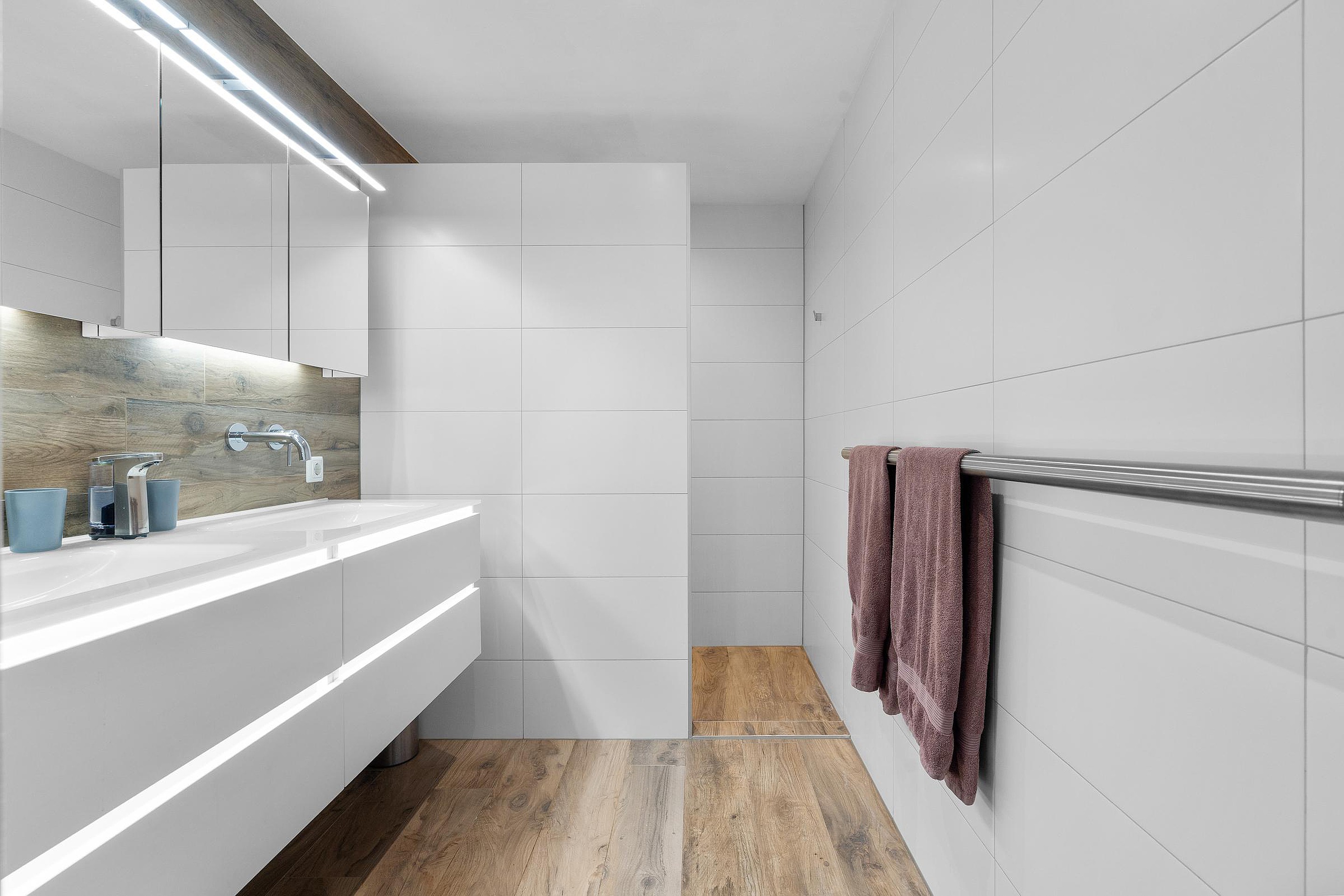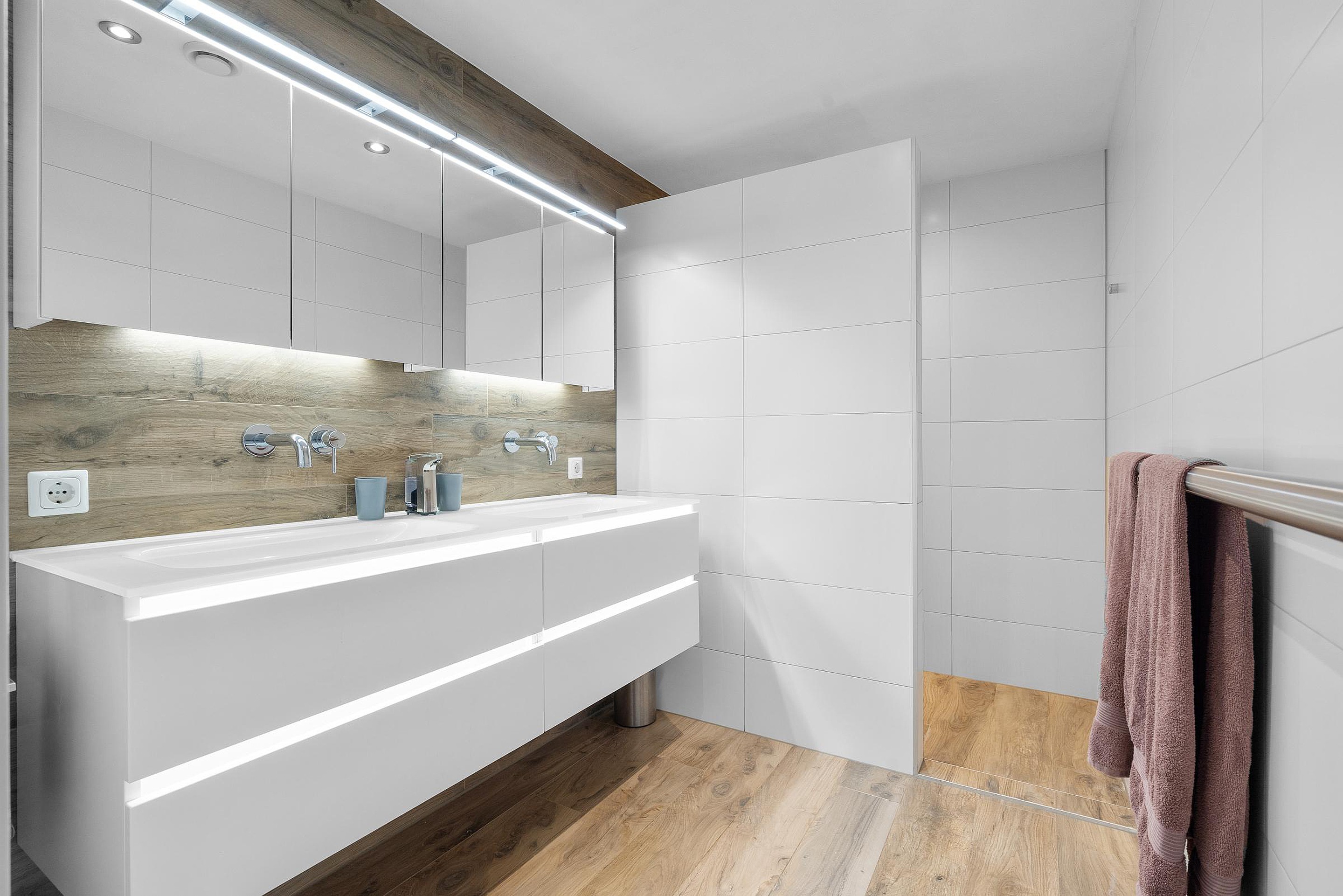 Eerste verdieping Op de eerste verdieping biedt de ruime overloop met gevelraam toegang tot twee goed bemeten slaapkamers en een luxe, geheel betegelde badkamer, met inloopdouche en dubbele wastafel in een fraai meubel. Het separate toilet is modern ingericht in dezelfde stijl als de badkamer. De overloop, badkamer en de kamers beschikken over dezelfde, doorlopende houtlook tegelvloer.