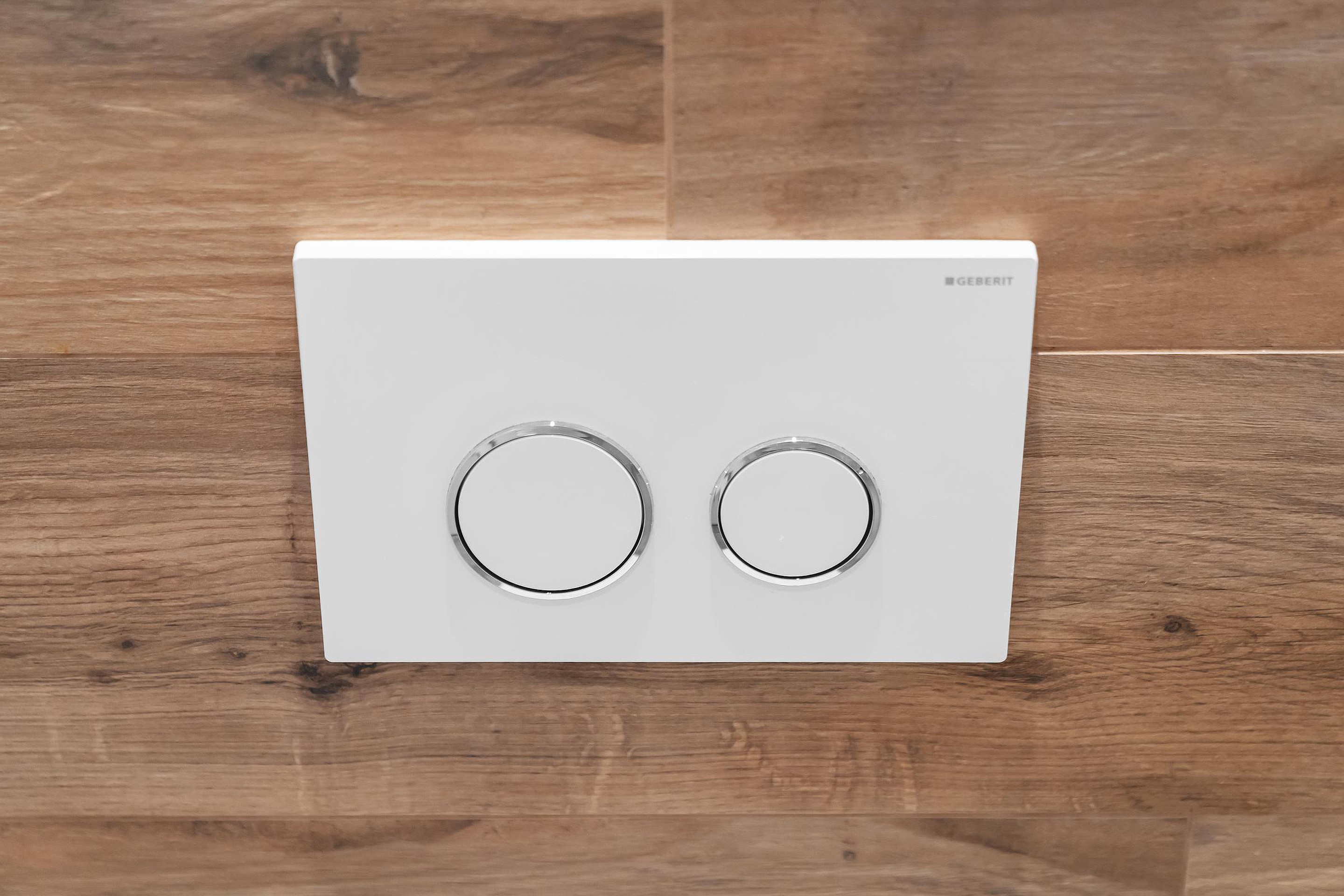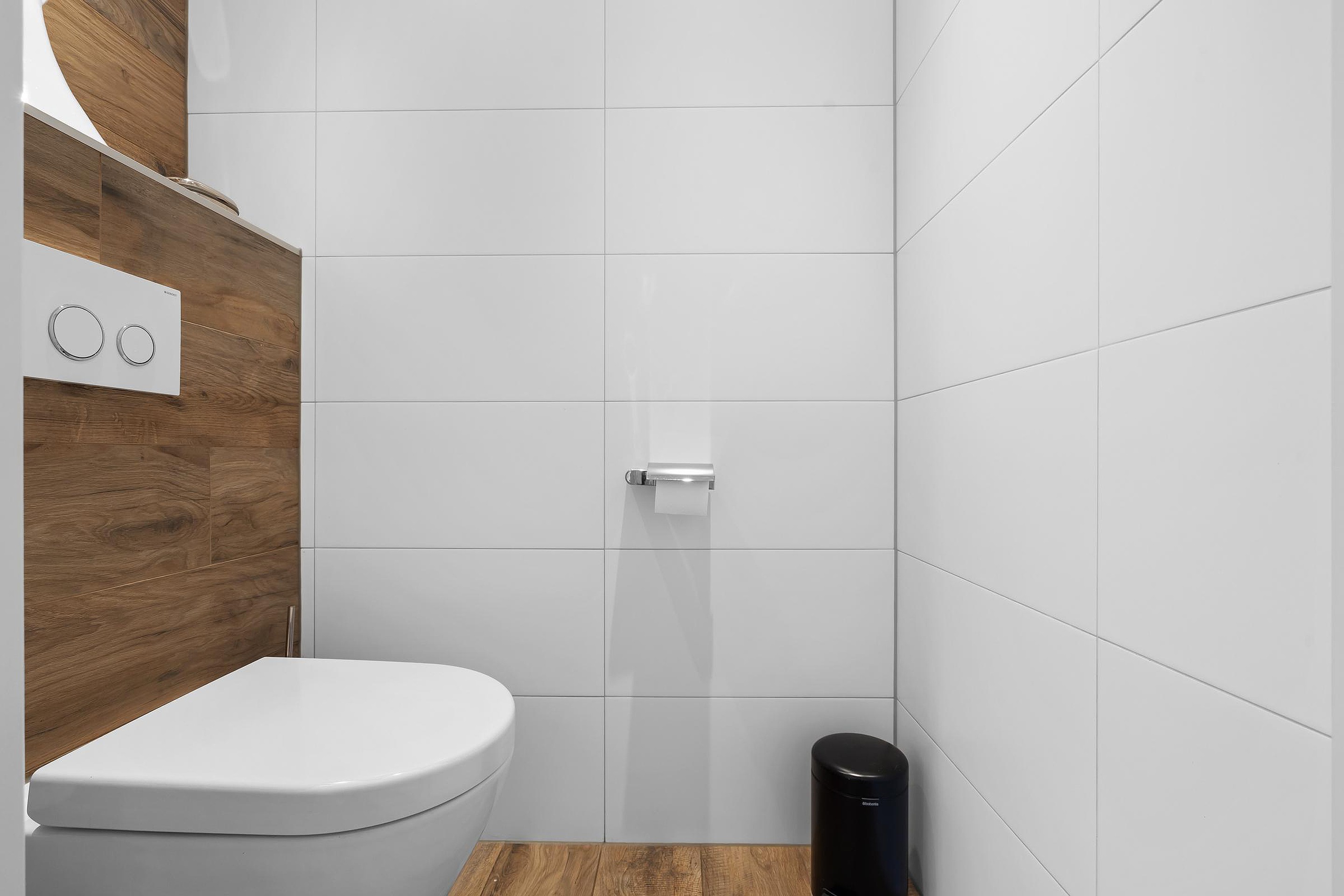 Het gastentoilet is fraai afgewerkt en beschikt over een wandcloset, moderne betegeling en een fonteintje.